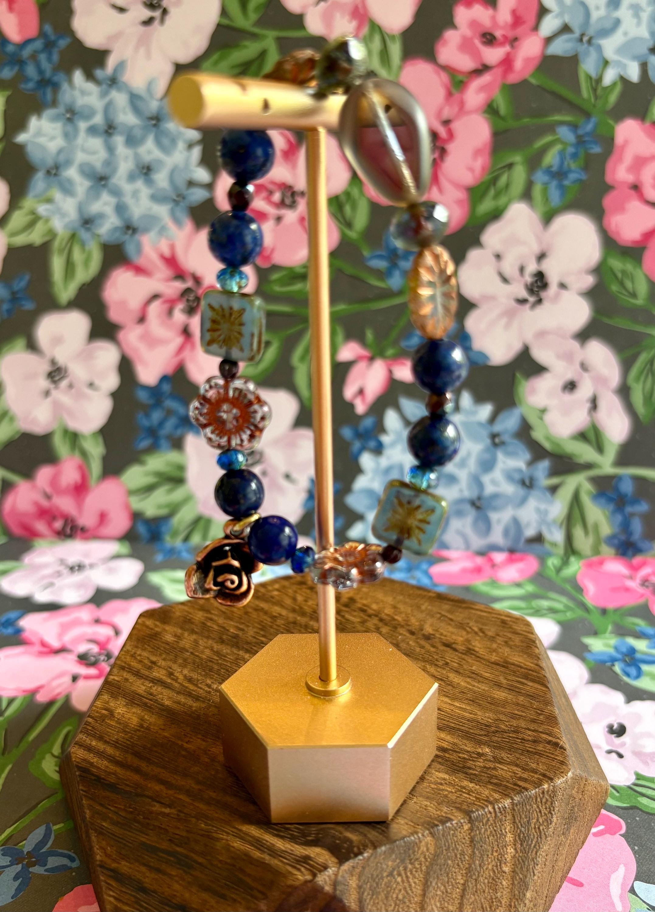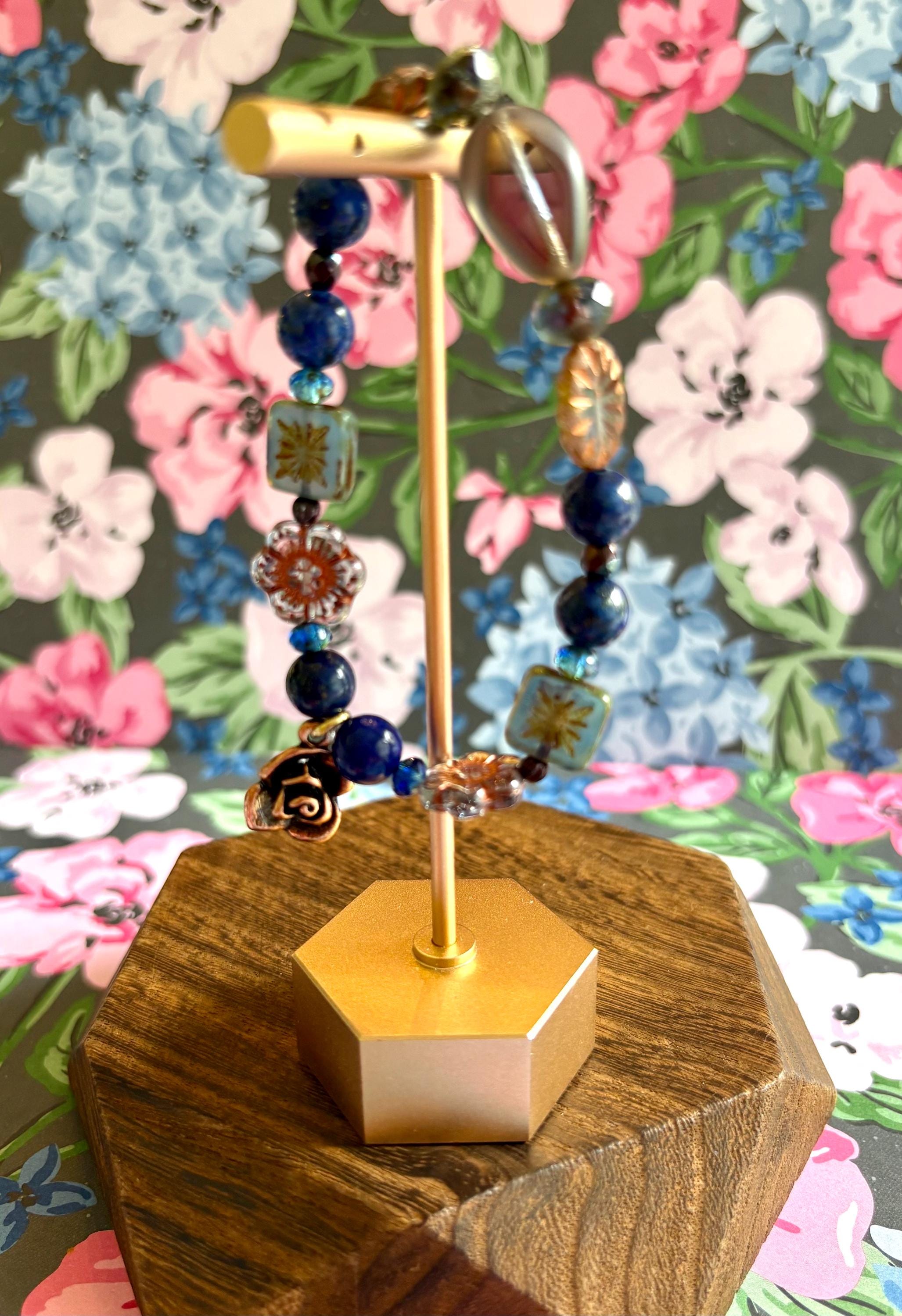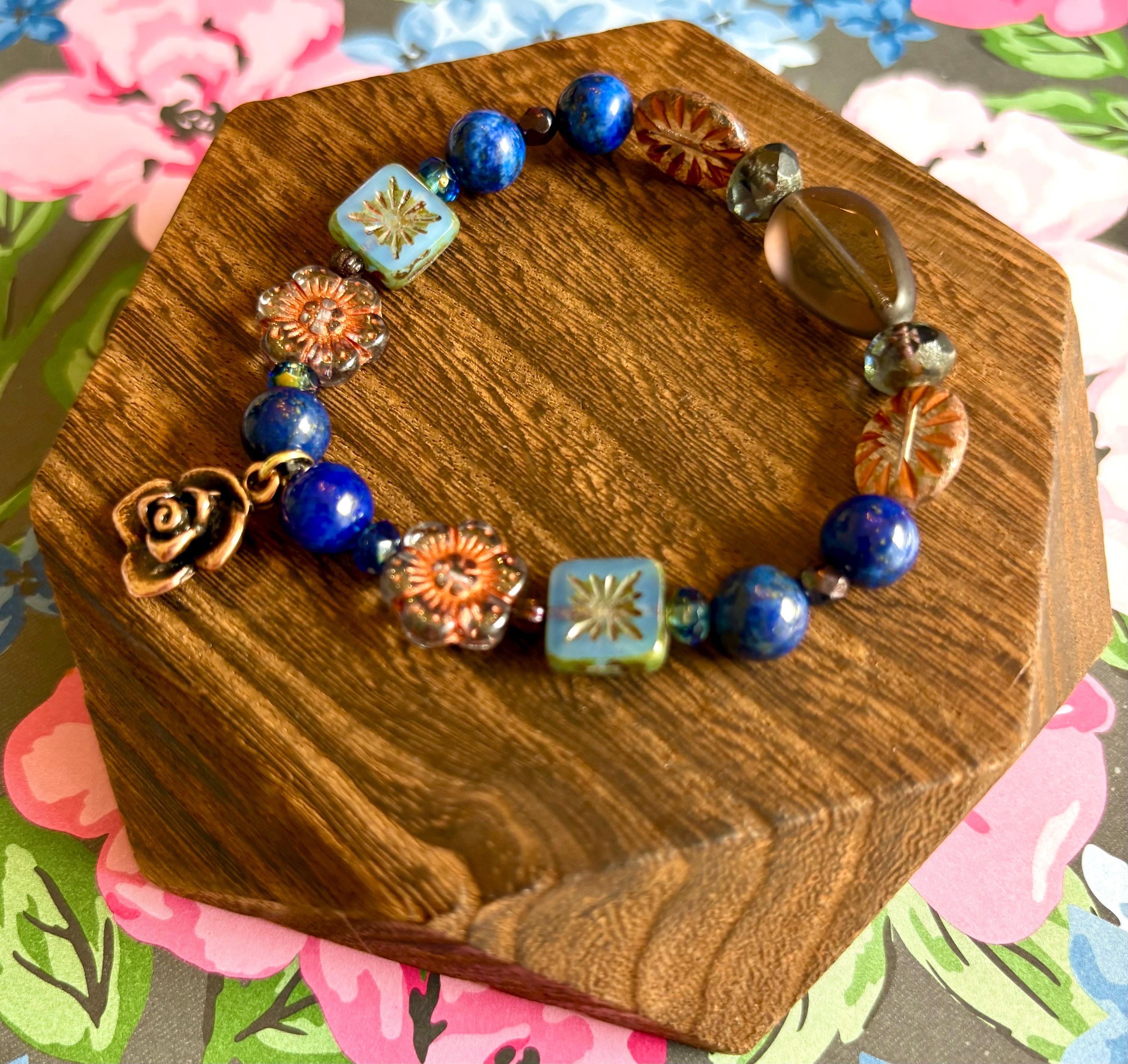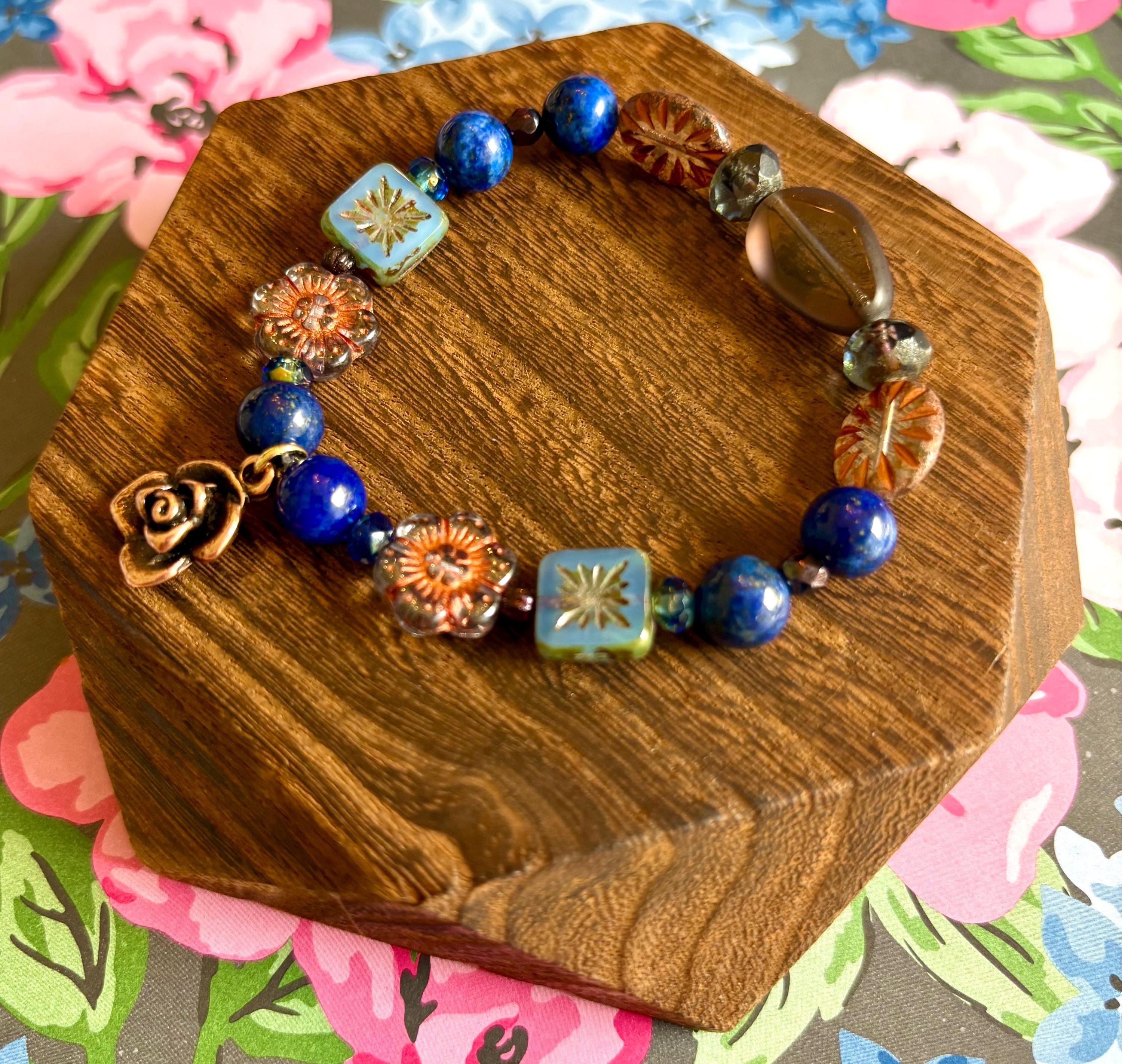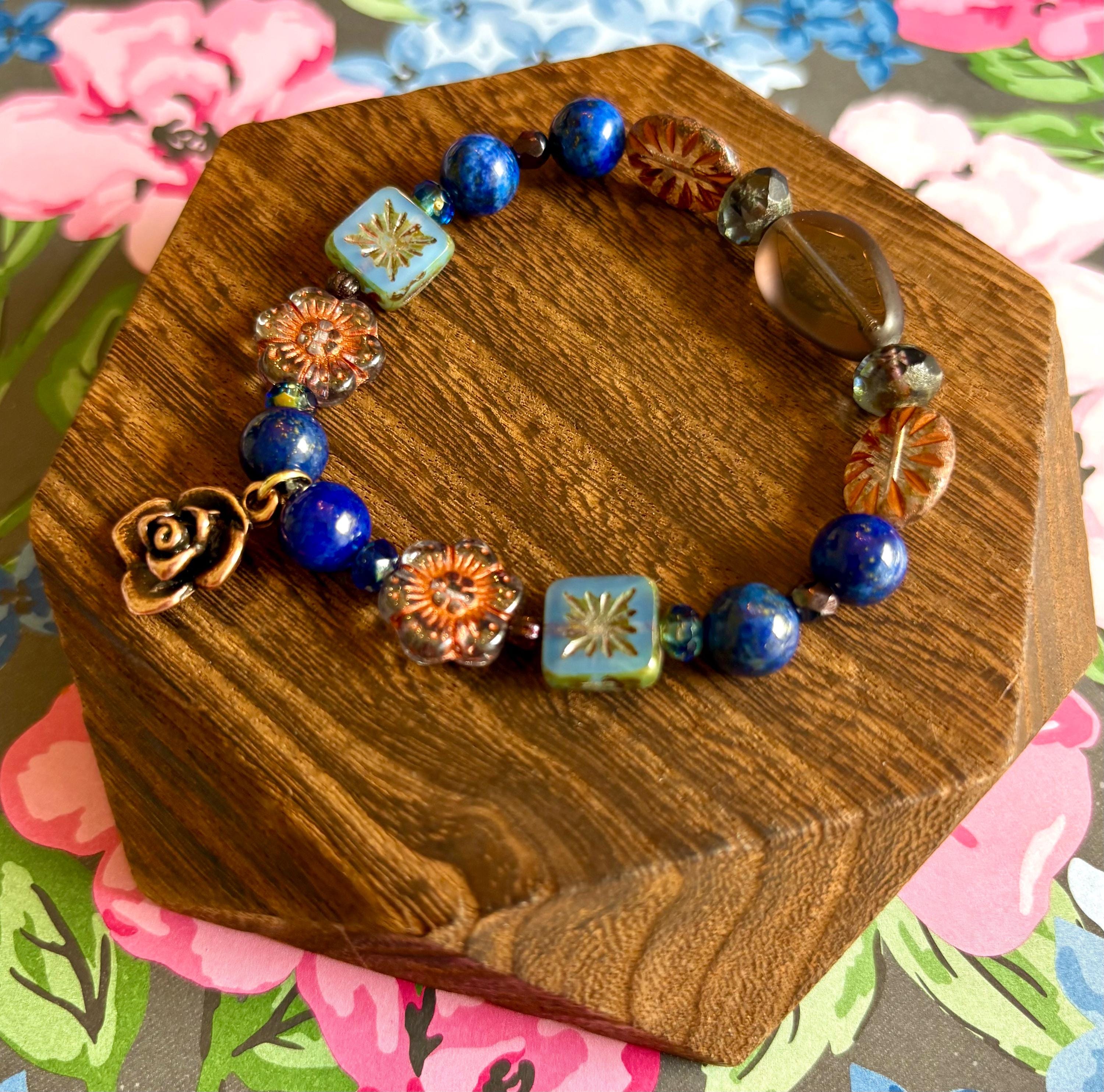 Enchanted Midnight Rose Bracelet – Lapis Lazuli, Czech Glass & Copper Rose Charm | Goddess Party Collection