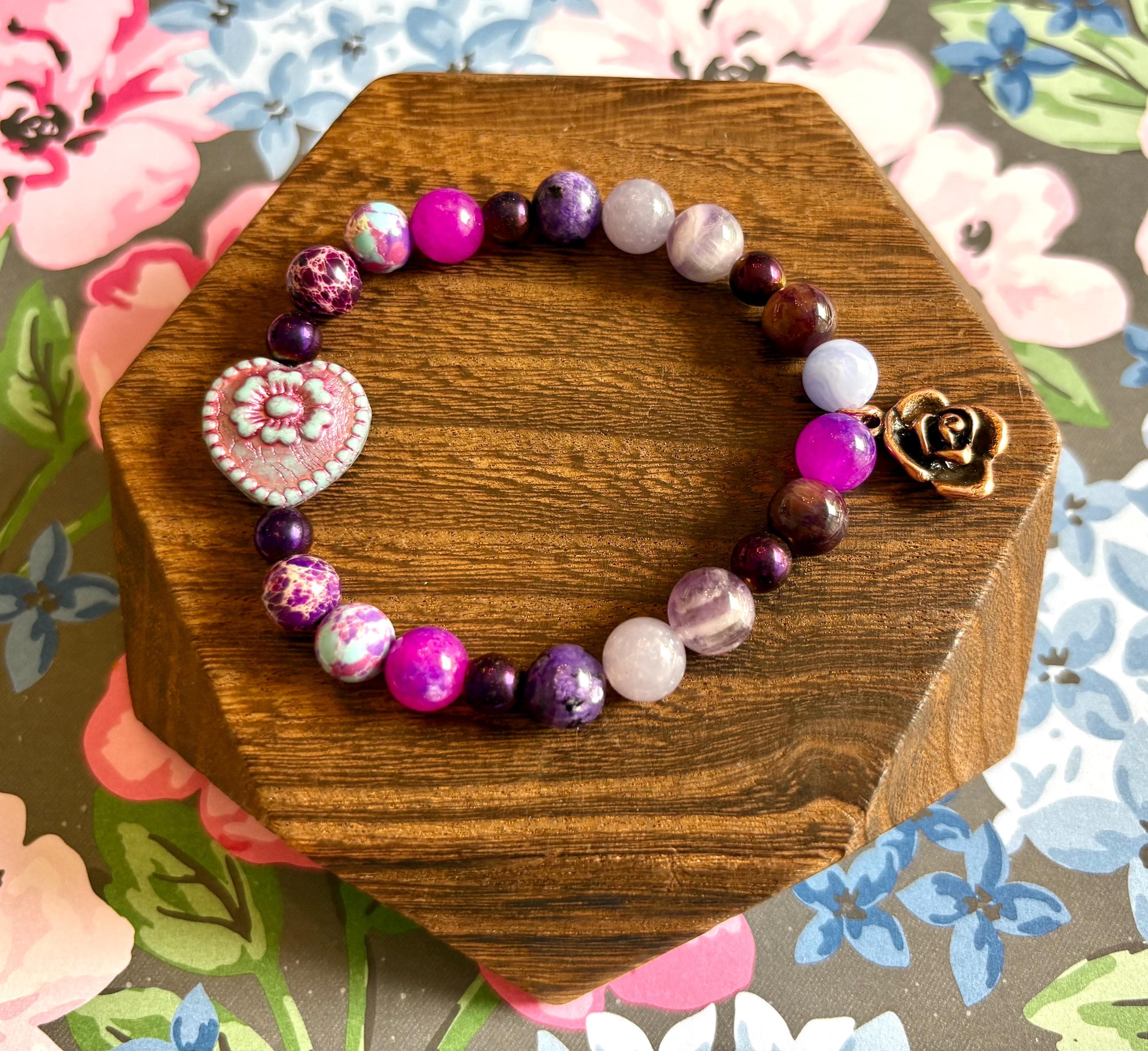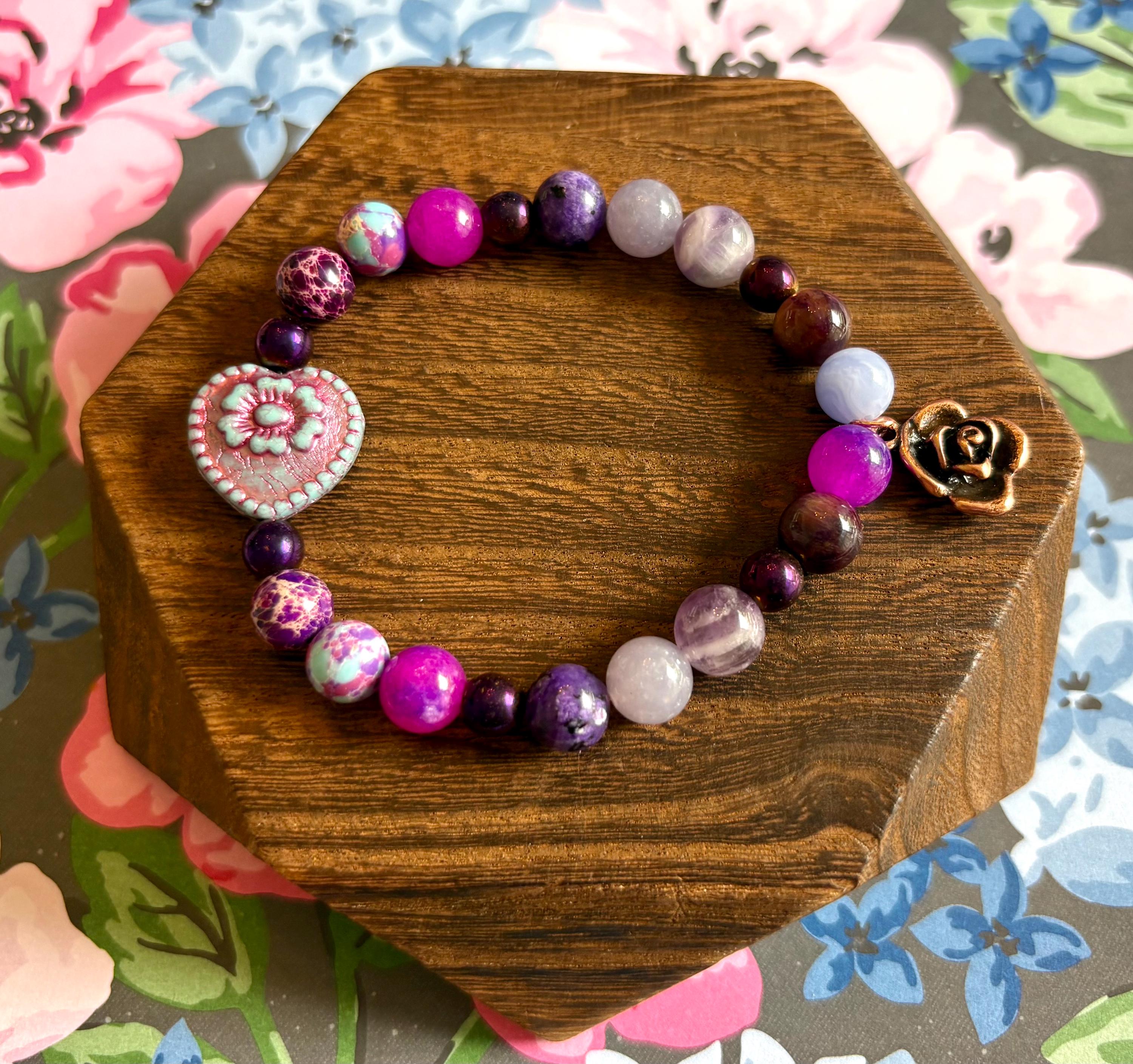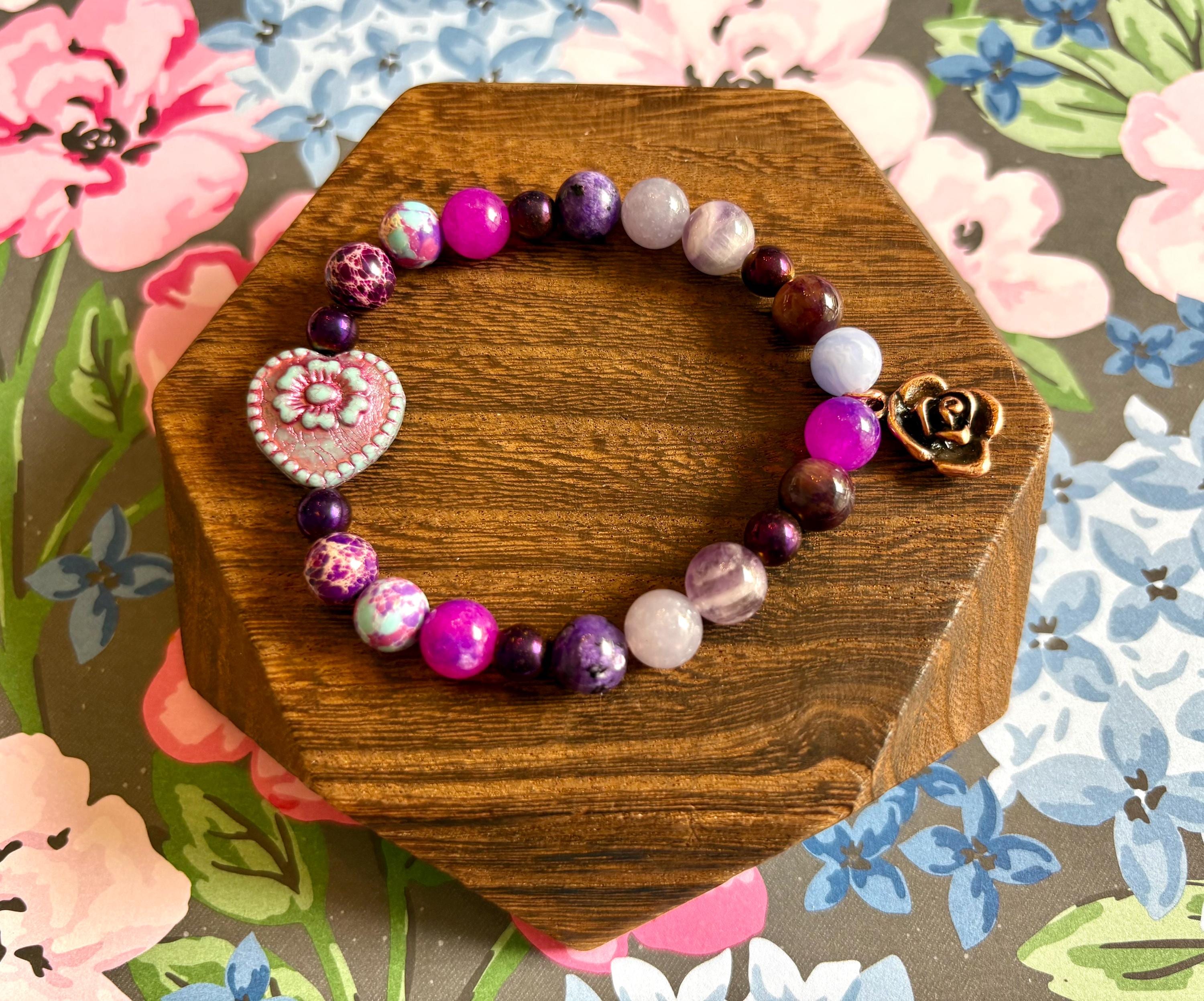 Enchanted Violet Heart Bracelet | Sugilite, Lepidolite, Amethyst, Purple Jade & Galaxy Jasper | Goddess Party Collection | Copper Rose Charm