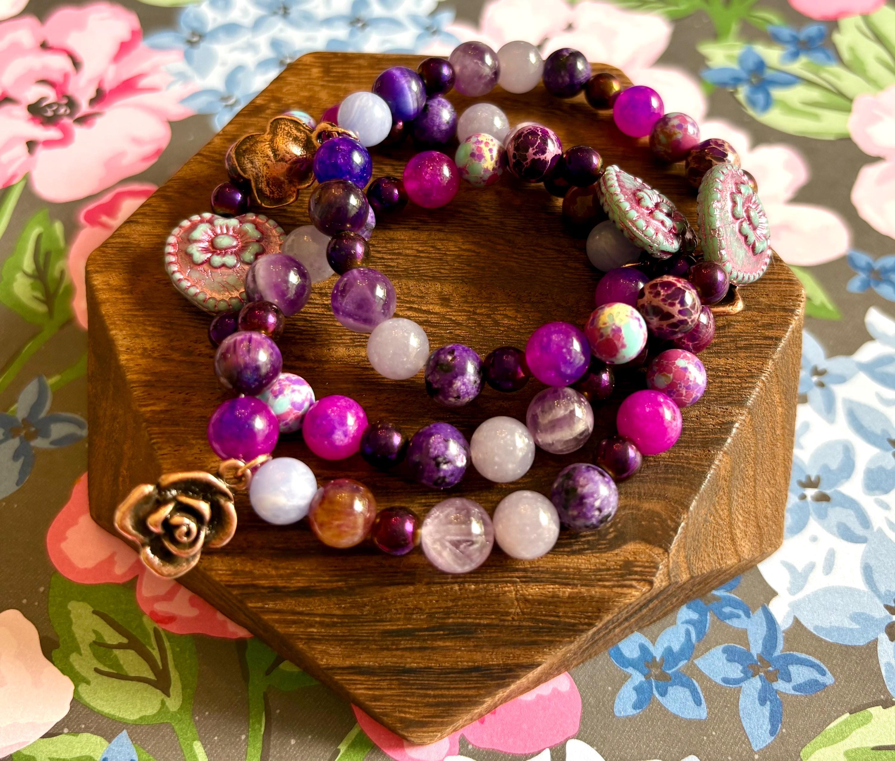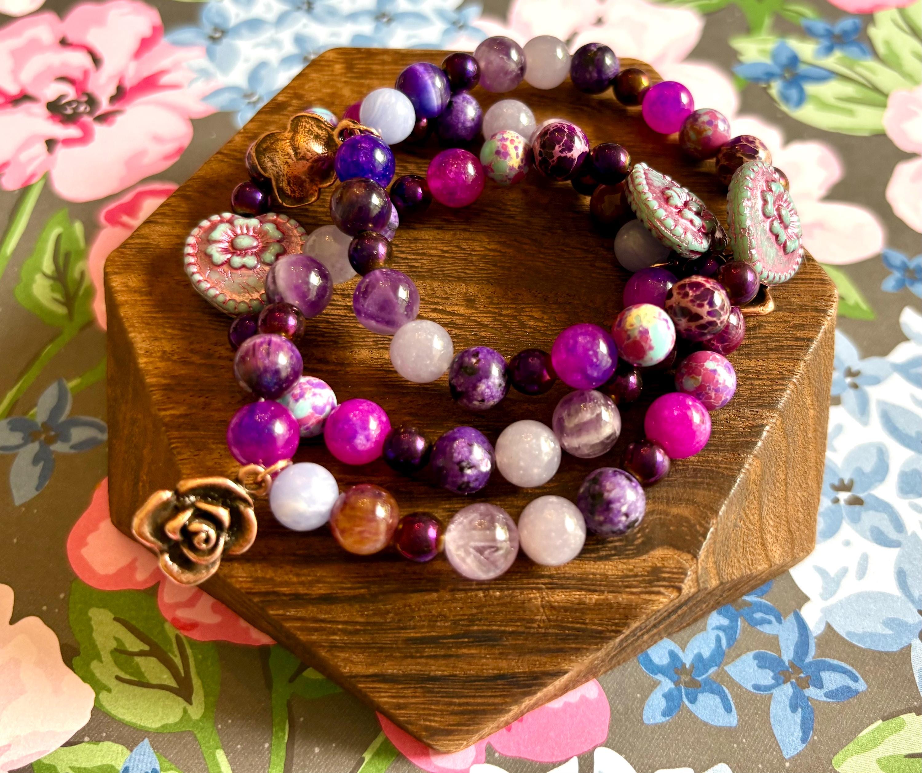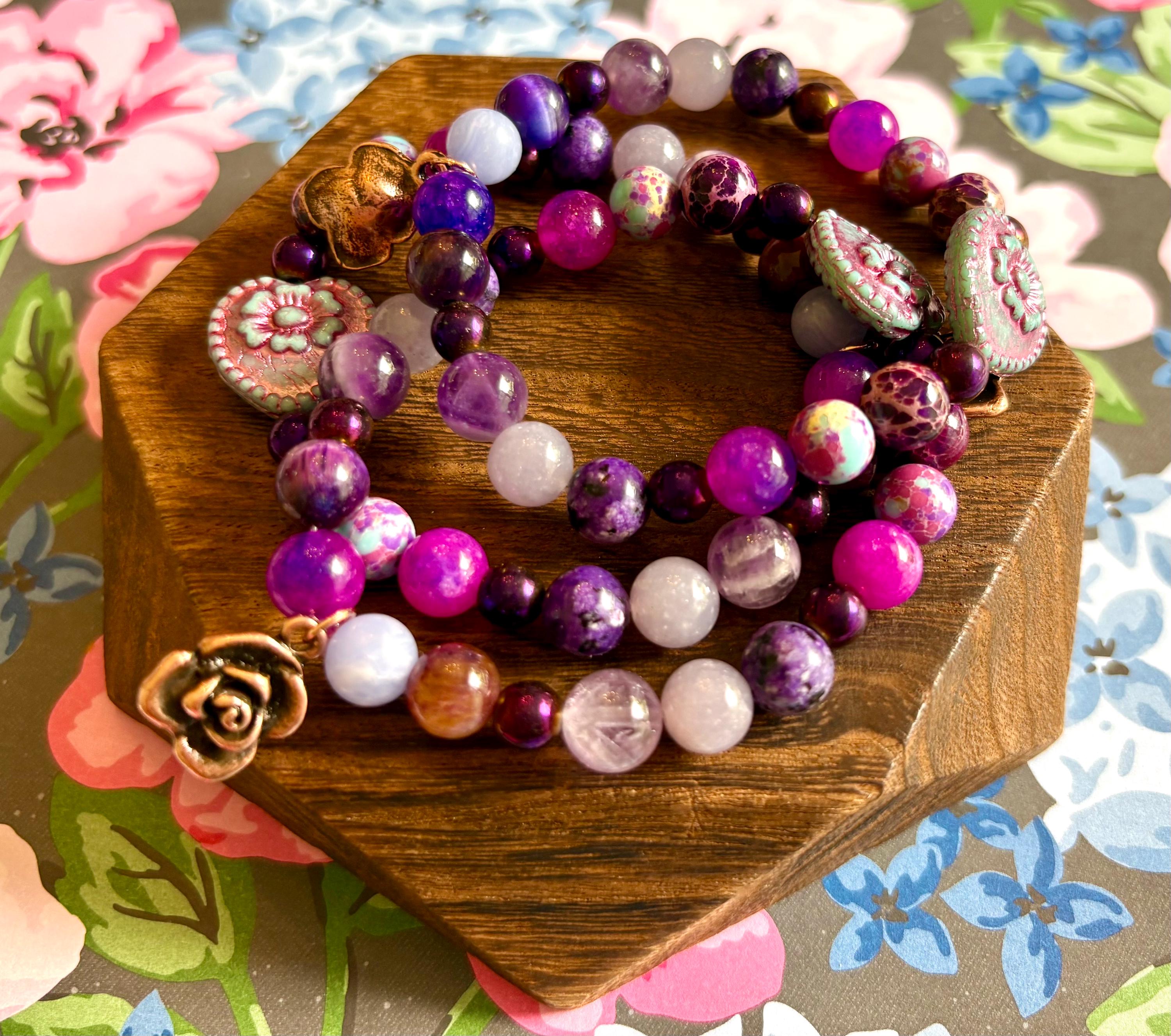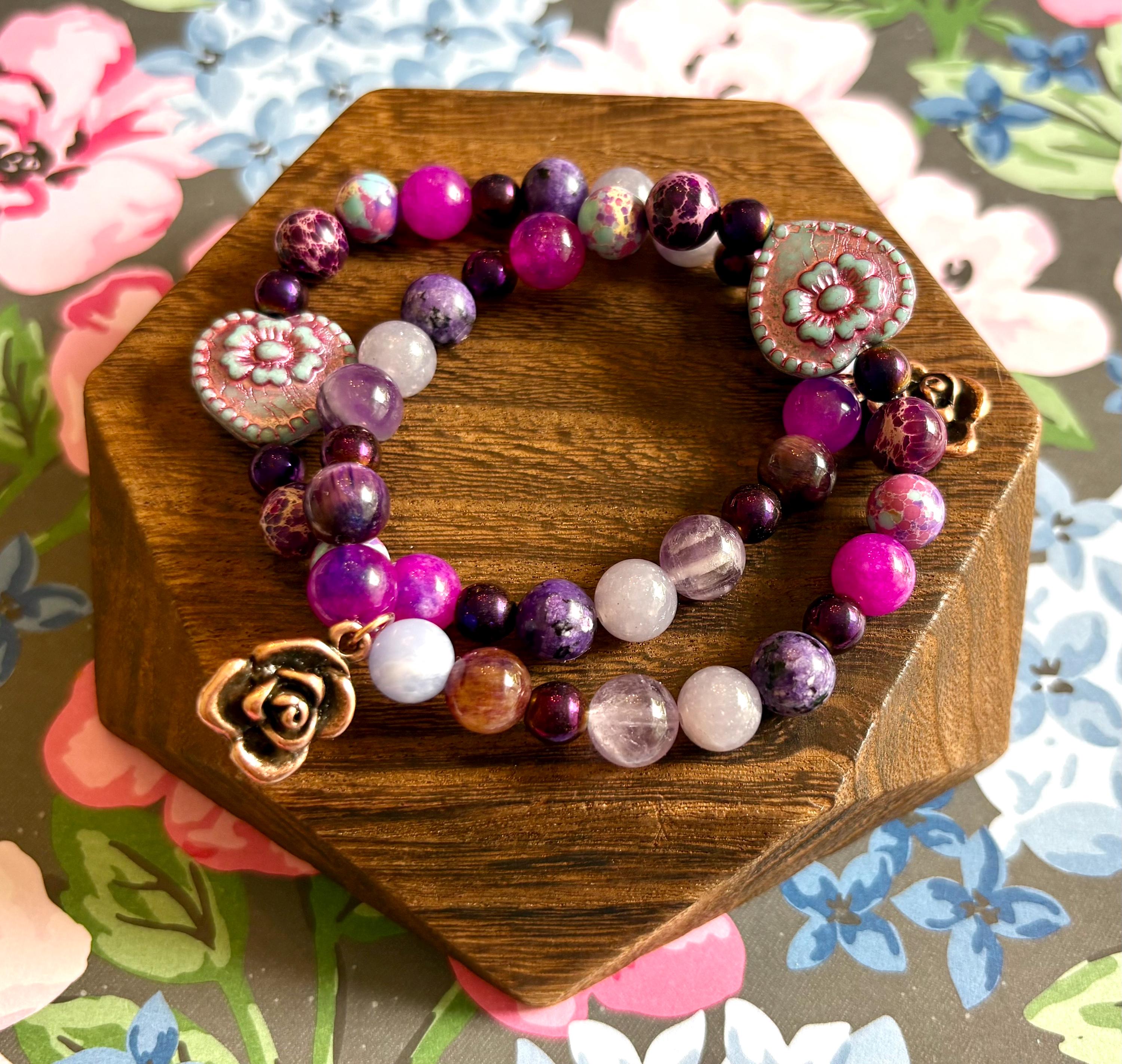 Enchanted Violet Heart Bracelet | Sugilite, Lepidolite, Amethyst, Purple Jade & Galaxy Jasper | Goddess Party Collection | Copper Rose Charm
