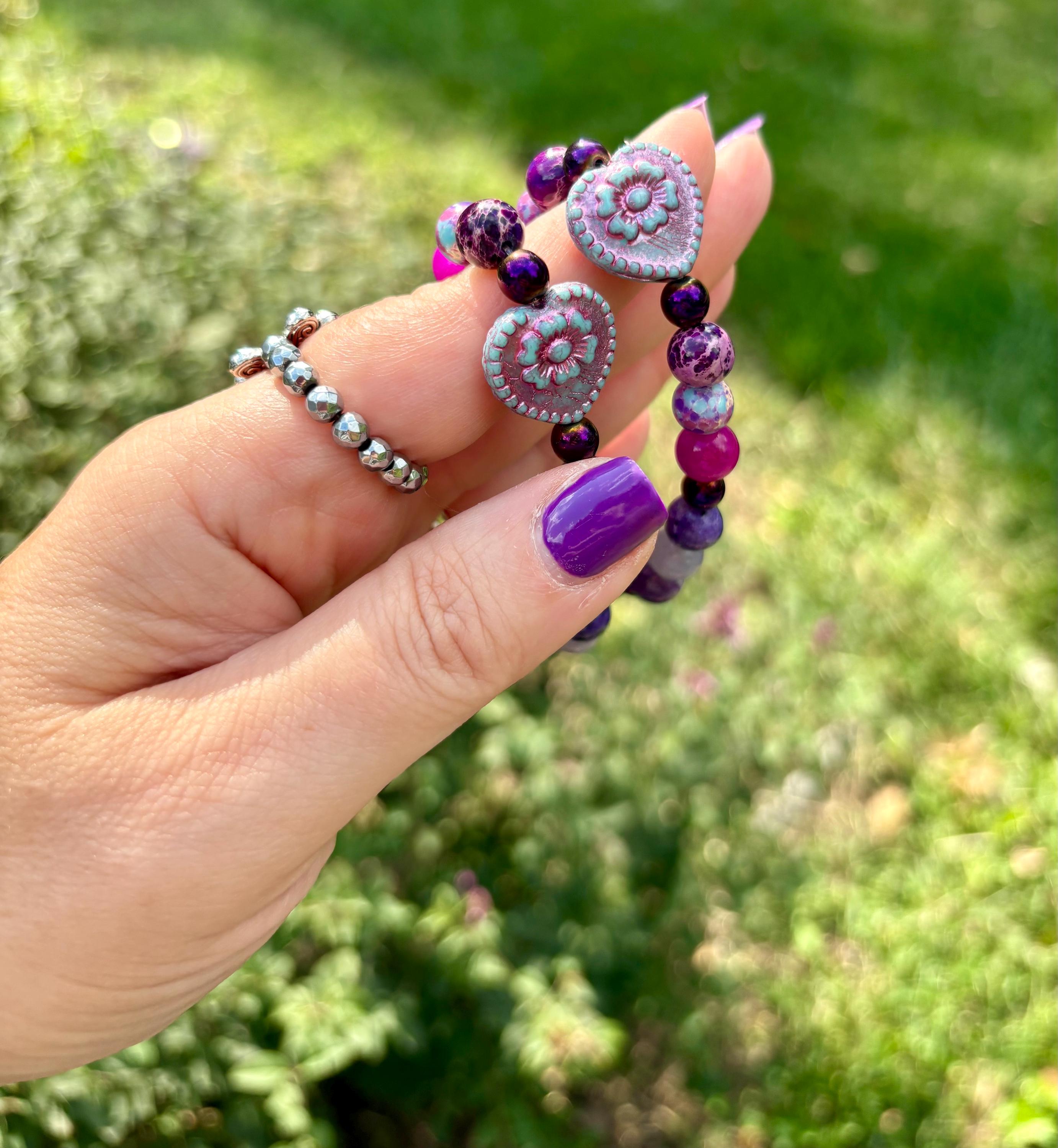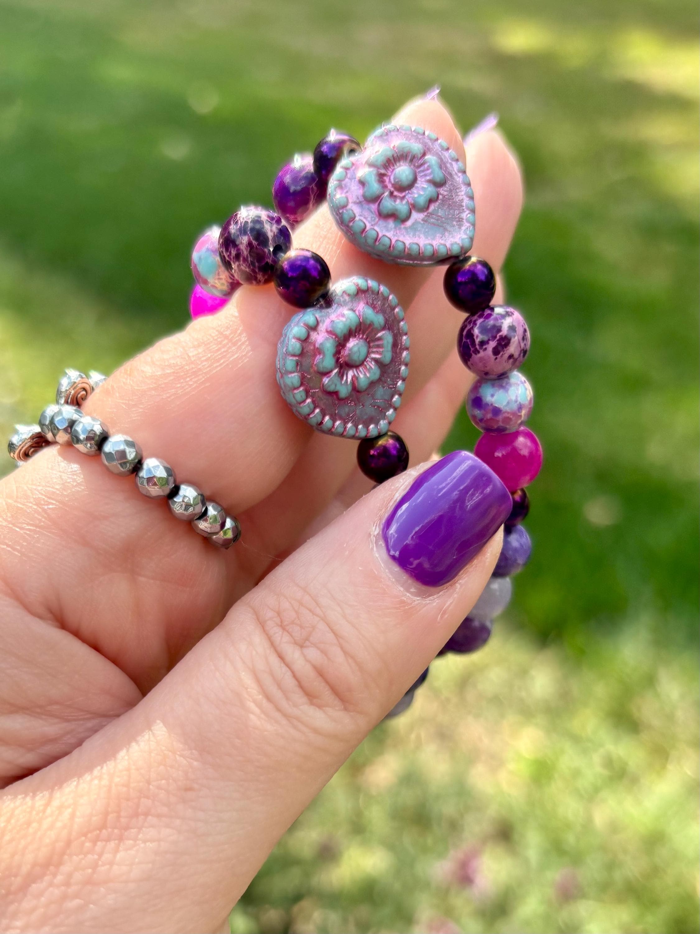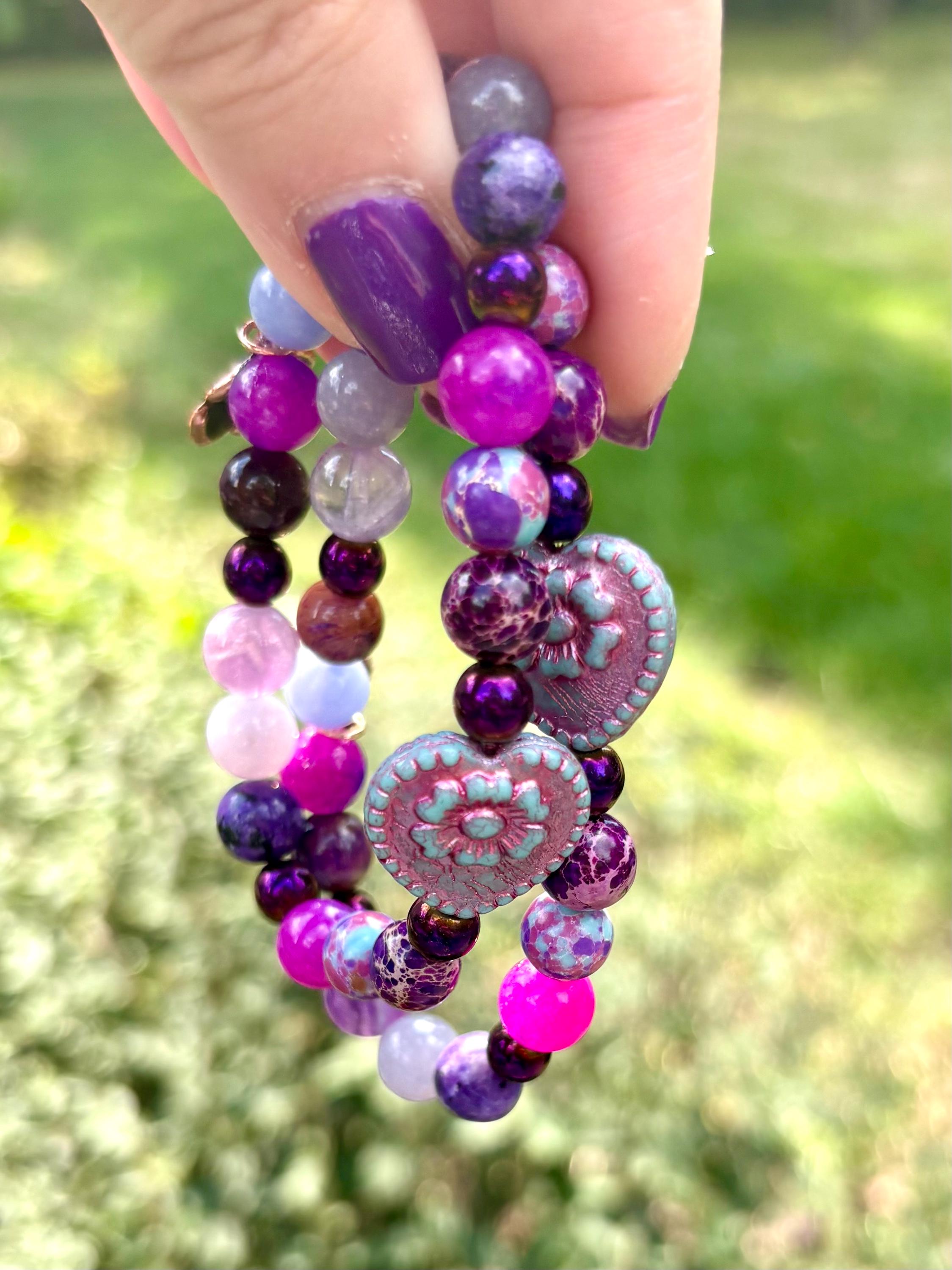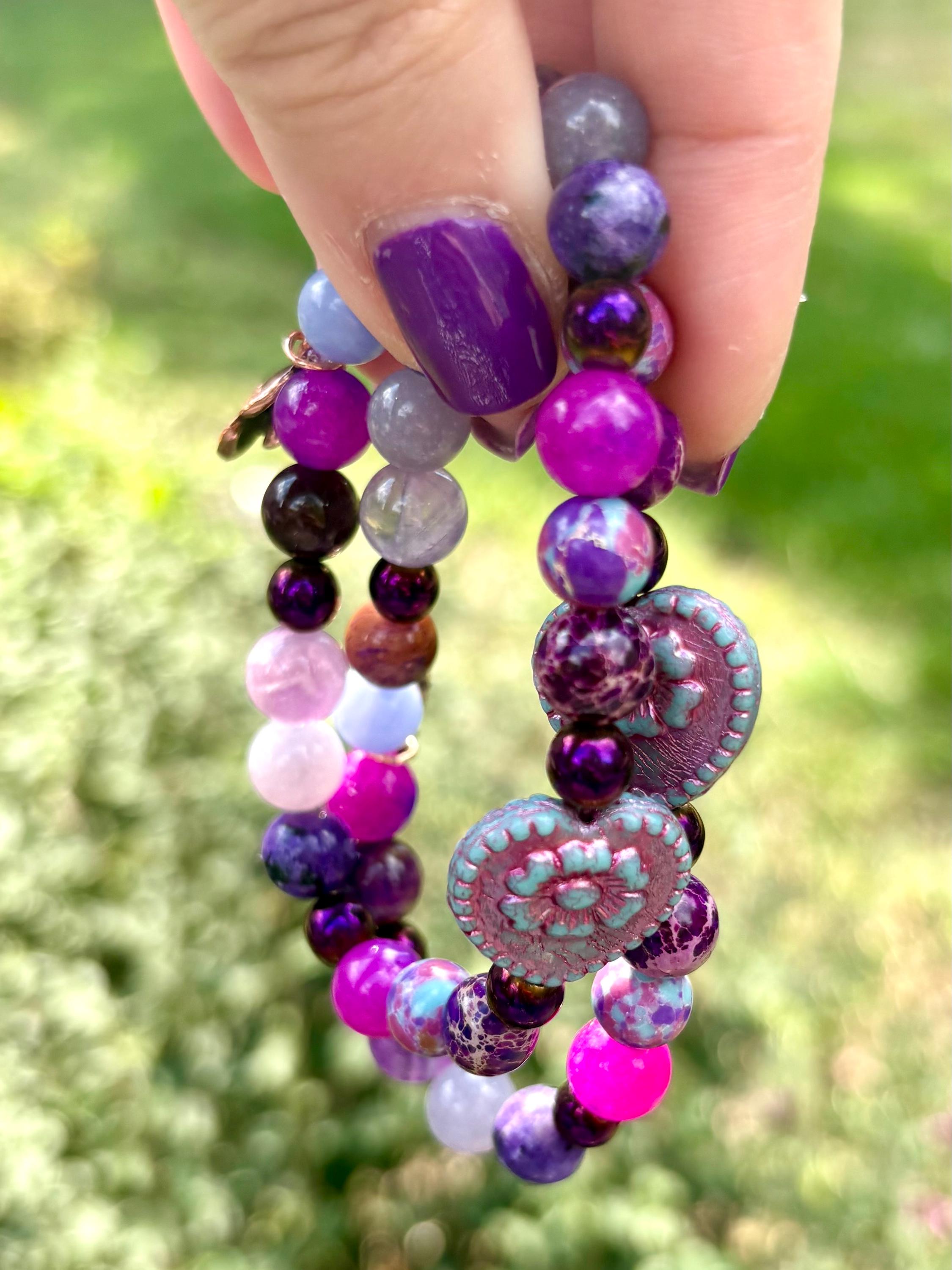 This bracelet is a celebration of intuition, transformation, and deep spiritual grace — featuring a gorgeous Czech glass heart focal bead, Sugilite, Tanzanian Lepidolite, Amethyst, Purple Jade, Galaxy Sediment Jasper, Tiger’s Eye, and metallic purple Hematite.