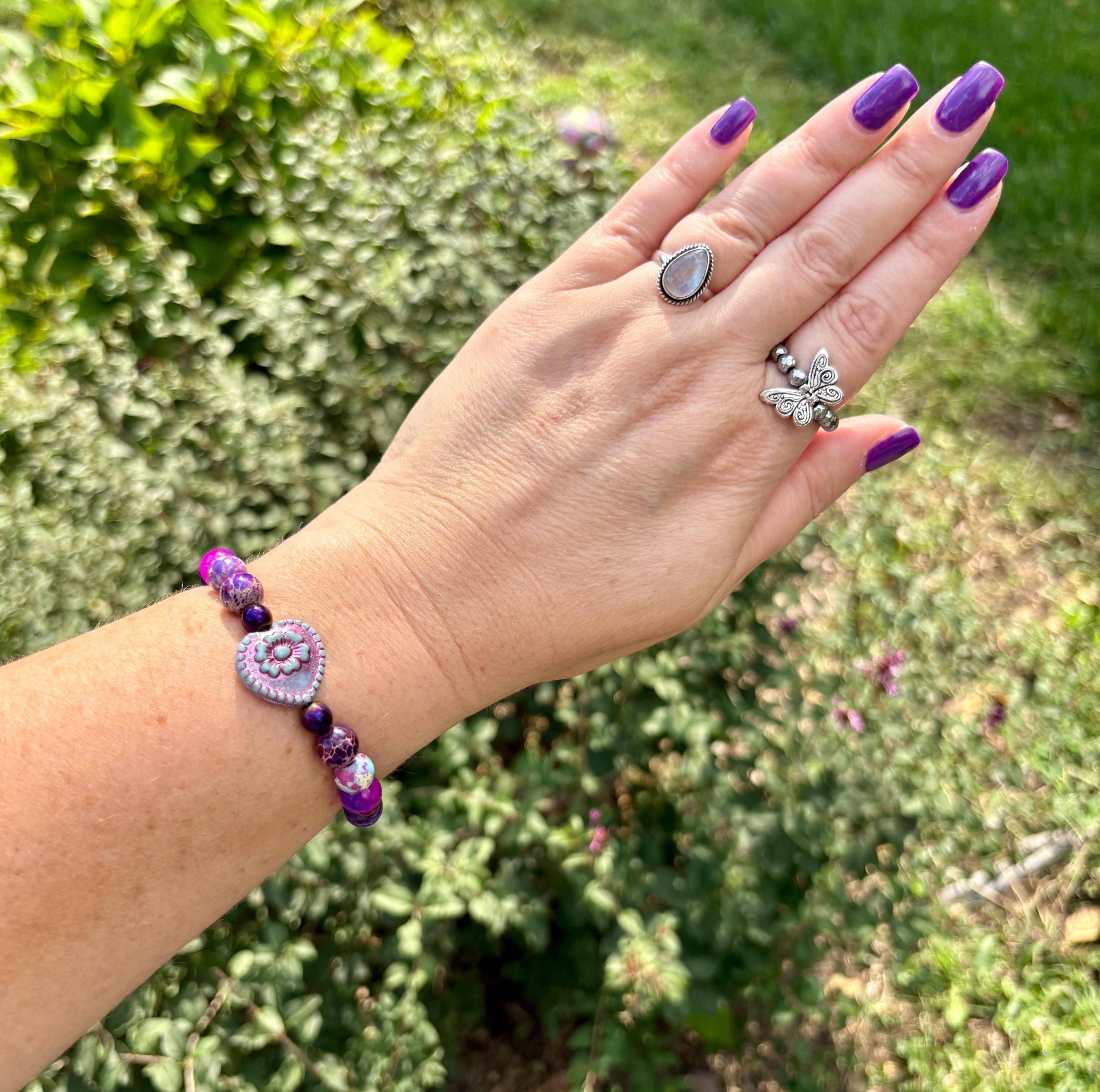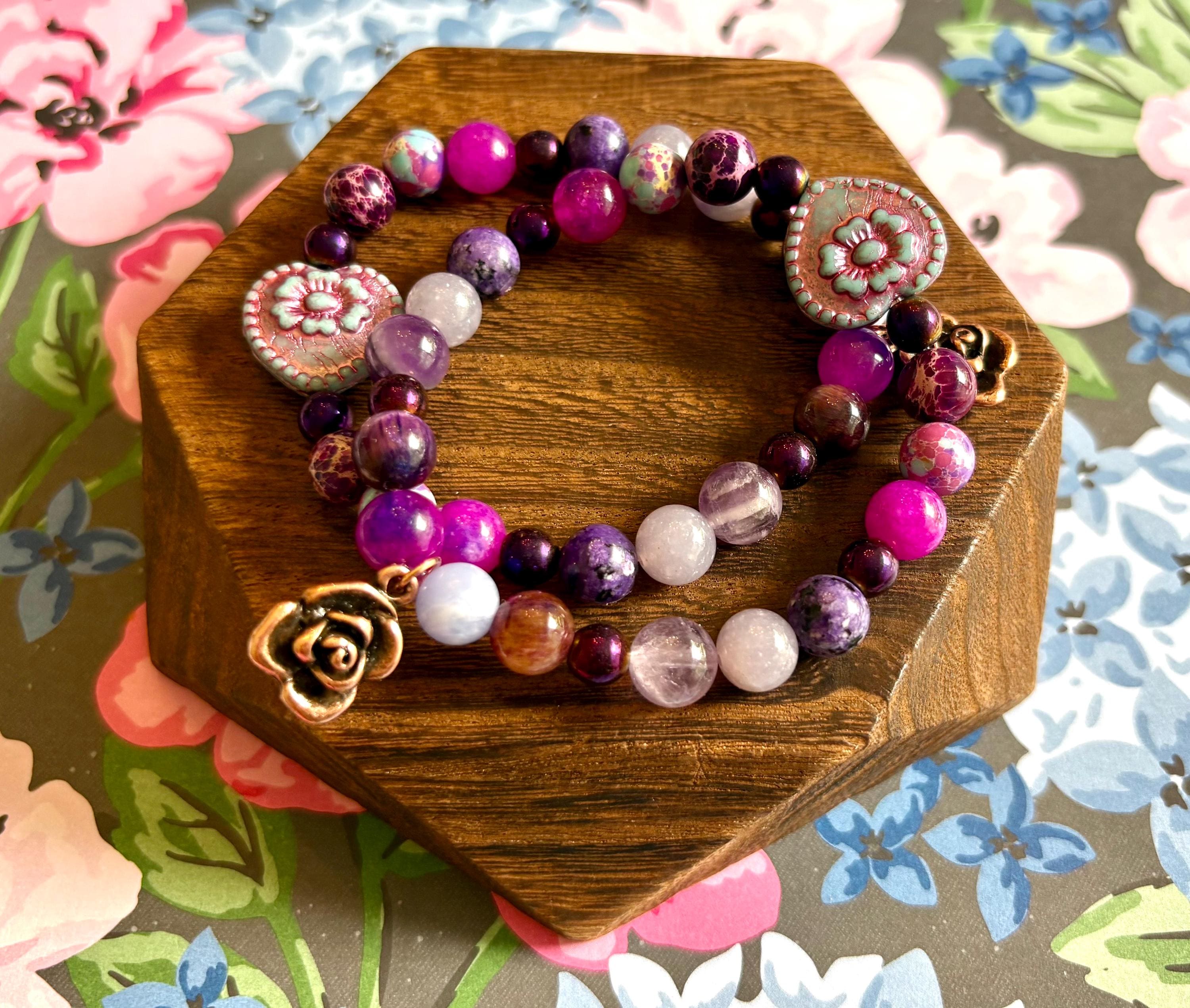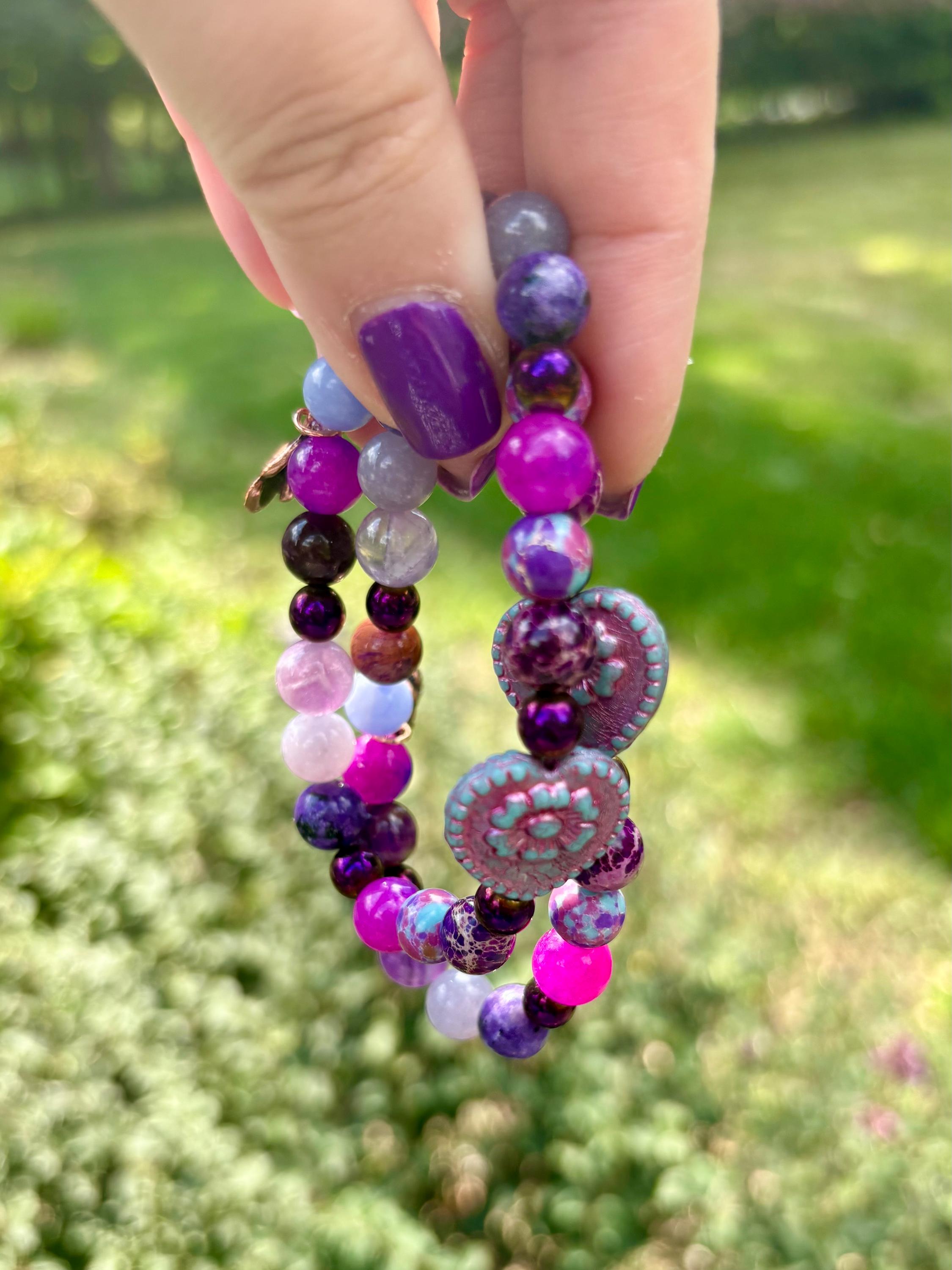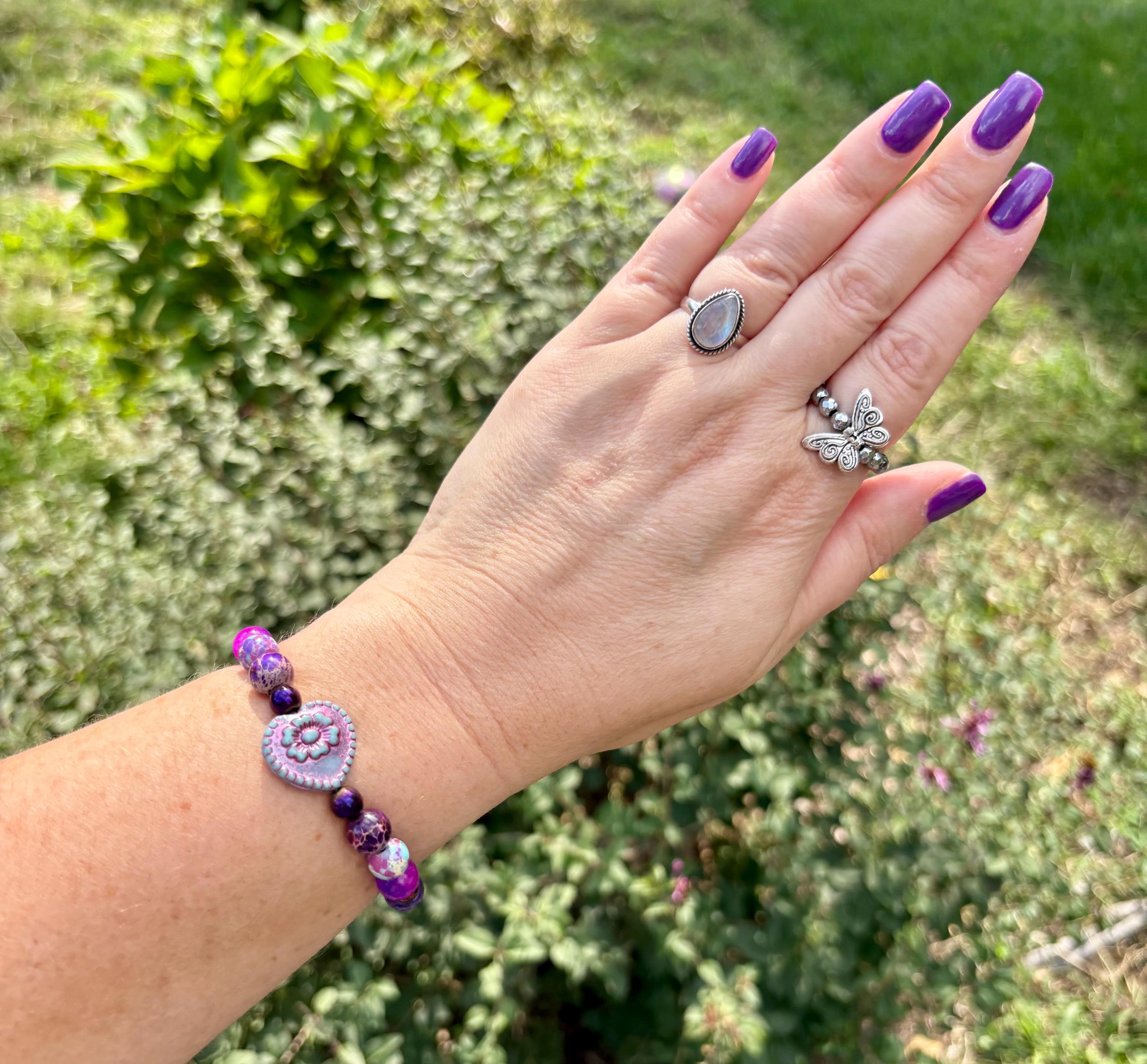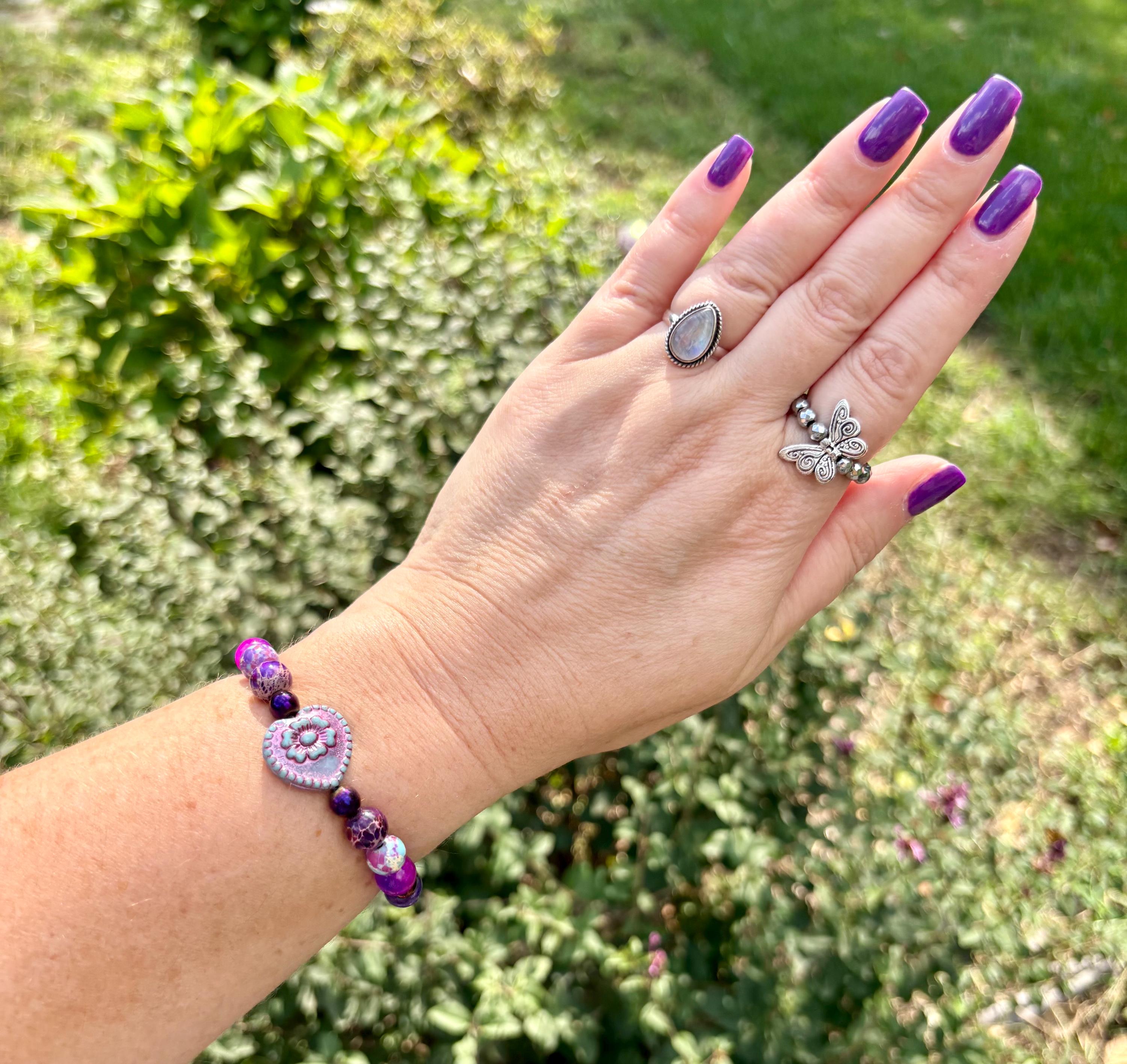 This bracelet is a celebration of intuition, transformation, and deep spiritual grace — featuring a gorgeous Czech glass heart focal bead, Sugilite, Tanzanian Lepidolite, Amethyst, Purple Jade, Galaxy Sediment Jasper, Tiger’s Eye, and metallic purple Hematite.