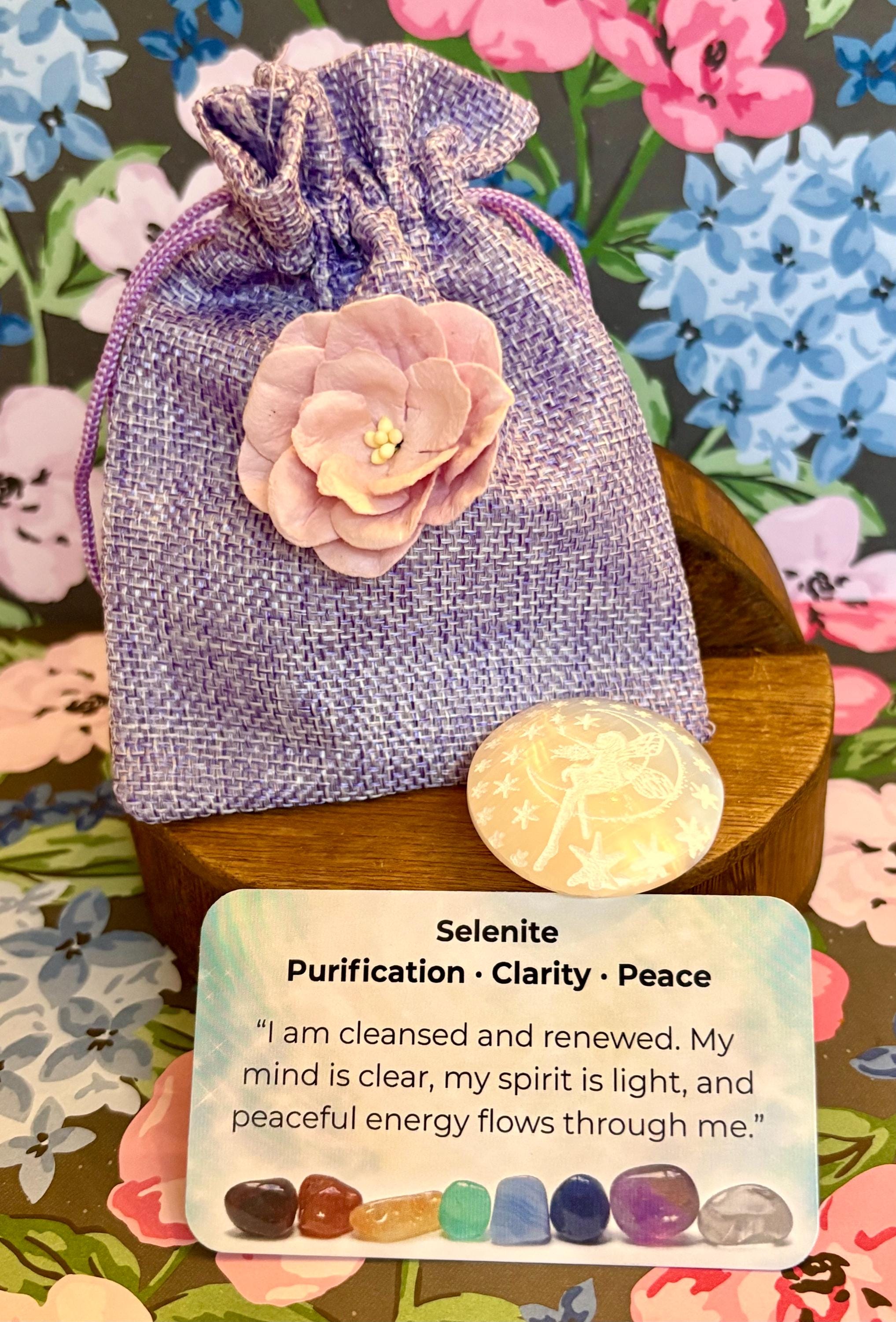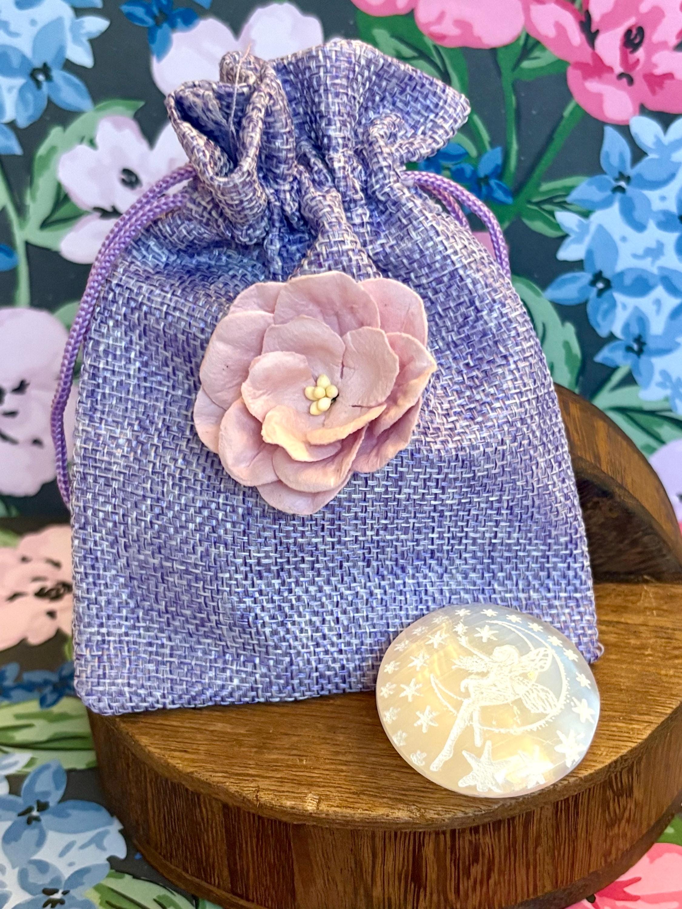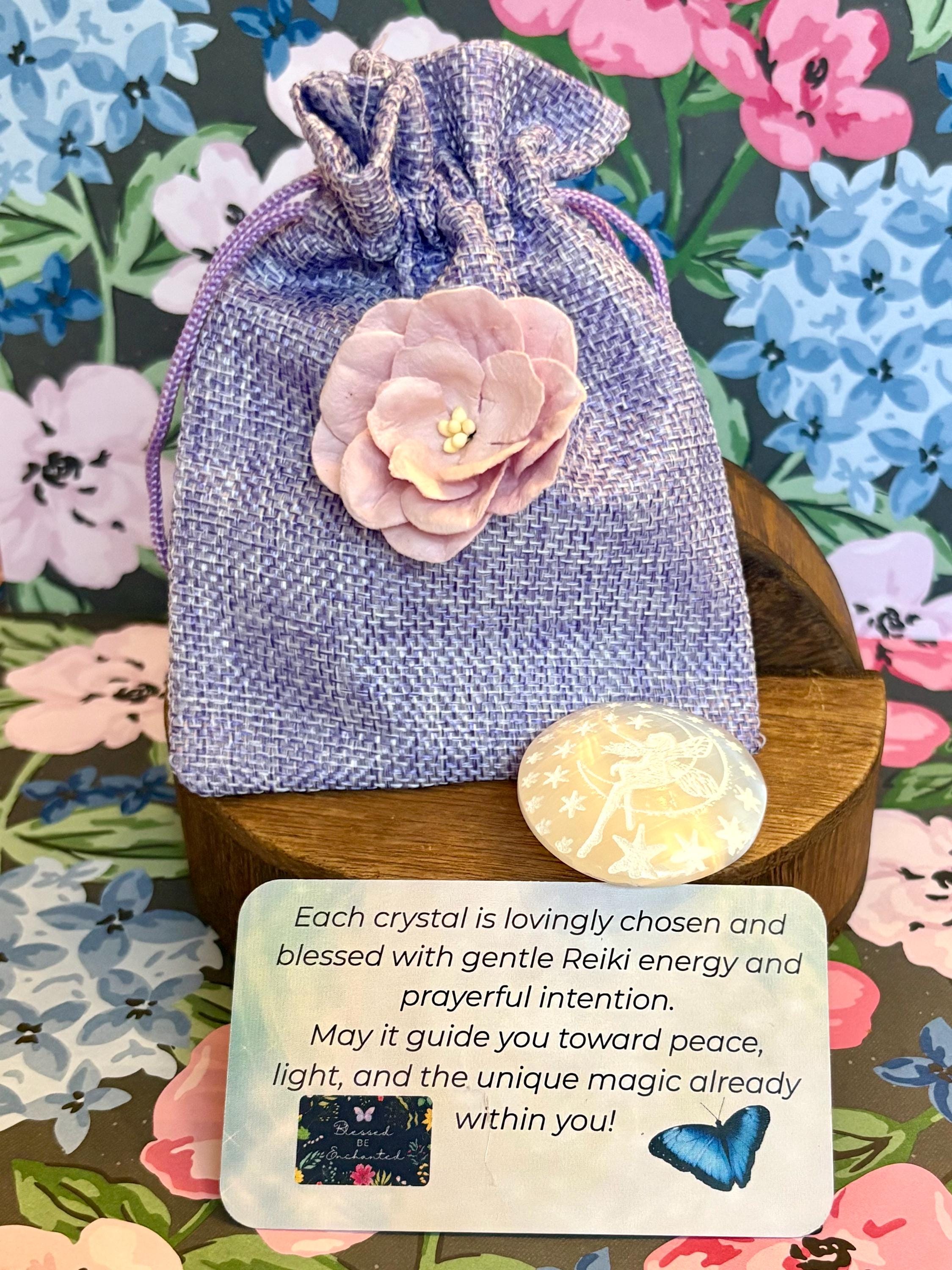 Angel Crystal Bag – Selenite Fairy Palm Stone • Purification • Clarity • Peace • Reiki Blessed Healing Gift Set
