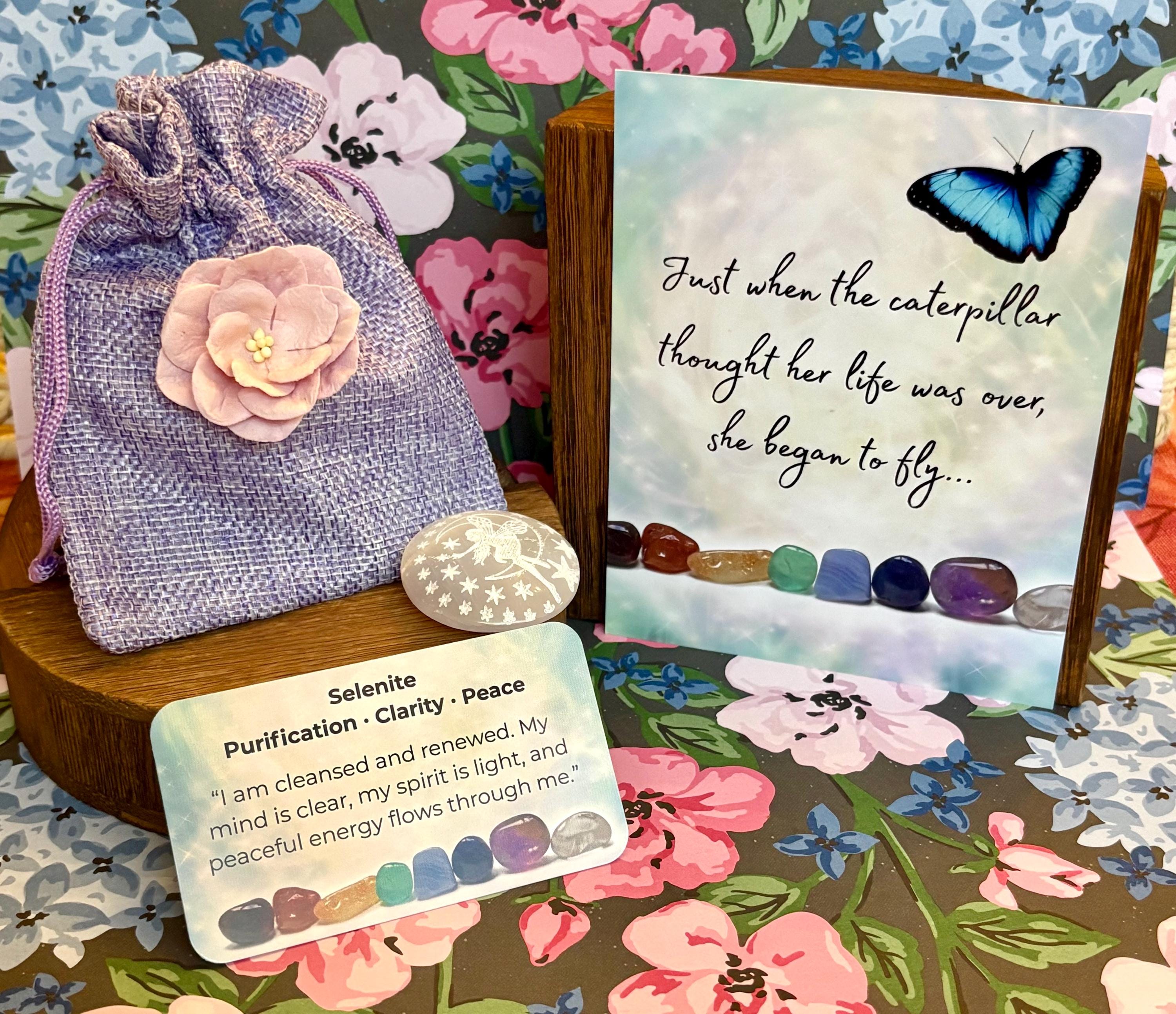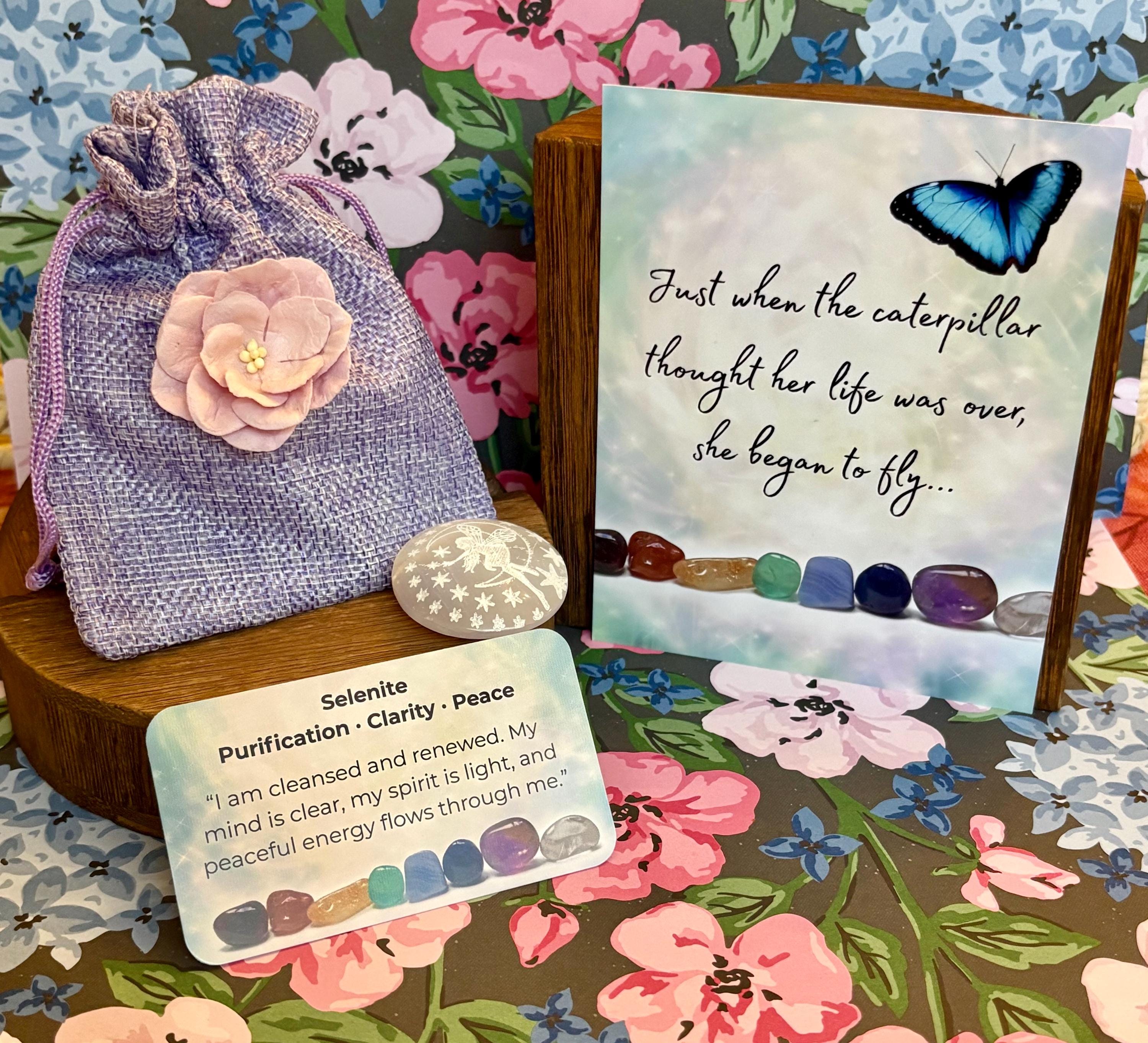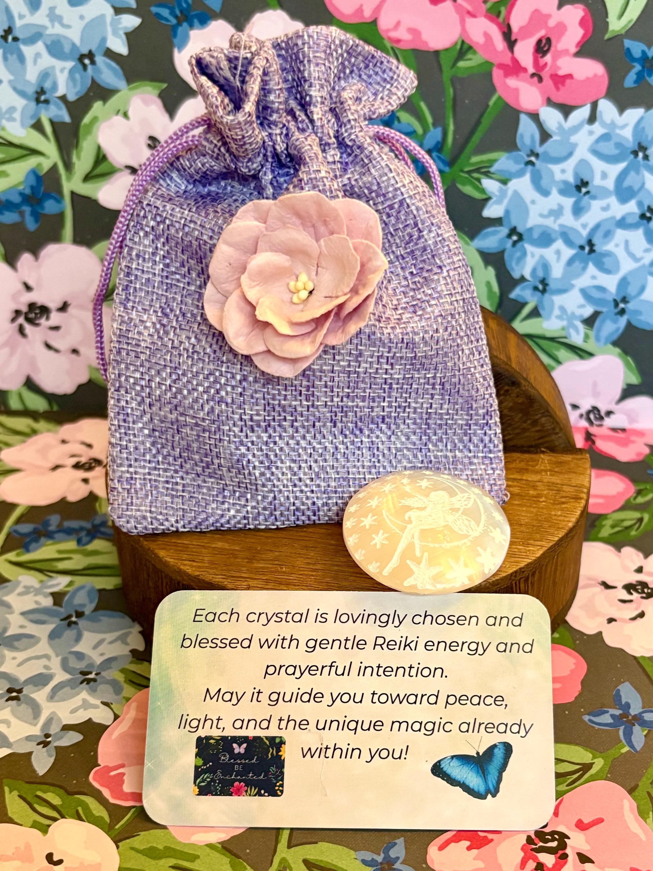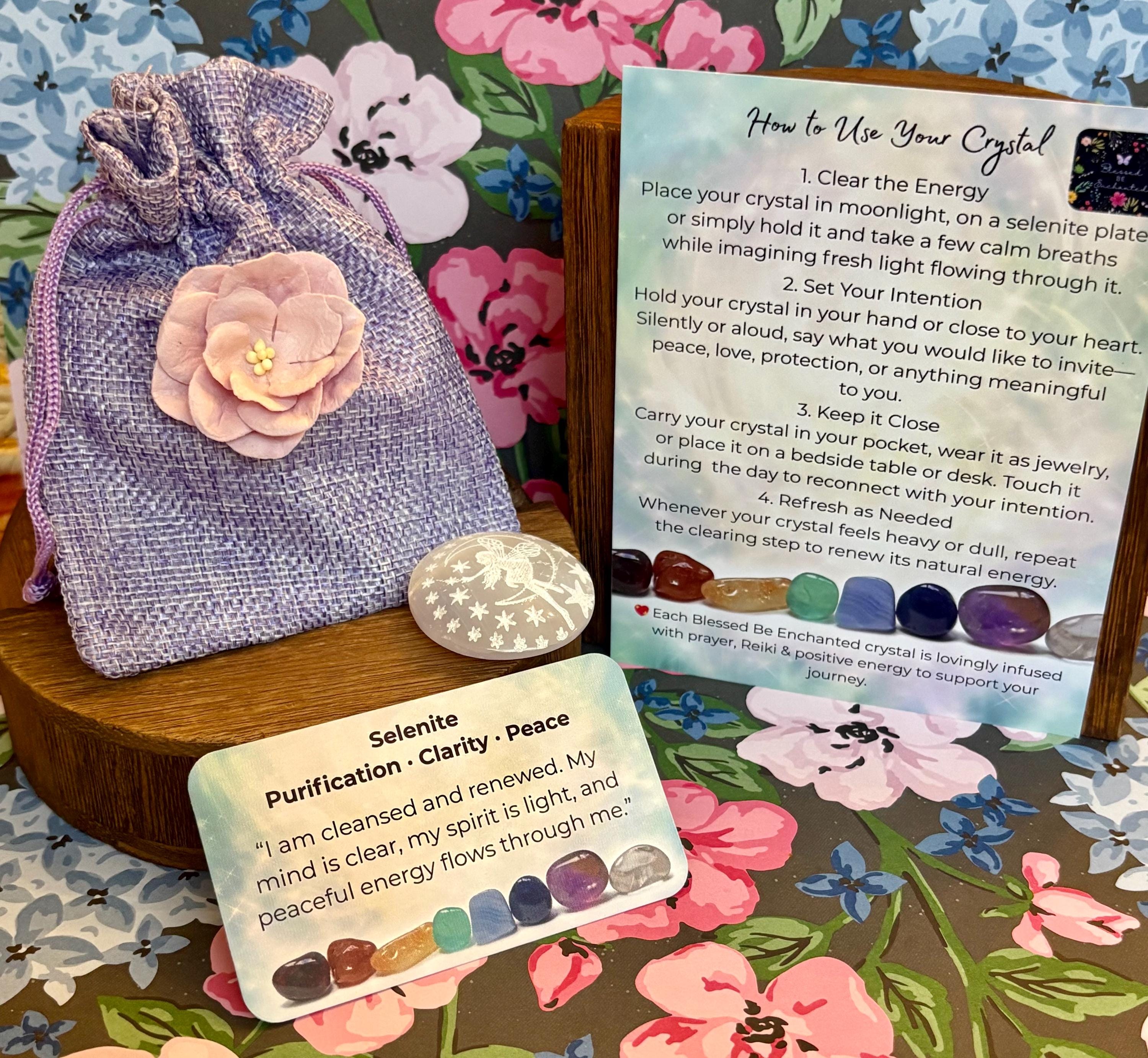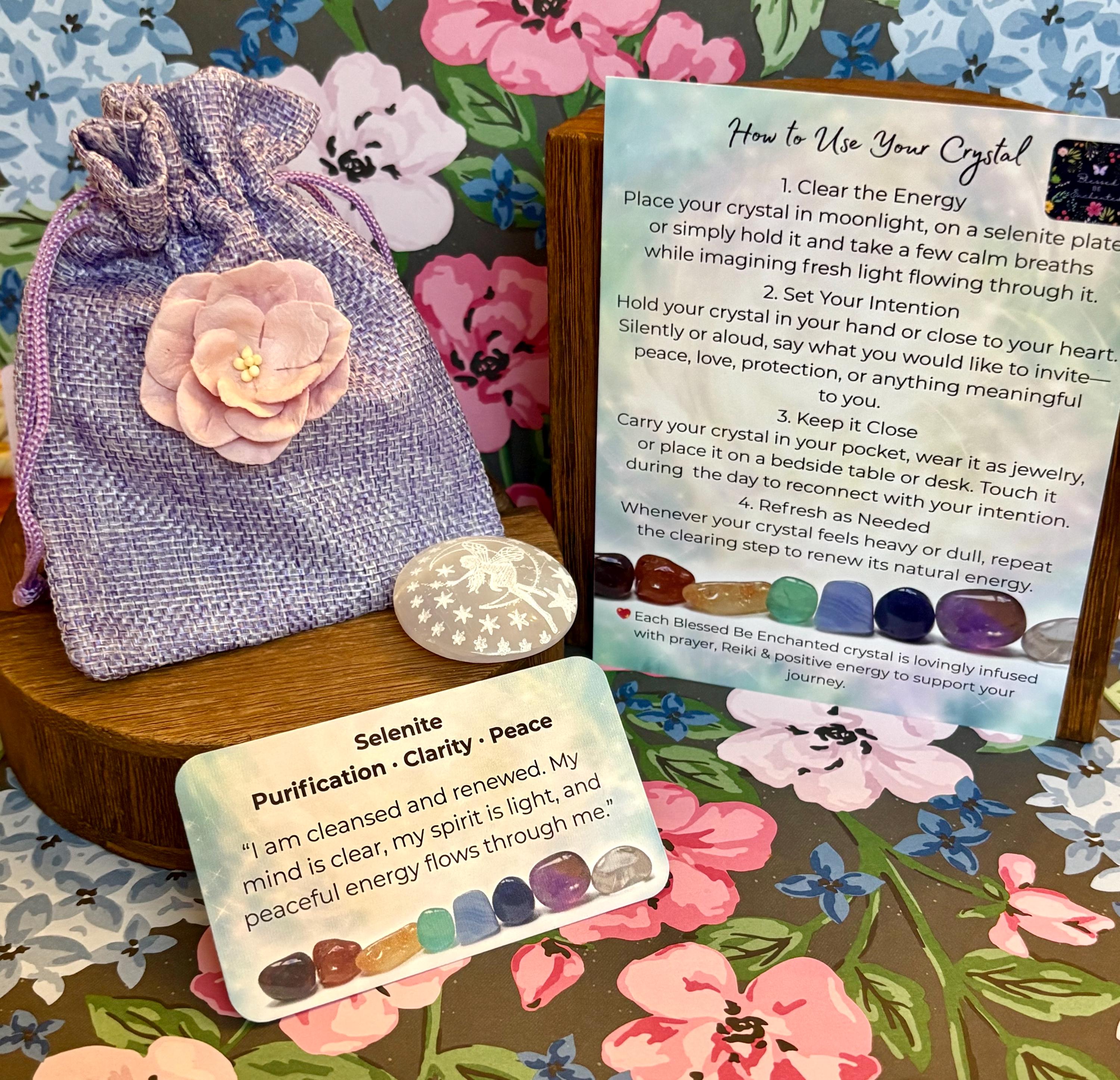 Invite peace, purity, and angelic energy into your day with this lovingly curated crystal set! Each Blessed Be Enchanted Angel Crystal Bag is infused with prayer, Reiki, and positive light to support your spiritual journey.