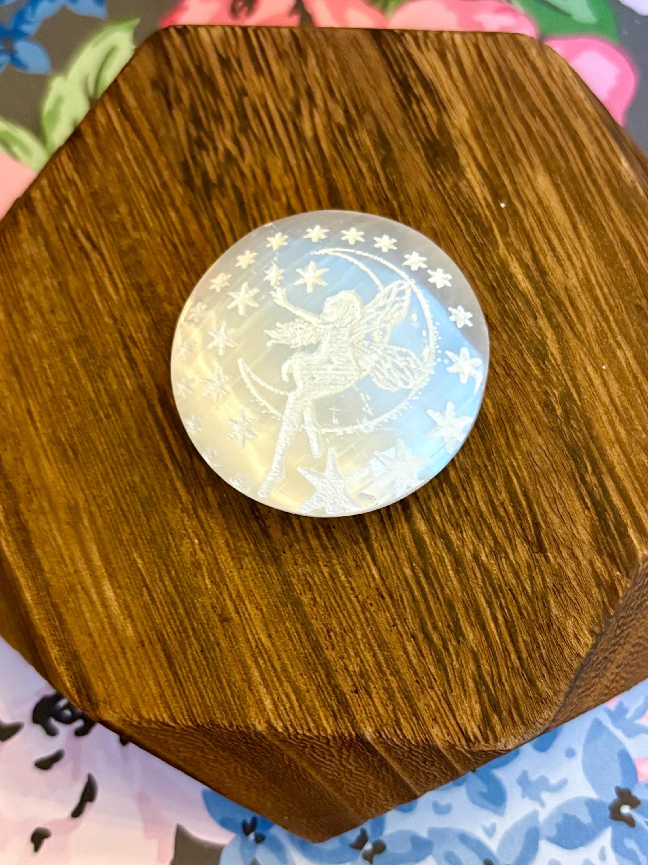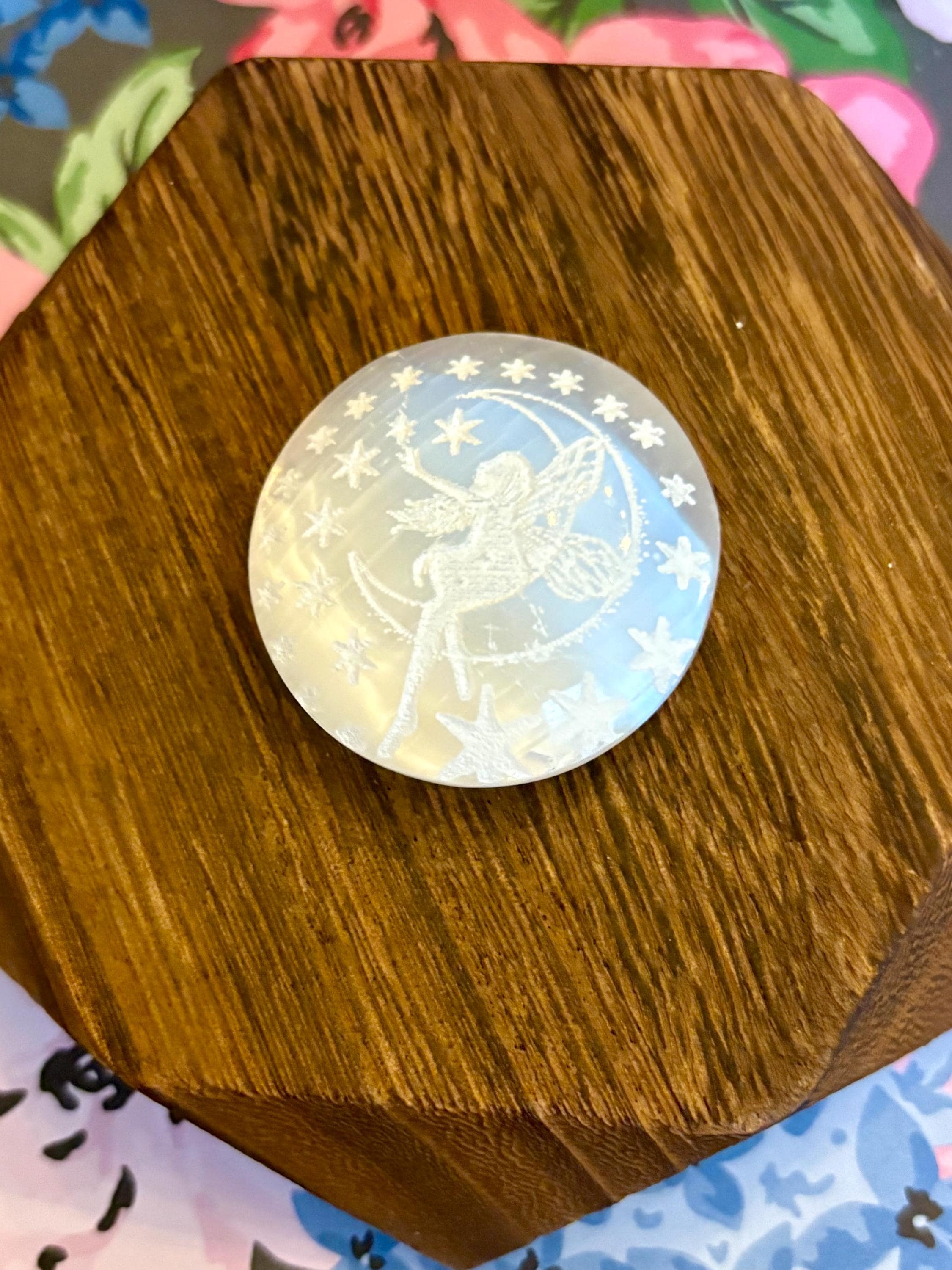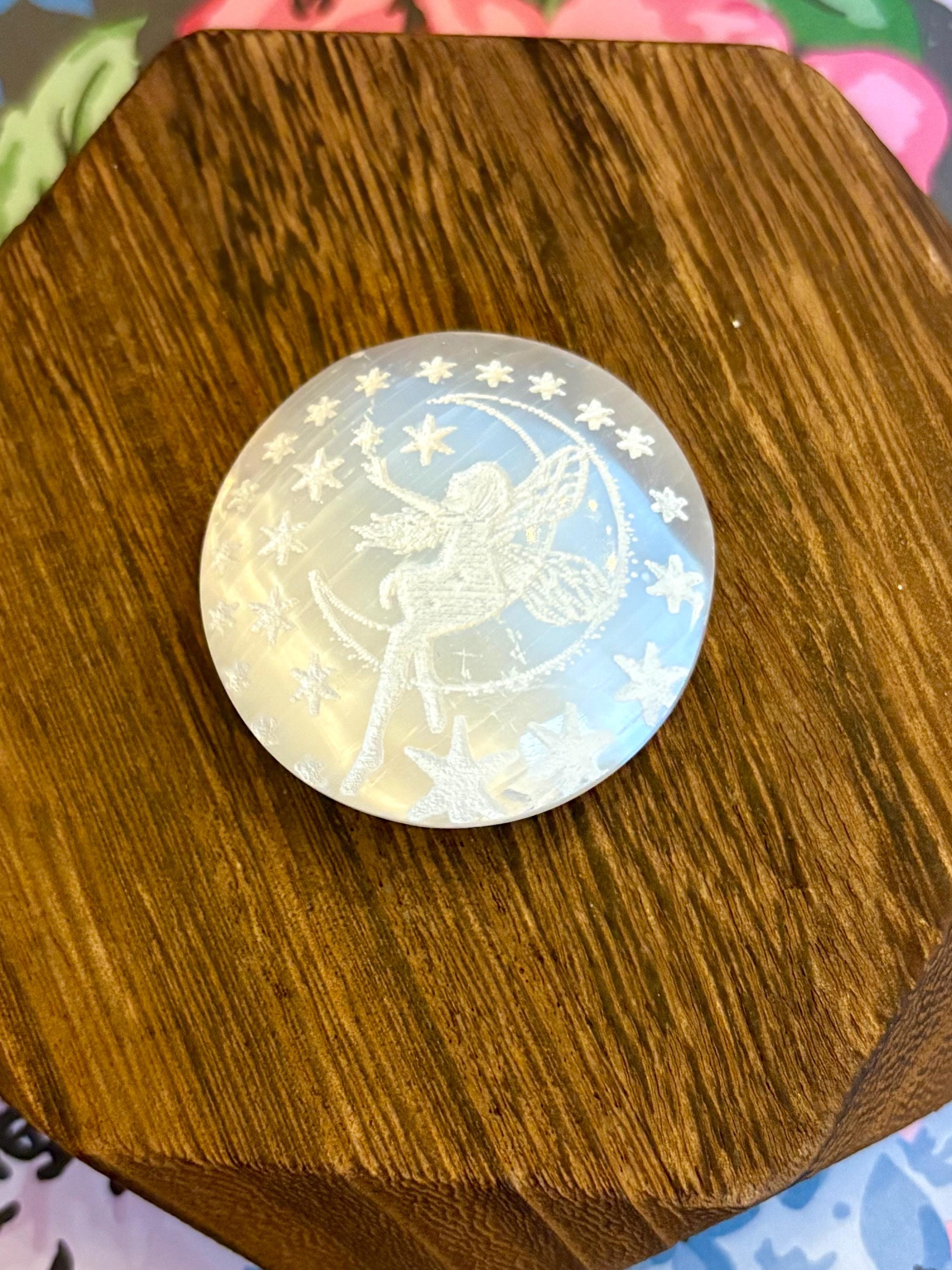 💜 1 Round Selenite Palm Stone beautifully carved with a fairy design, radiating gentle lunar energy.