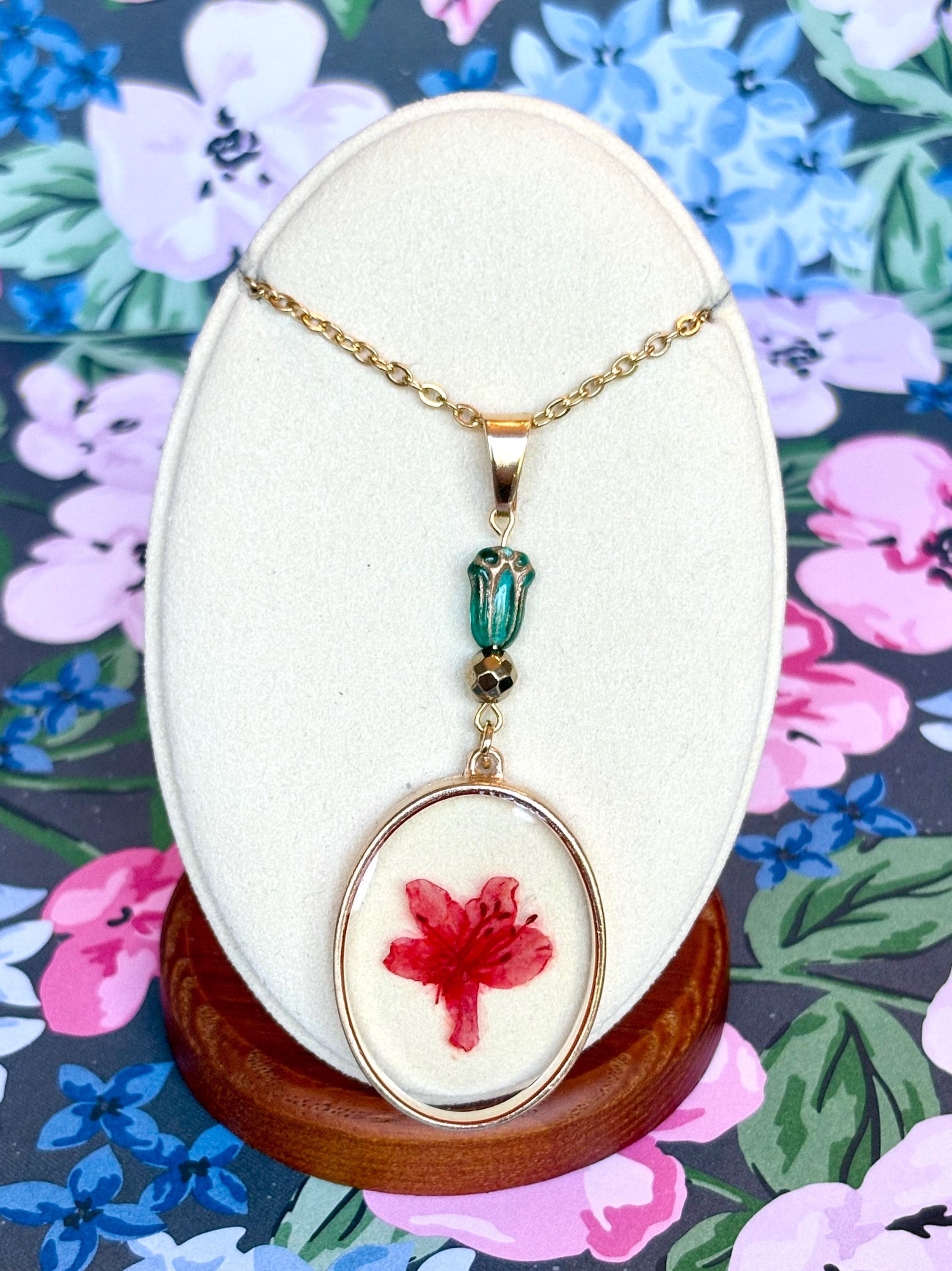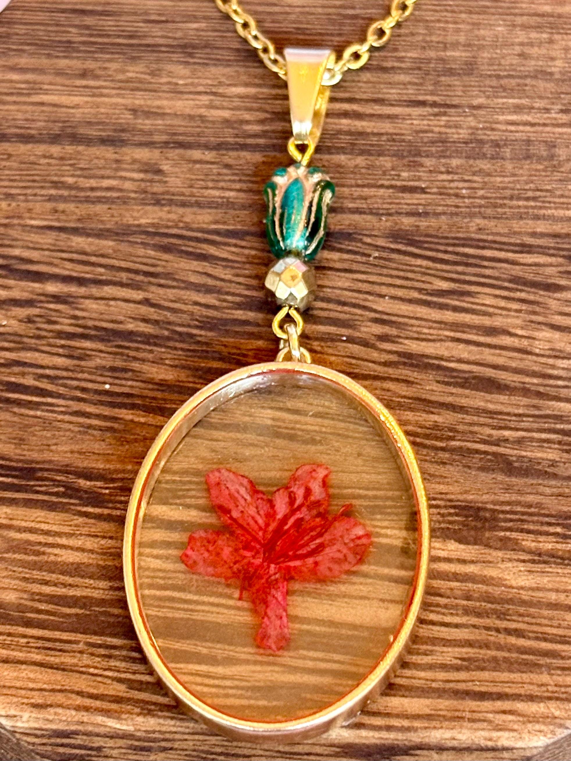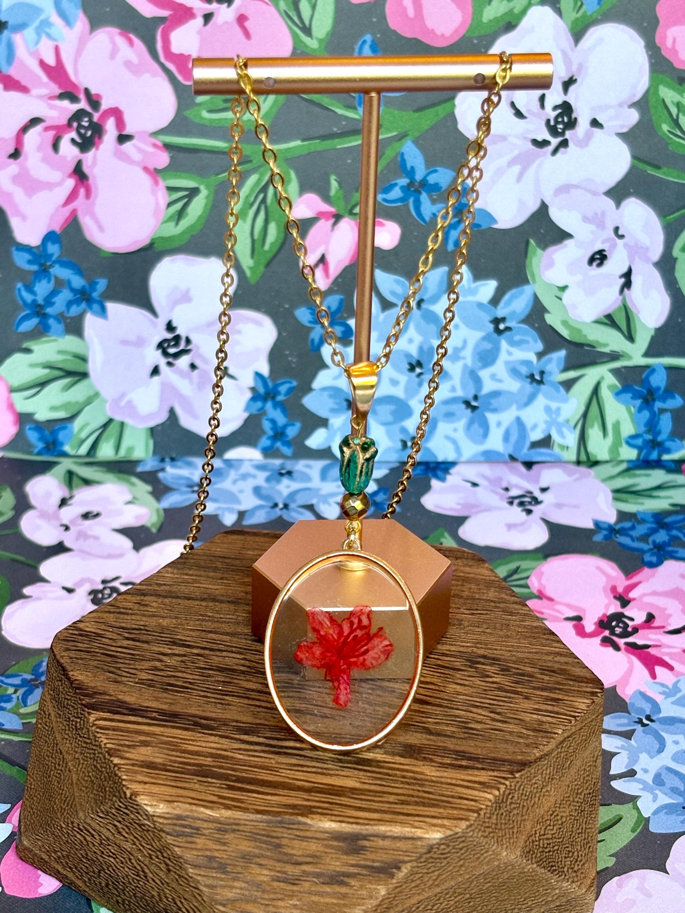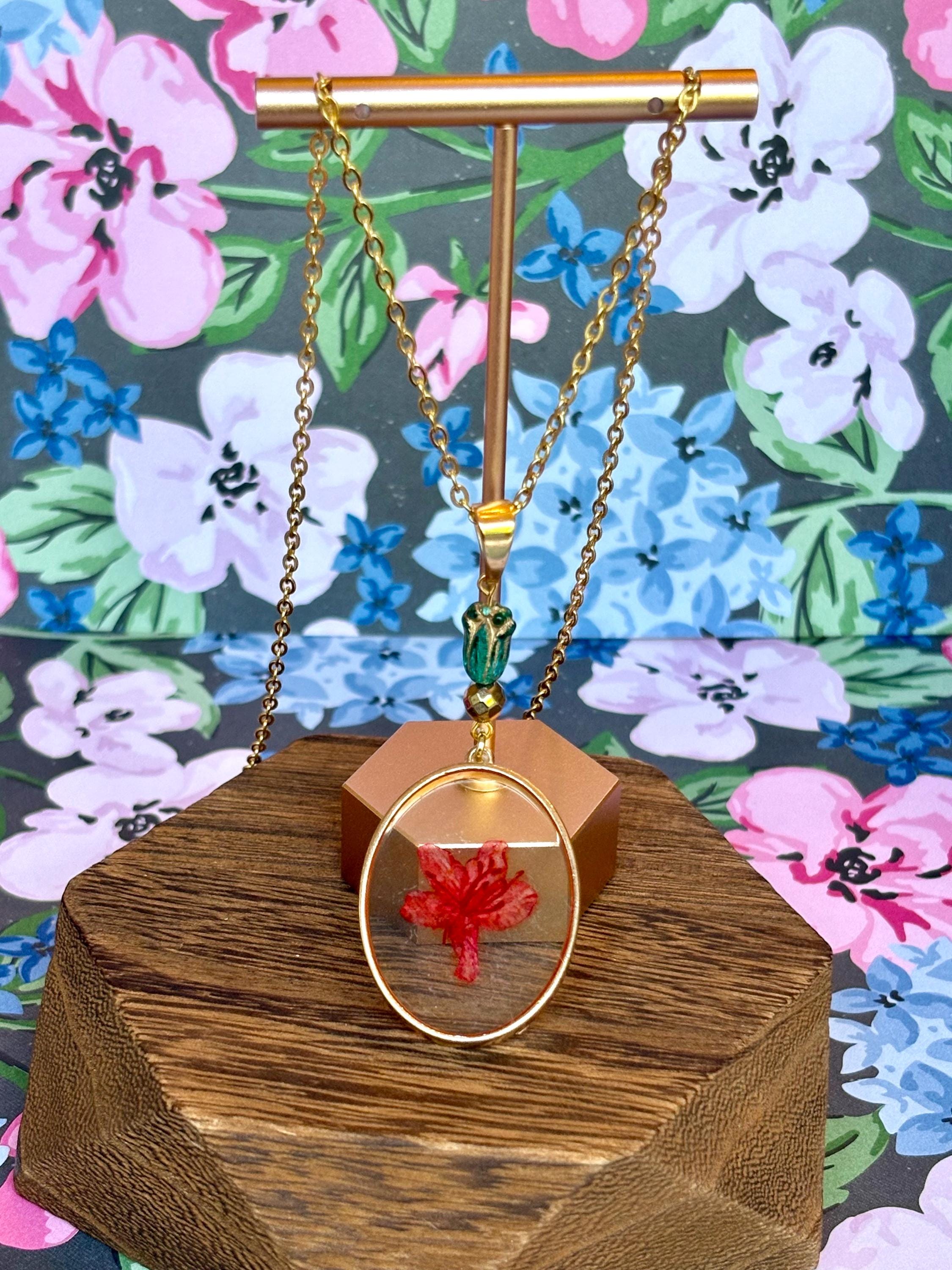 Step into the season of sparkle and serenity with the Holiday Pageant Necklace — a delicate celebration of beauty, balance, and nature’s artistry! This enchanting piece features a real dried pressed red flower preserved in a resin oval pendant framed in gold. Above it, a Czech glass green tulip bead with gold wash and faceted gold hematite gemstone add a radiant touch of holiday elegance.