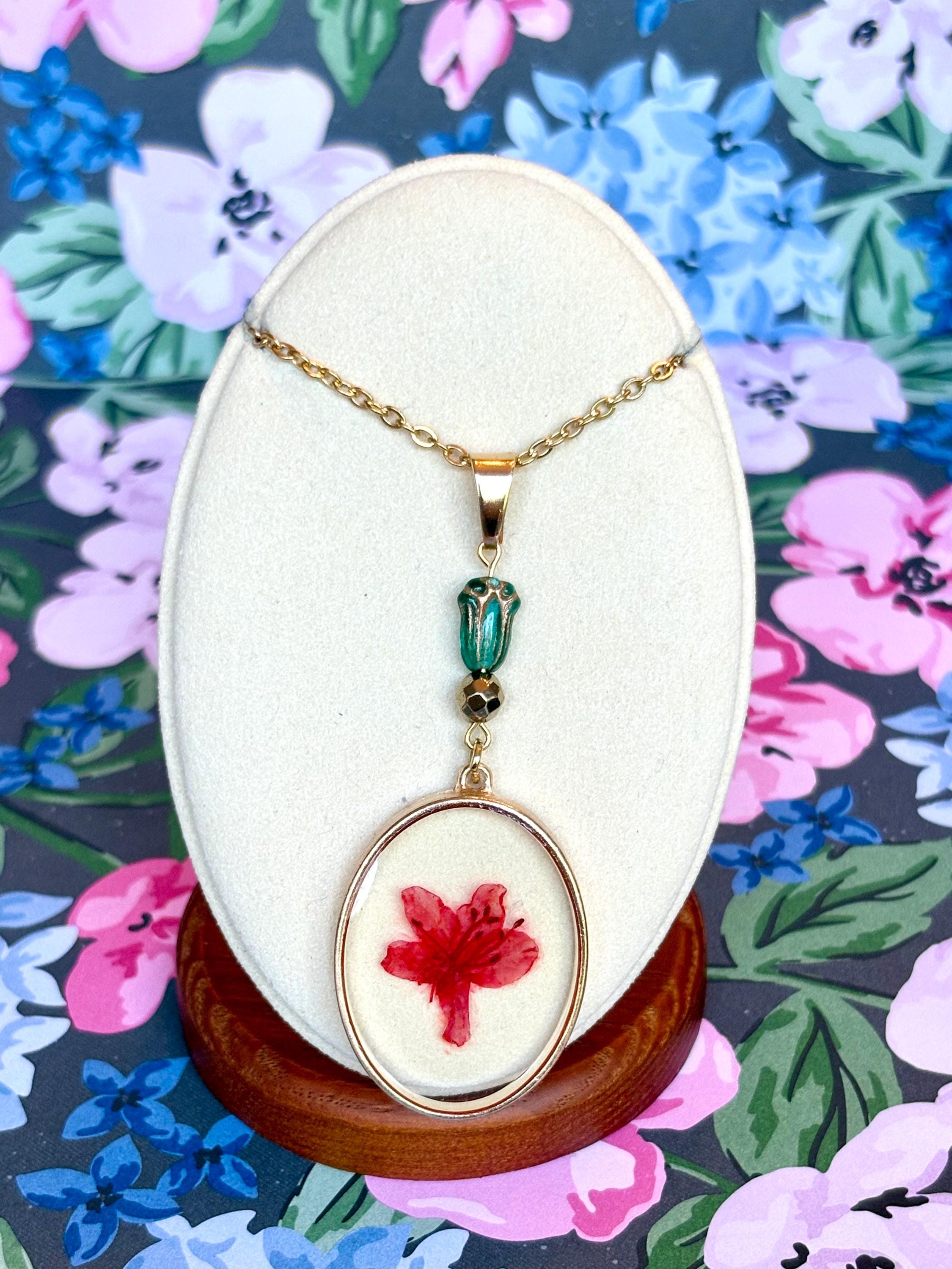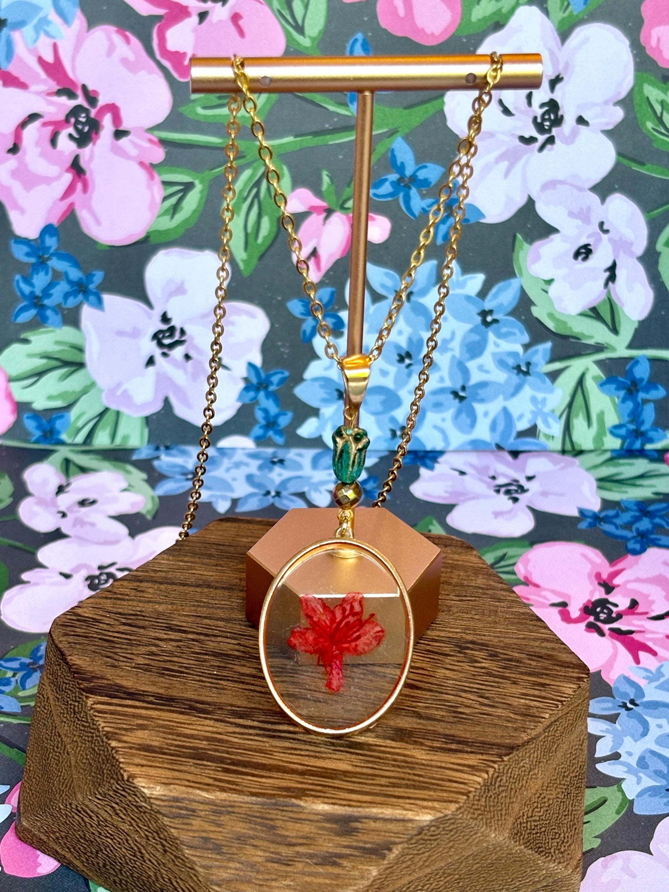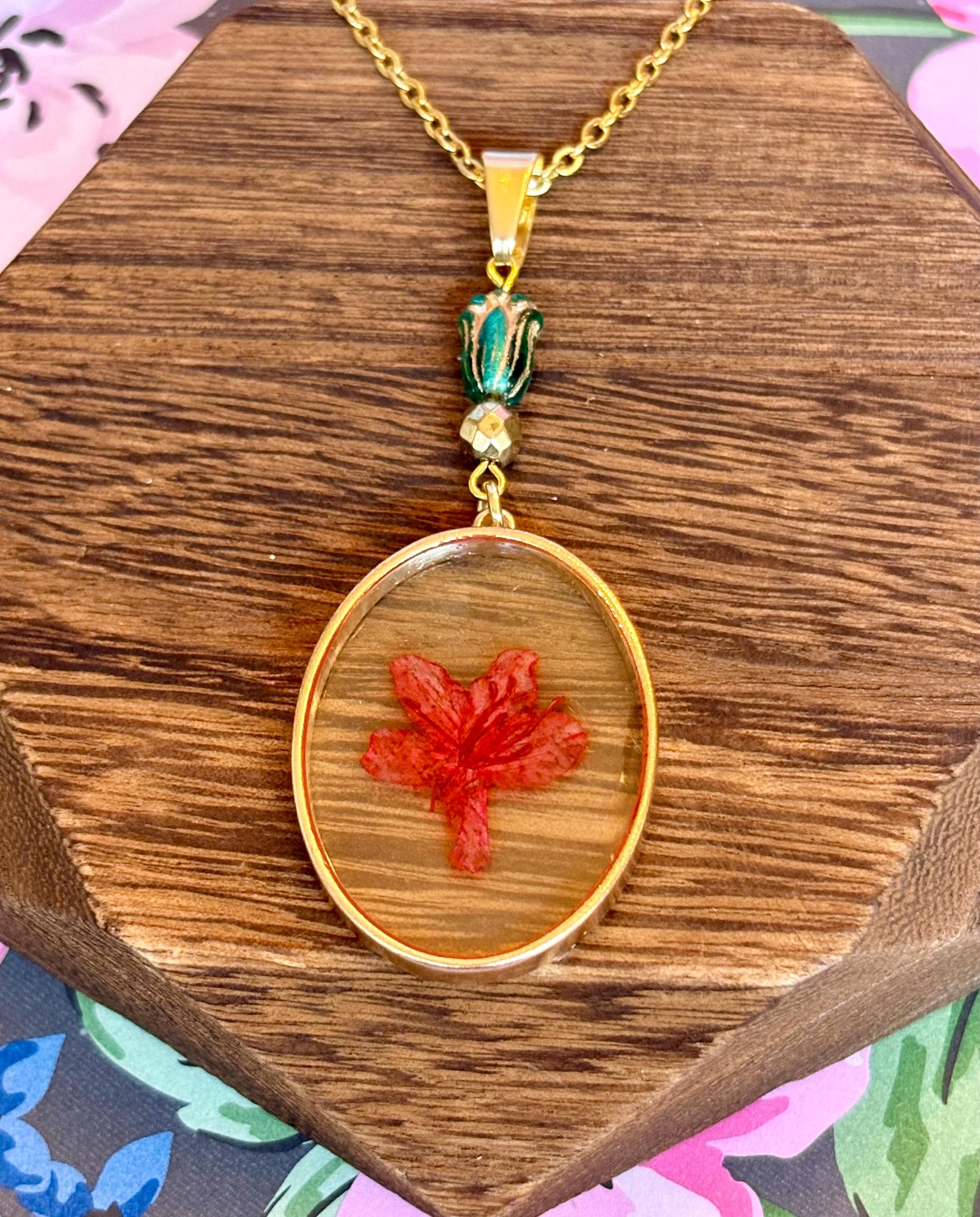 Step into the season of sparkle and serenity with the Holiday Pageant Necklace — a delicate celebration of beauty, balance, and nature’s artistry! This enchanting piece features a real dried pressed red flower preserved in a resin oval pendant framed in gold. Above it, a Czech glass green tulip bead with gold wash and faceted gold hematite gemstone add a radiant touch of holiday elegance.