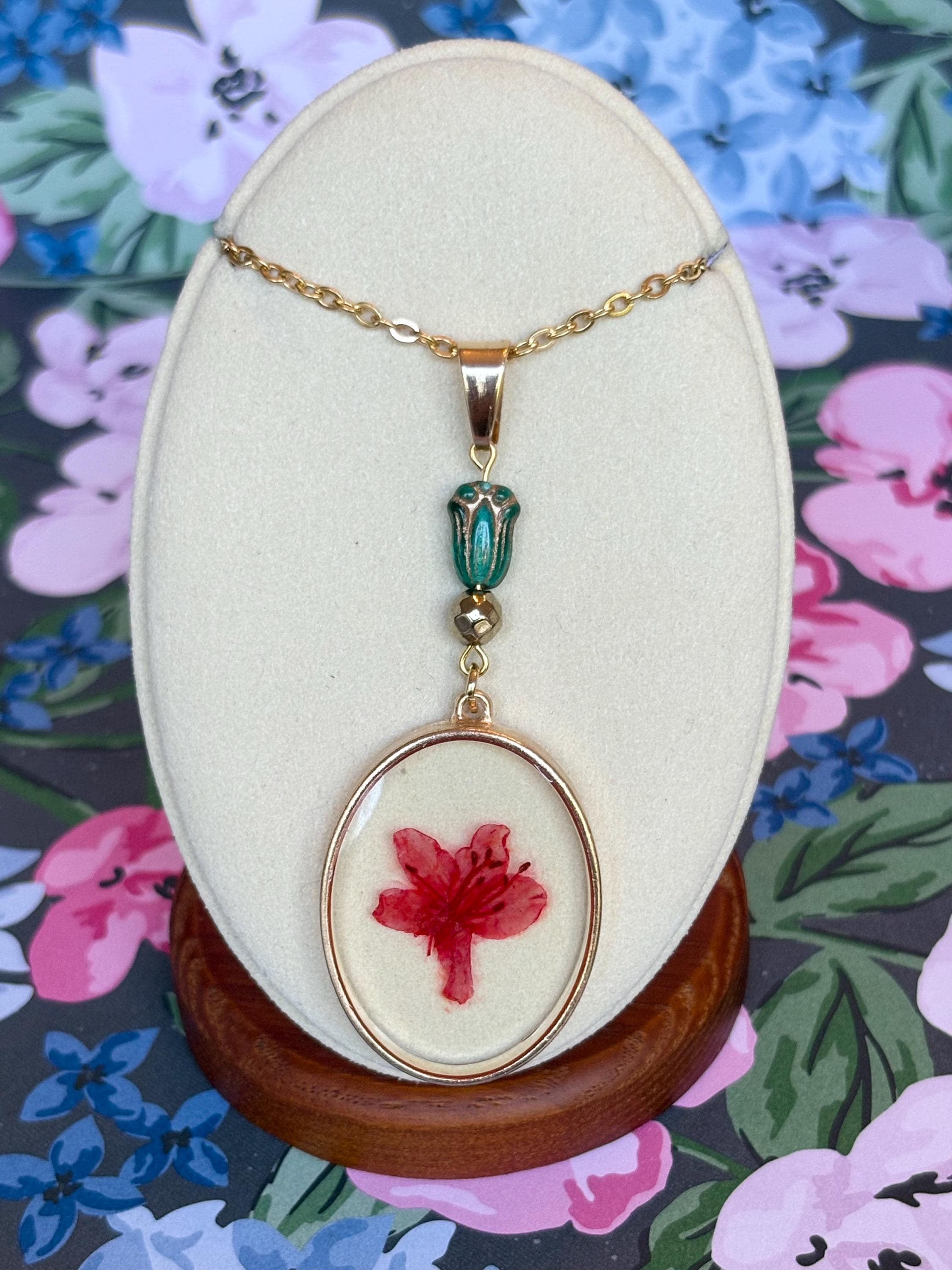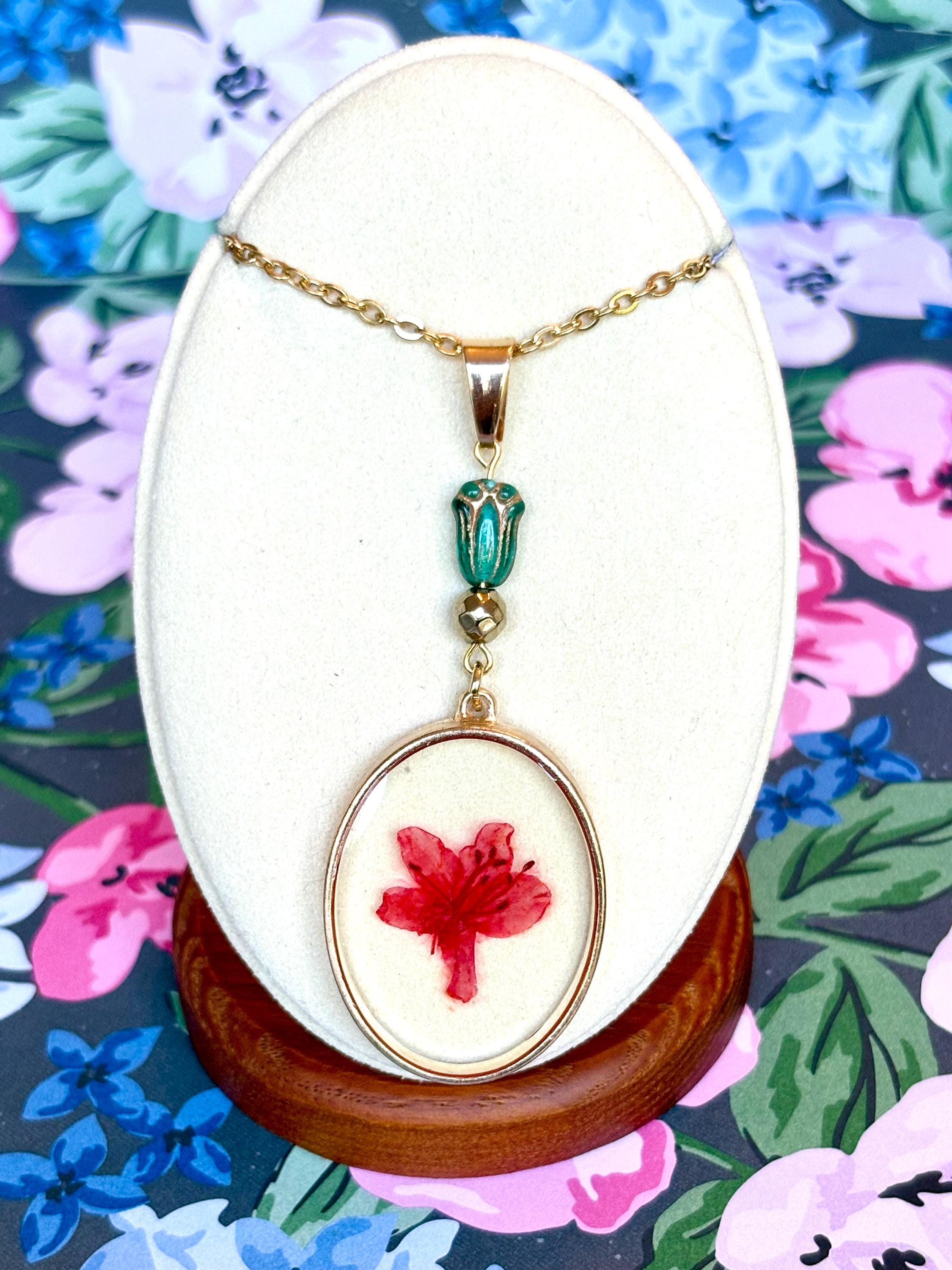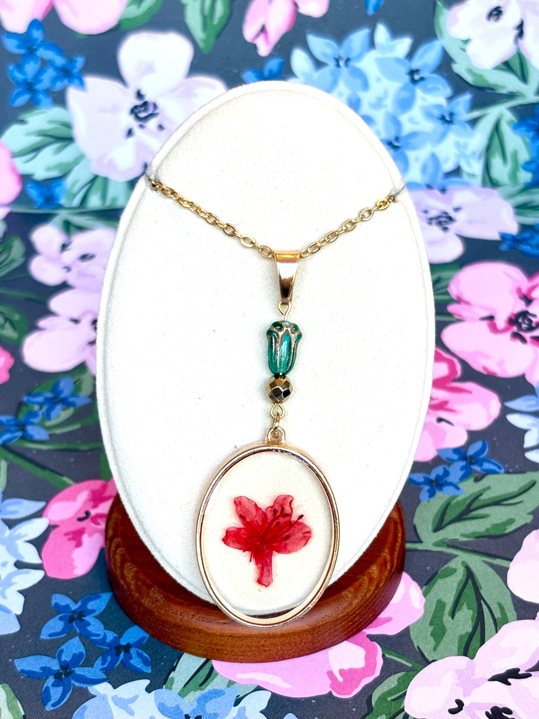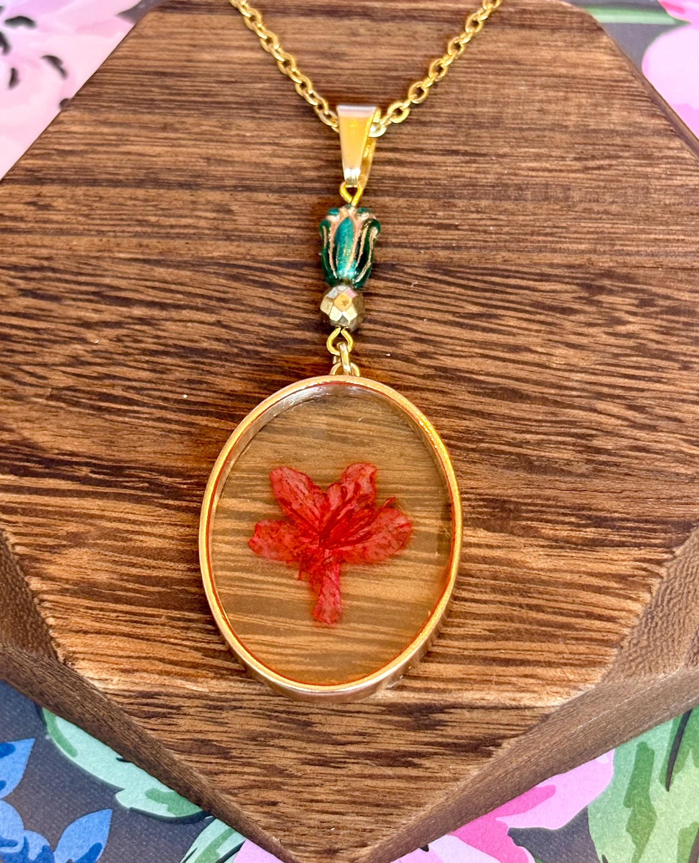 Step into the season of sparkle and serenity with the Holiday Pageant Necklace — a delicate celebration of beauty, balance, and nature’s artistry! This enchanting piece features a real dried pressed red flower preserved in a resin oval pendant framed in gold. Above it, a Czech glass green tulip bead with gold wash and faceted gold hematite gemstone add a radiant touch of holiday elegance.