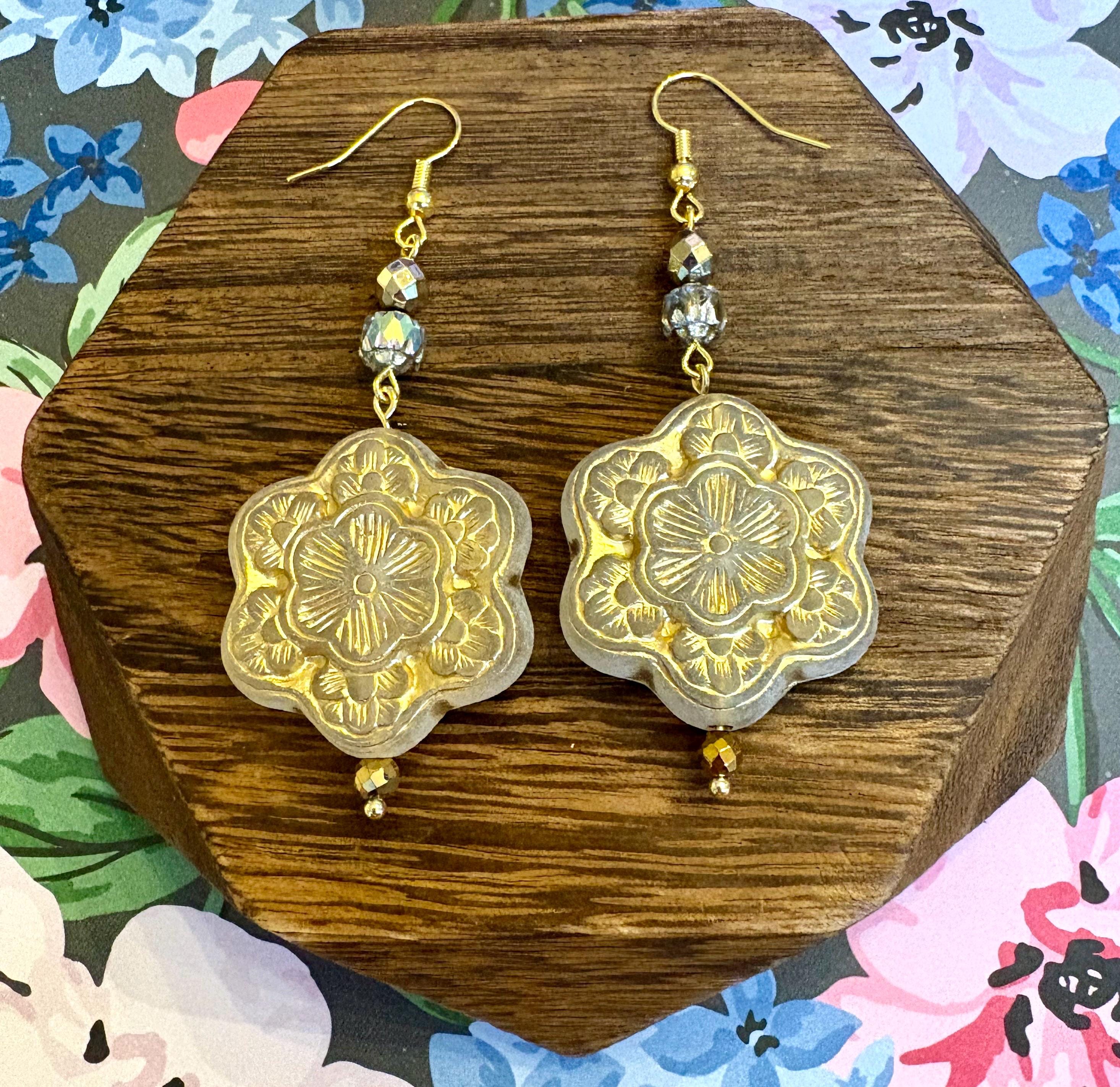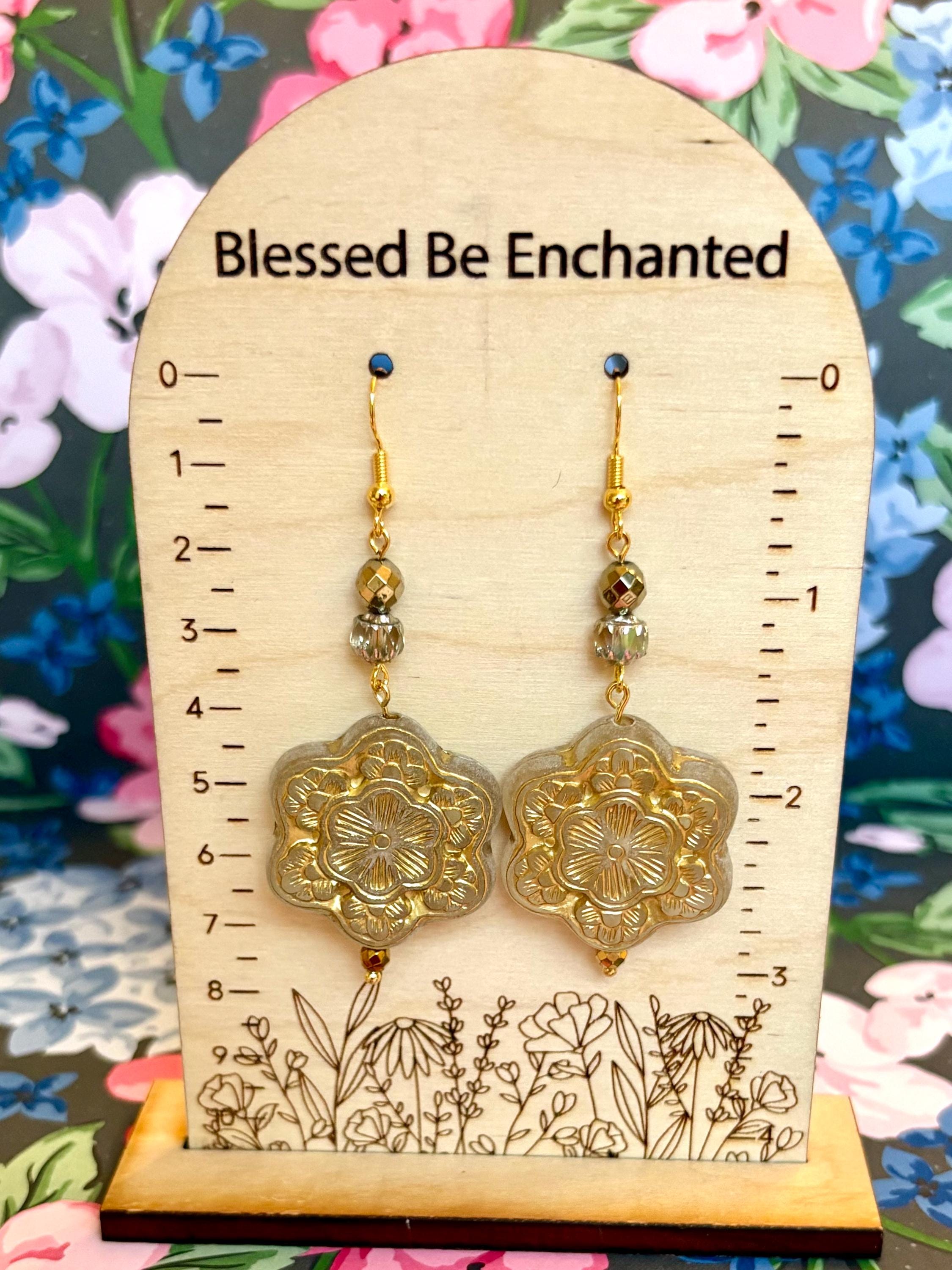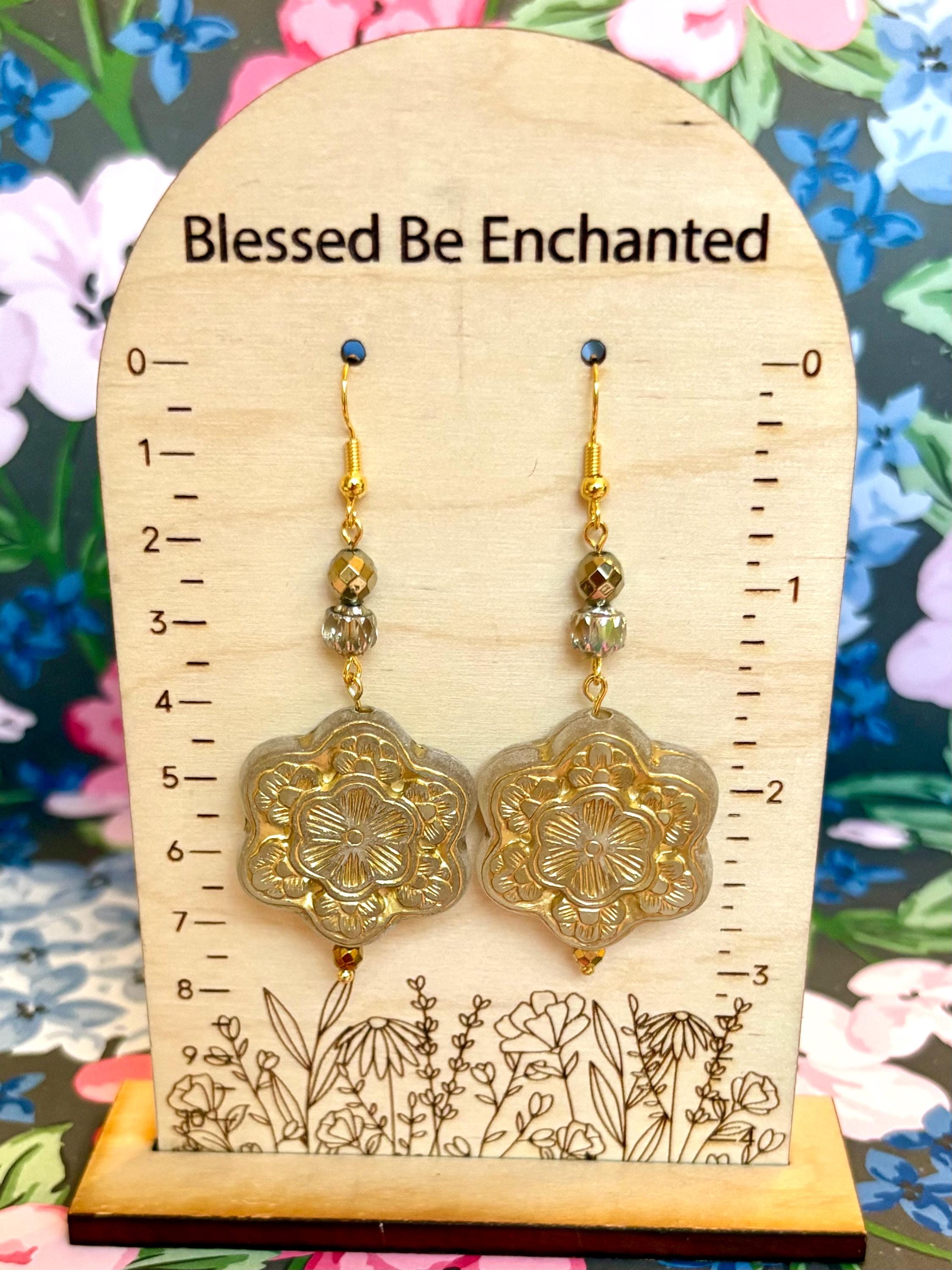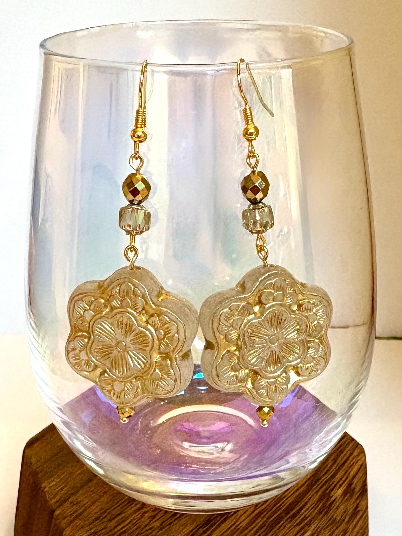 Each pair features gold faceted hematite gemstones, Czech glass cathedral beads, and intricately carved acrylic floral pendants that capture the warmth of sunlight and the richness of abundance!