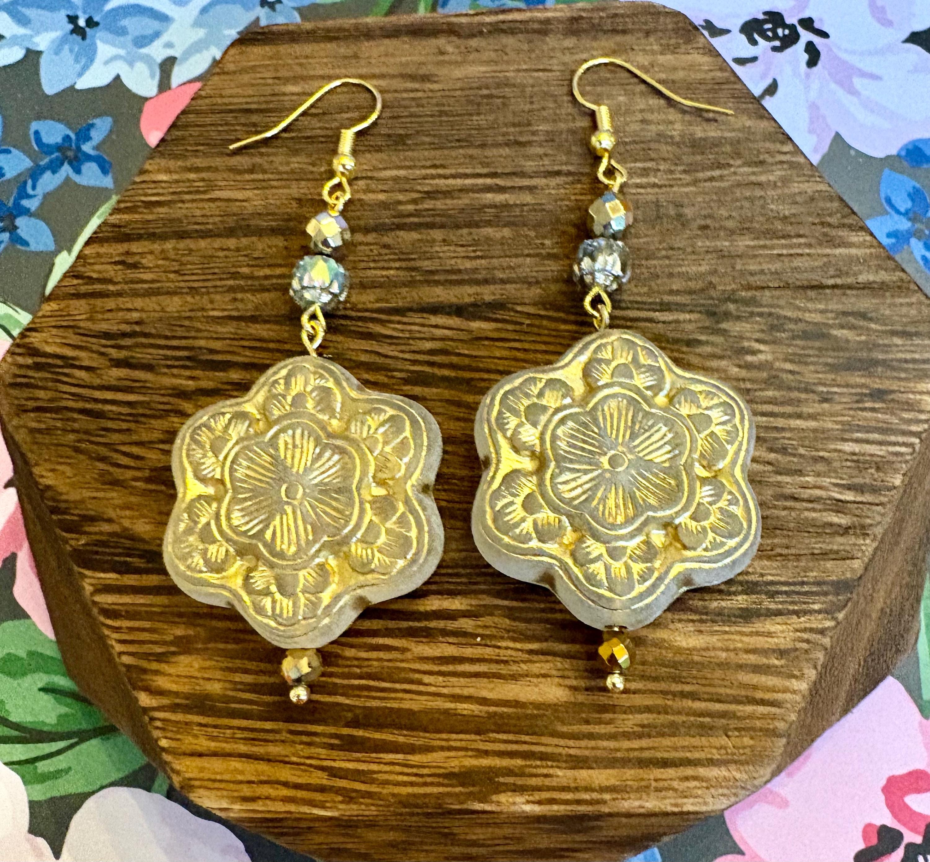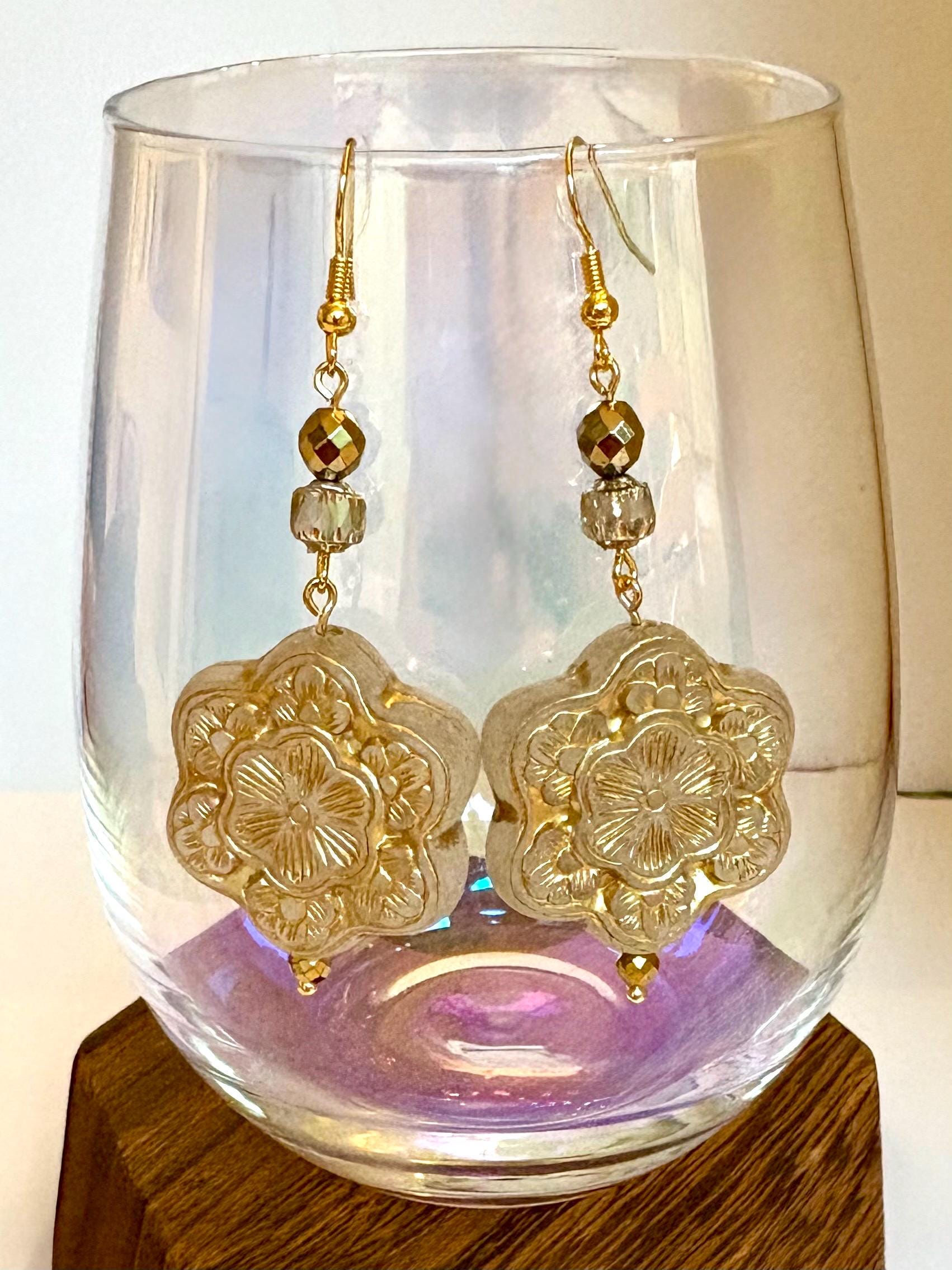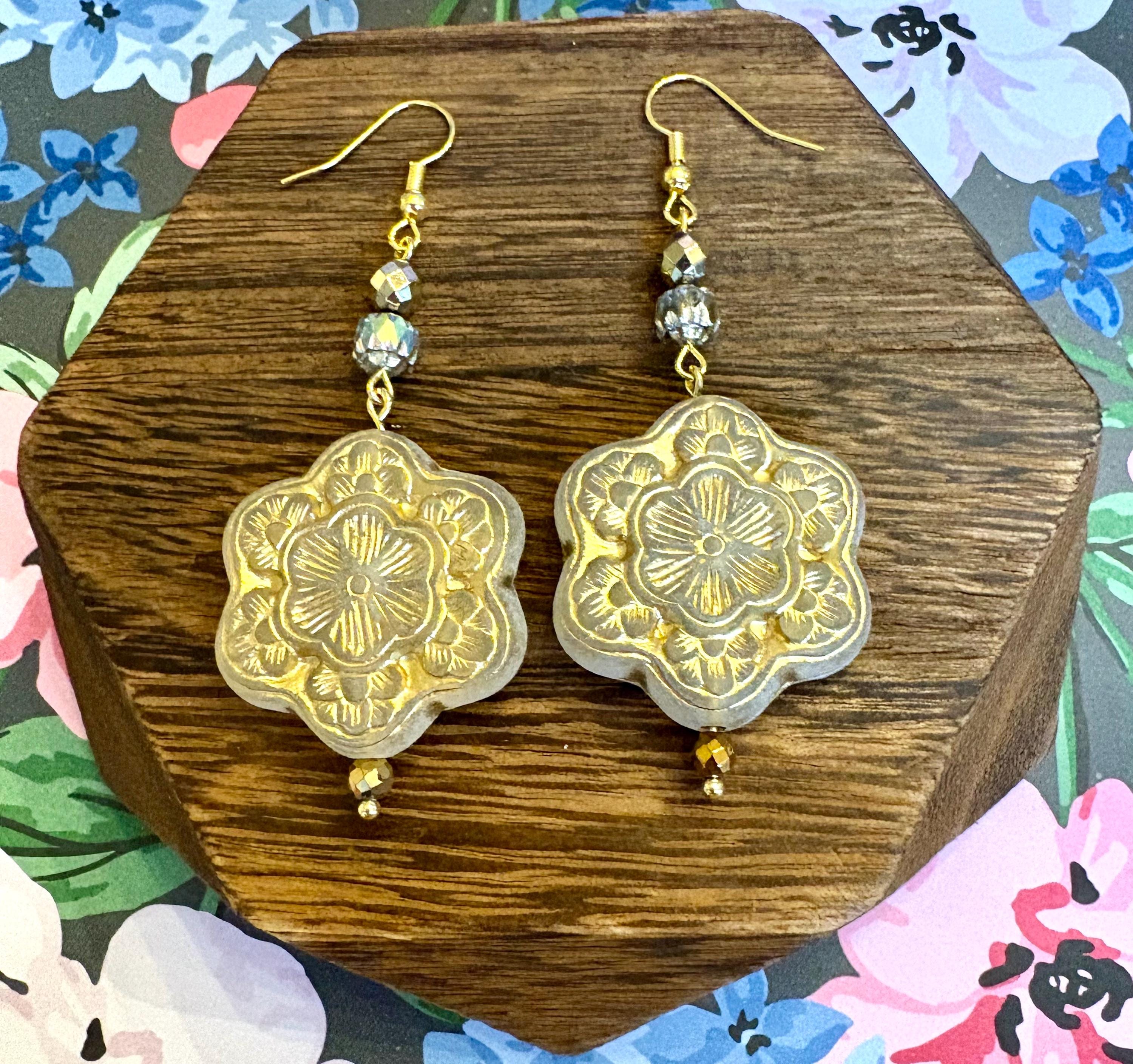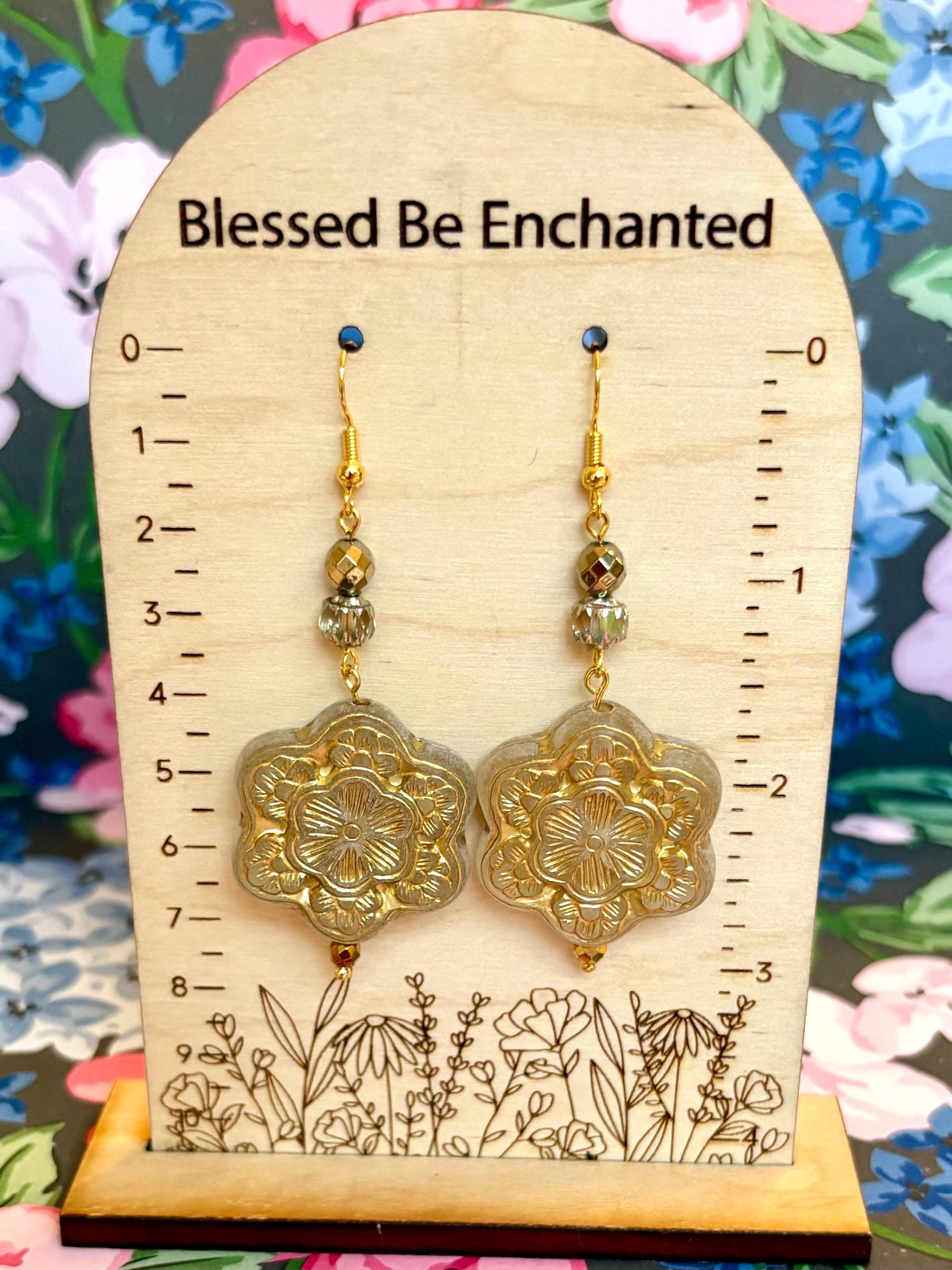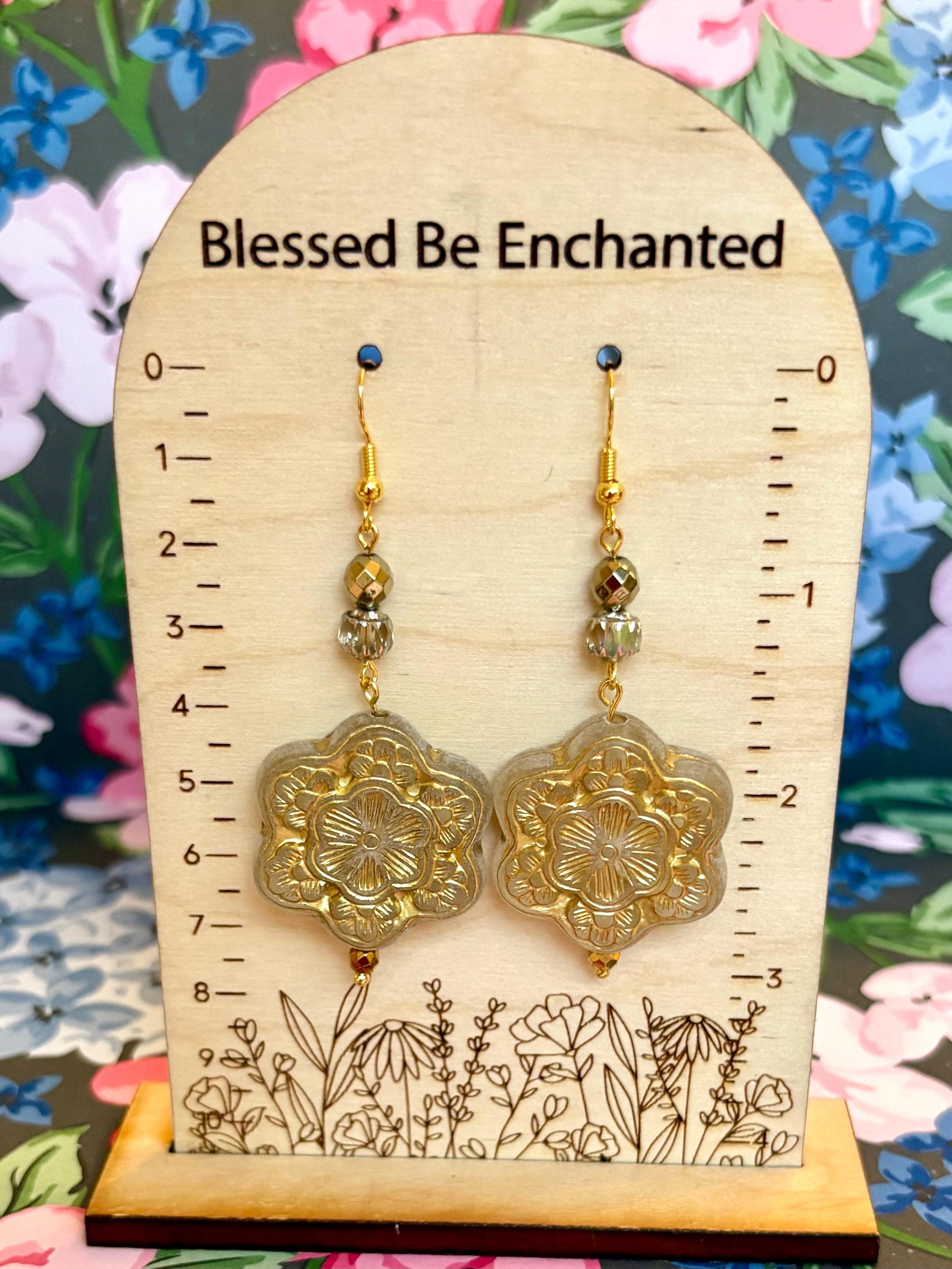 Each pair features gold faceted hematite gemstones, Czech glass cathedral beads, and intricately carved acrylic floral pendants that capture the warmth of sunlight and the richness of abundance!