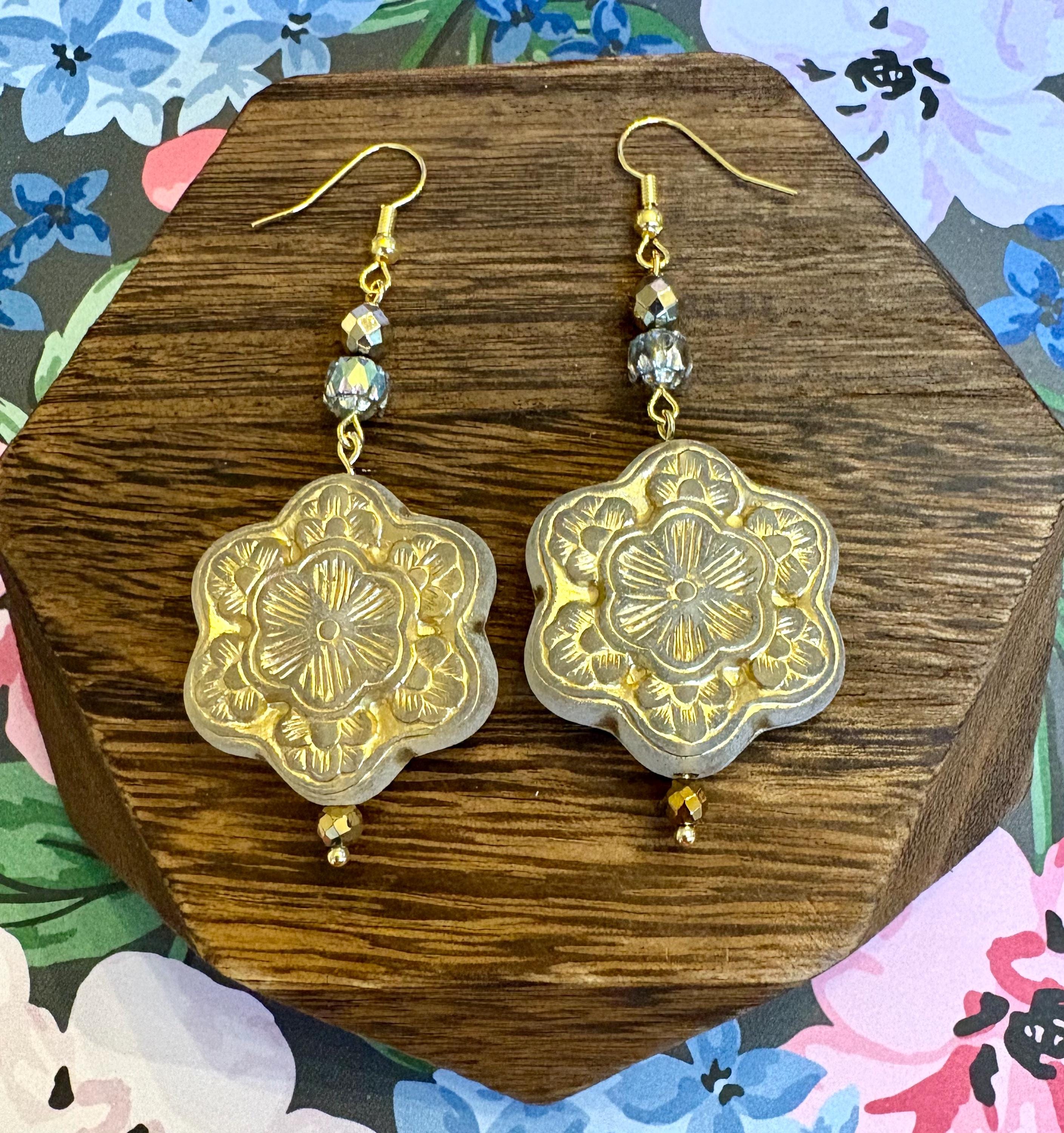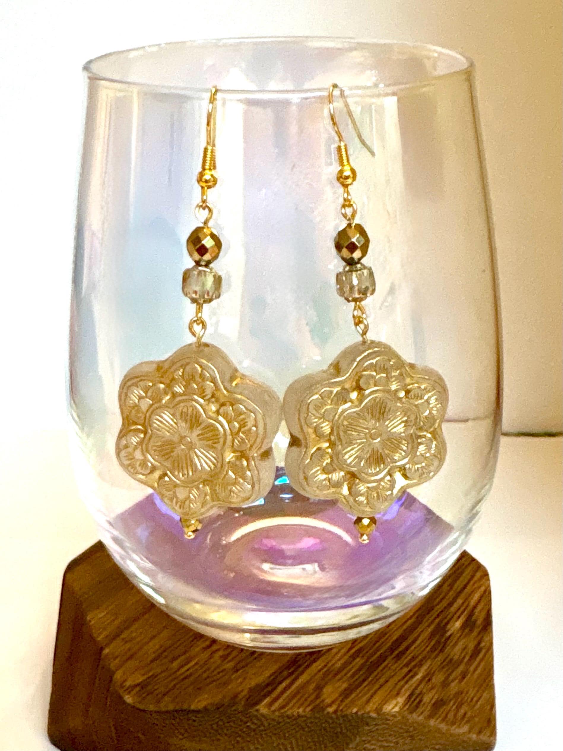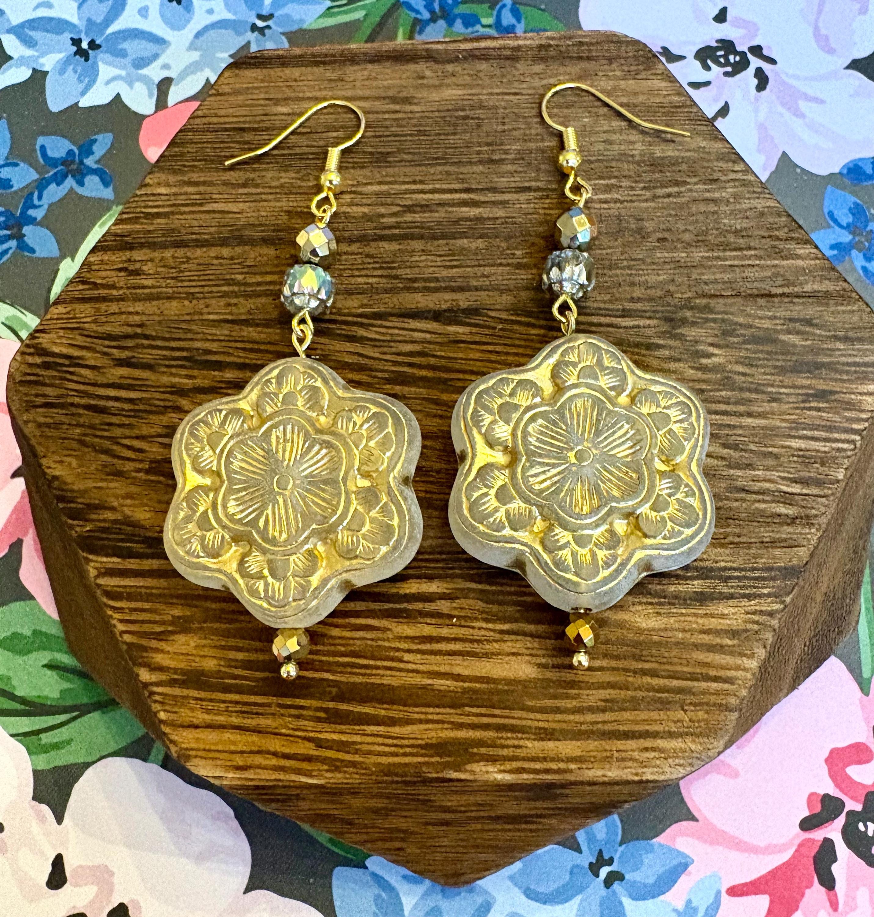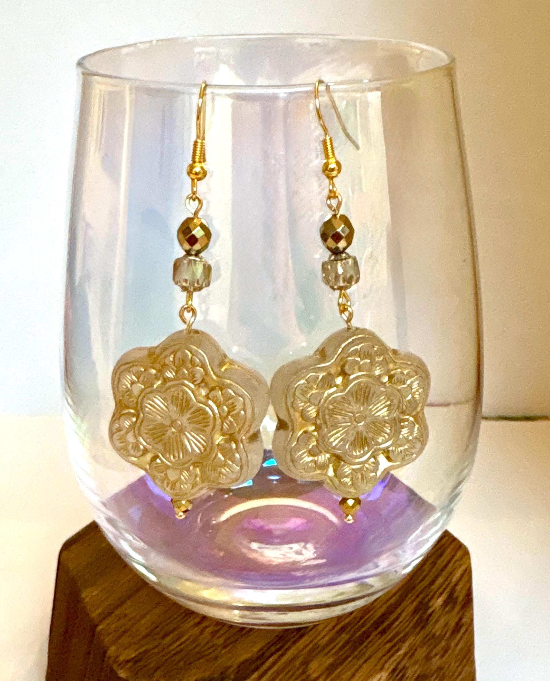 Each pair features gold faceted hematite gemstones, Czech glass cathedral beads, and intricately carved acrylic floral pendants that capture the warmth of sunlight and the richness of abundance!