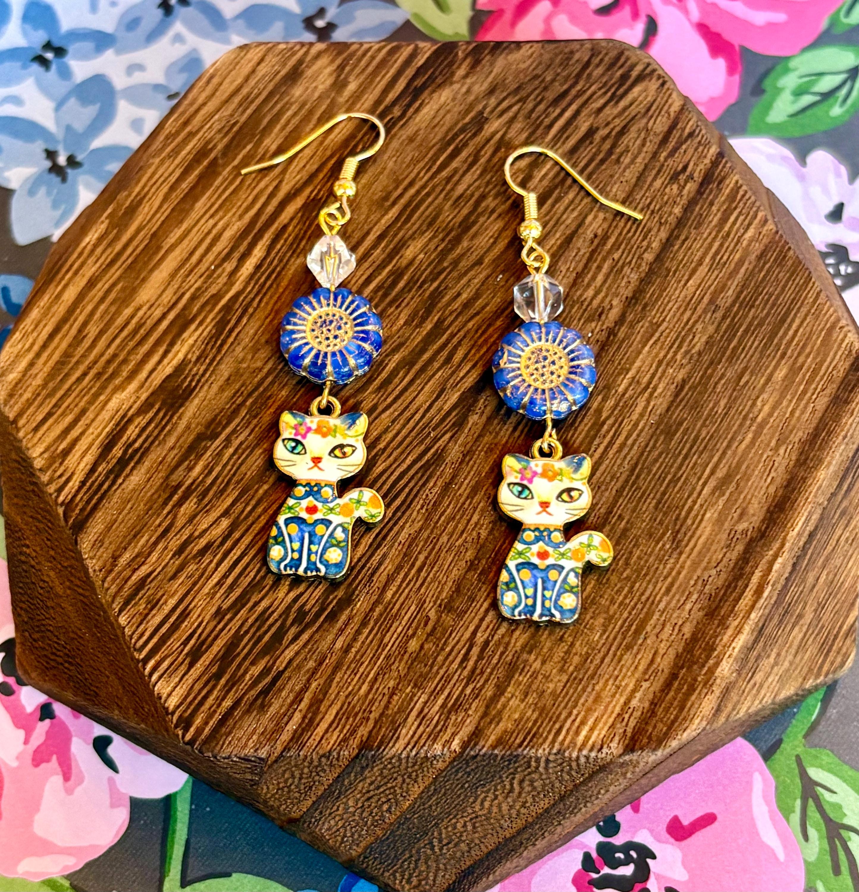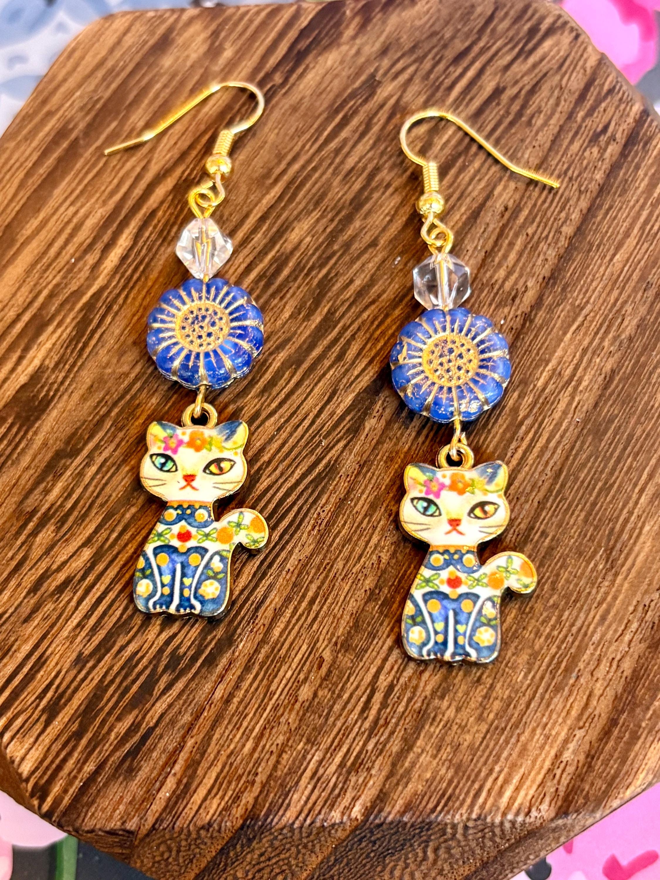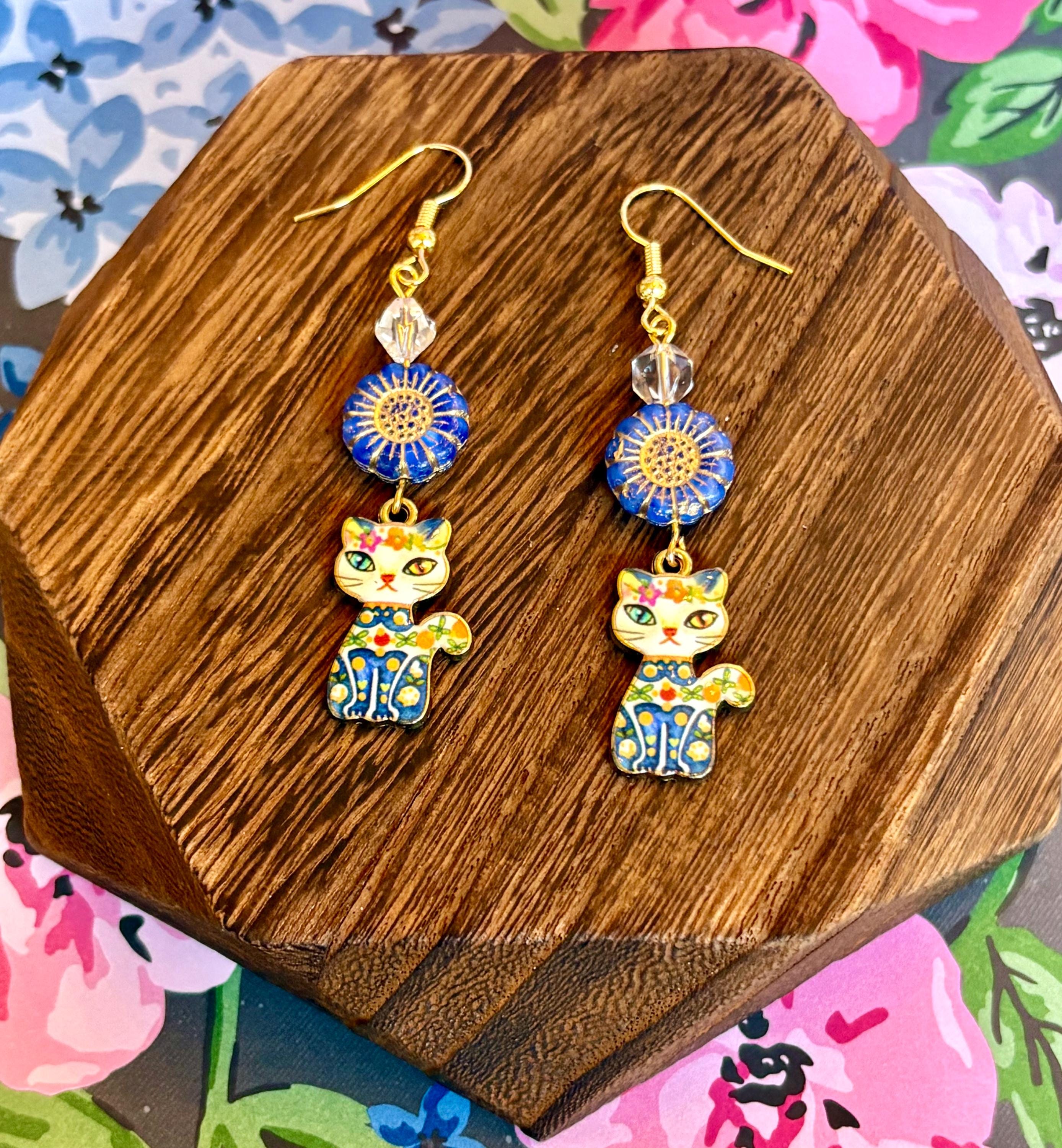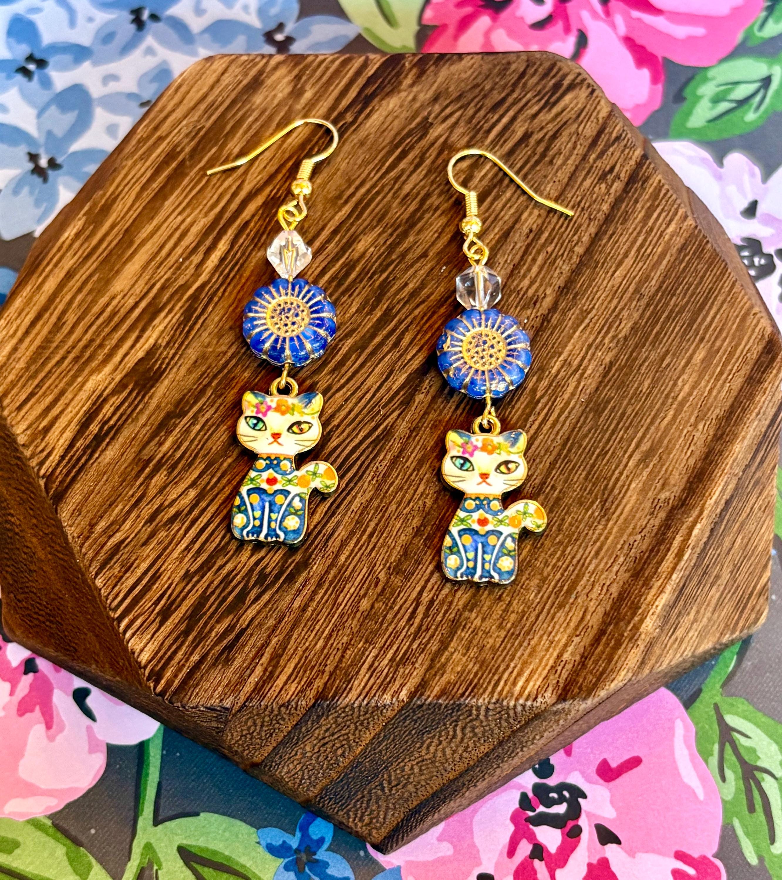 Blossom & Purr Earrings – Whimsical Enamel Cat Charm Earrings with Clear Quartz, Blue Sunflower Beads | Joyful Energy, Reiki-Infused Gift for Cat Lovers