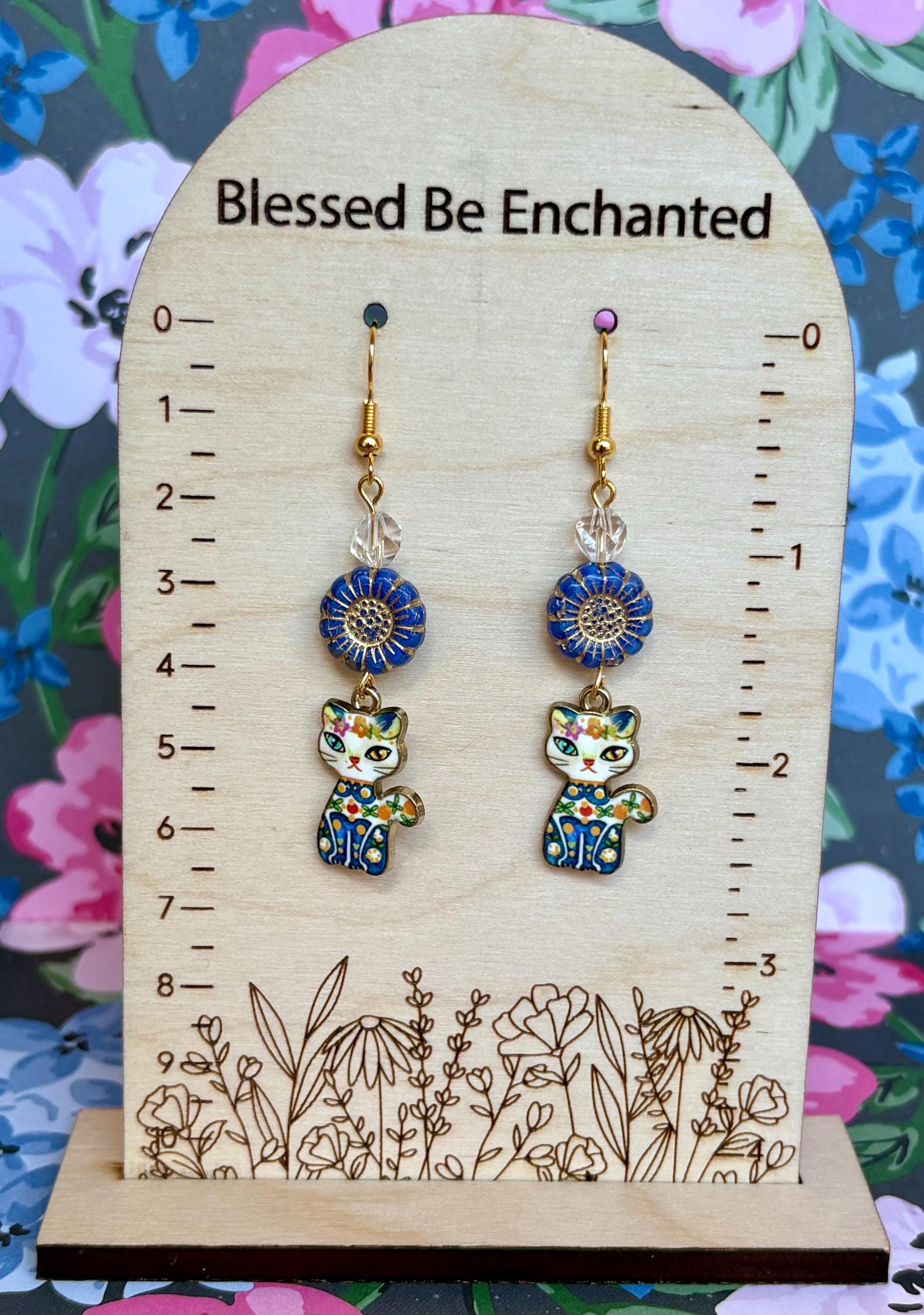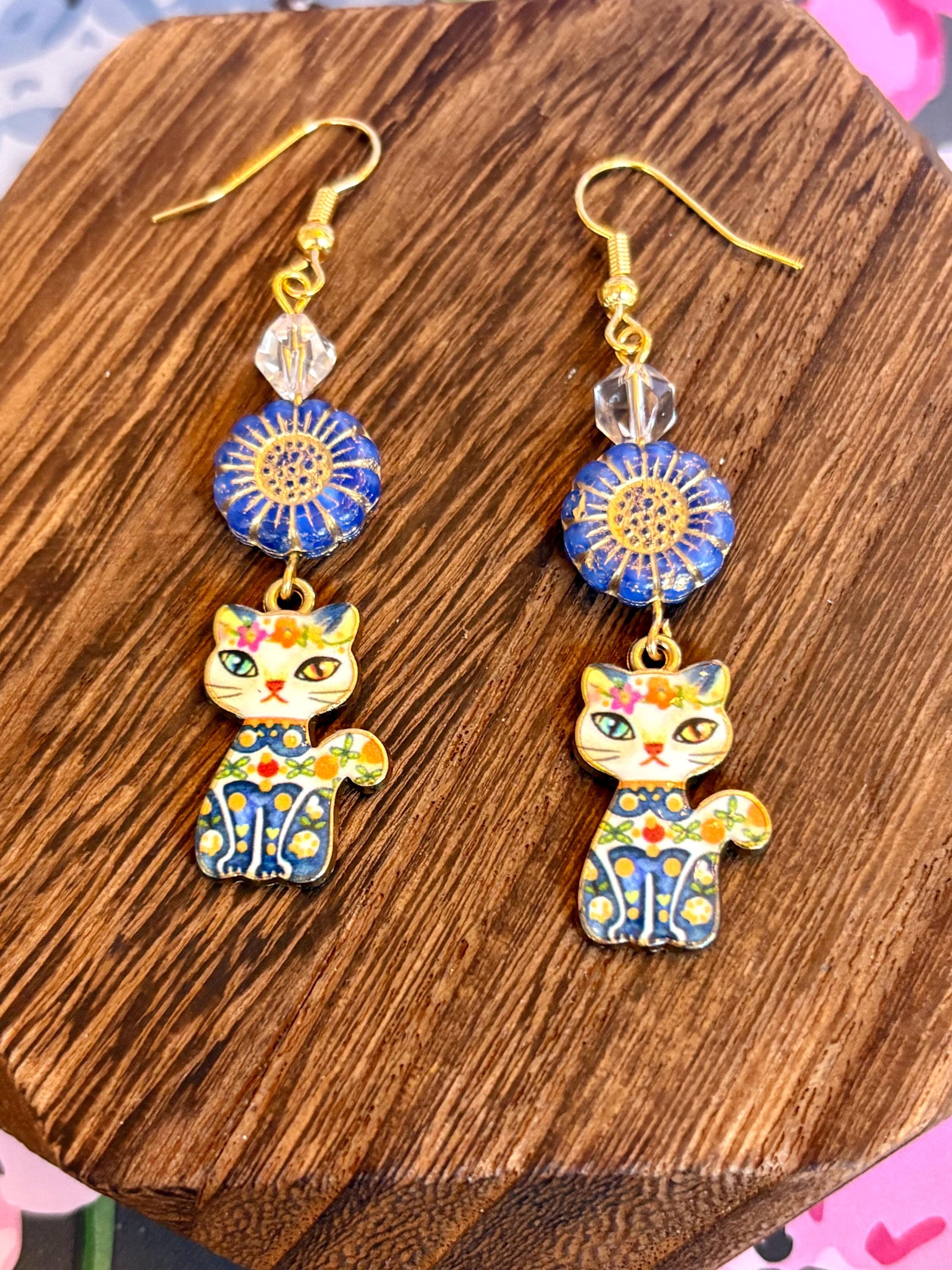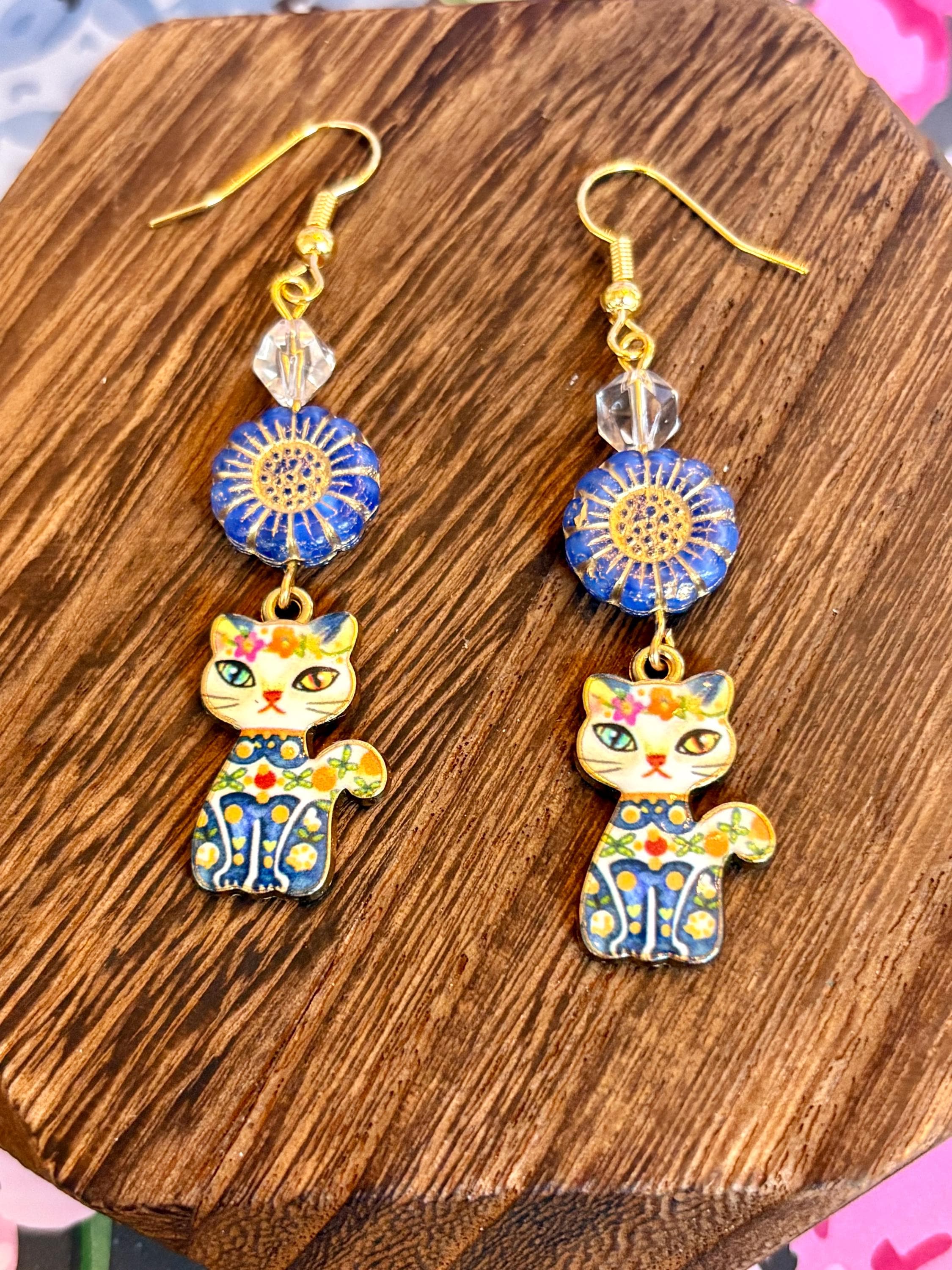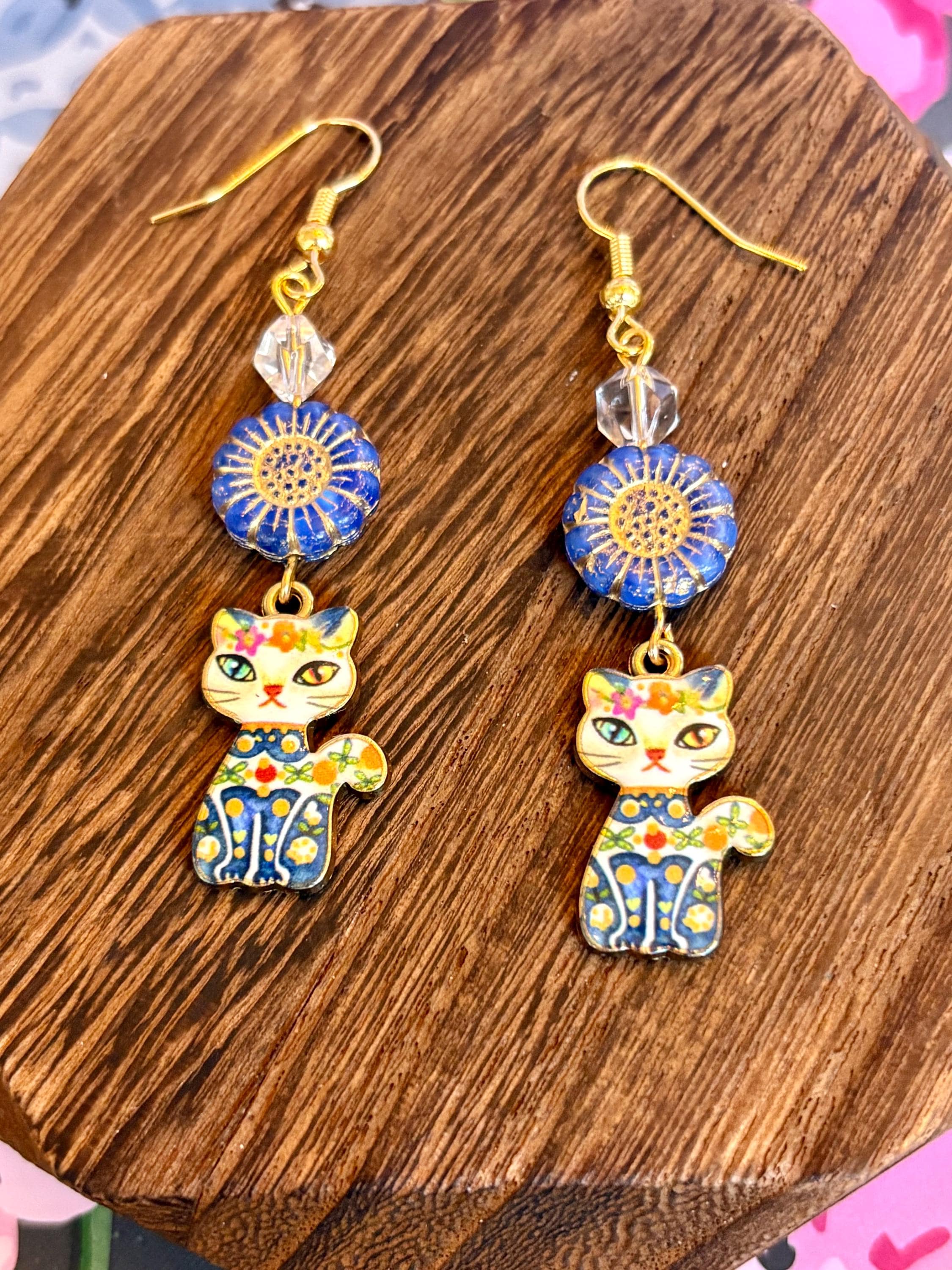 Blossom & Purr Earrings – Whimsical Enamel Cat Charm Earrings with Clear Quartz, Blue Sunflower Beads | Joyful Energy, Reiki-Infused Gift for Cat Lovers