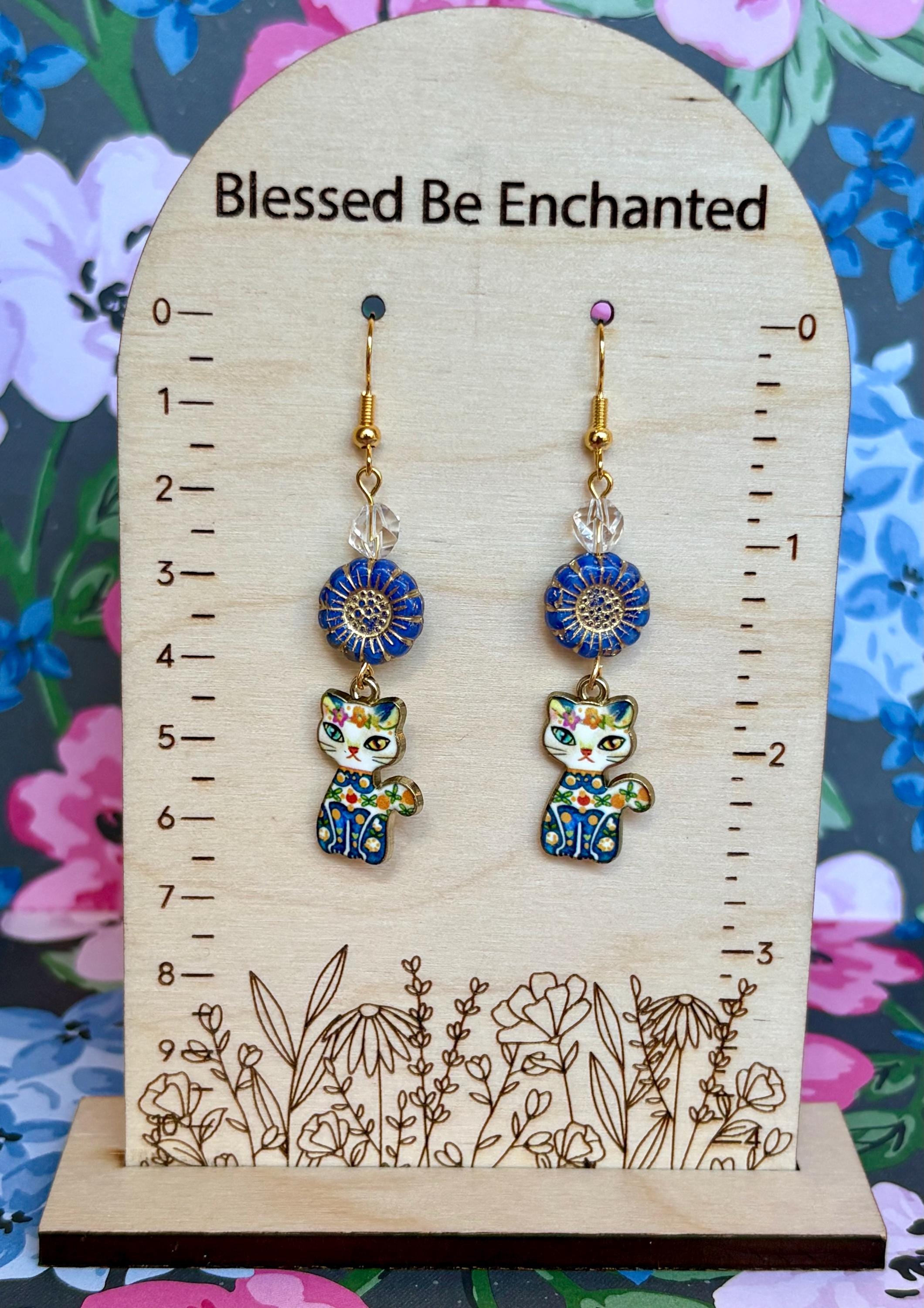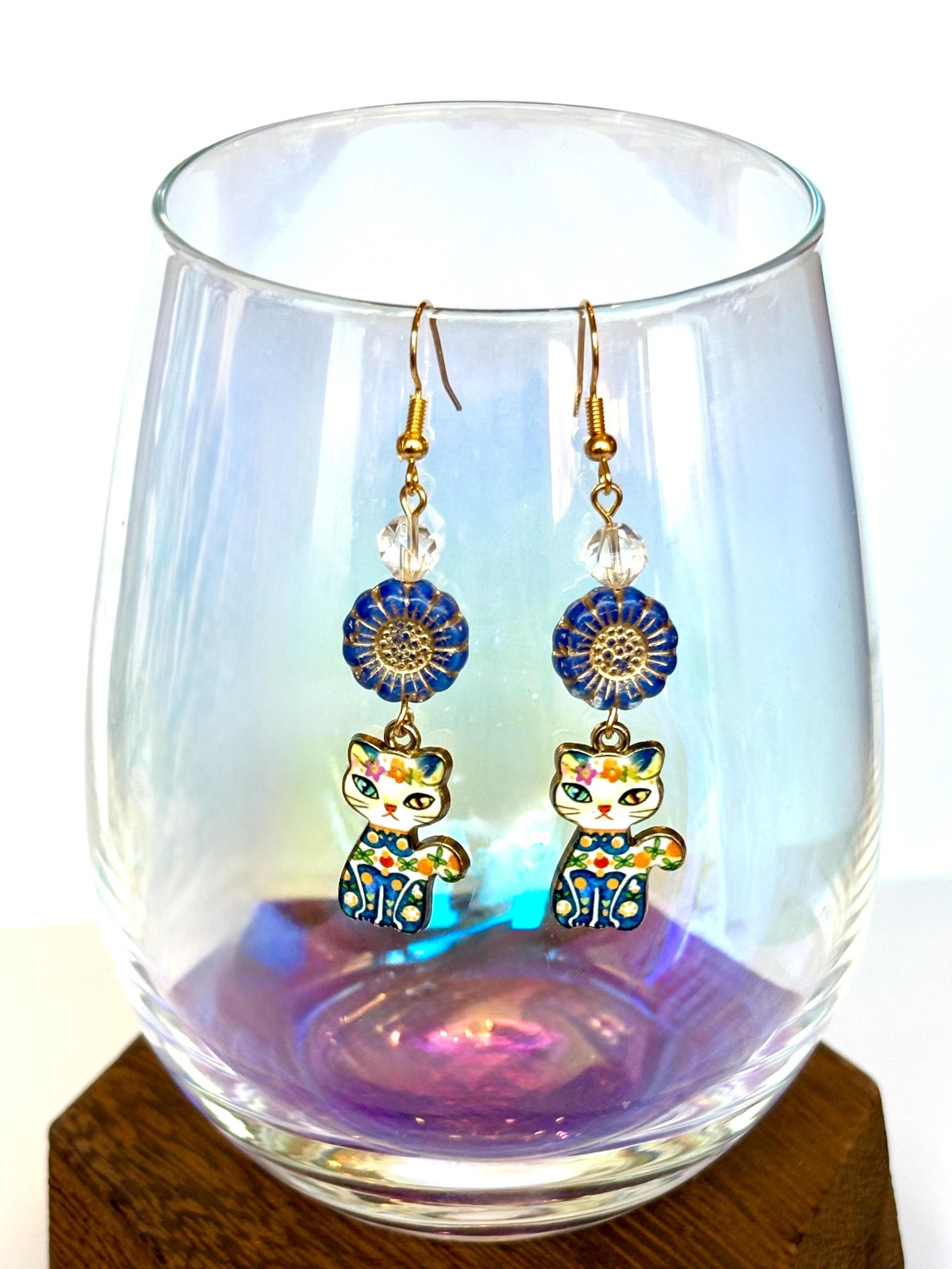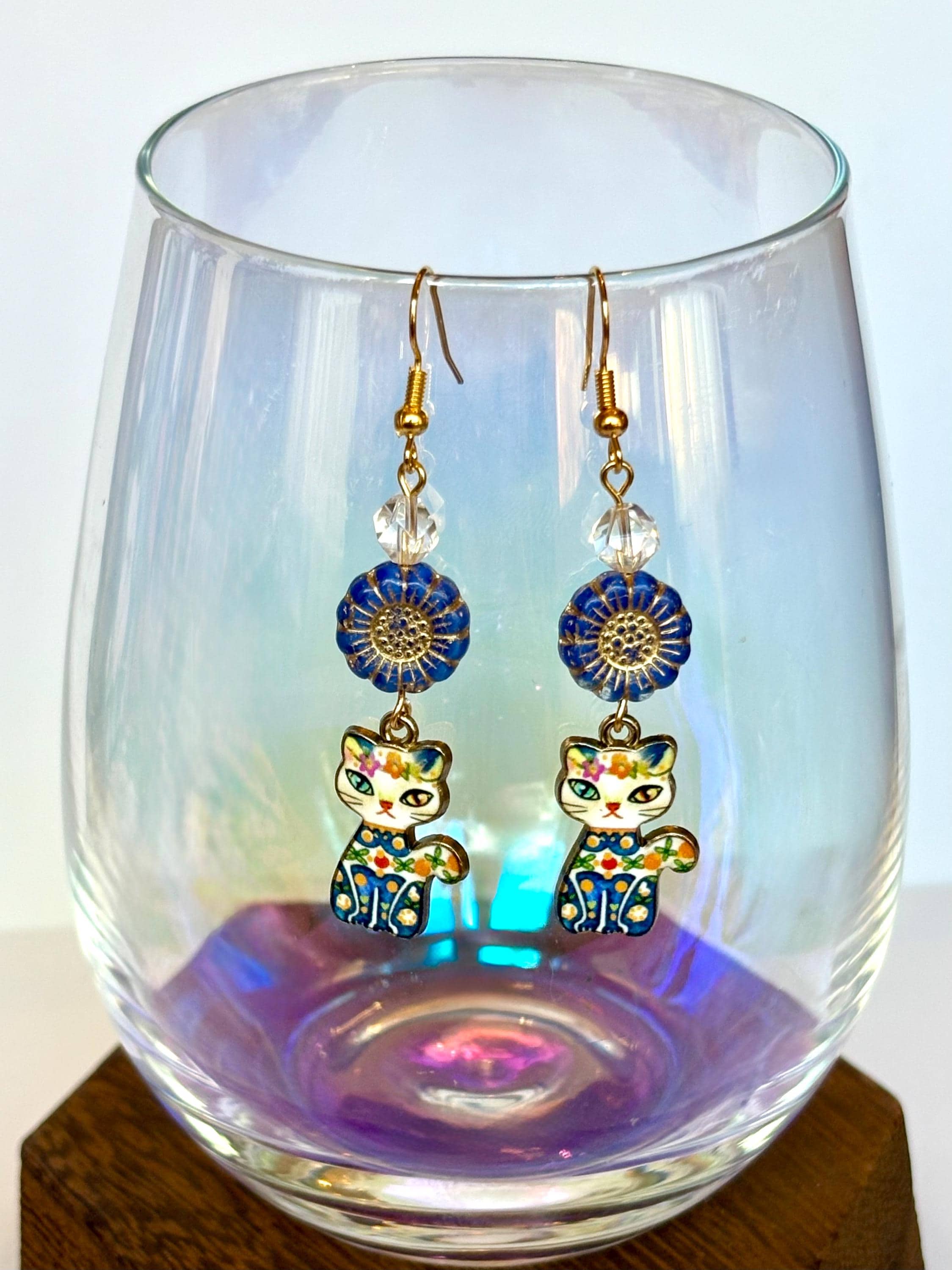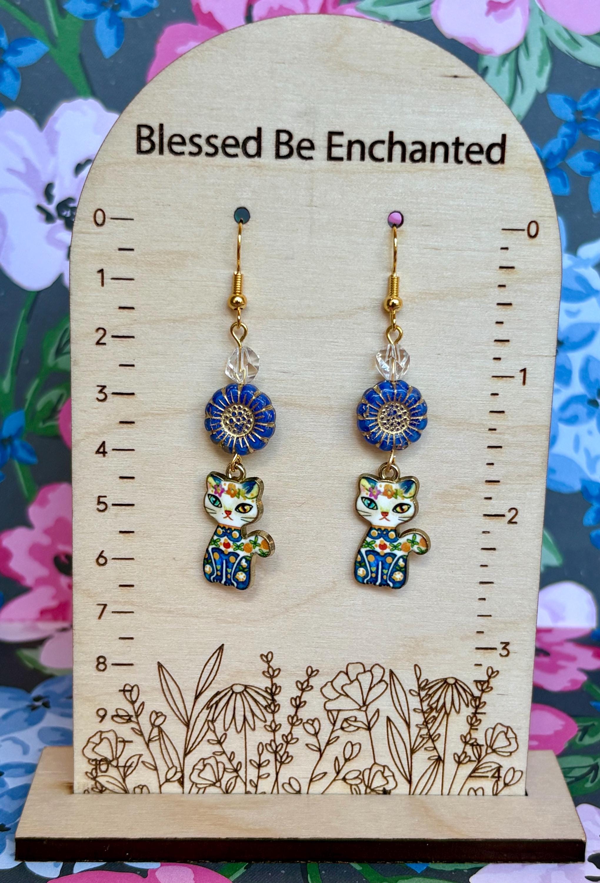 Blossom & Purr Earrings – Whimsical Enamel Cat Charm Earrings with Clear Quartz, Blue Sunflower Beads | Joyful Energy, Reiki-Infused Gift for Cat Lovers