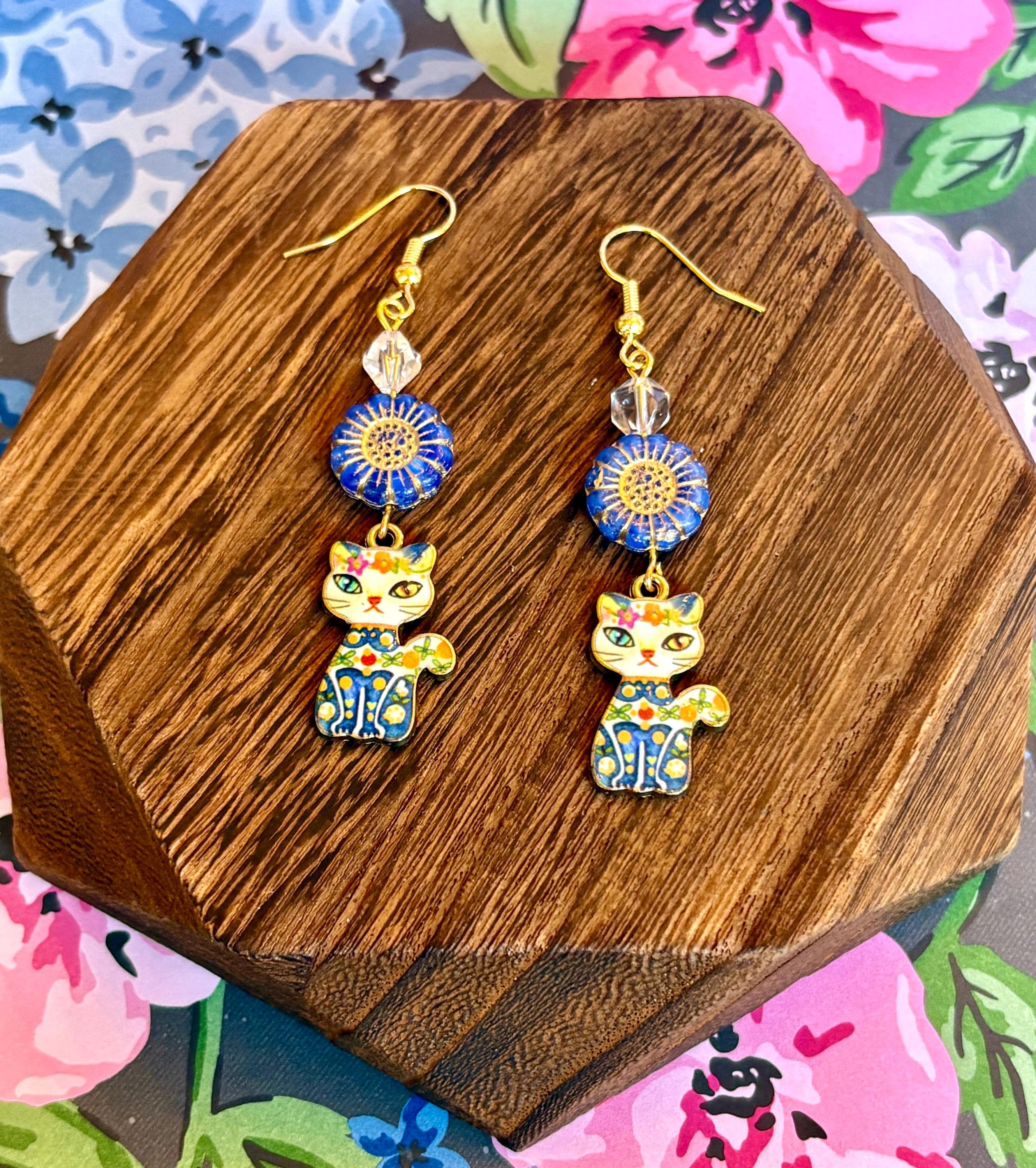 These Blossom & Purr Earrings are a joyful dance of color and light — perfect for the cat lover with a whimsical spirit! Featuring enamel cat charms adorned with cheerful floral details, paired with a royal blue Czech glass sunflower bead kissed with gold, and topped with a faceted clear quartz star-cut gemstone.