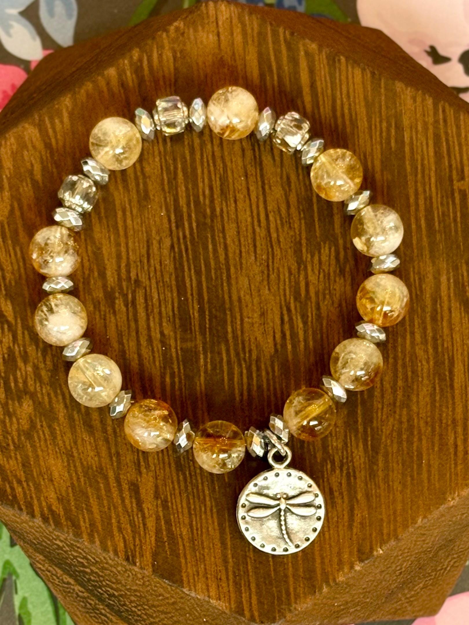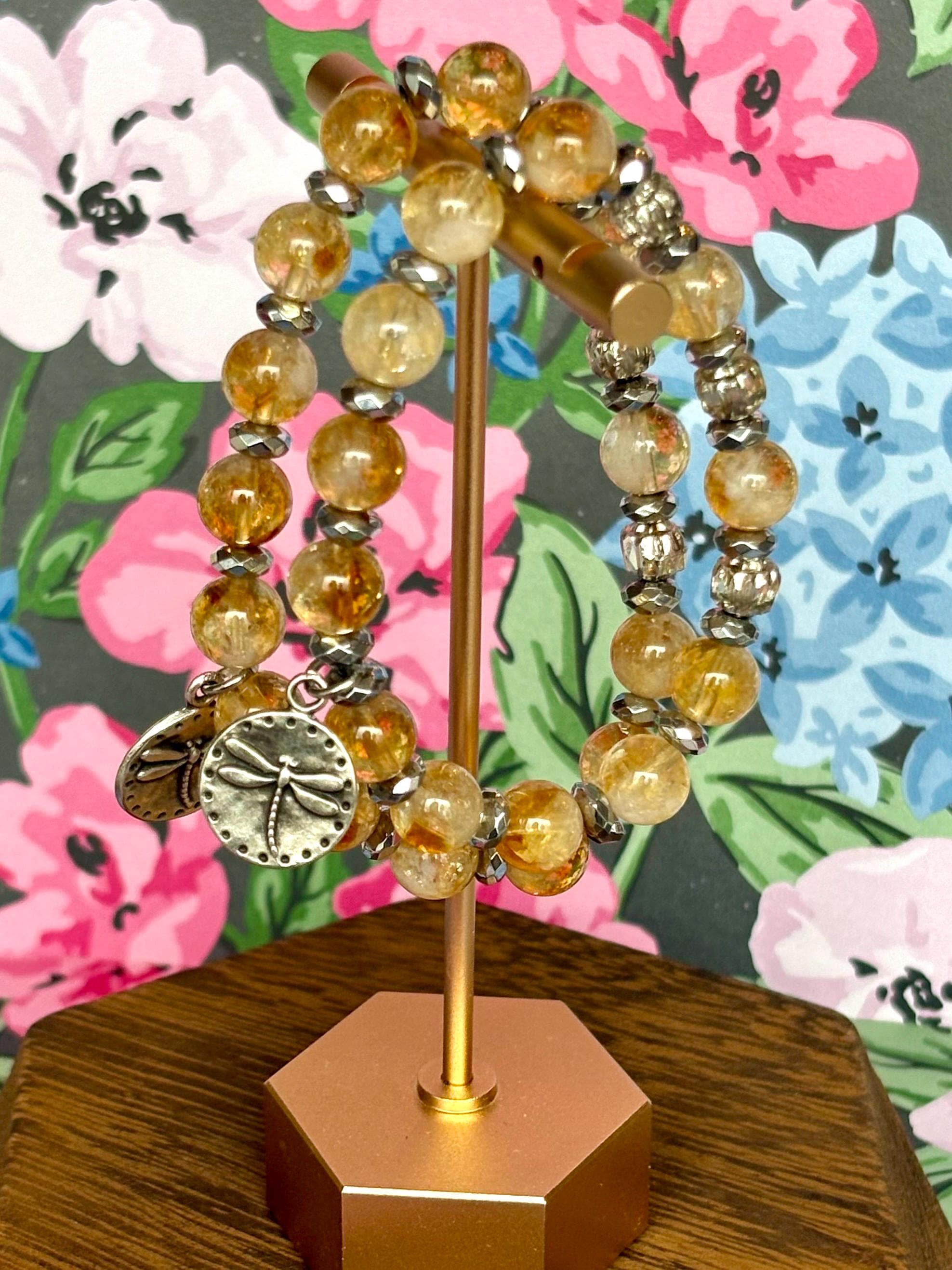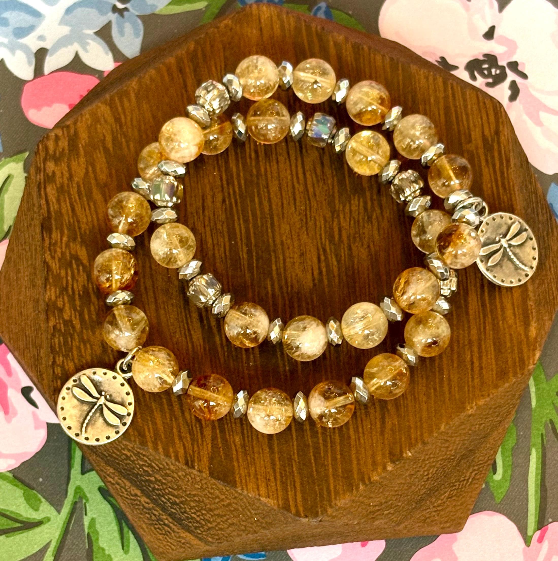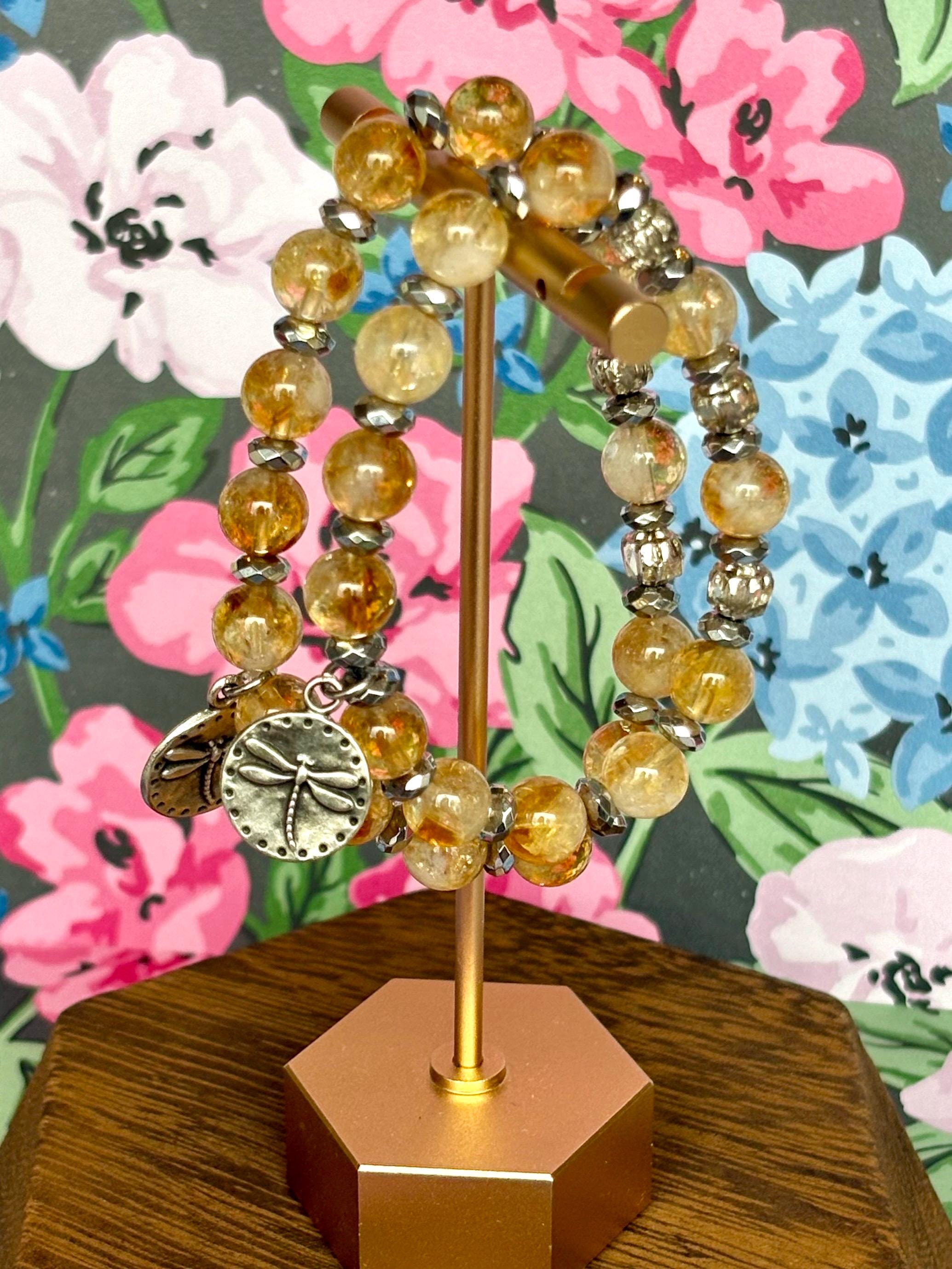 Meredith’s Dragonfly is a radiant gemstone bracelet designed to uplift the spirit with warmth, abundance, and transformation! Each piece is lovingly handcrafted with shimmering Citrine gemstones, reflective silver faceted Hematite, and elegant Czech glass cathedral beads that add just the right touch of sparkle and vintage charm.