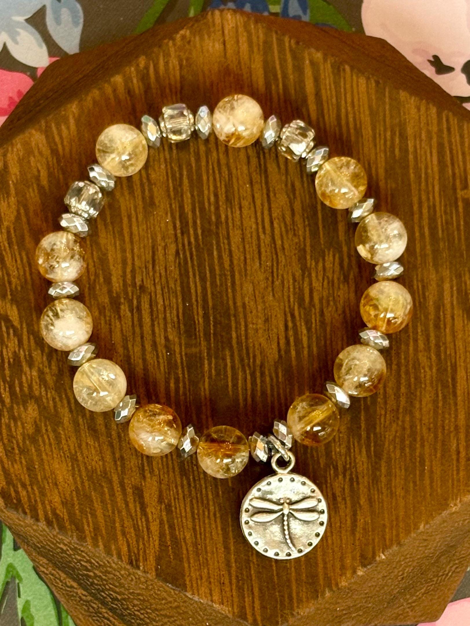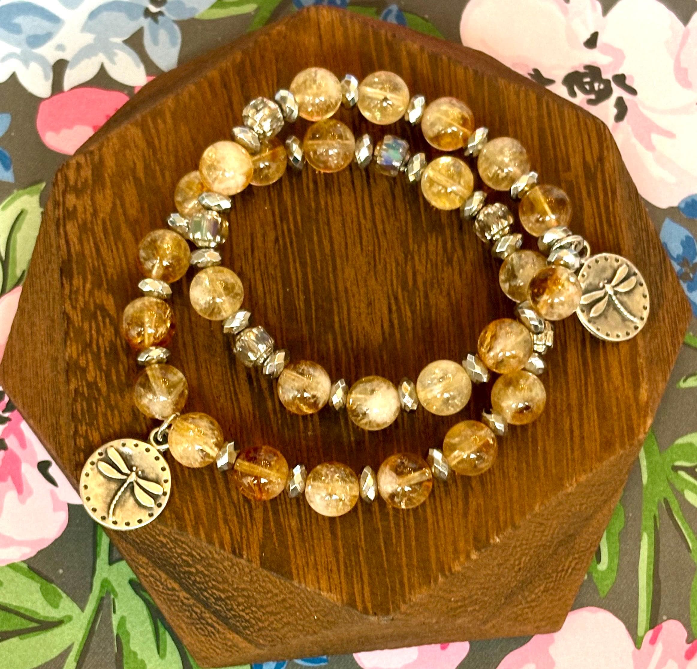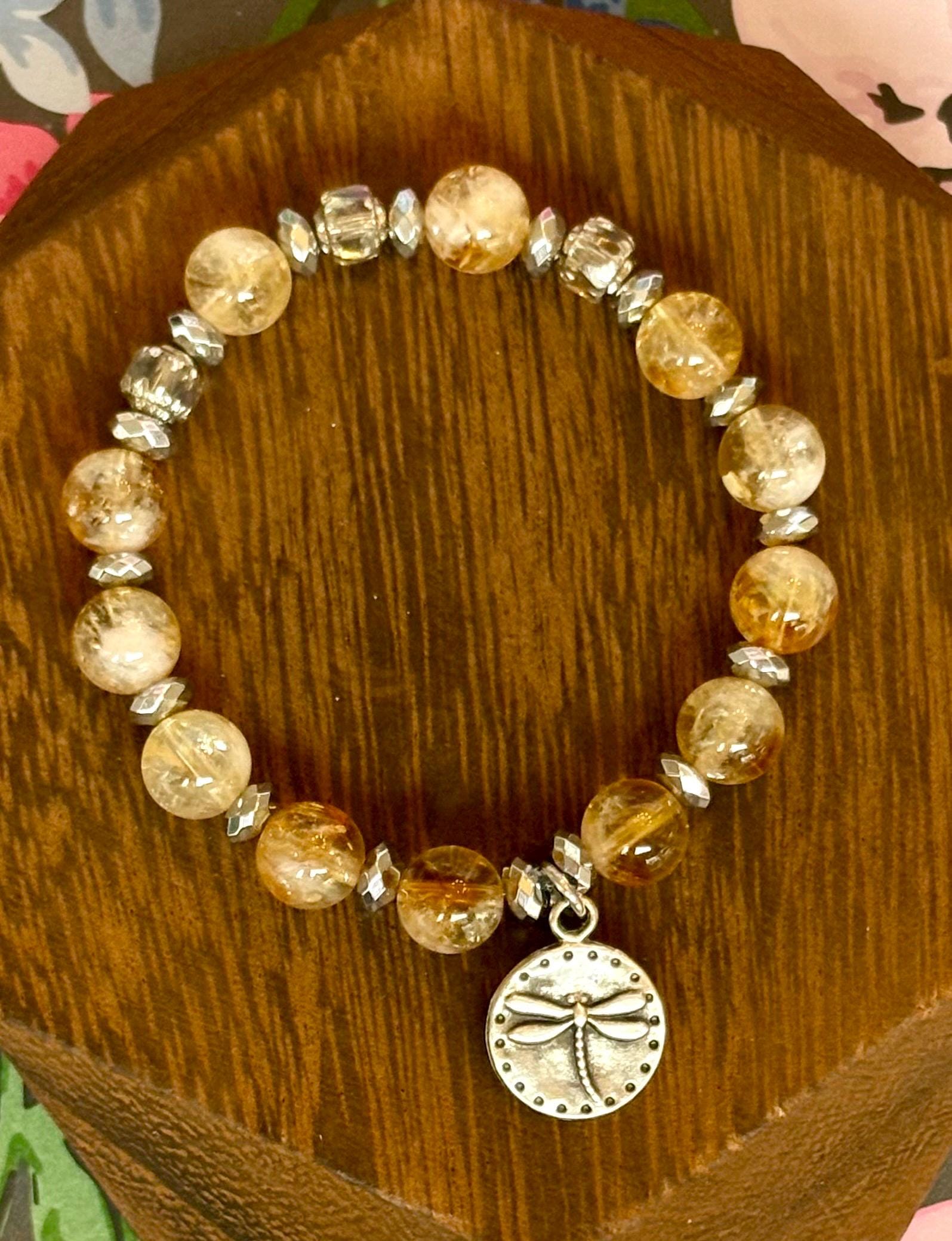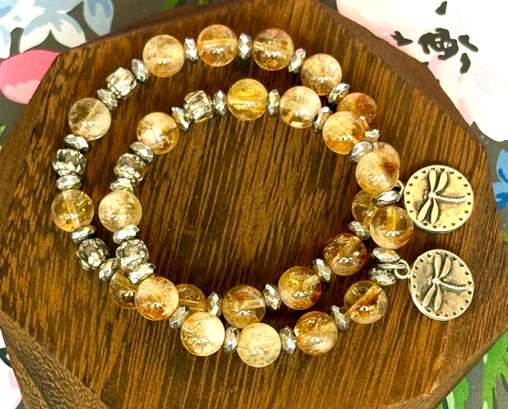 Meredith’s Dragonfly is a radiant gemstone bracelet designed to uplift the spirit with warmth, abundance, and transformation! Each piece is lovingly handcrafted with shimmering Citrine gemstones, reflective silver faceted Hematite, and elegant Czech glass cathedral beads that add just the right touch of sparkle and vintage charm.