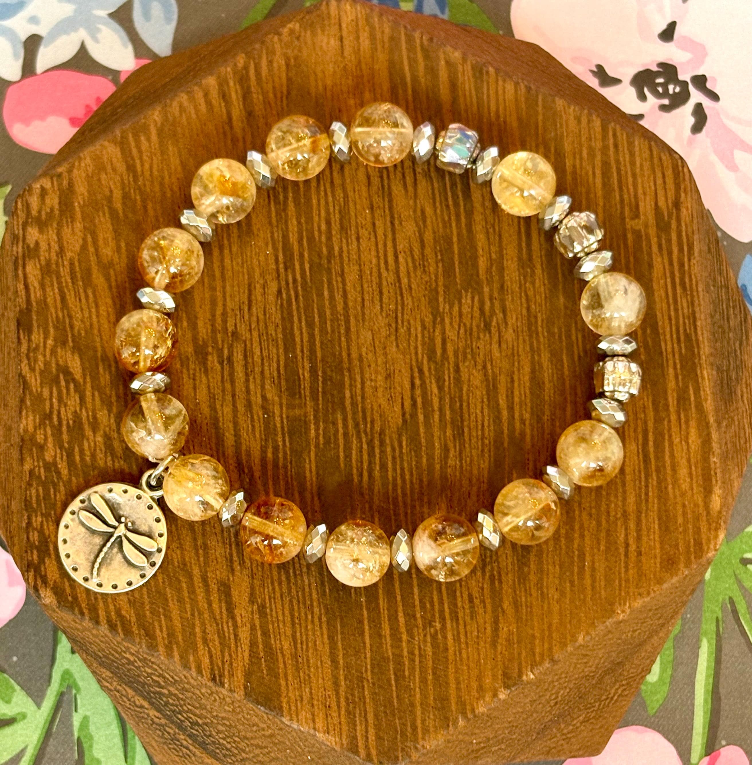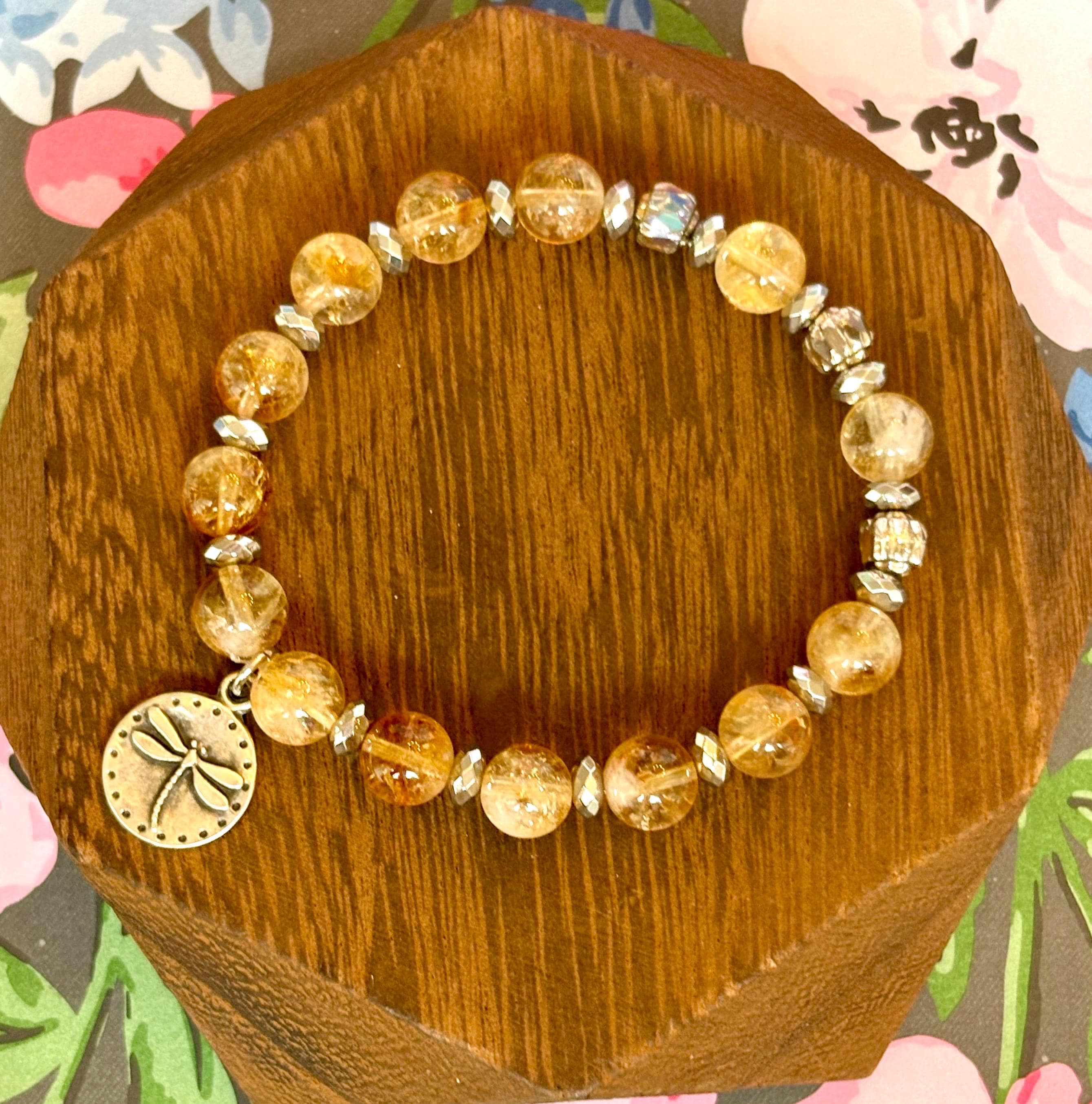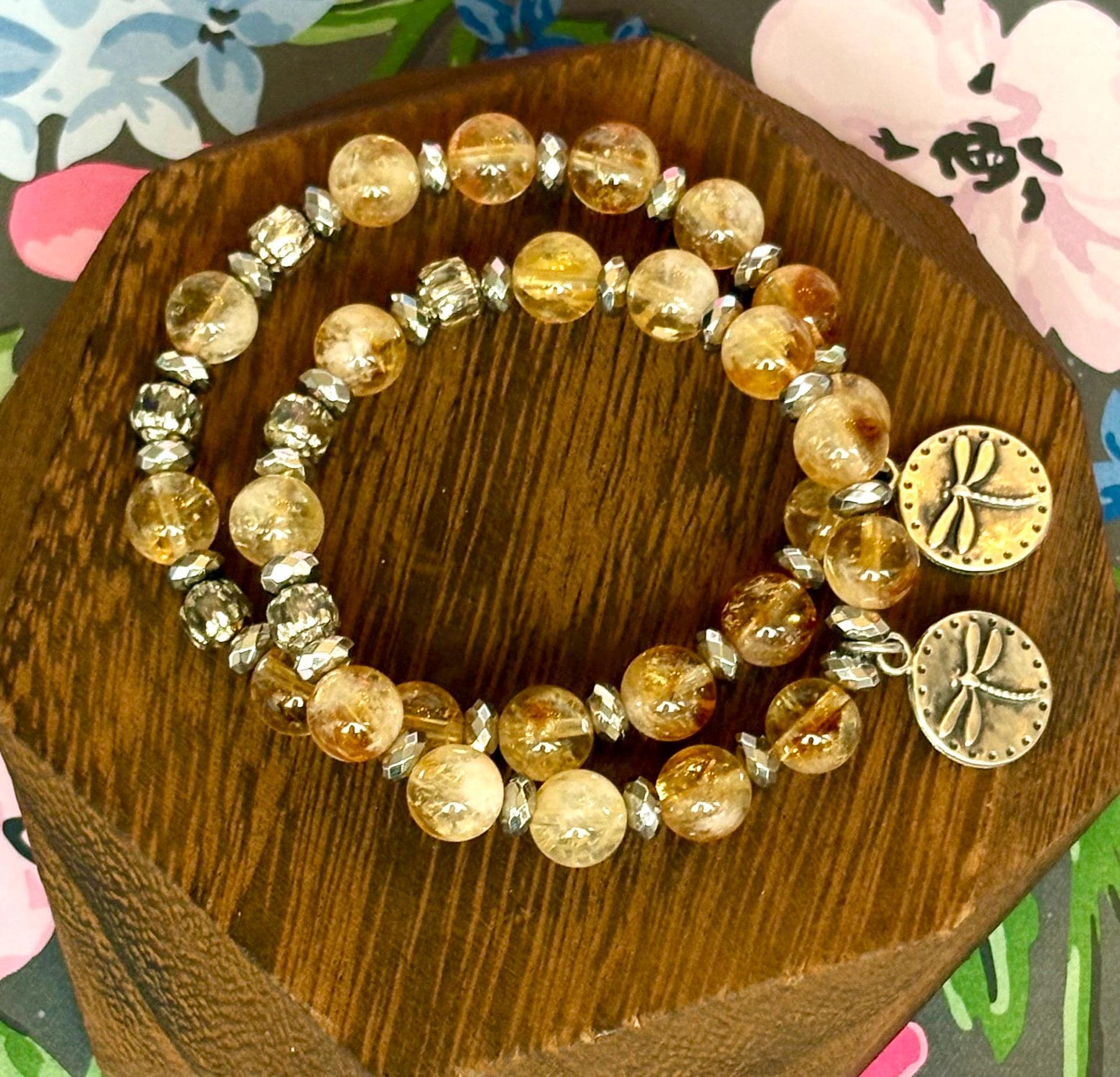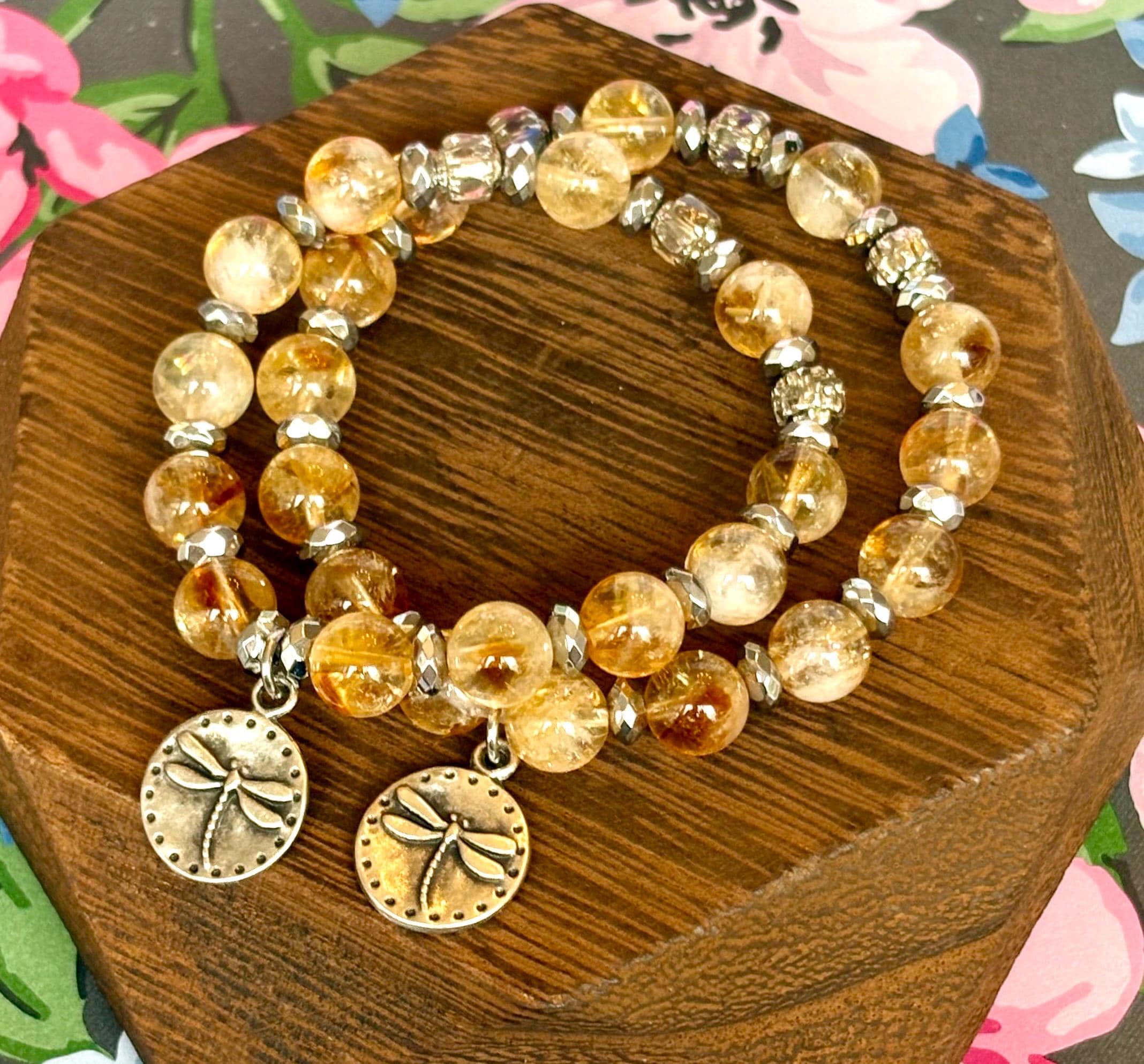 Meredith’s Dragonfly is a radiant gemstone bracelet designed to uplift the spirit with warmth, abundance, and transformation! Each piece is lovingly handcrafted with shimmering Citrine gemstones, reflective silver faceted Hematite, and elegant Czech glass cathedral beads that add just the right touch of sparkle and vintage charm.