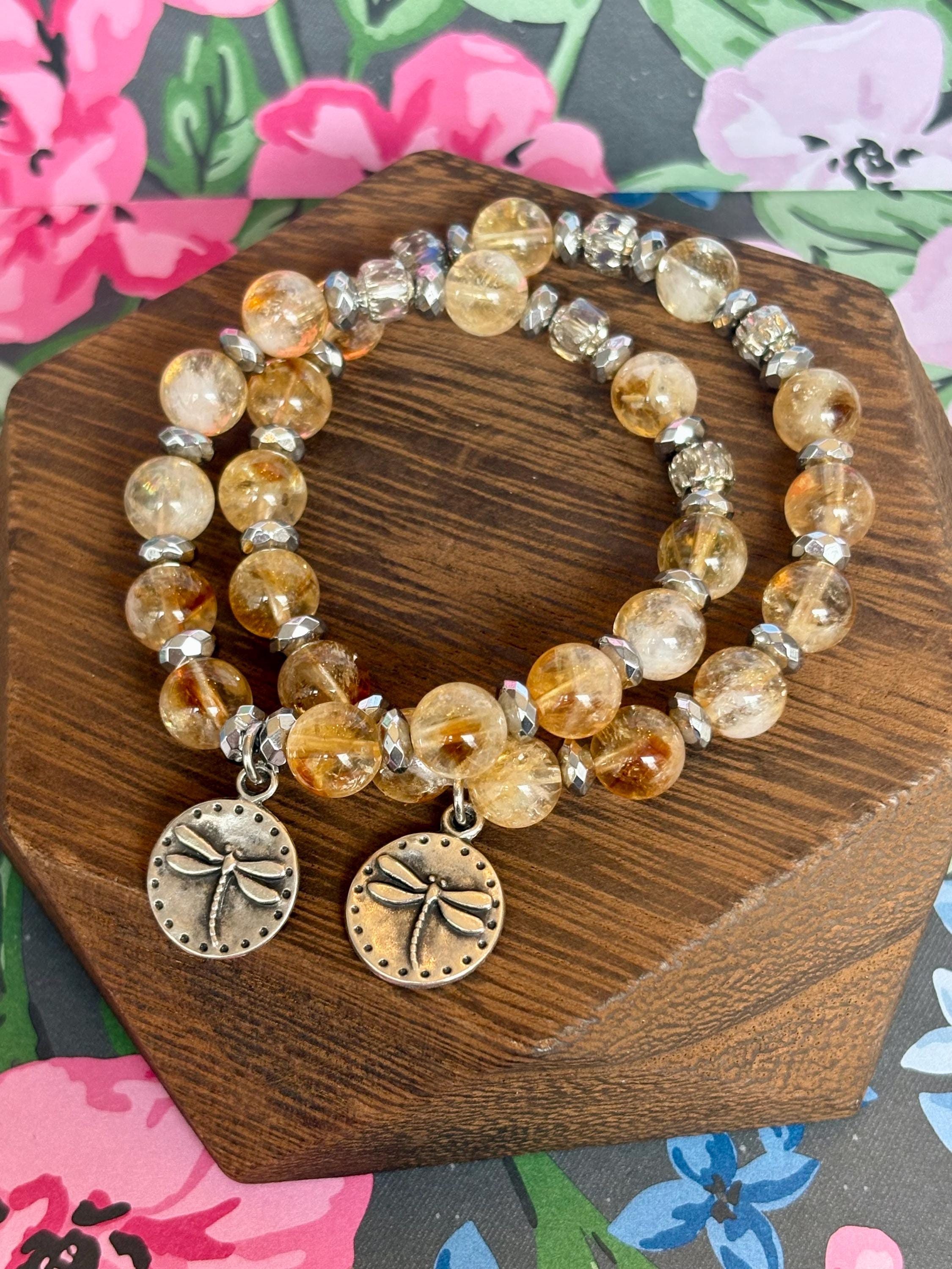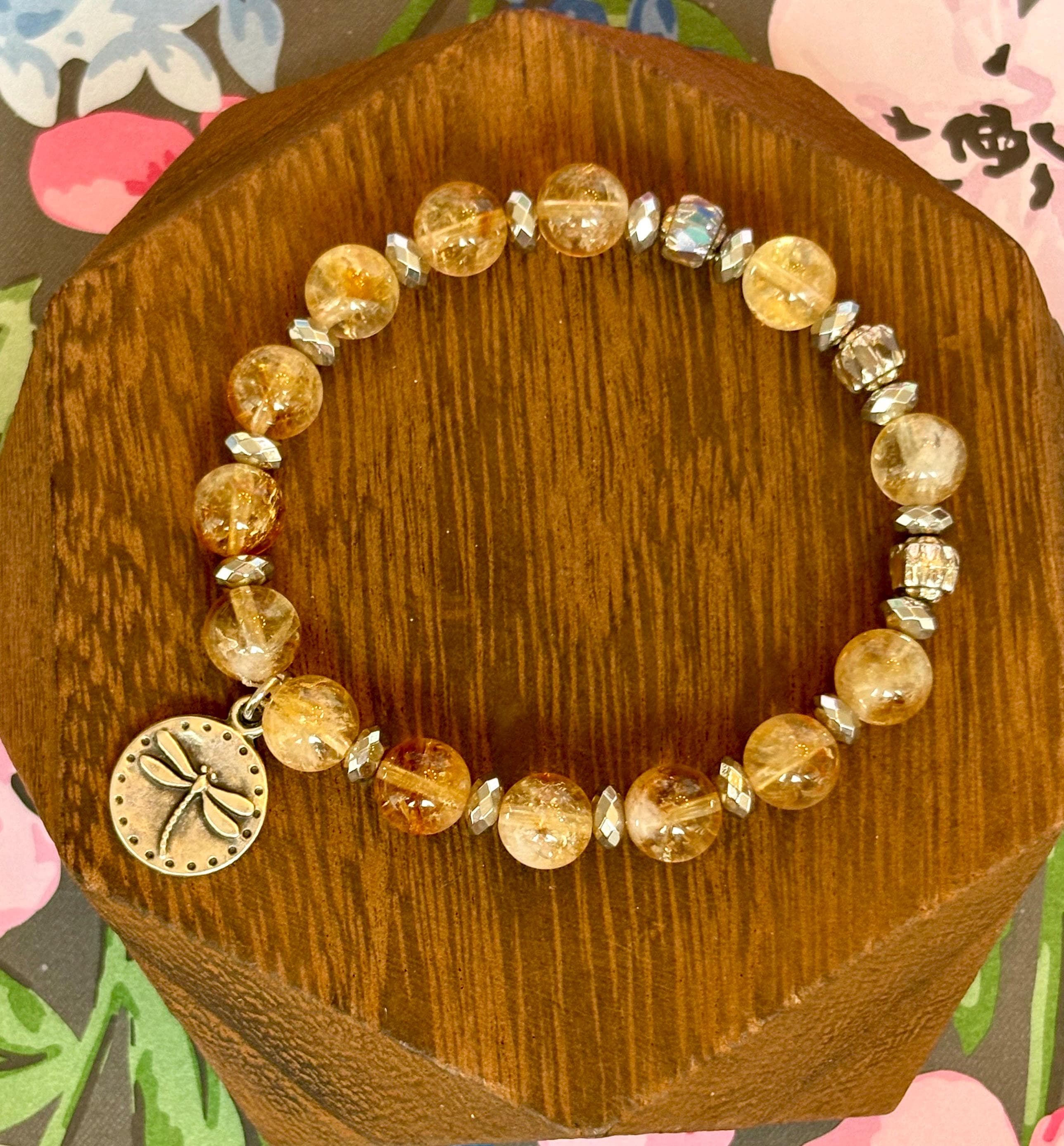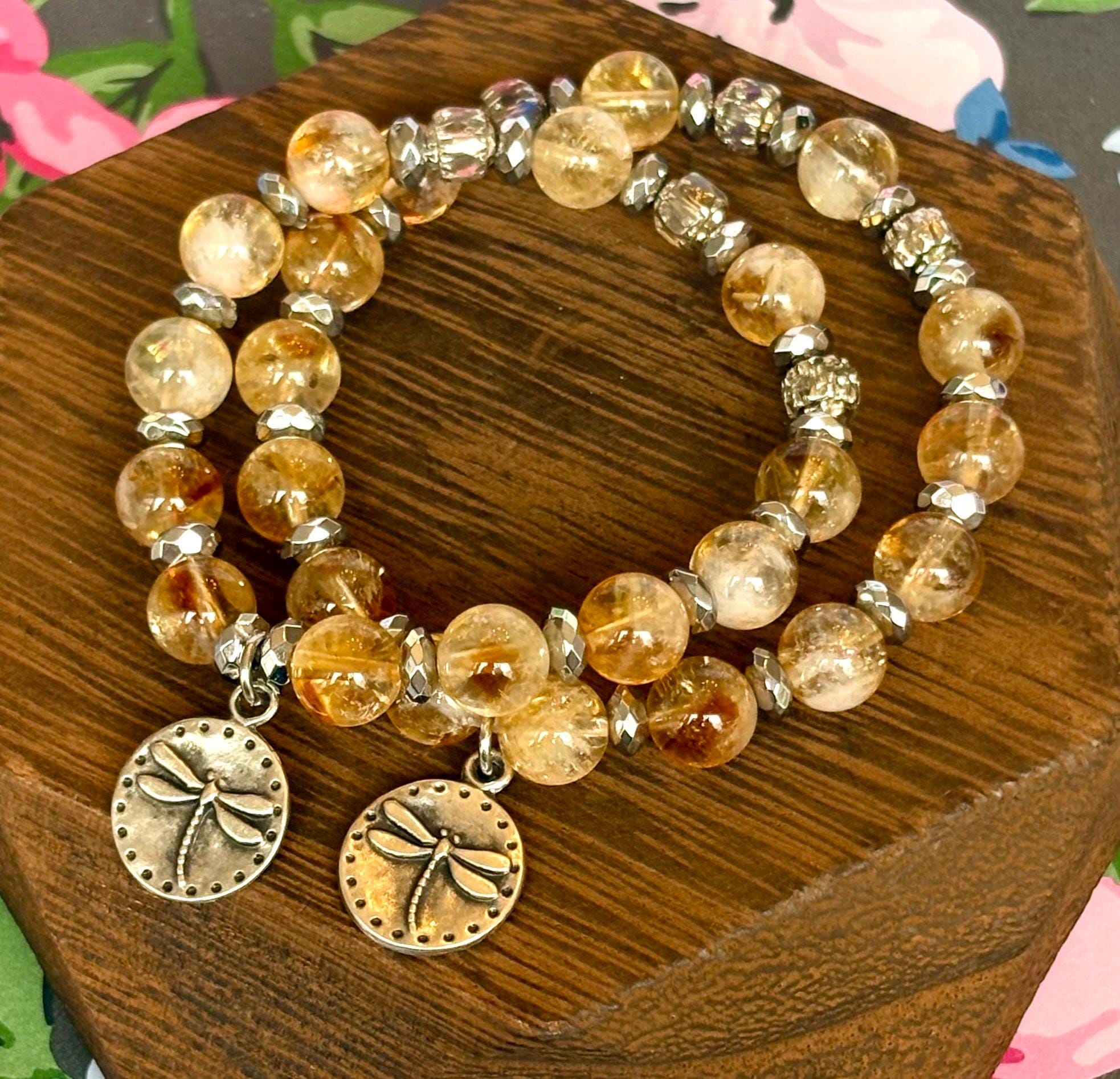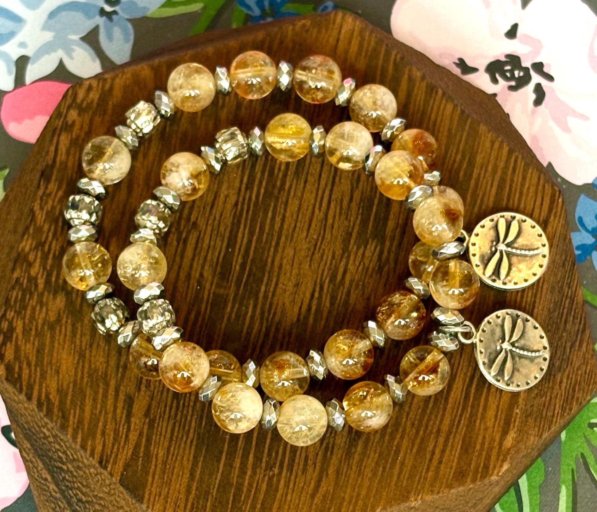 Meredith’s Dragonfly is a radiant gemstone bracelet designed to uplift the spirit with warmth, abundance, and transformation! Each piece is lovingly handcrafted with shimmering Citrine gemstones, reflective silver faceted Hematite, and elegant Czech glass cathedral beads that add just the right touch of sparkle and vintage charm.