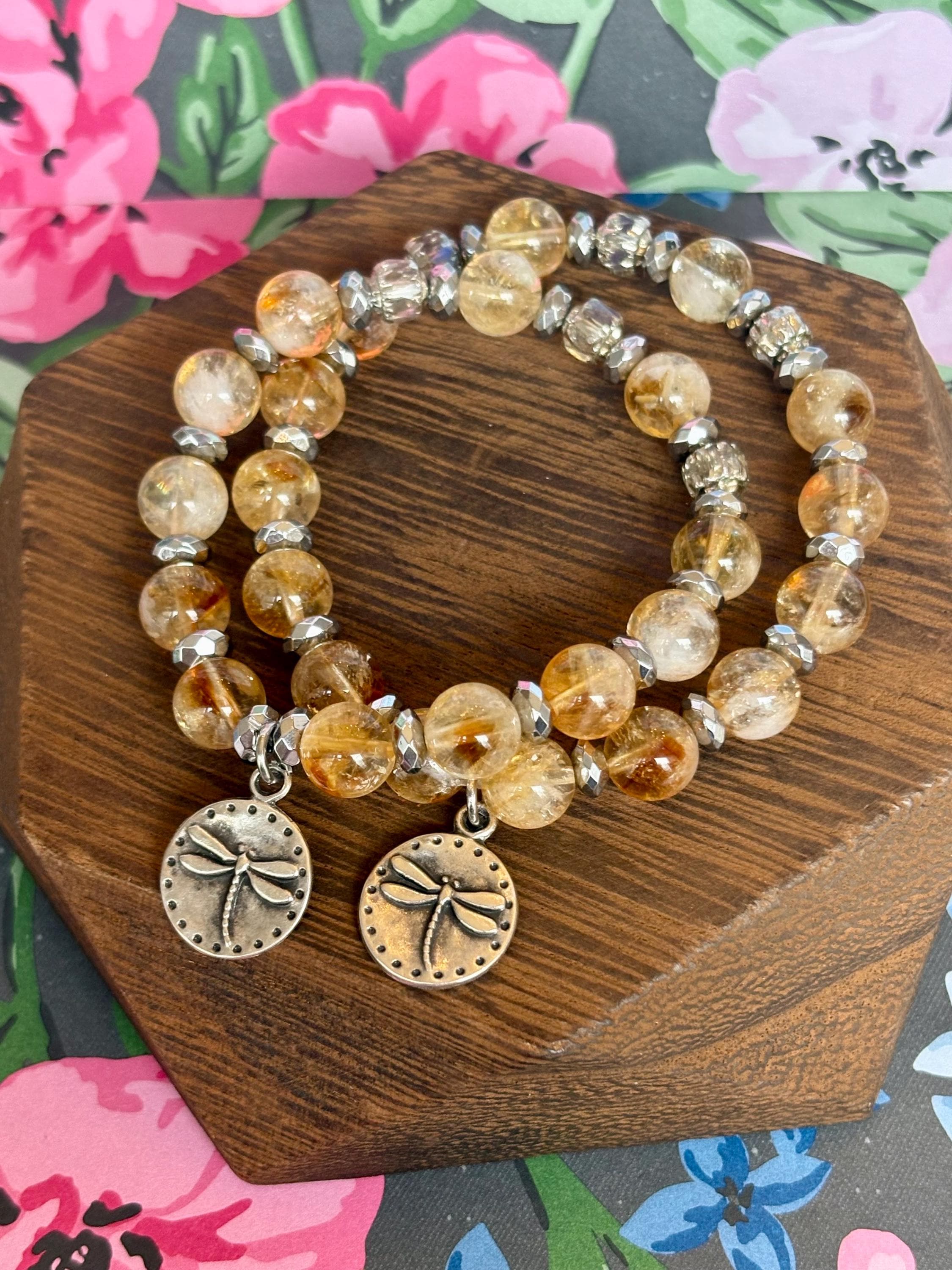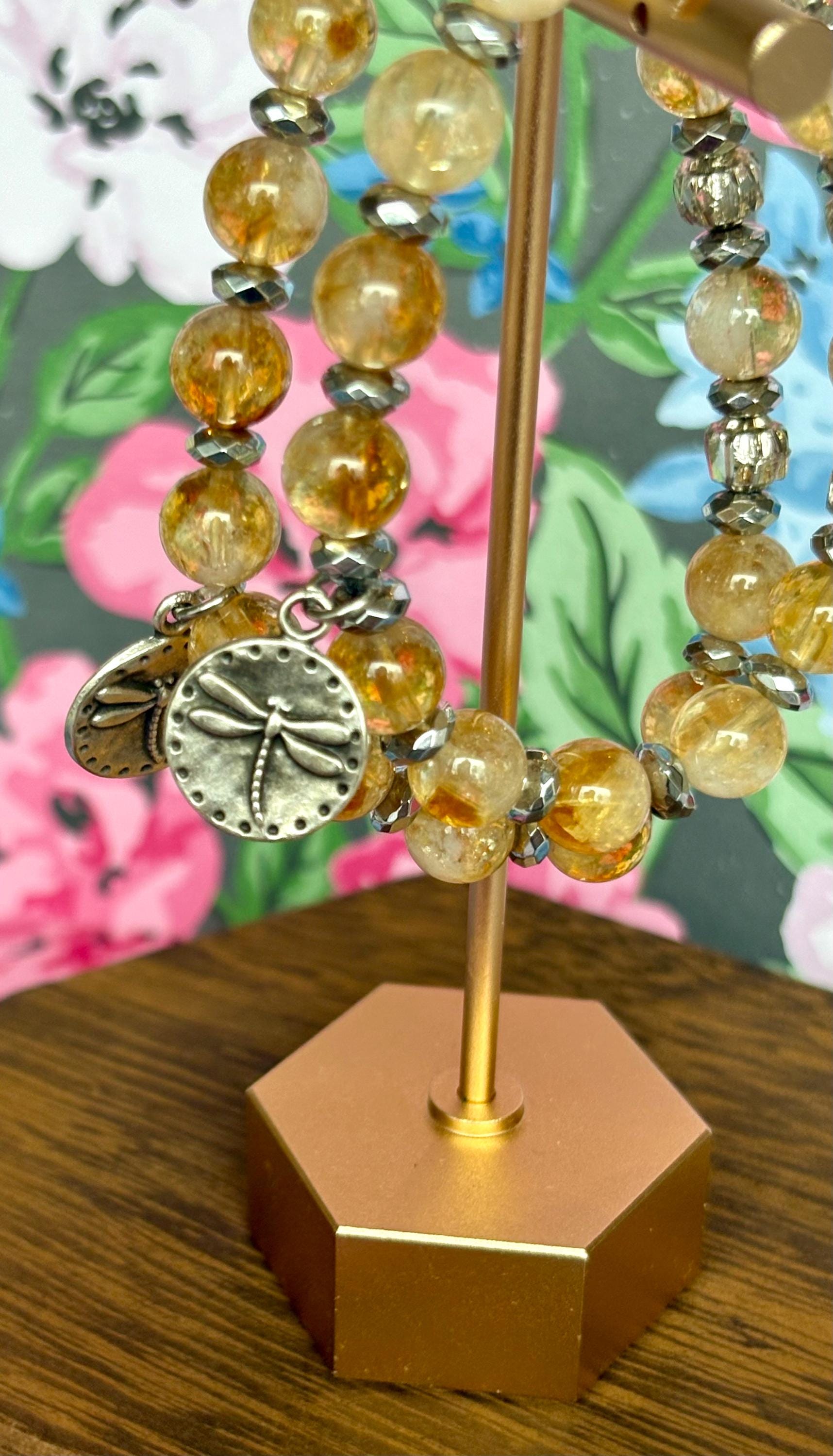 Citrine & Silver Hematite Gemstone Bracelet | Joy, Abundance & Strength | Dragonfly Charm | Reiki-Infused