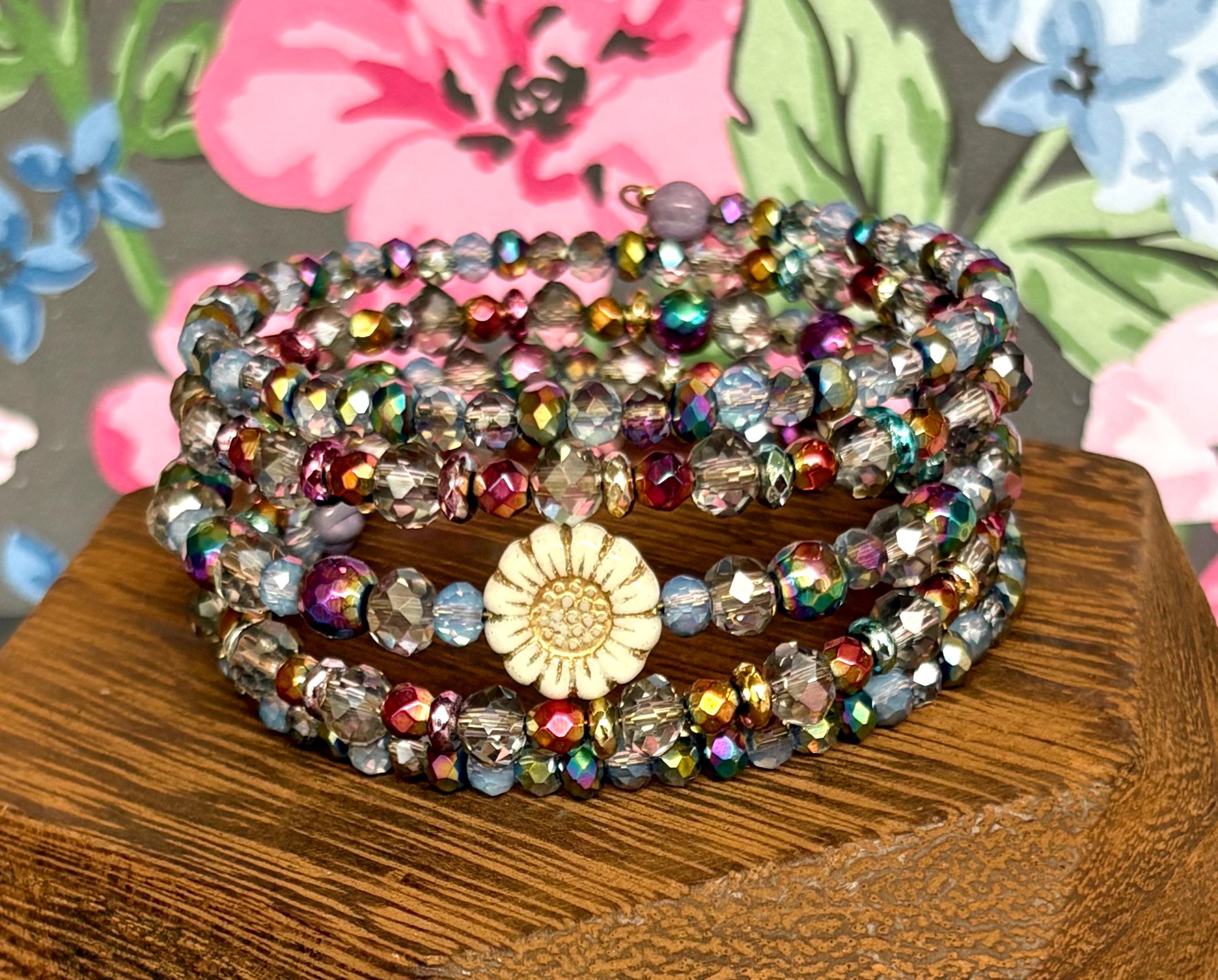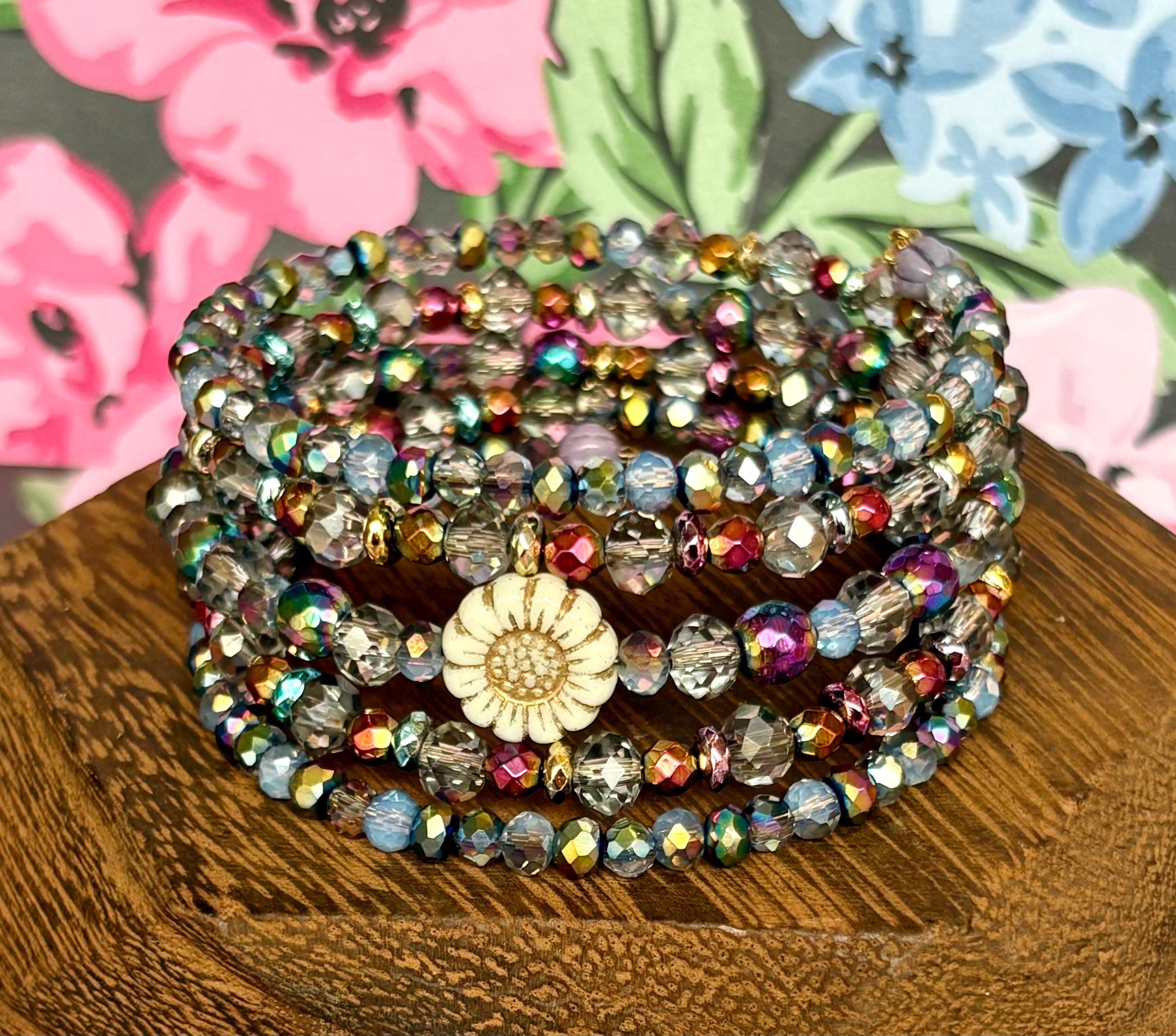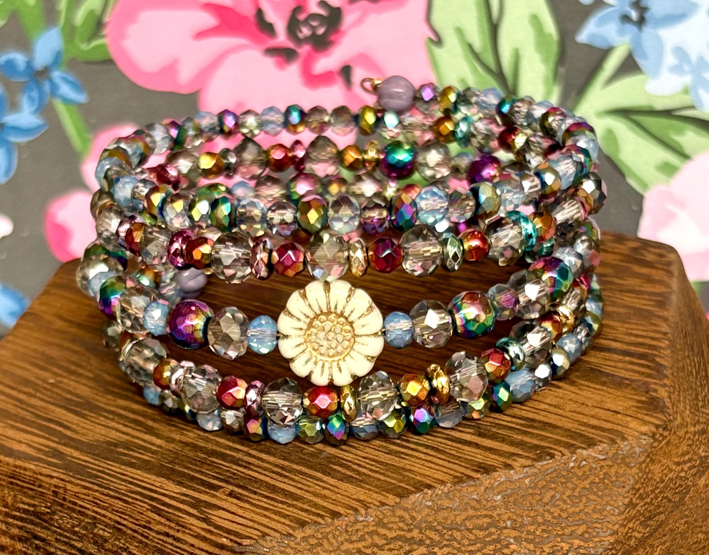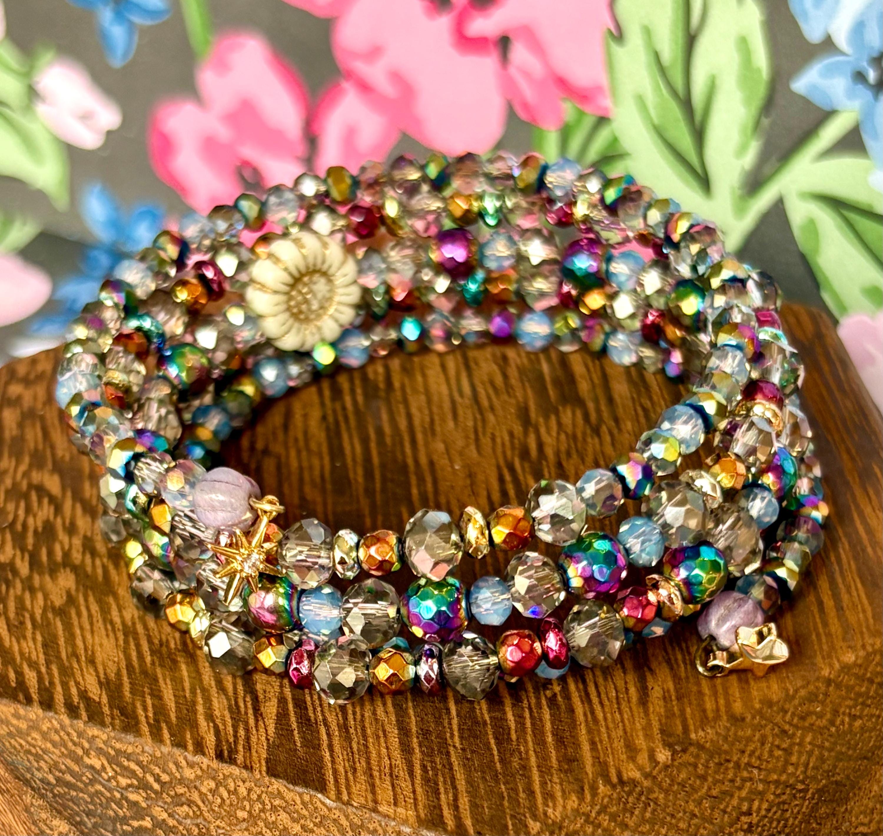 Enchanted Sunflower Wrap Bracelet – Rainbow Hematite, Czech Crystal & Gold Star