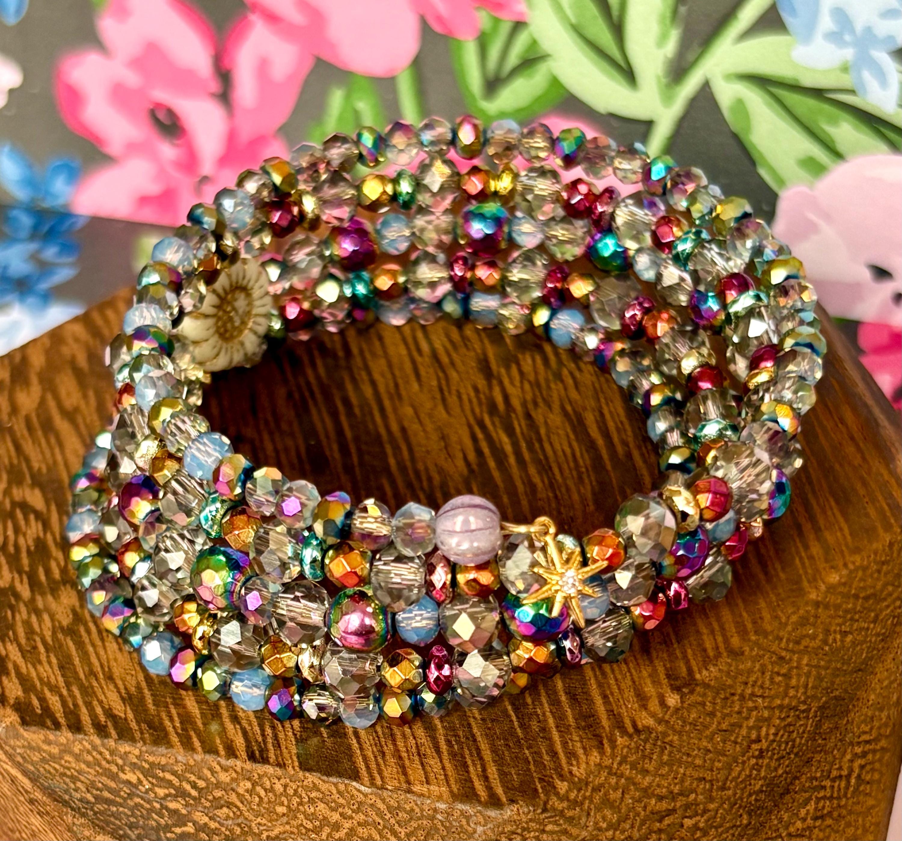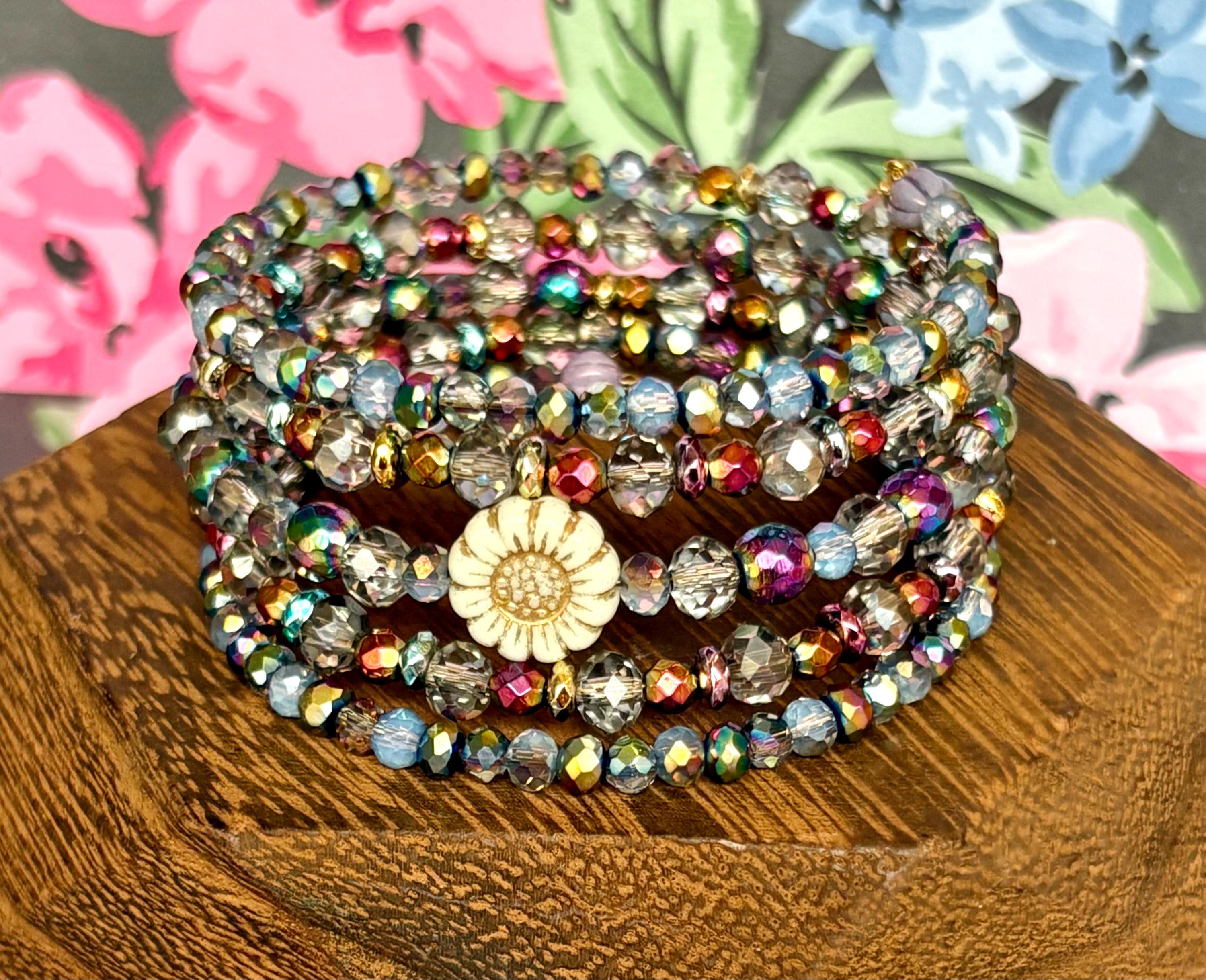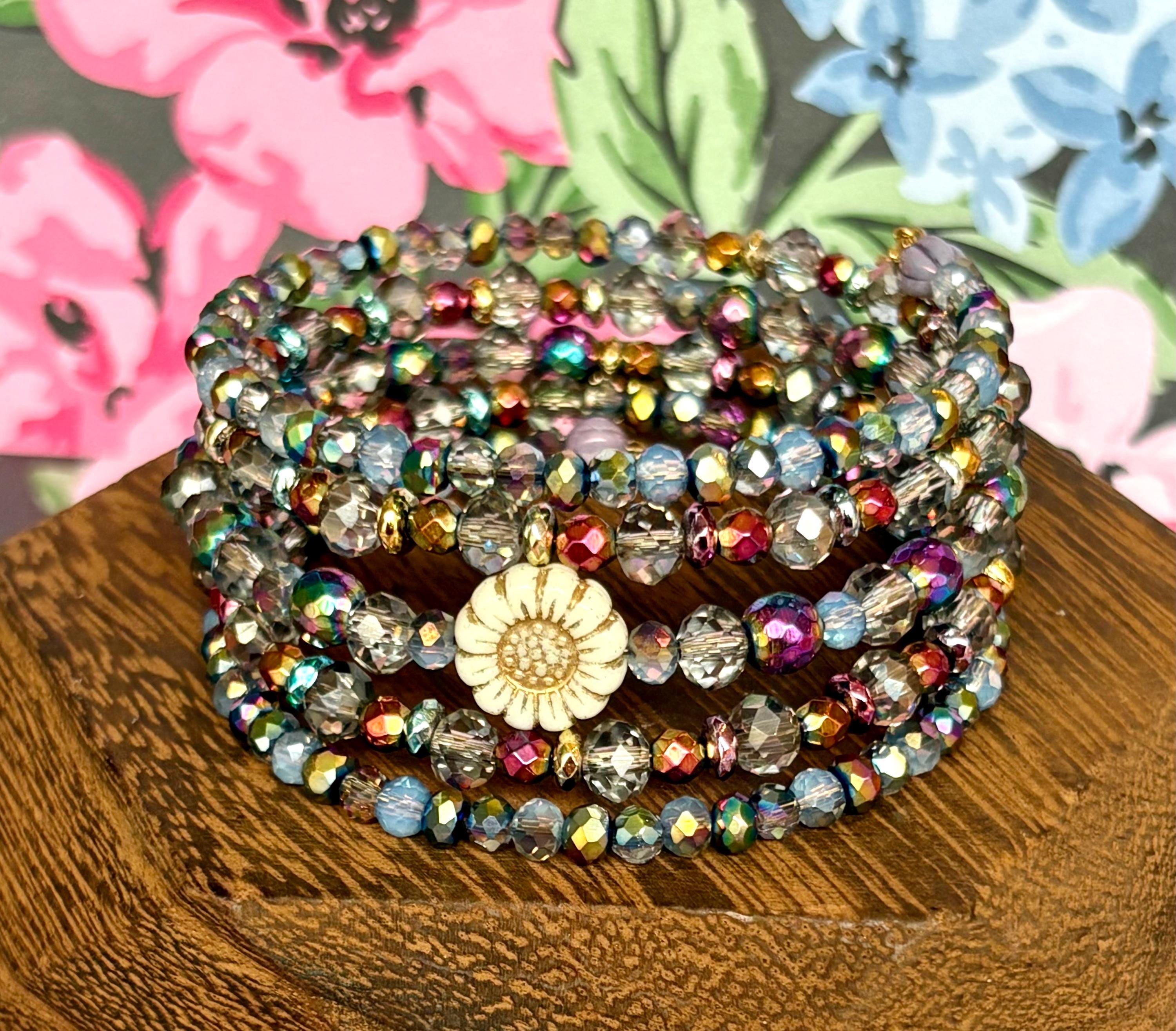 Enchanted Sunflower Wrap Bracelet – Rainbow Hematite, Czech Crystal & Gold Star