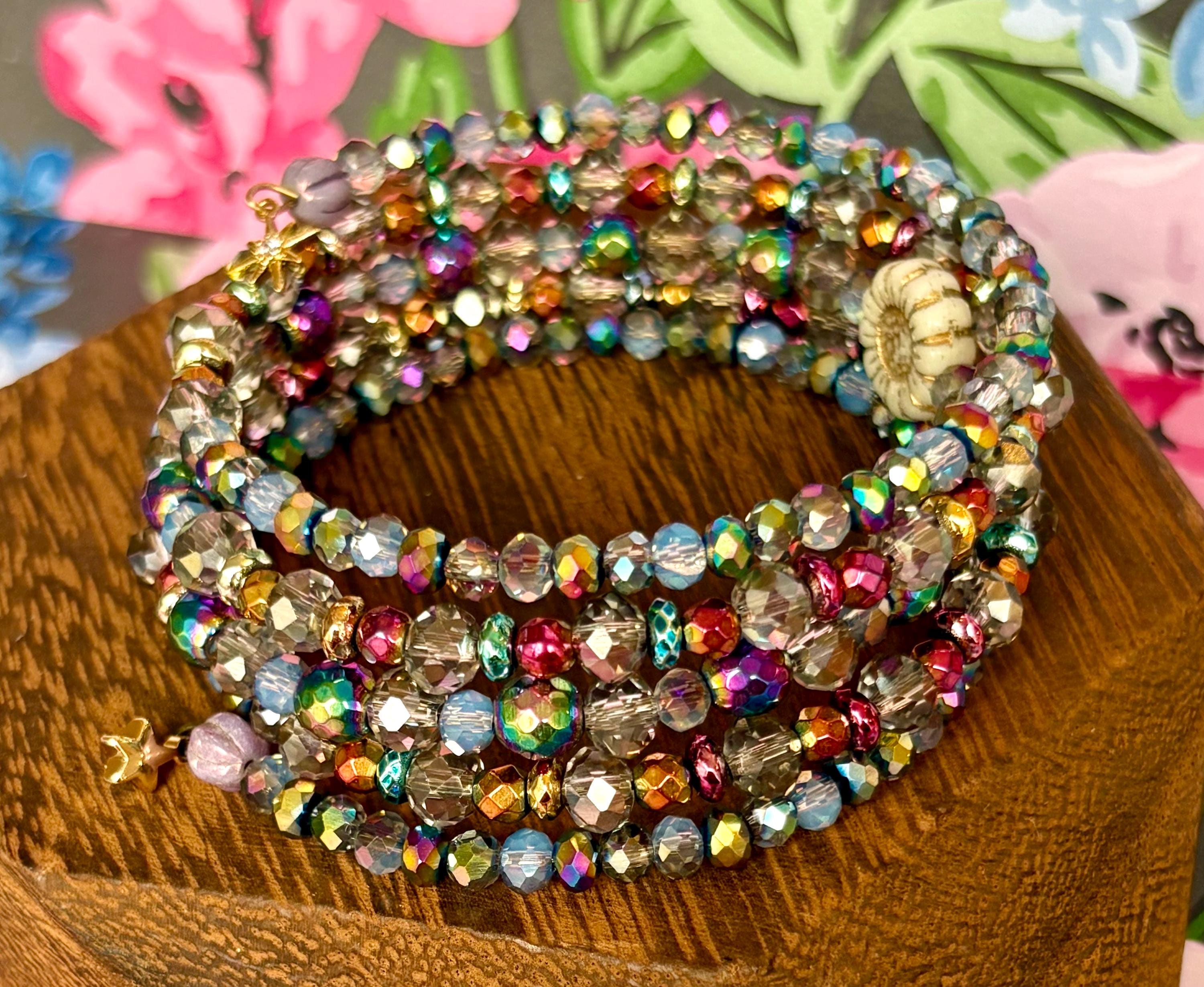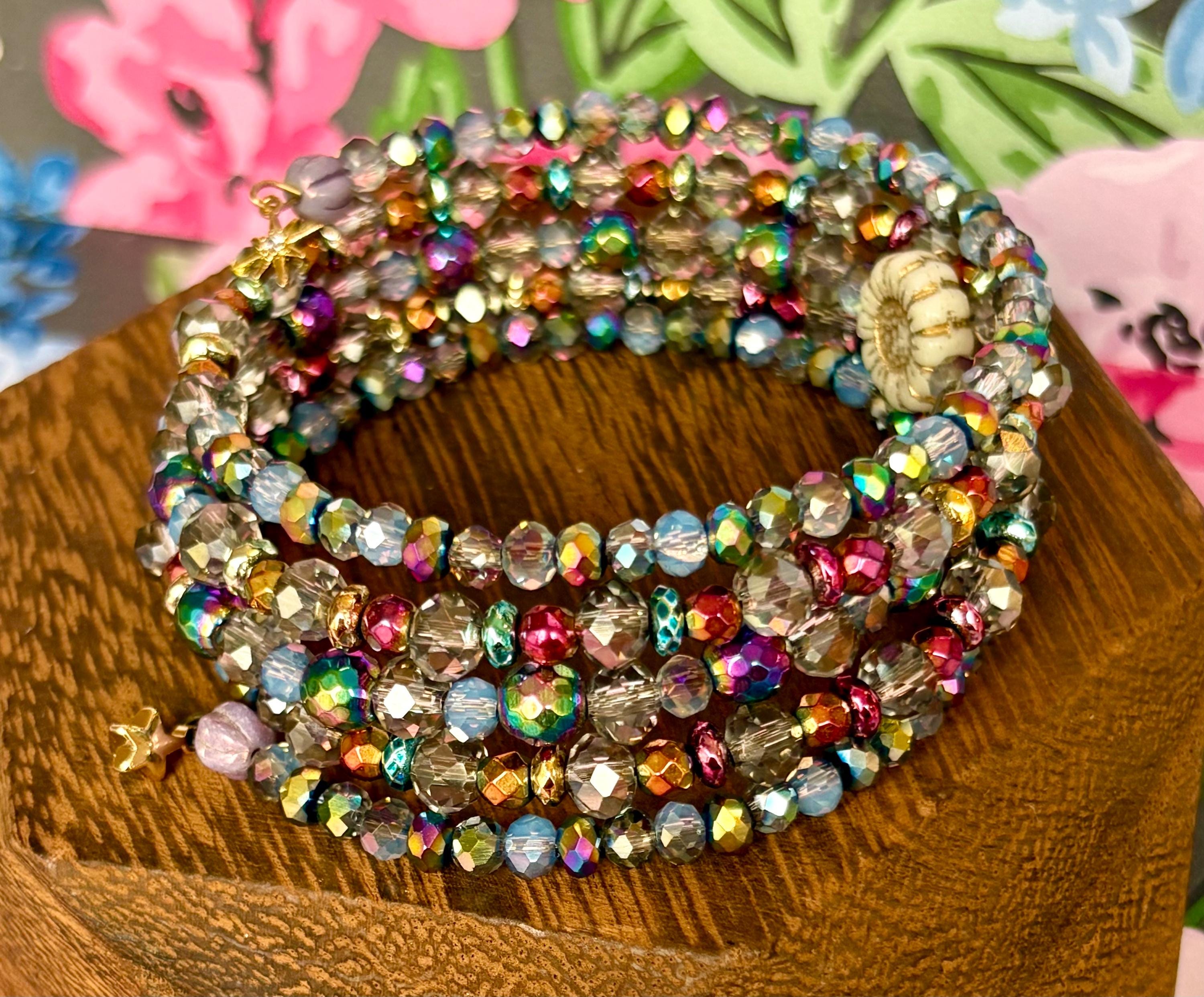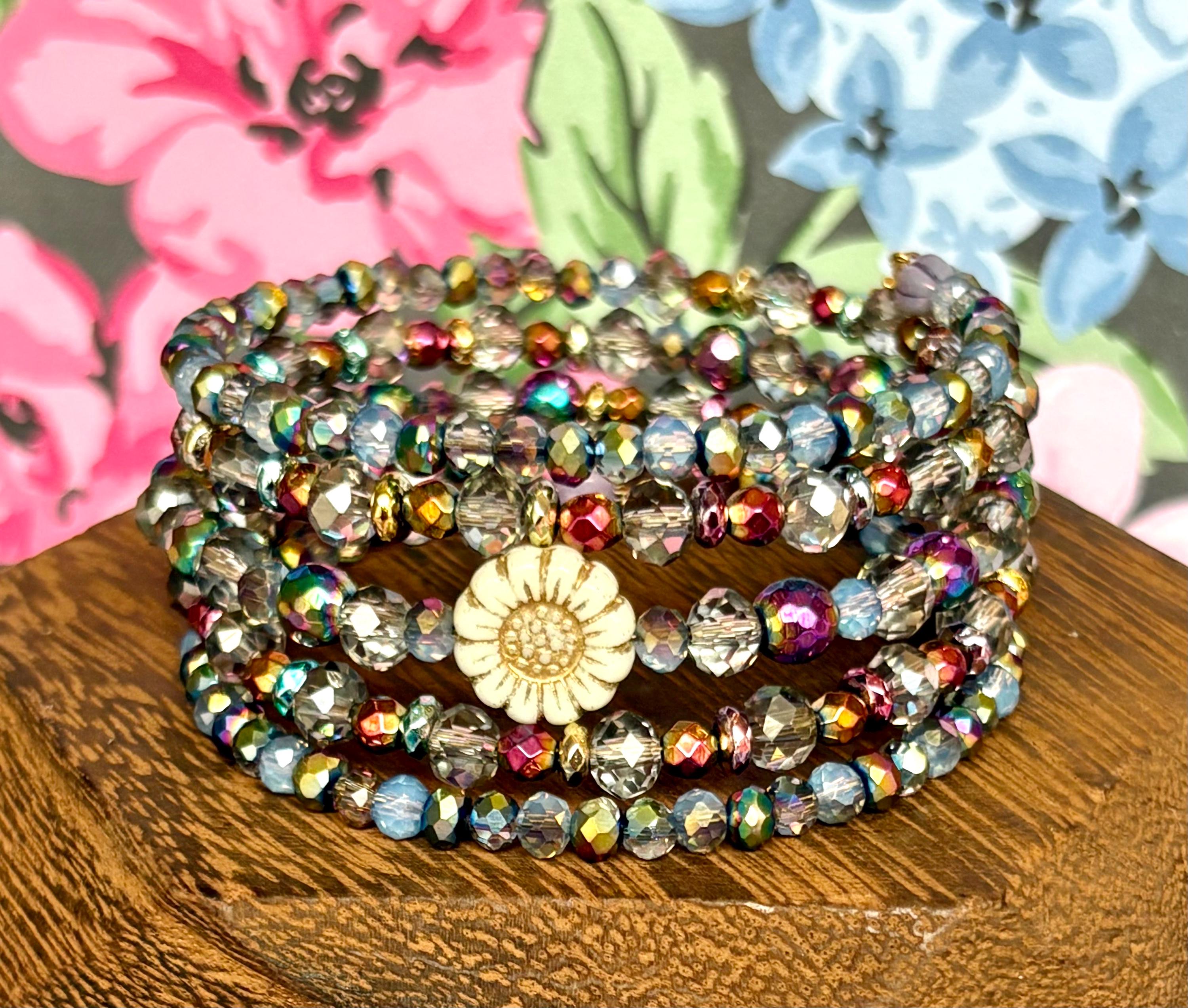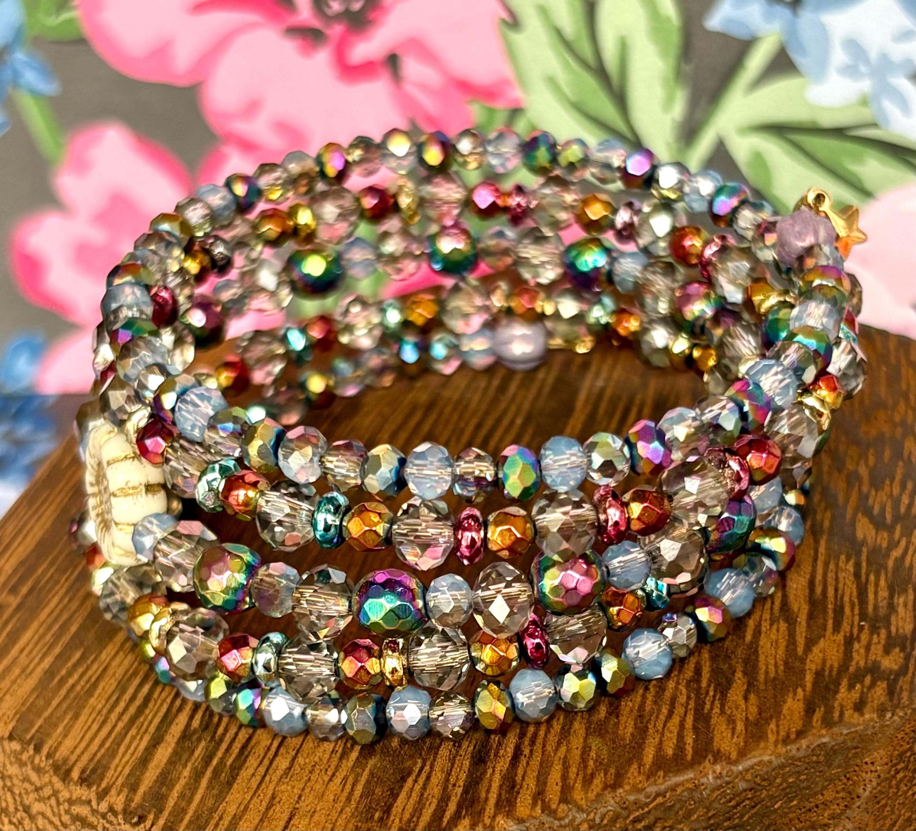 Enchanted Sunflower Wrap Bracelet – Rainbow Hematite, Czech Crystal & Gold Star