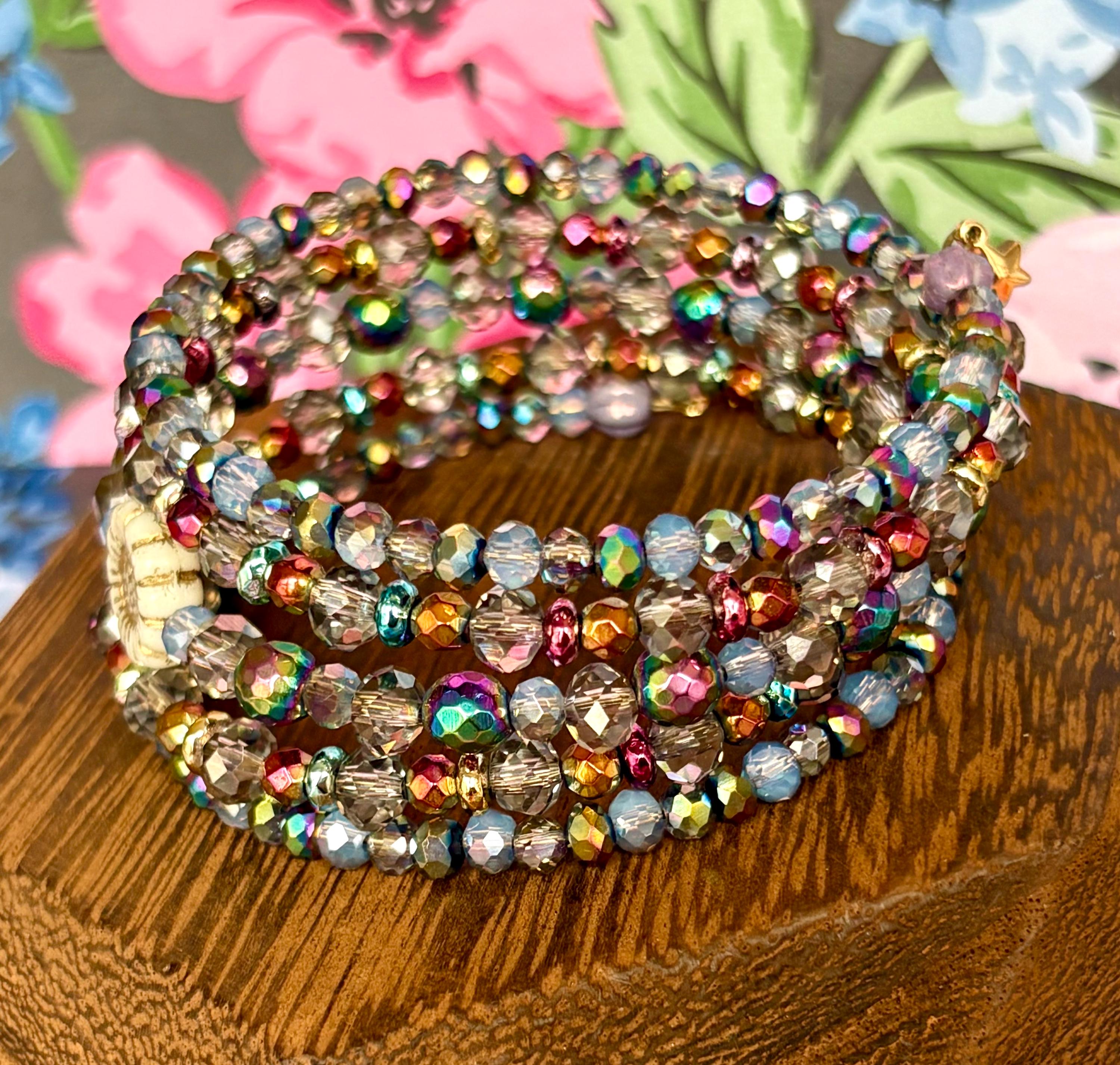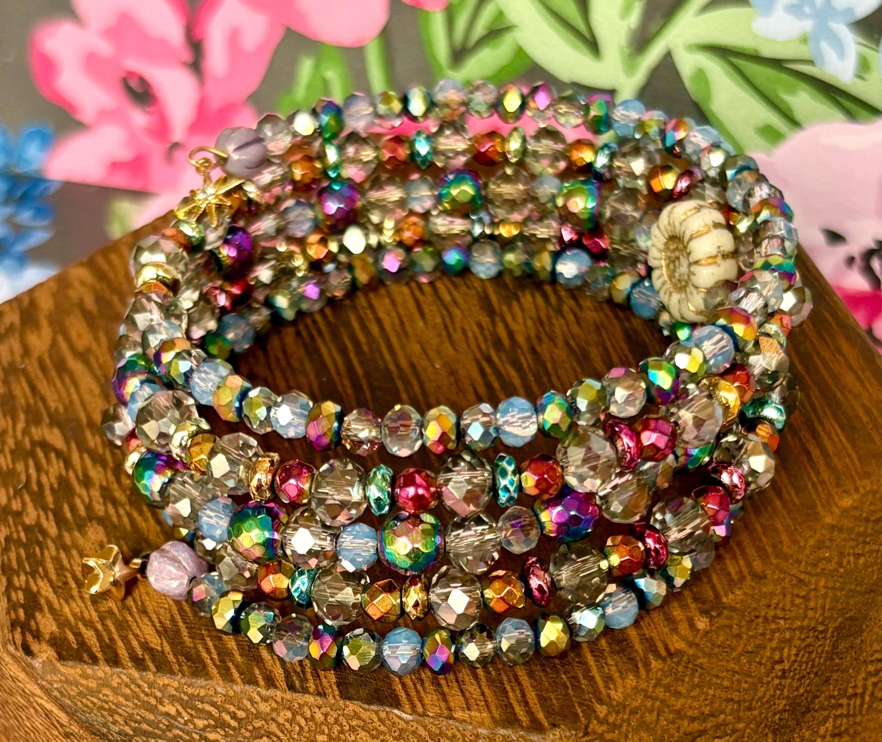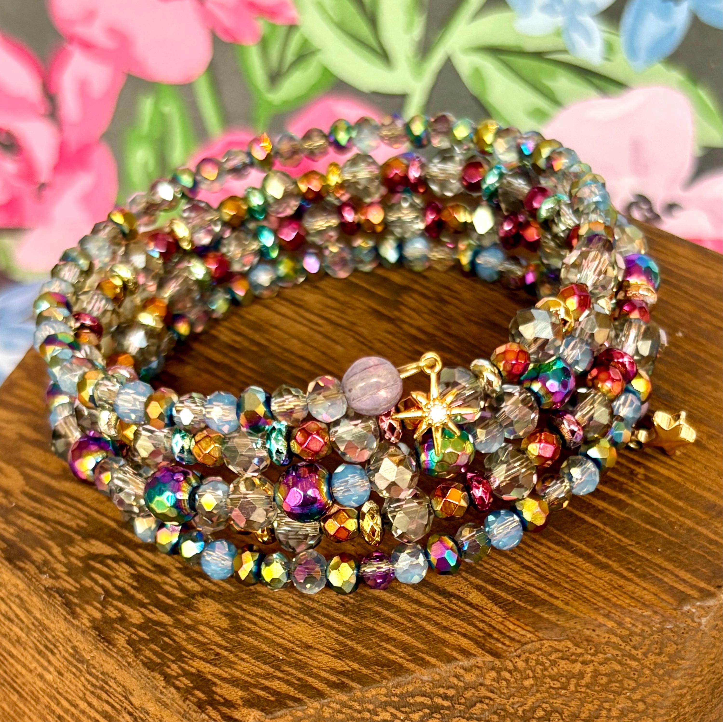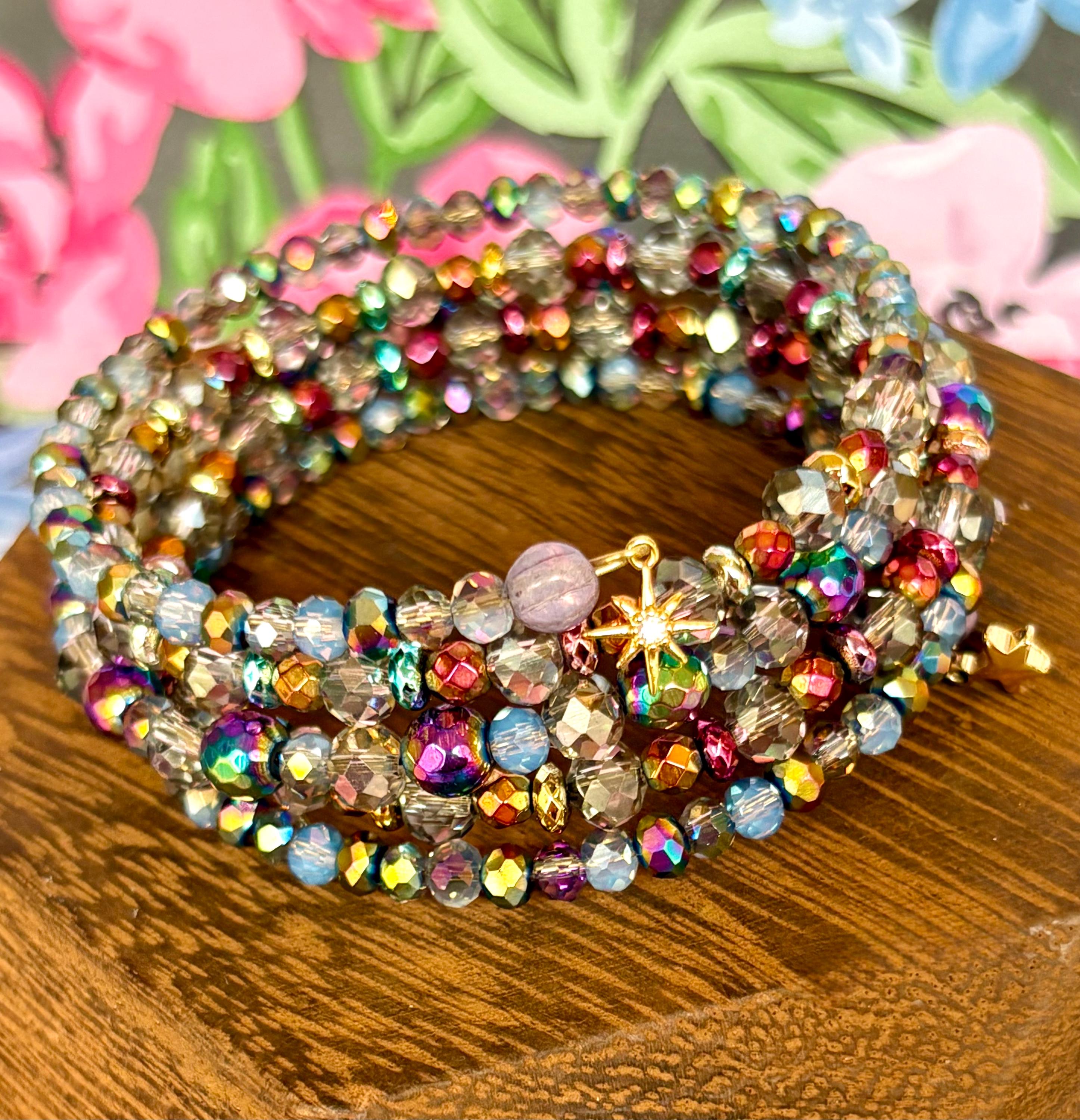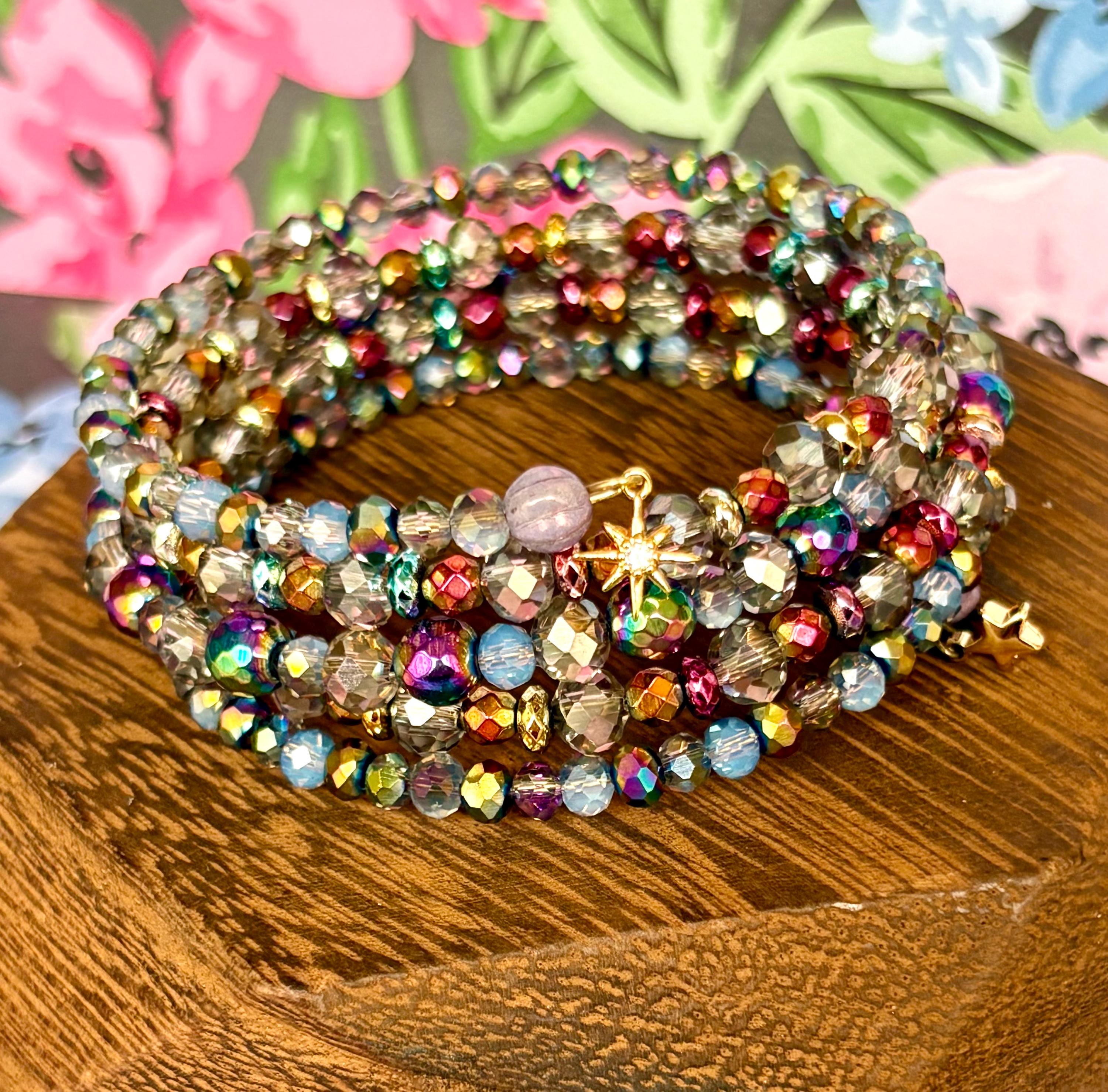 Every bead catches the light like stardust, creating a glowing, prismatic galaxy around your wrist — a true statement piece filled with meaning, intention, and charm.