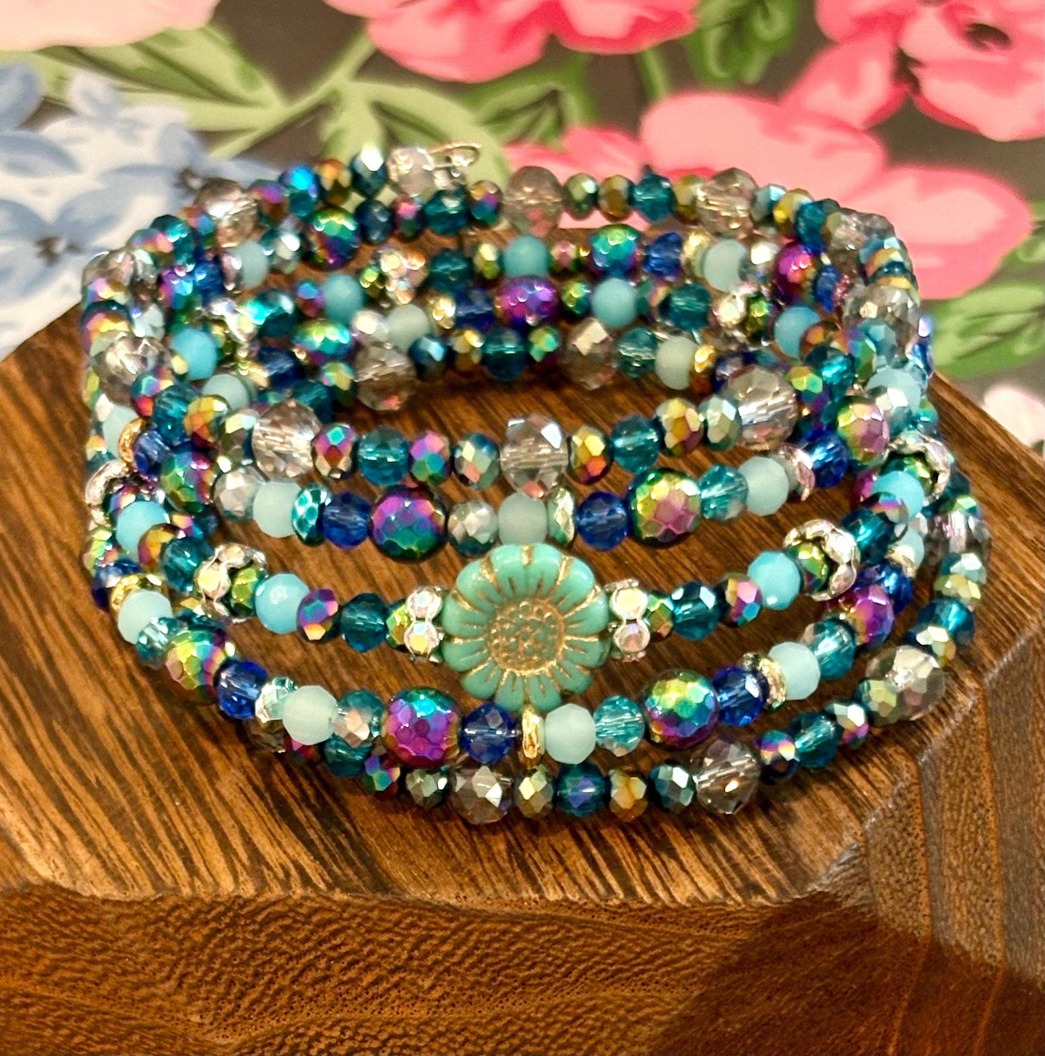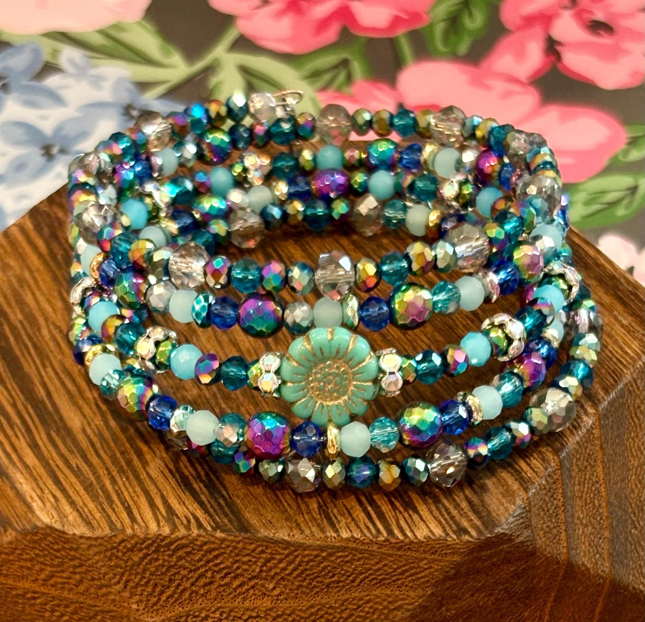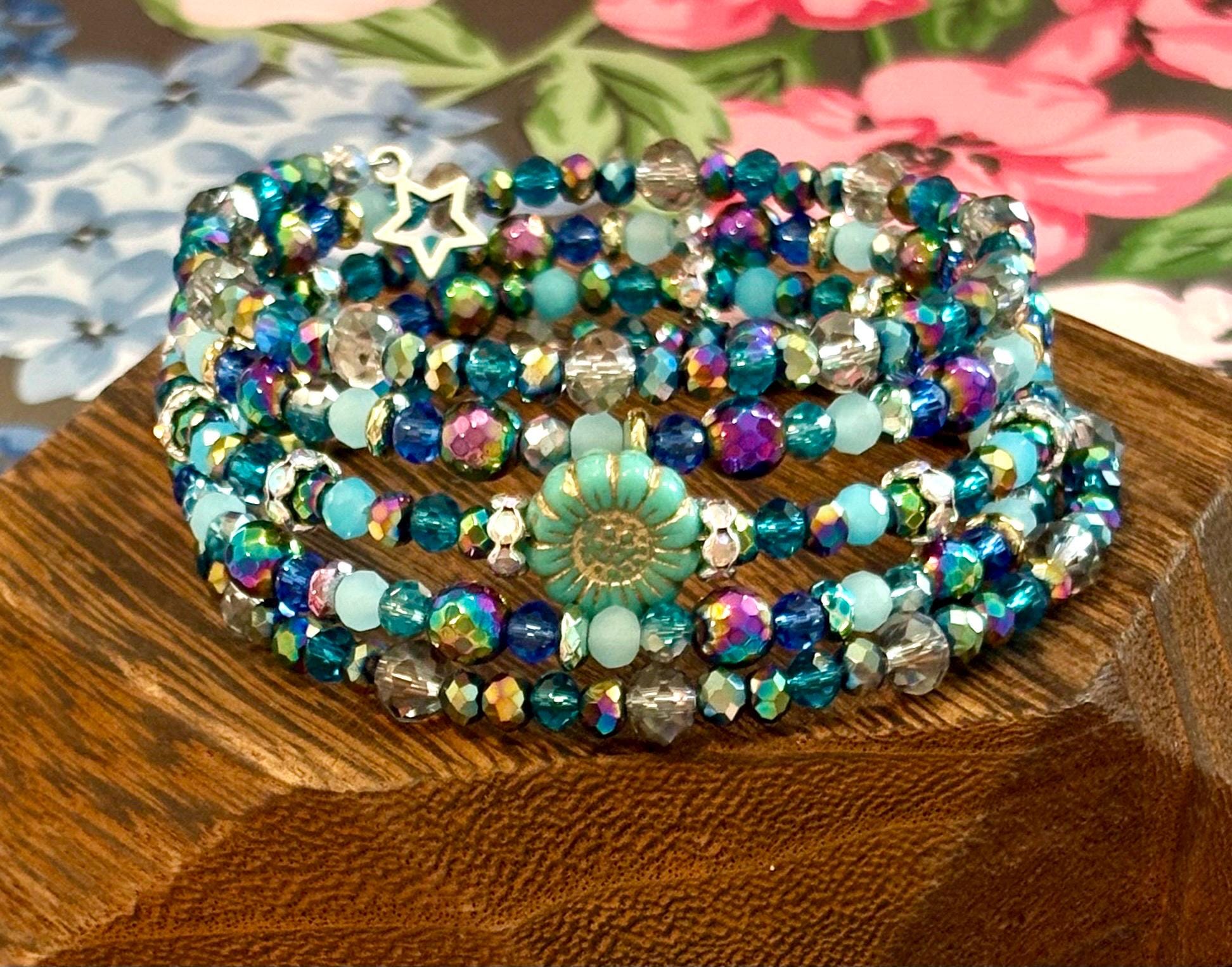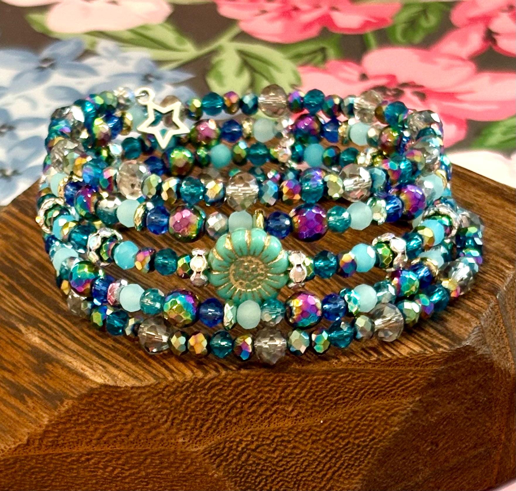 Step into a world of shimmering cosmic color with this Enchanted Galaxy Wrap Bracelet — a mystical blend of rainbow hematite gemstones, sparkling Czech glass, AB rhinestone spacers, and a soothing sunflower focal bead! Every coil glimmers with hues of teal, aqua, silver, pink, gold, gray, and iridescent rainbow, creating a wearable galaxy that wraps gently around your wrist.