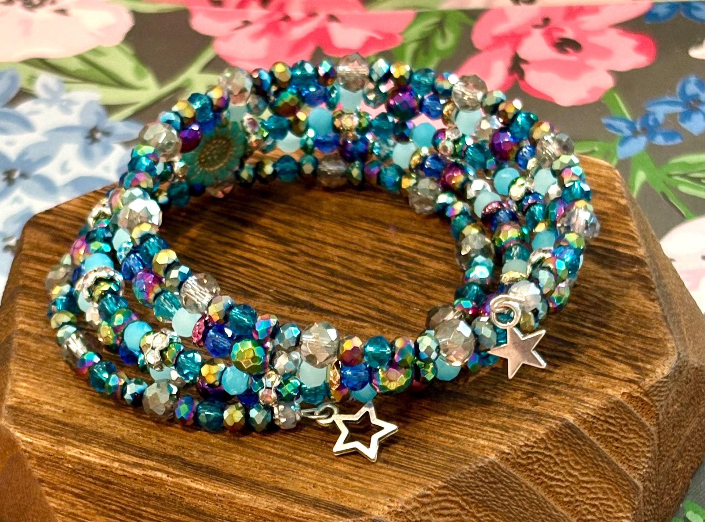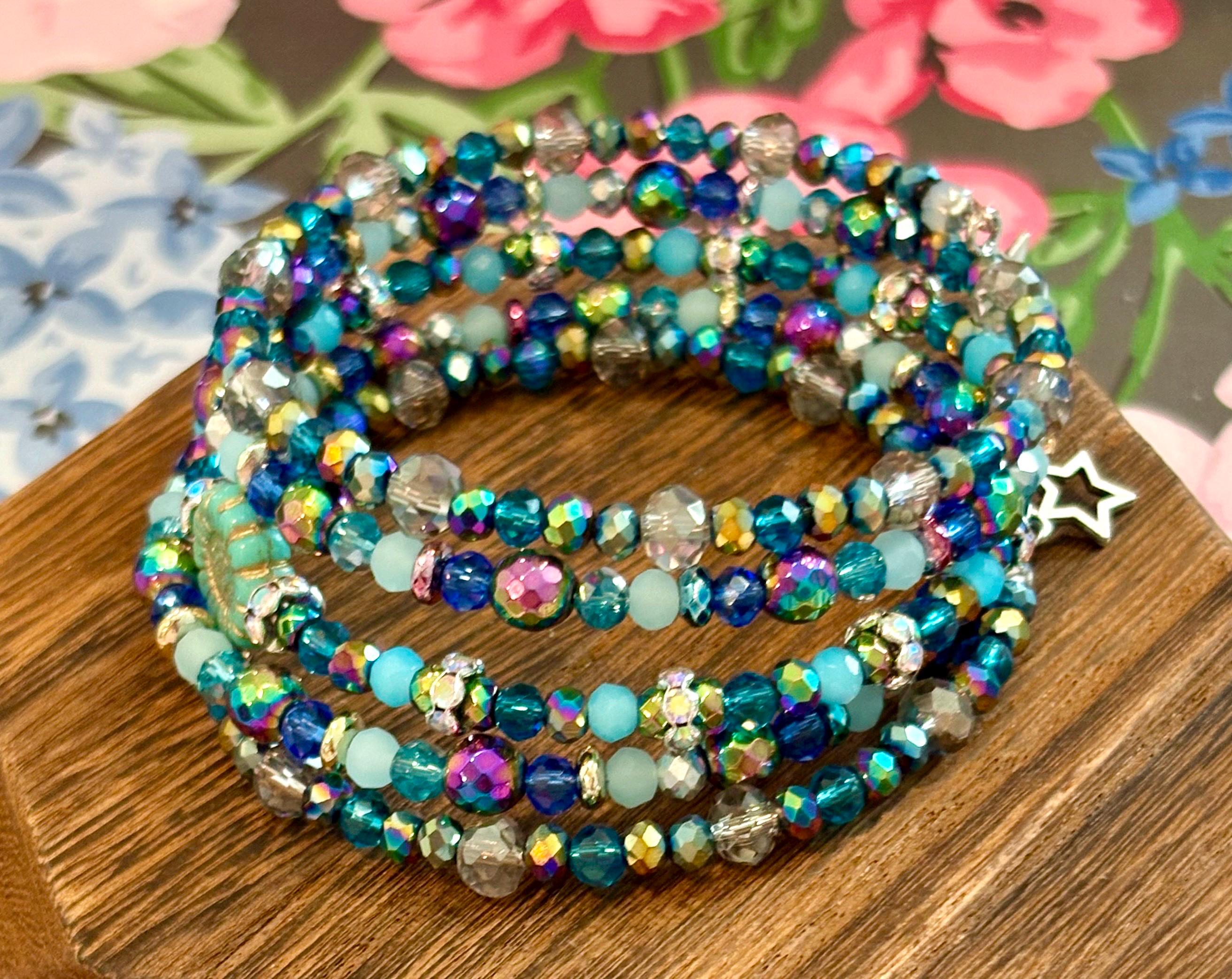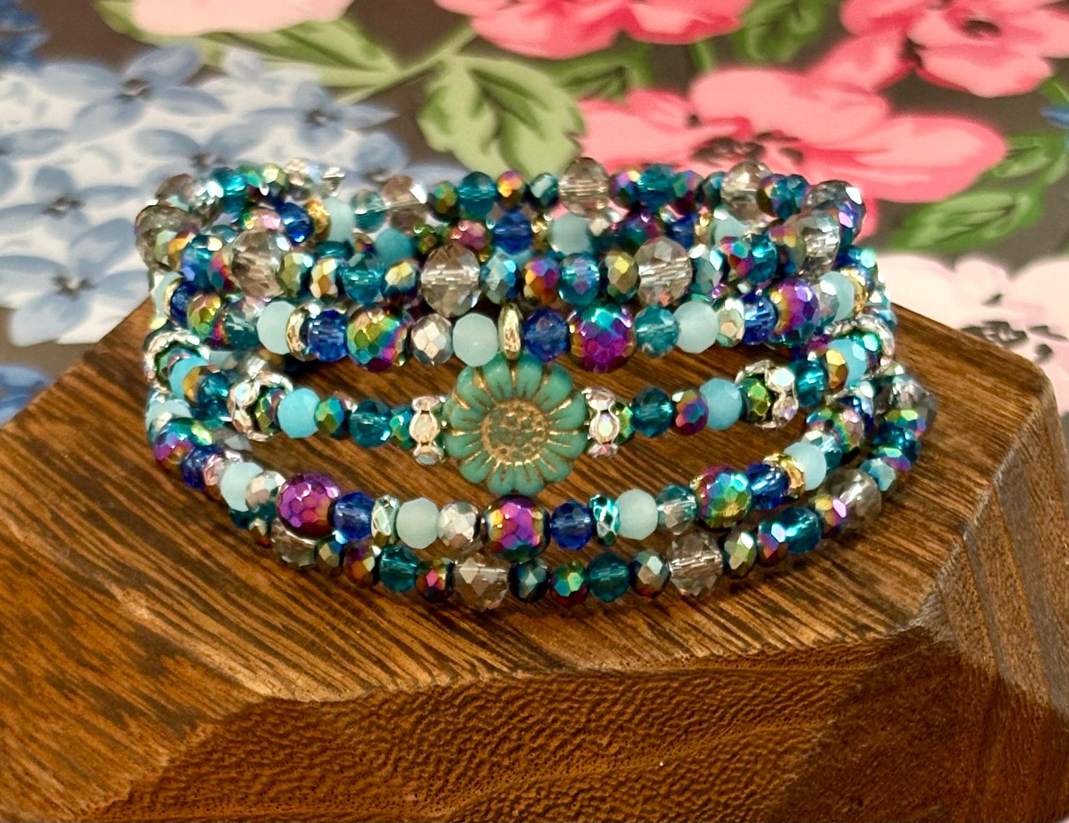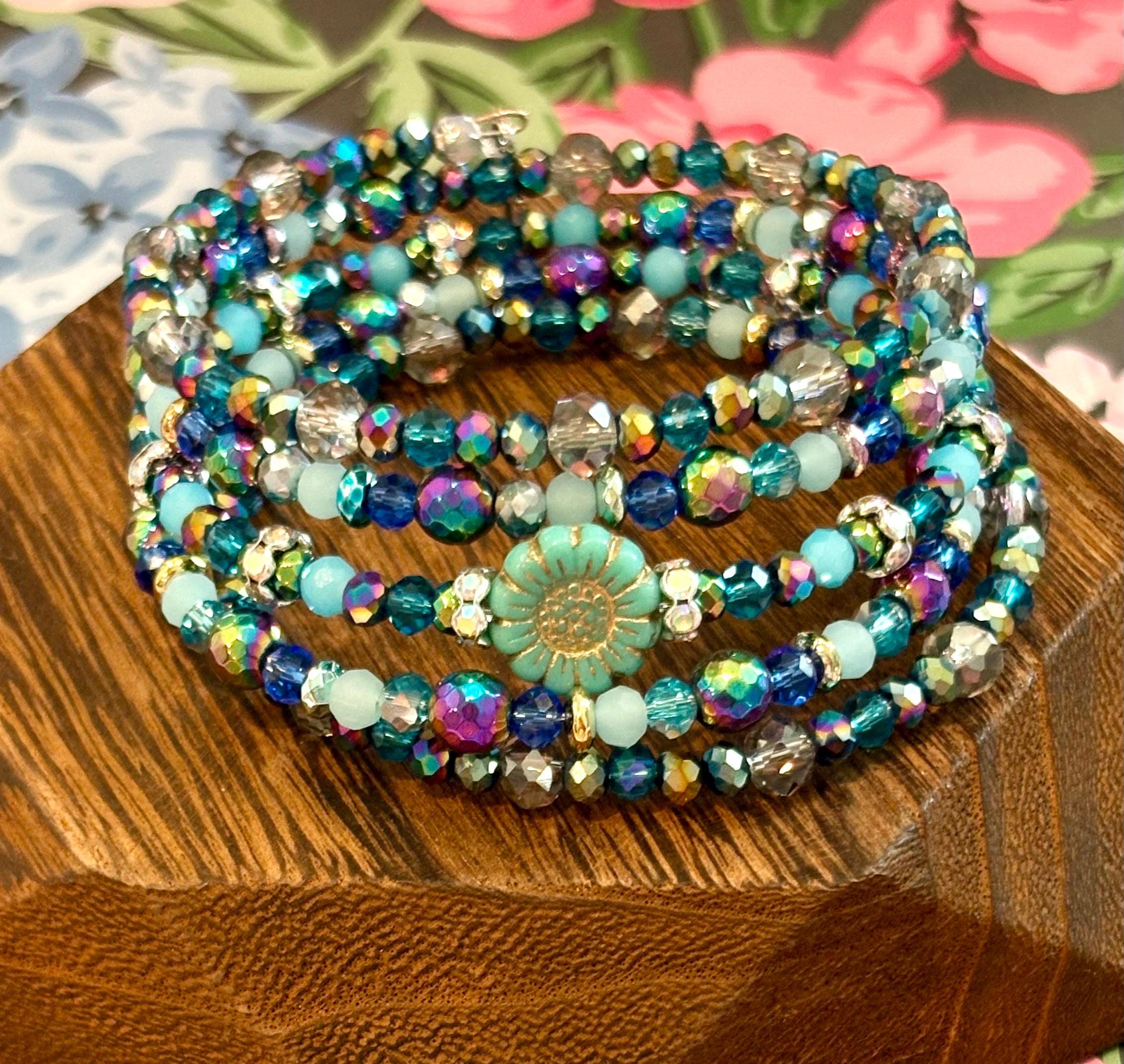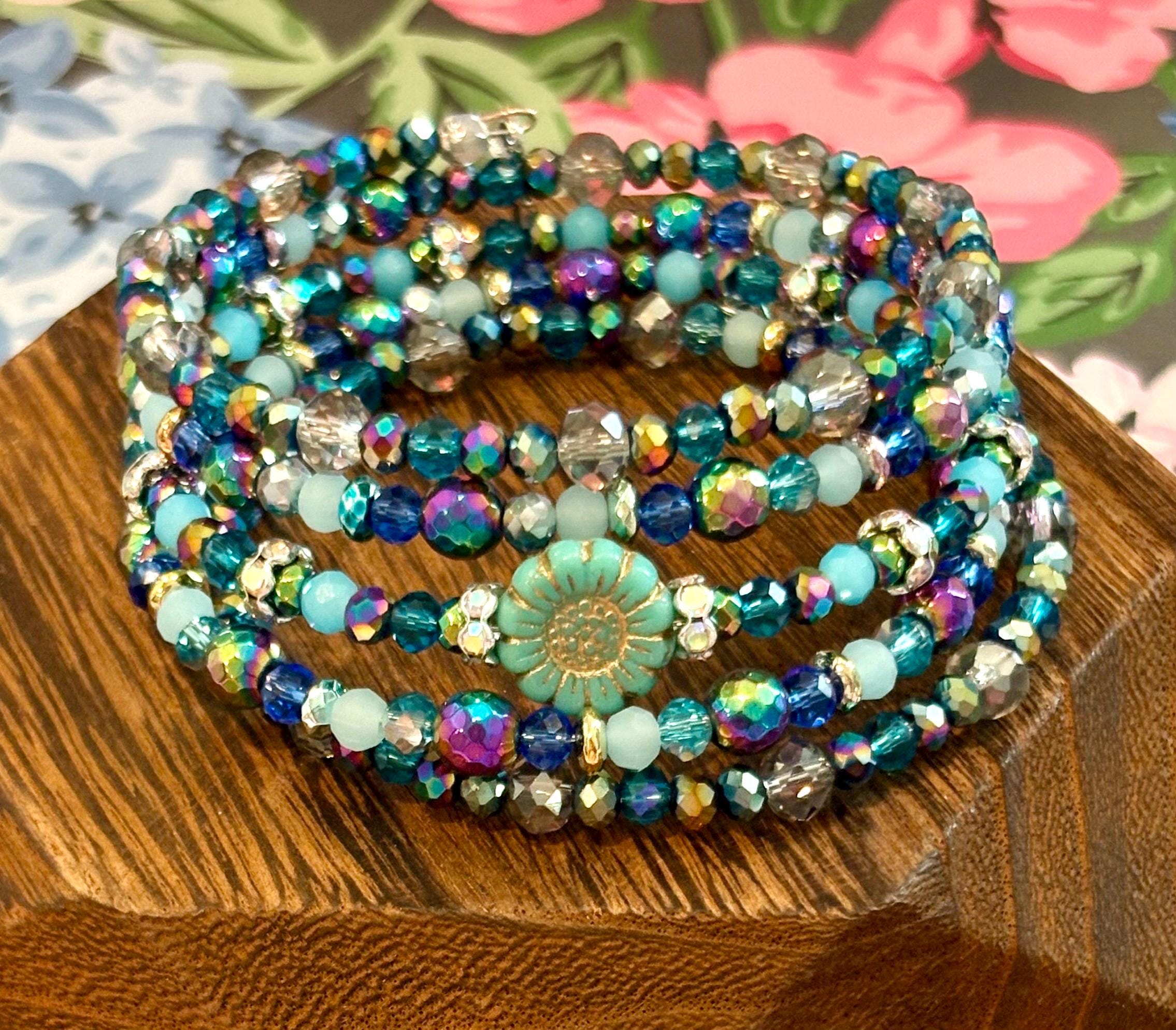 Step into a world of shimmering cosmic color with this Enchanted Galaxy Wrap Bracelet — a mystical blend of rainbow hematite gemstones, sparkling Czech glass, AB rhinestone spacers, and a soothing sunflower focal bead! Every coil glimmers with hues of teal, aqua, silver, pink, gold, gray, and iridescent rainbow, creating a wearable galaxy that wraps gently around your wrist.