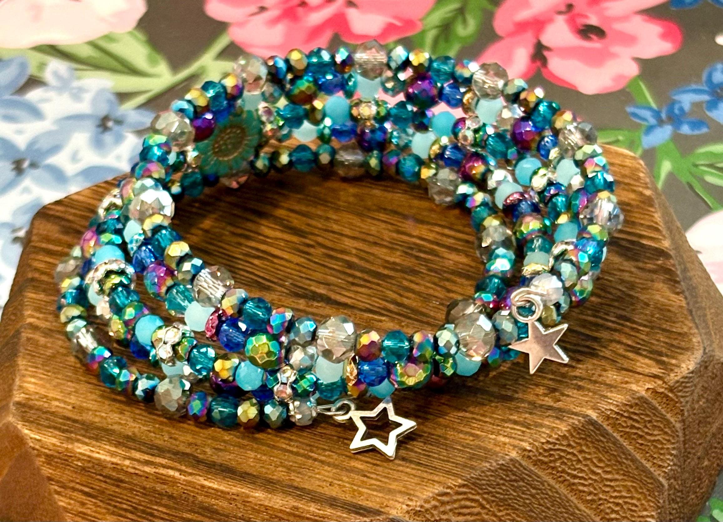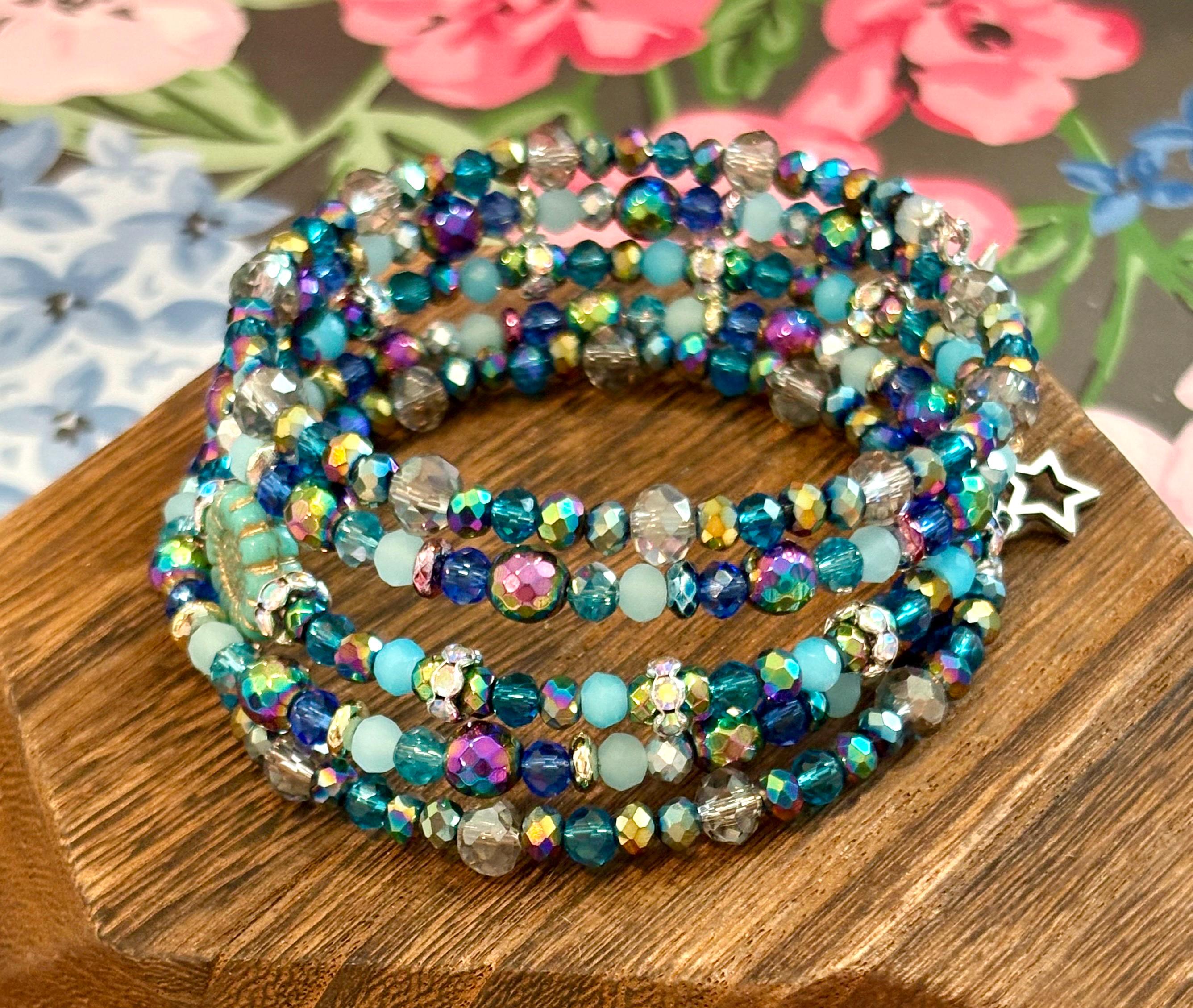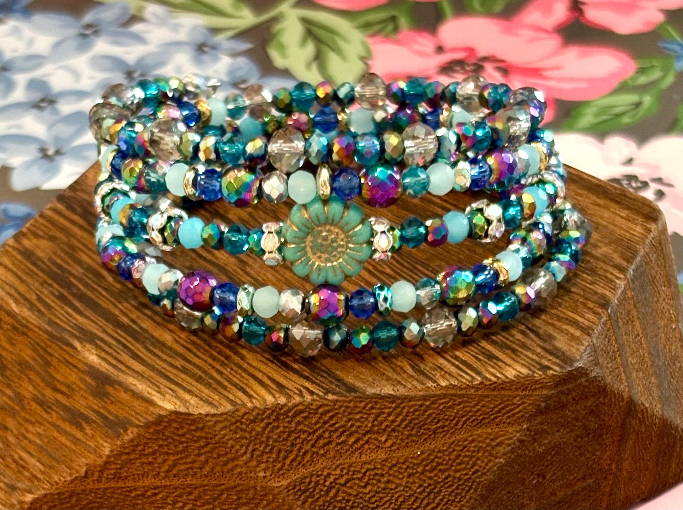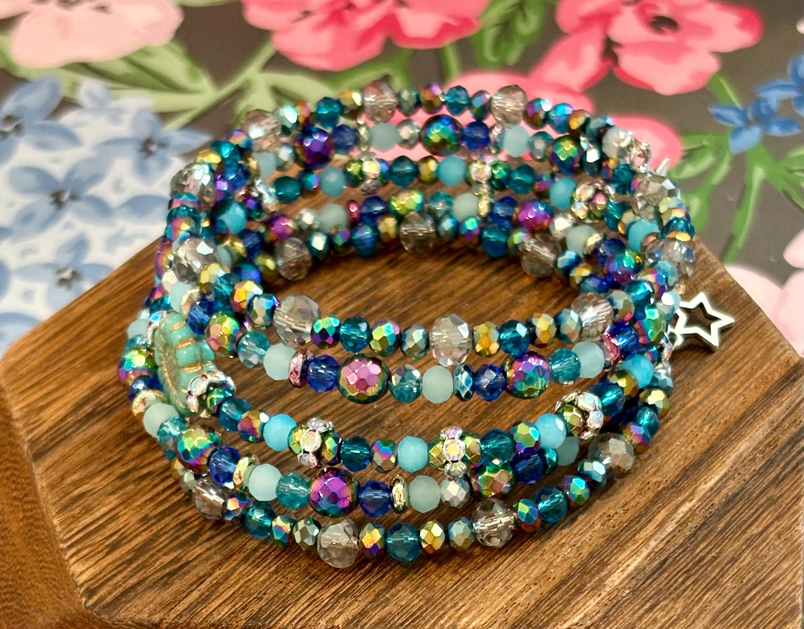 Step into a world of shimmering cosmic color with this Enchanted Galaxy Wrap Bracelet — a mystical blend of rainbow hematite gemstones, sparkling Czech glass, AB rhinestone spacers, and a soothing sunflower focal bead! Every coil glimmers with hues of teal, aqua, silver, pink, gold, gray, and iridescent rainbow, creating a wearable galaxy that wraps gently around your wrist.