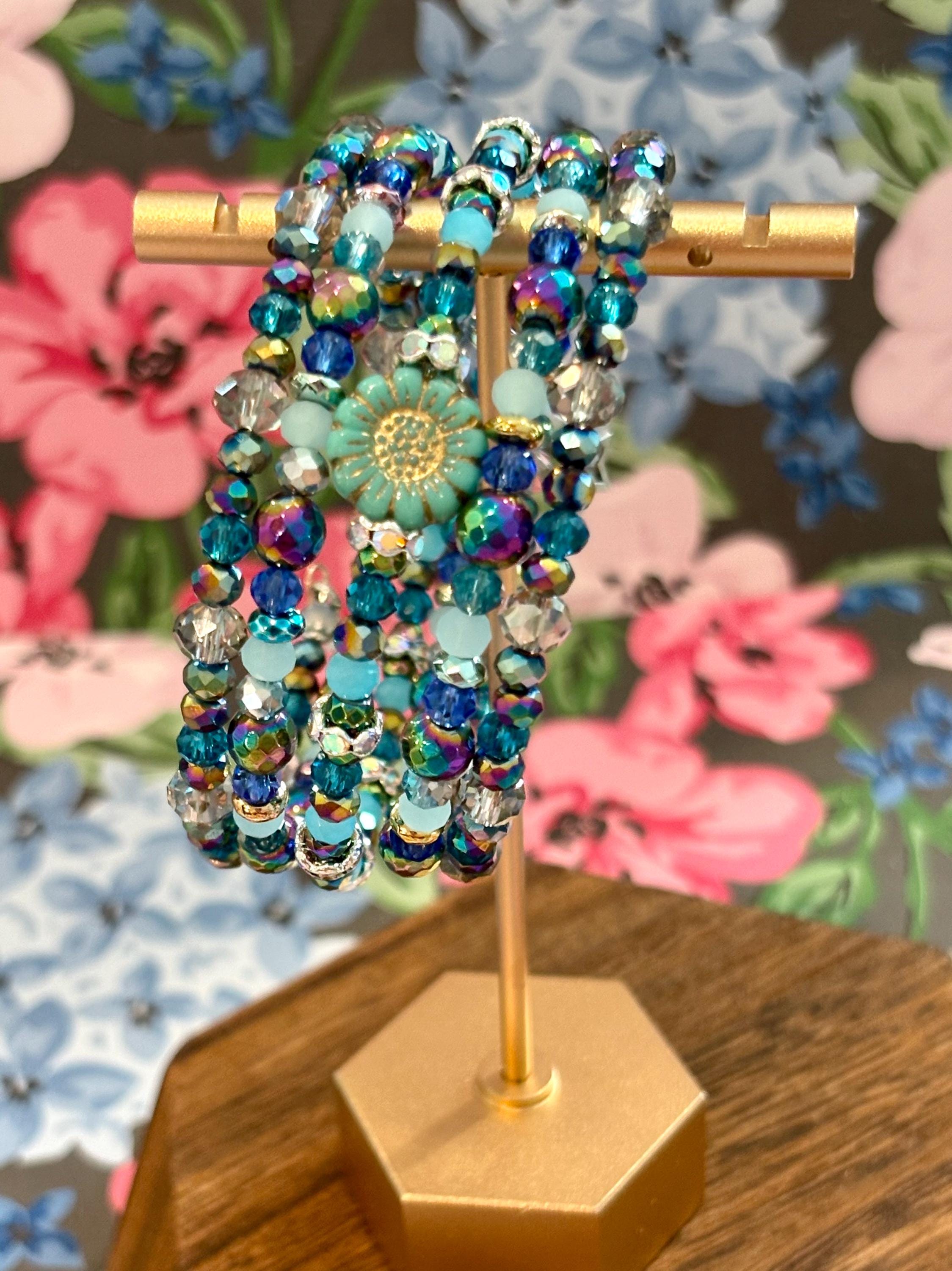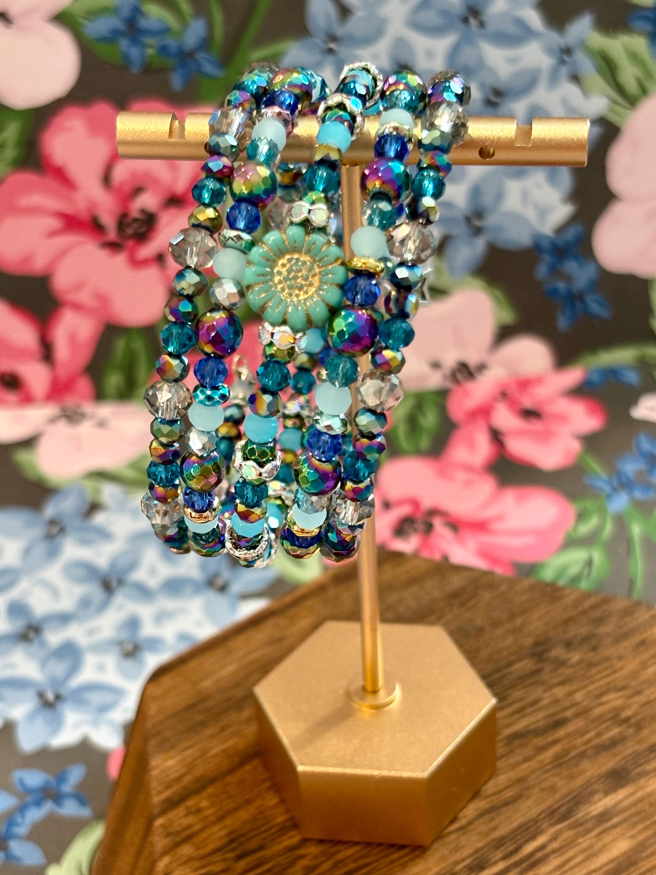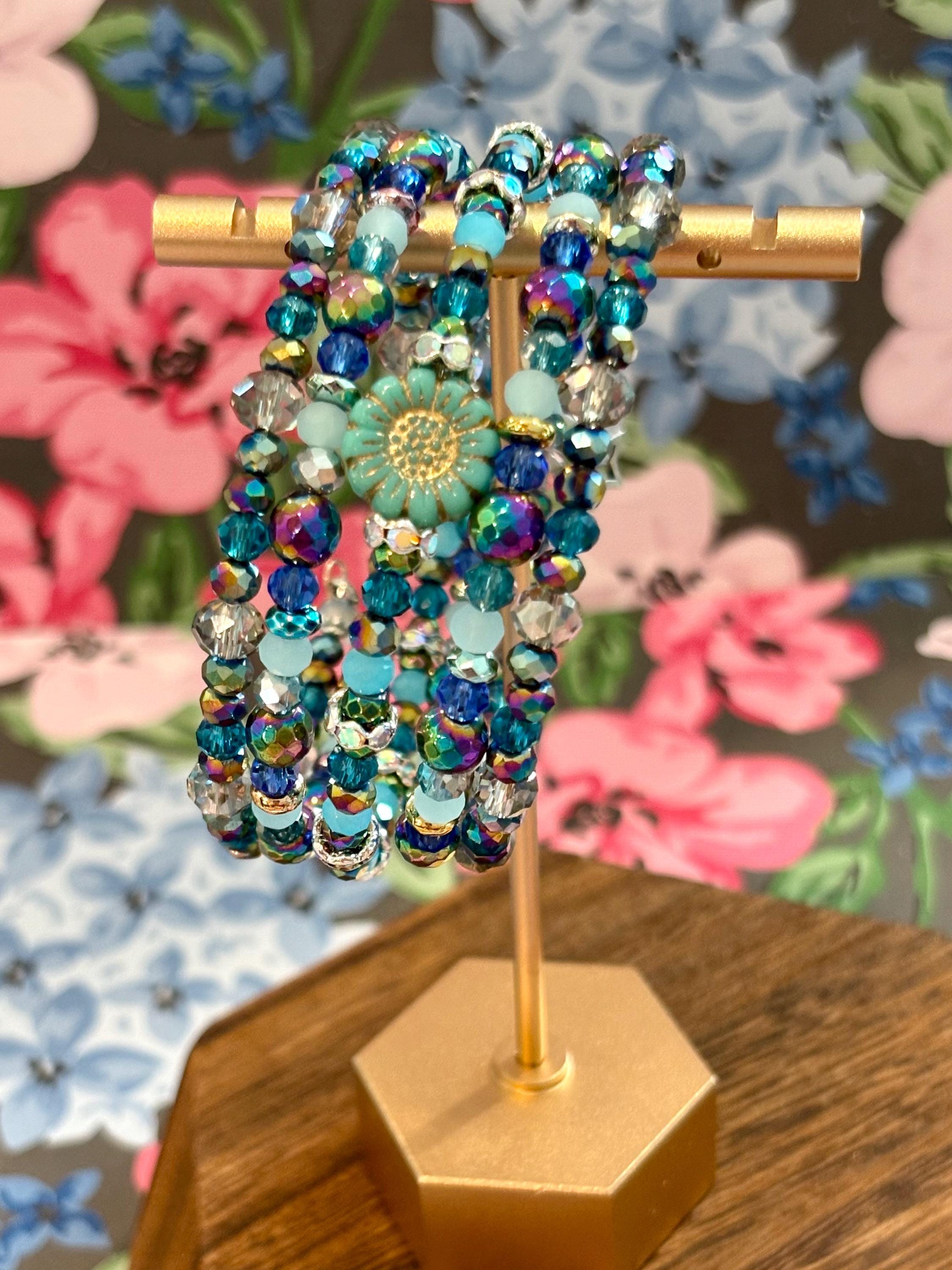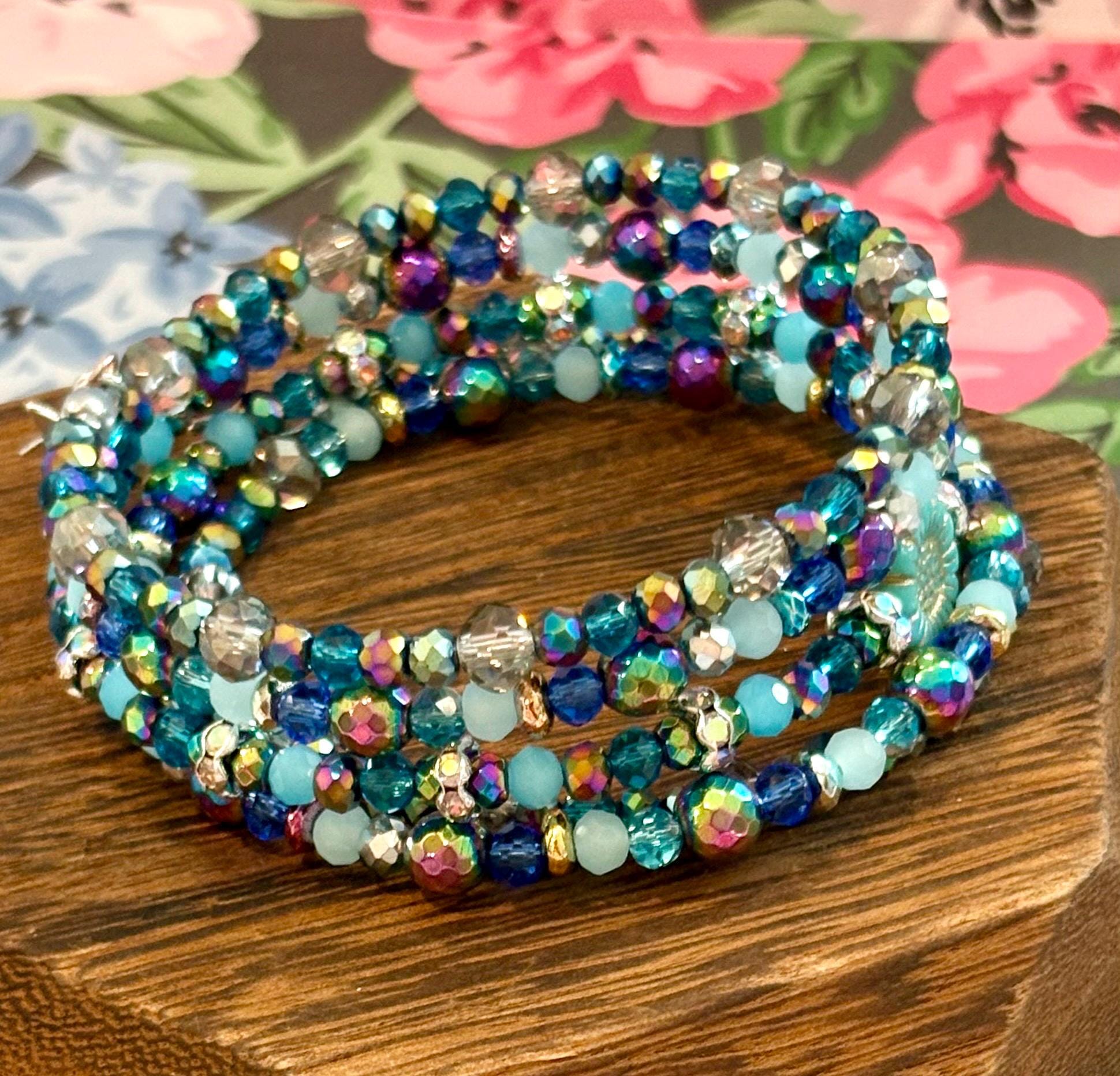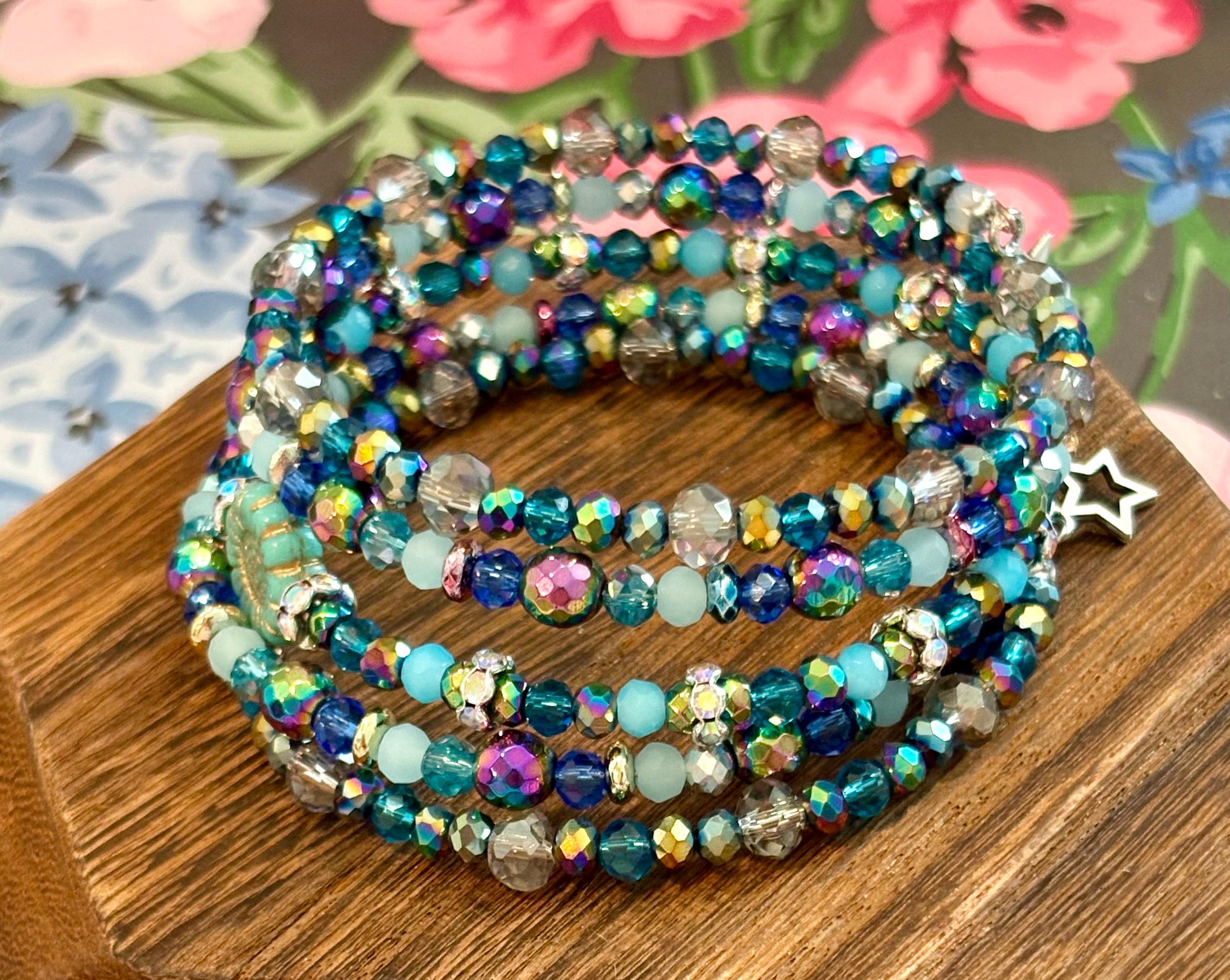 Step into a world of shimmering cosmic color with this Enchanted Galaxy Wrap Bracelet — a mystical blend of rainbow hematite gemstones, sparkling Czech glass, AB rhinestone spacers, and a soothing sunflower focal bead! Every coil glimmers with hues of teal, aqua, silver, pink, gold, gray, and iridescent rainbow, creating a wearable galaxy that wraps gently around your wrist.