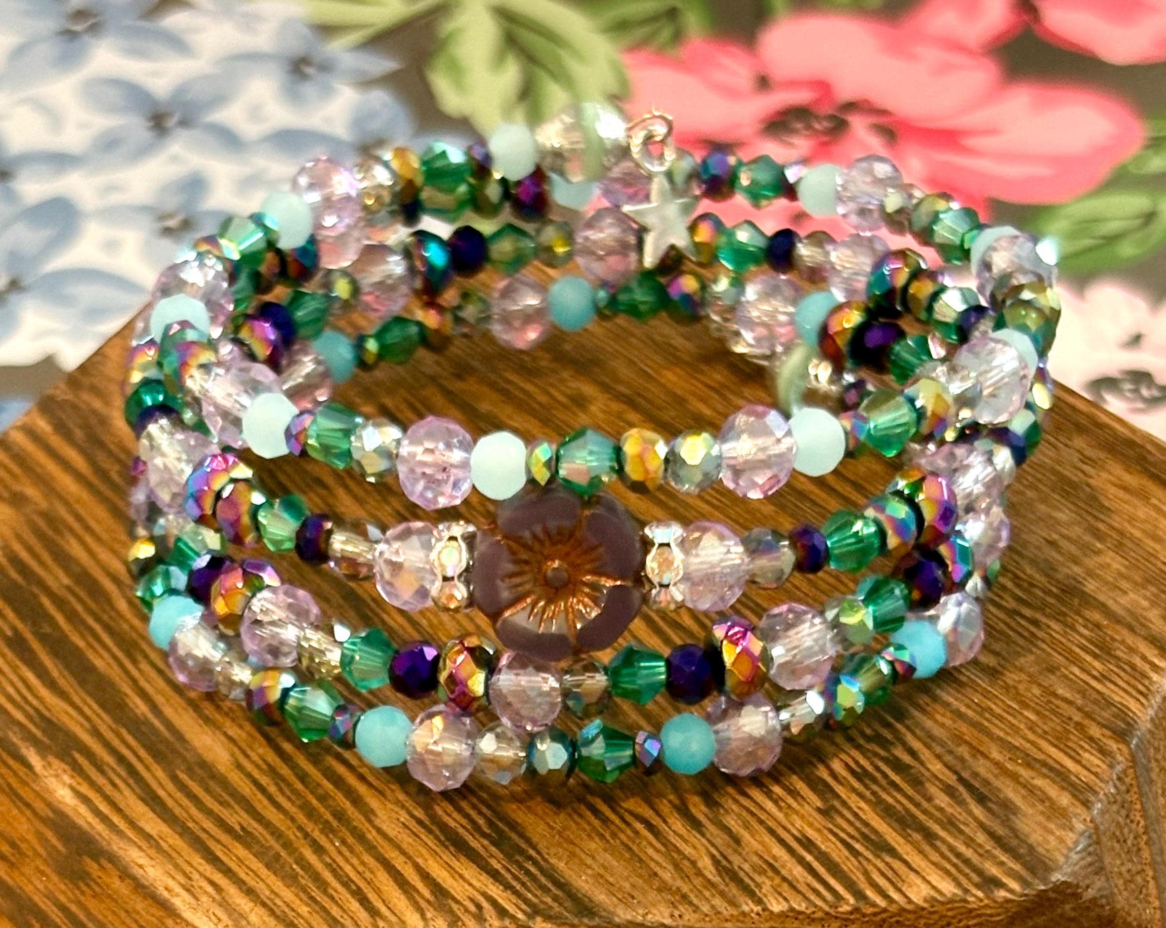 Enchanted Galaxy Gemstone Wrap Bracelet – Rainbow Hematite, Czech Glass Crystals, Purple Flower Bead, Silver Stars