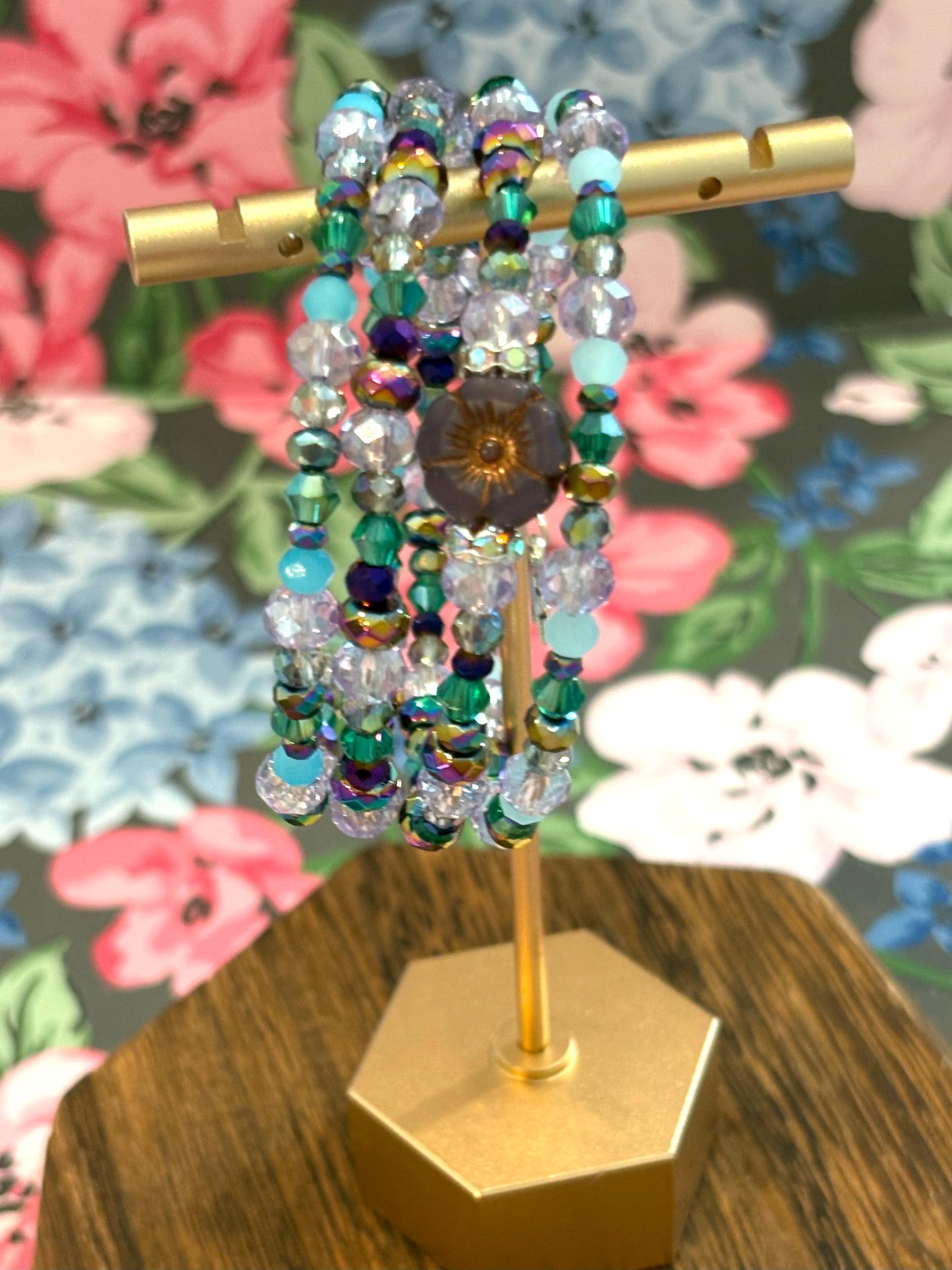 Featuring rainbow hematite, Czech glass faceted crystals, AB rhinestone spacers, dreamy lavender and blue crystals, and a gorgeous Czech glass purple flower bead with copper wash, this piece captures the colors of stardust swirling through a twilight sky. Two tiny silver star charms add the perfect celestial touch.