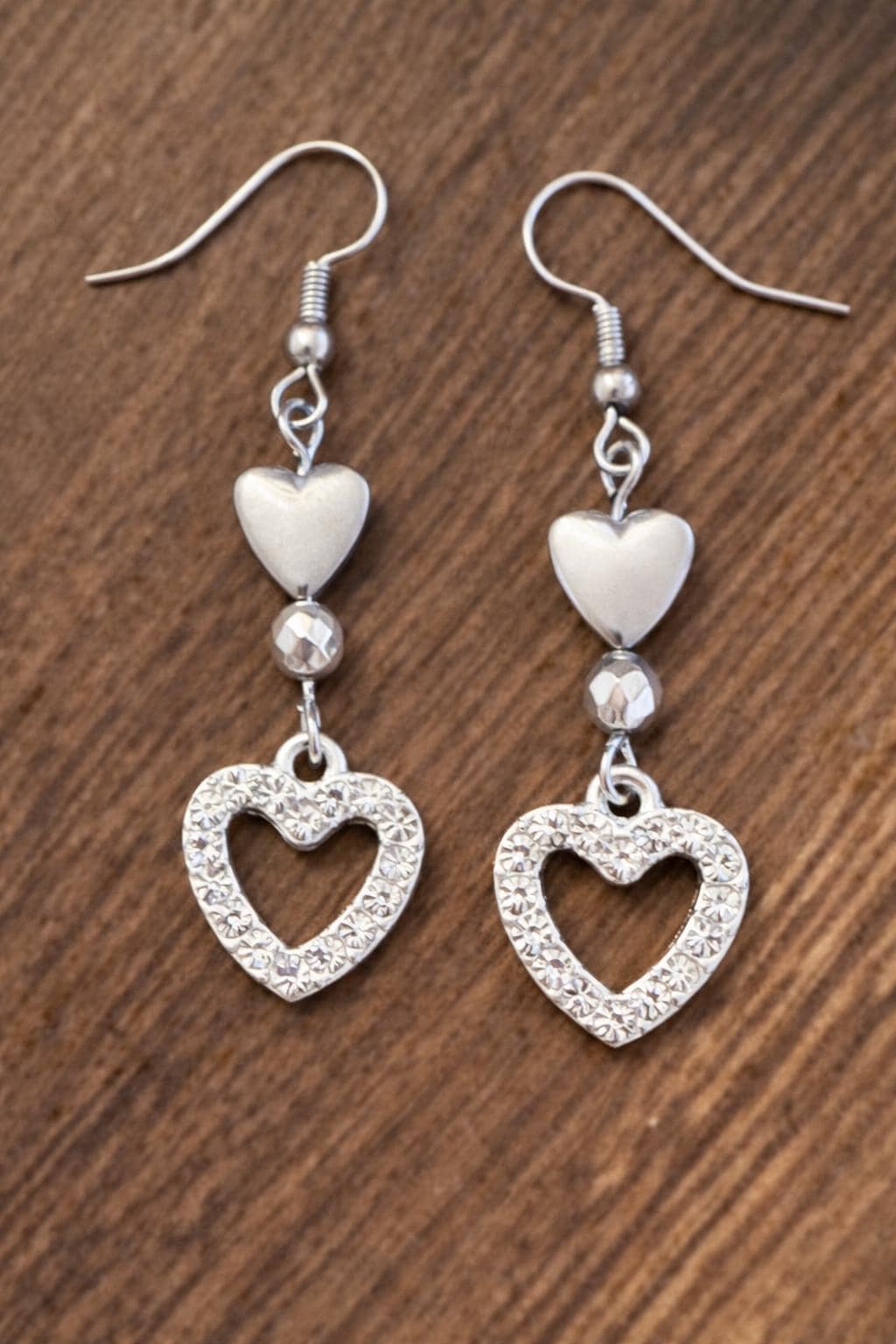 • Silver-tone rhinestone heart charms