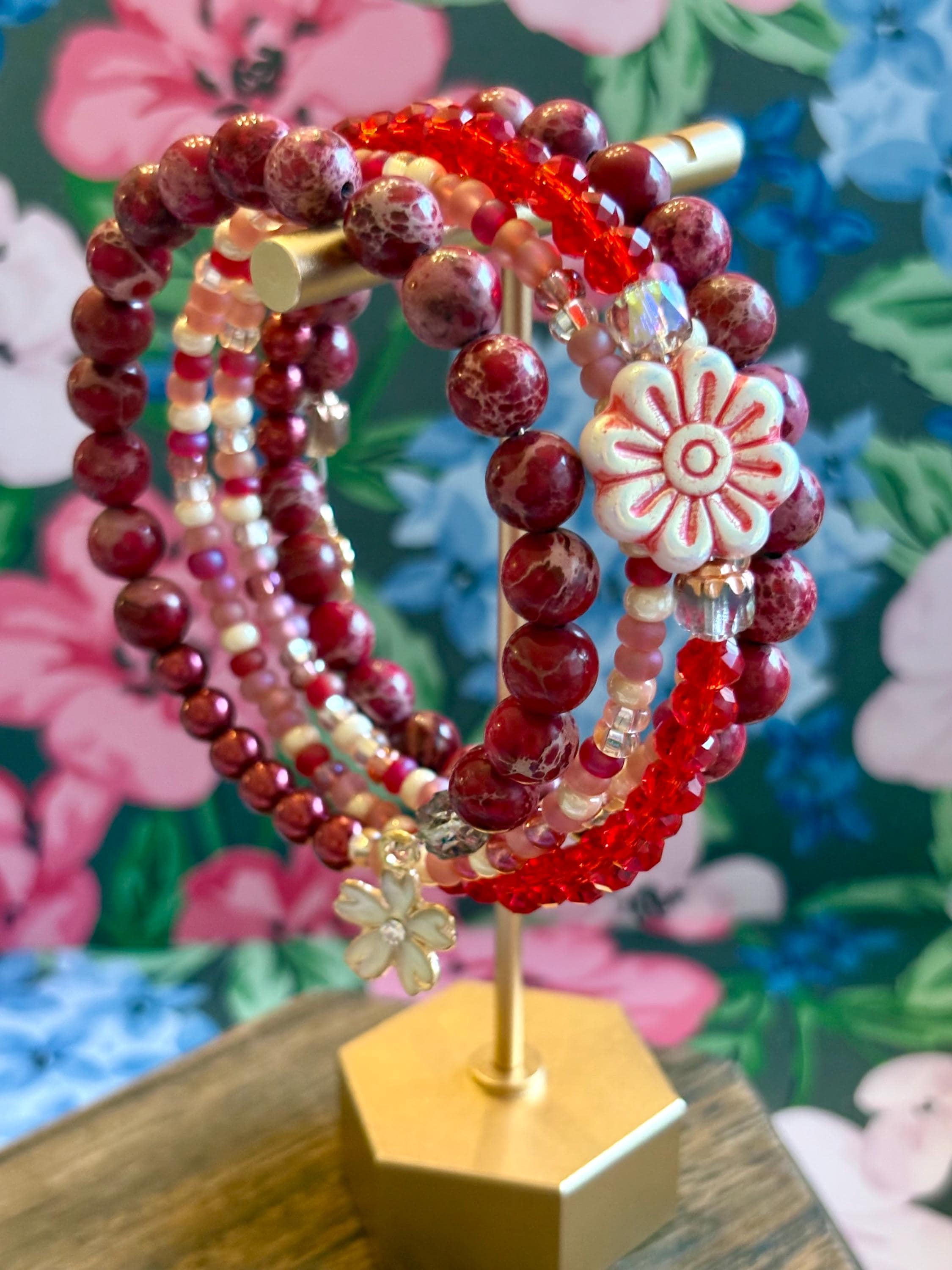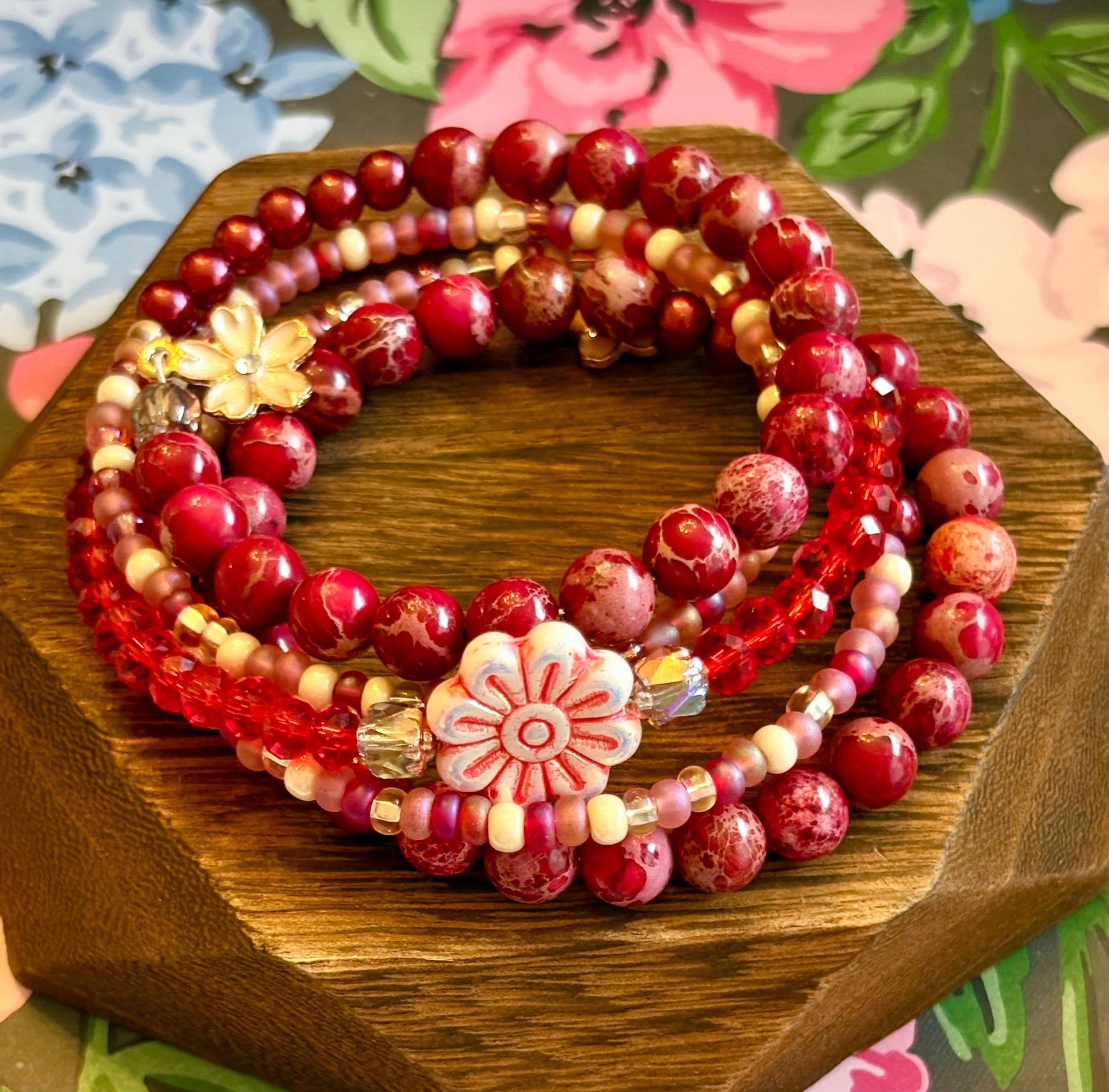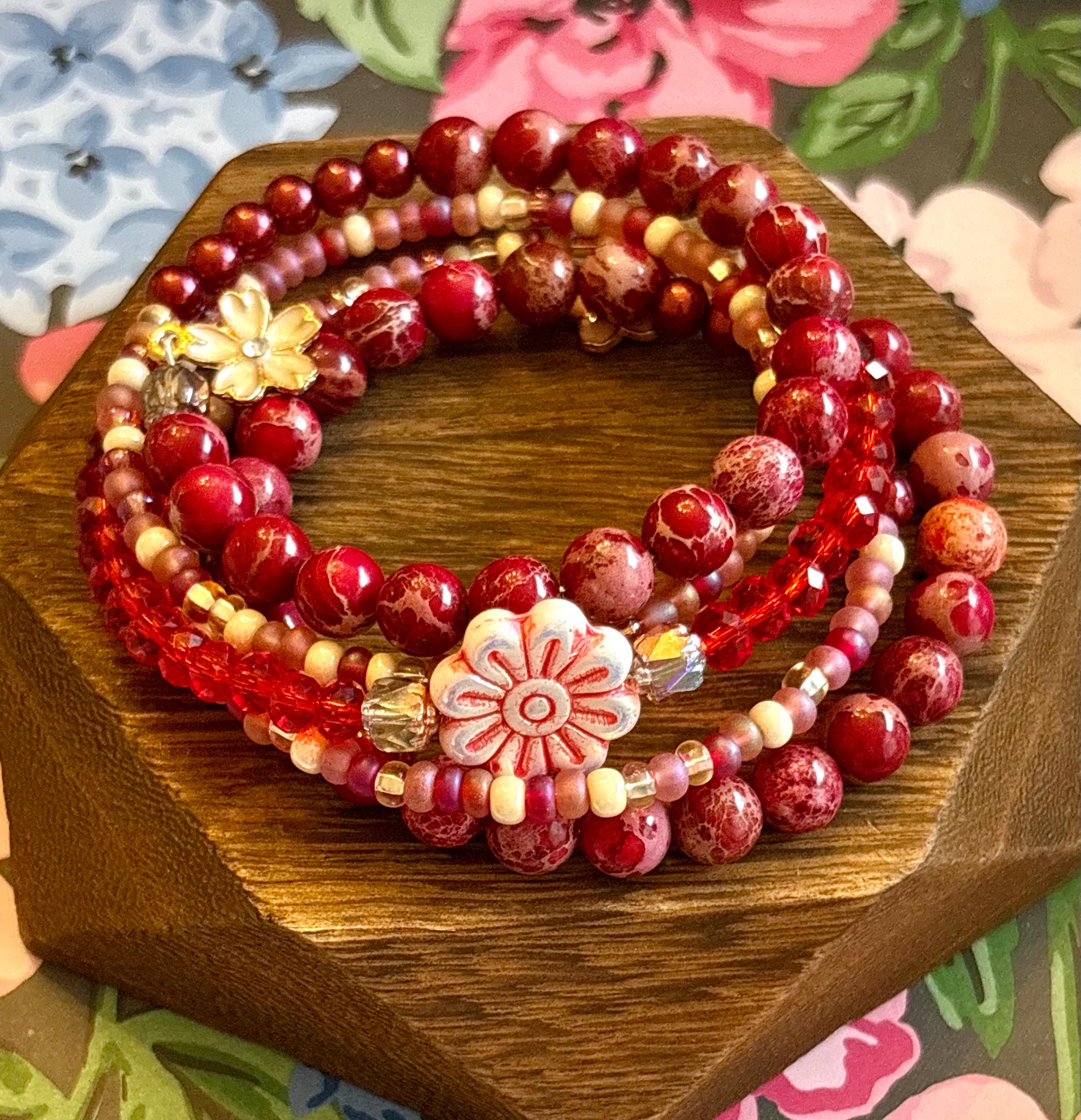Raspberry Cheesecake Daisy Coil Wrap Bracelet – Sea Sediment Jasper, Czech Glass Flowers, Red Crystal Gemstone Bracelet