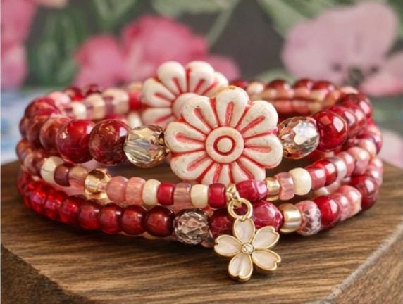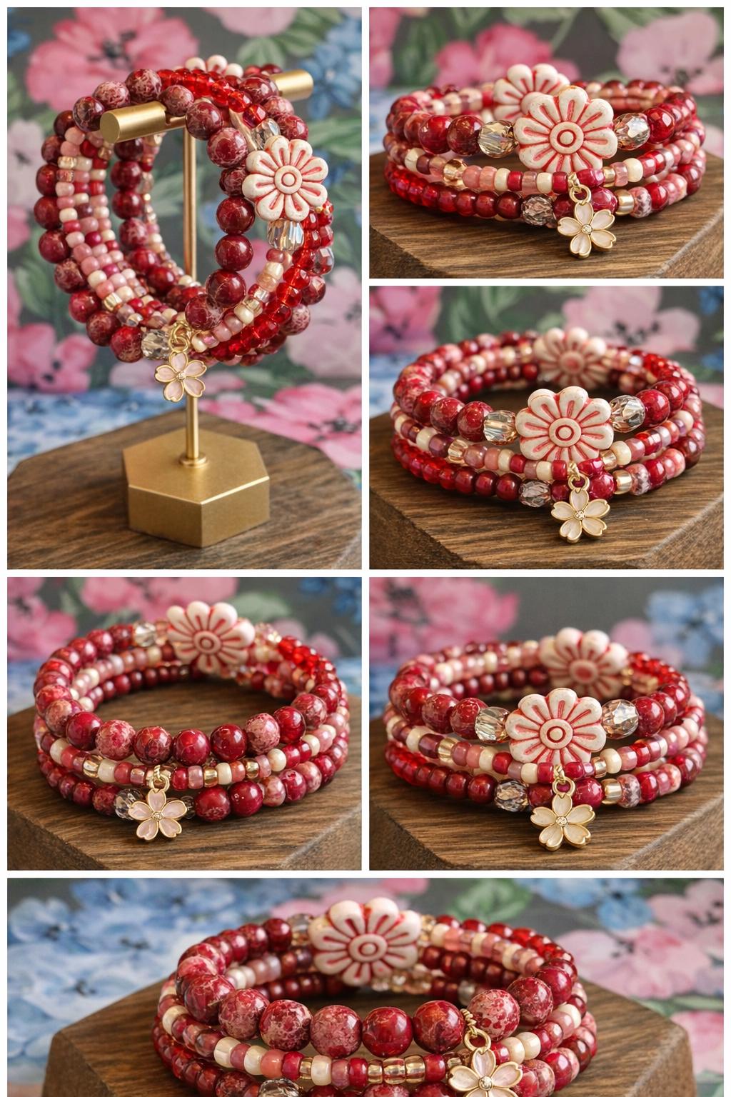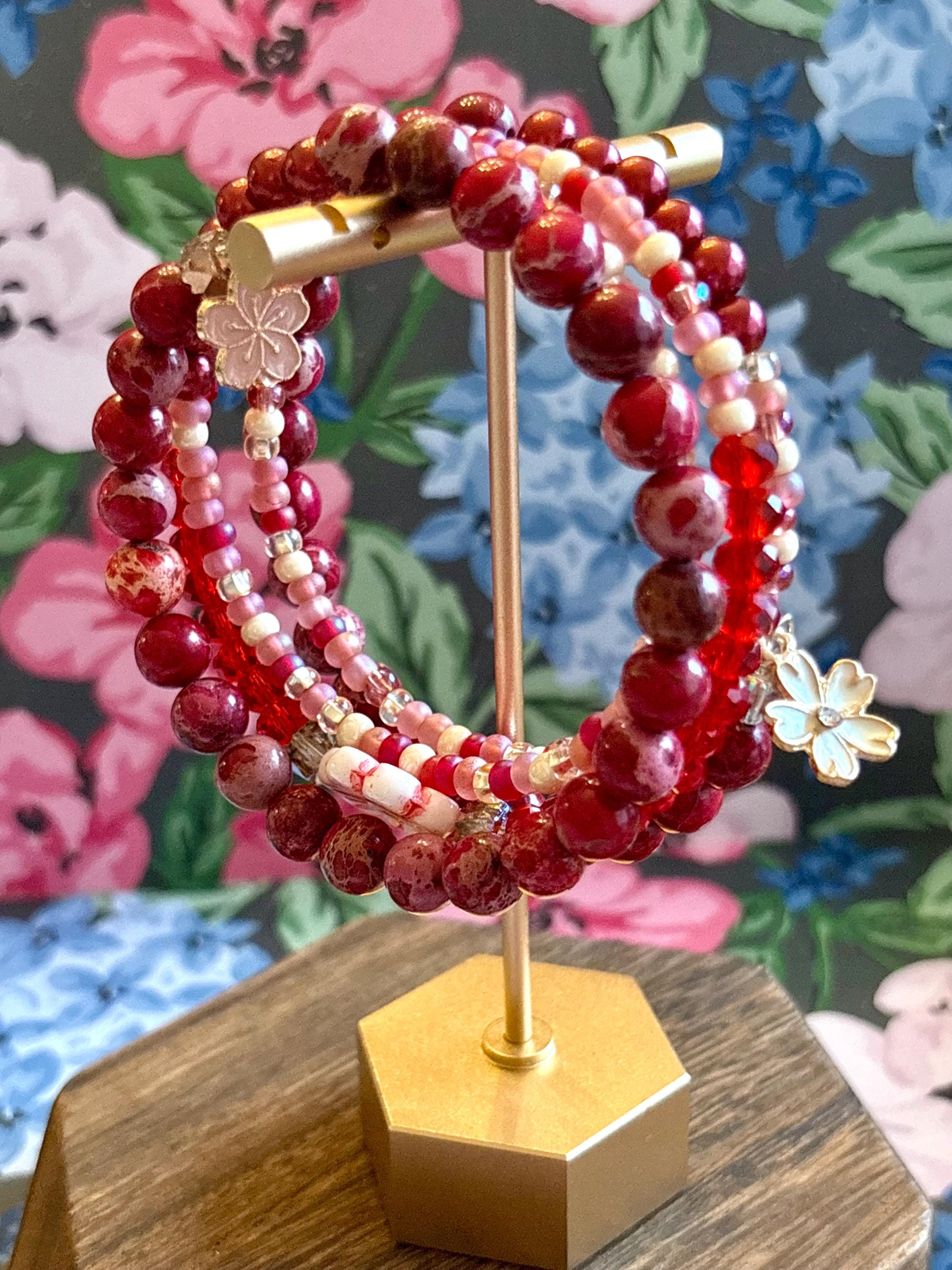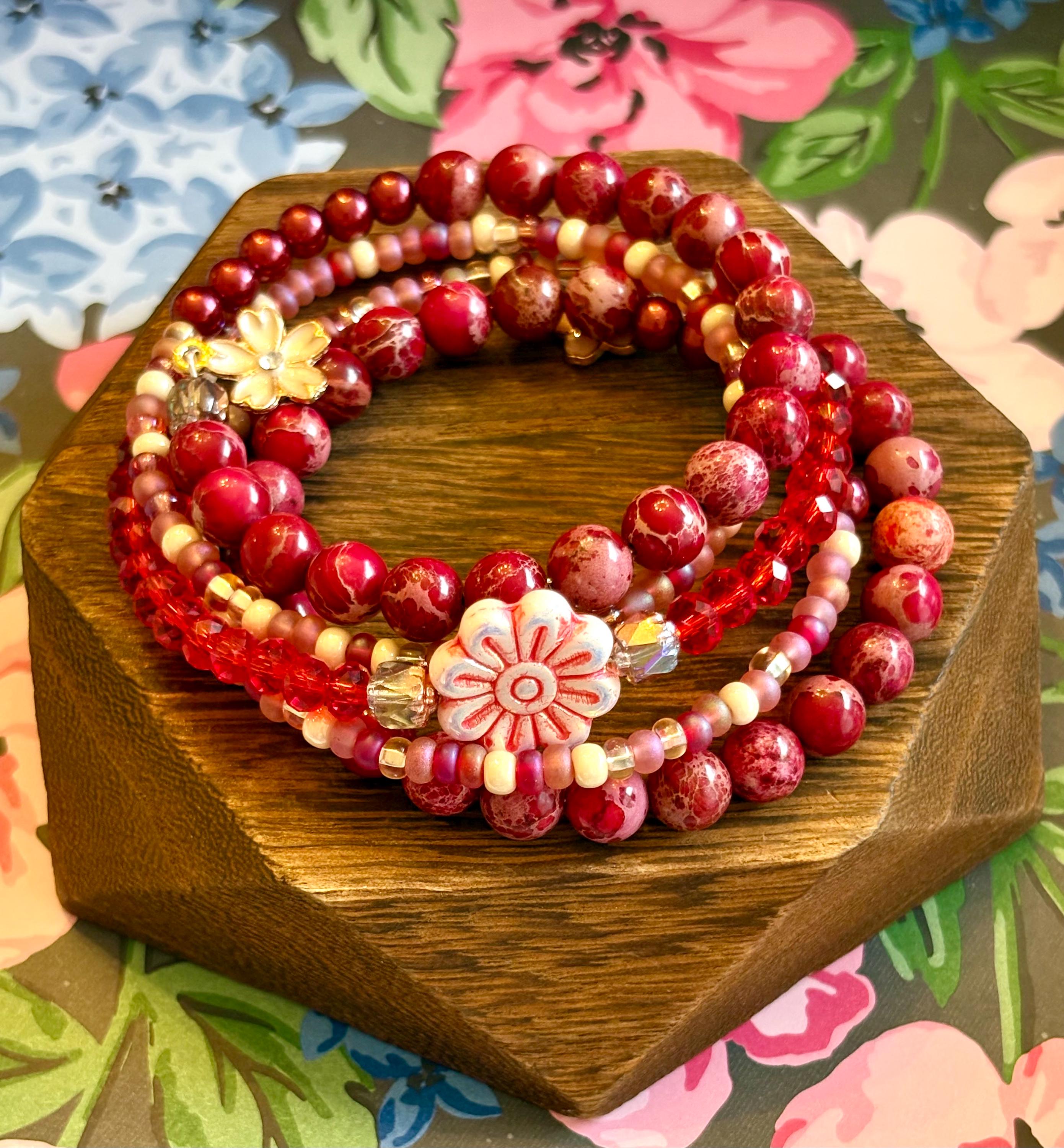 Raspberry Cheesecake Daisy Coil Wrap Bracelet – Sea Sediment Jasper, Czech Glass Flowers, Red Crystal Gemstone Bracelet