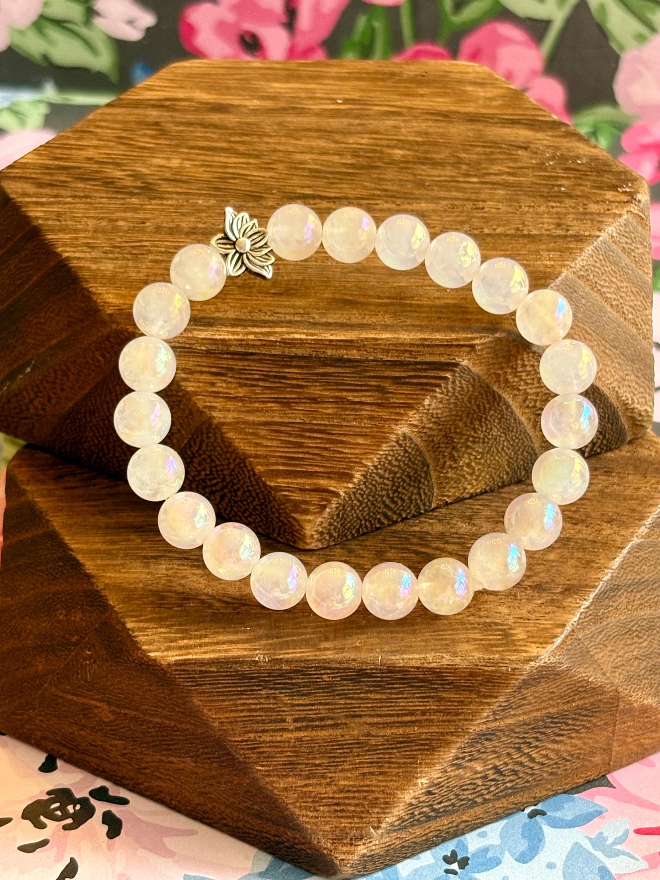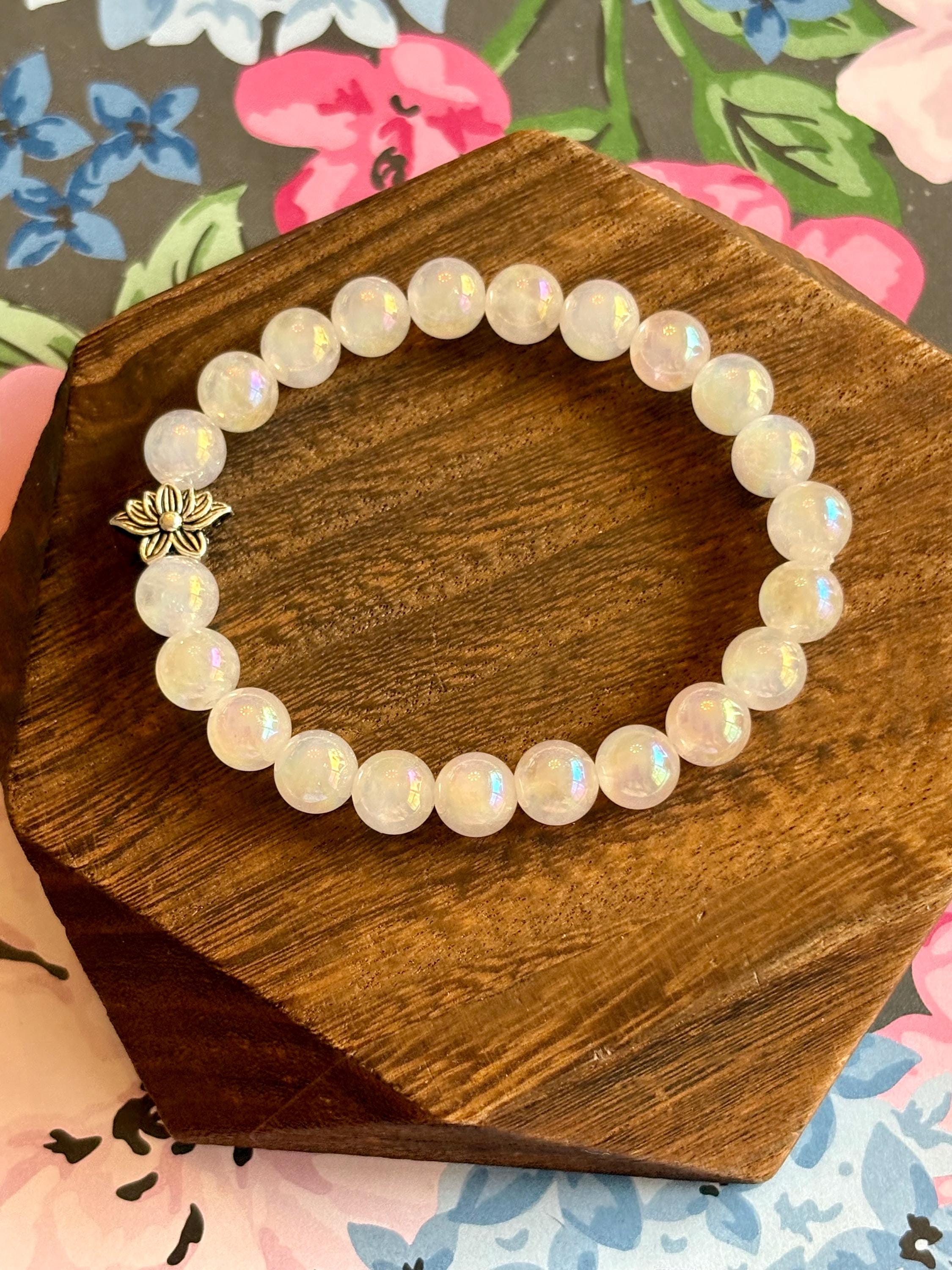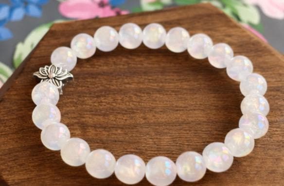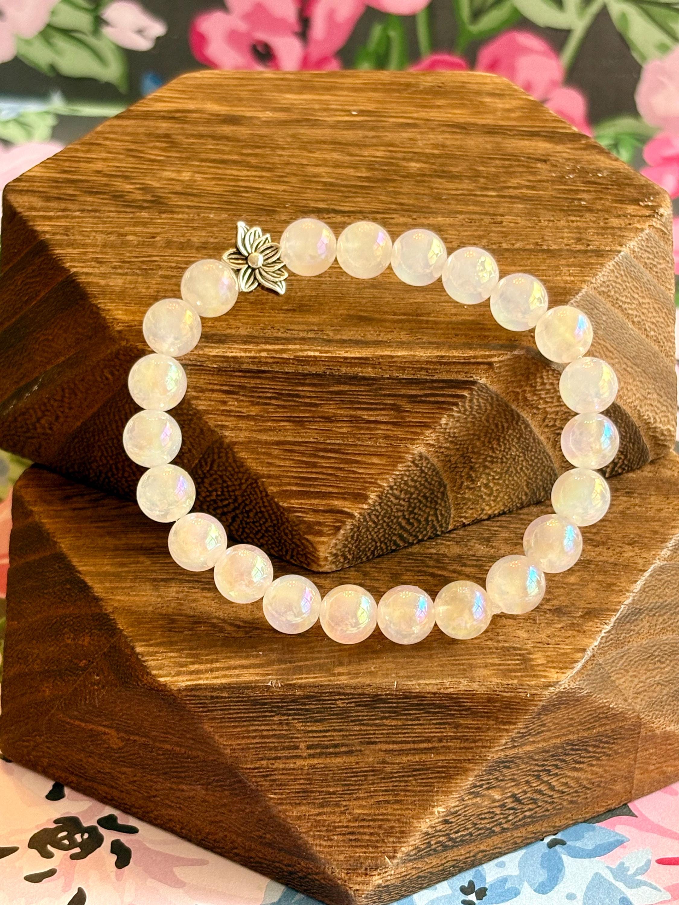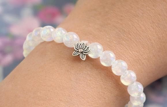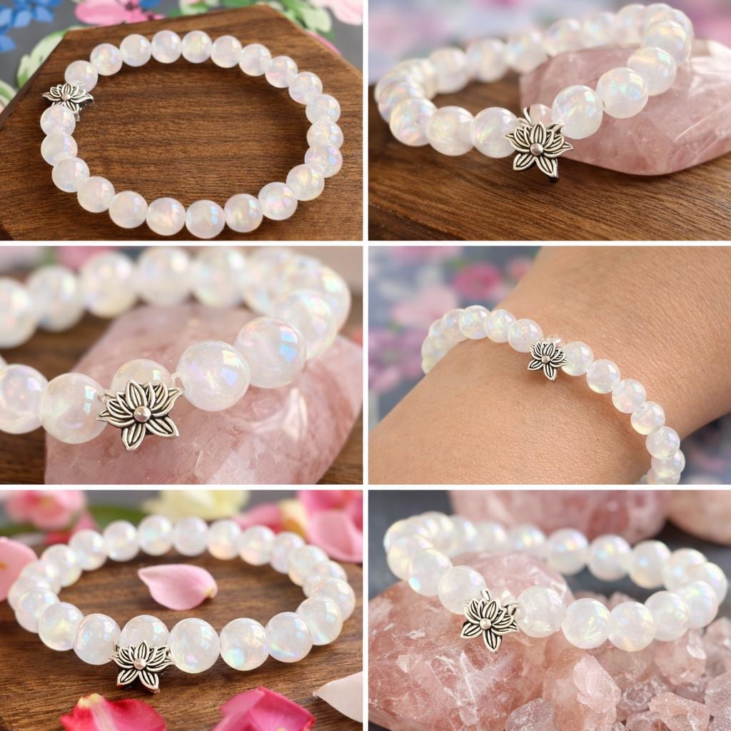 The Lotus Light Mystic Rose Bracelet is handcrafted with iridescent mystic rose quartz beads that glow with subtle rainbow flashes, symbolizing love, renewal, and inner peace! At the heart of the bracelet rests a beautiful silver-tone lotus flower bead, representing rebirth, spiritual growth, and rising through life with grace.
