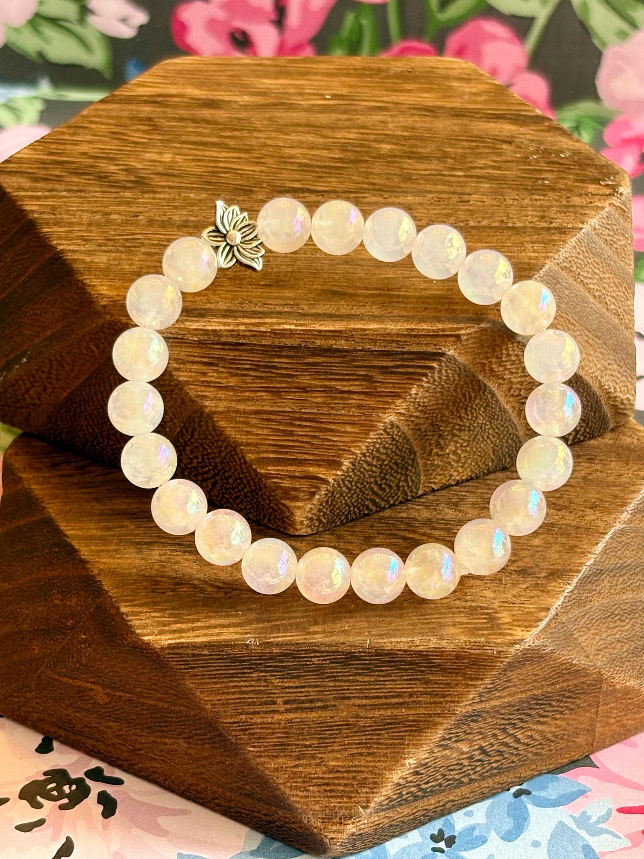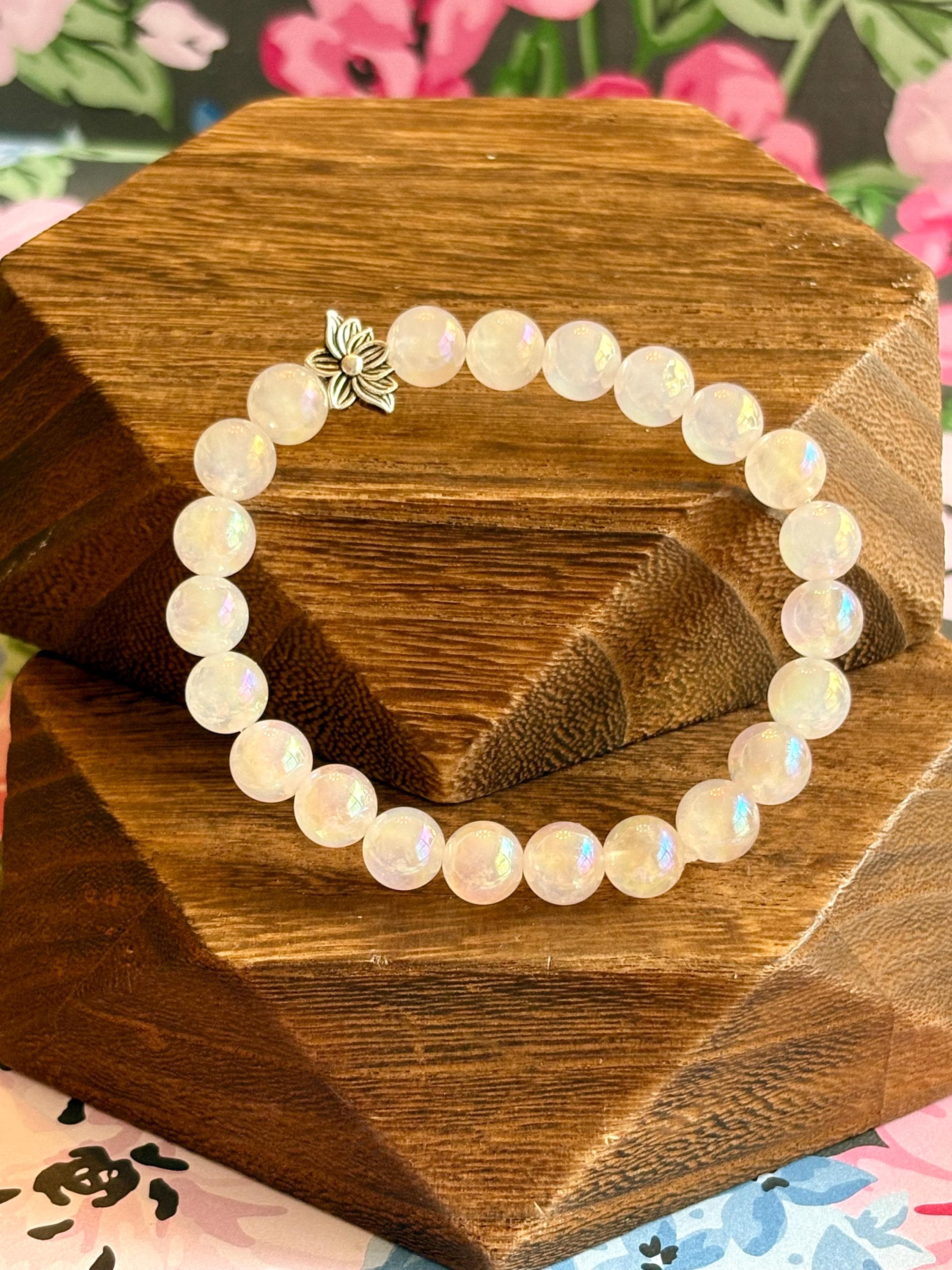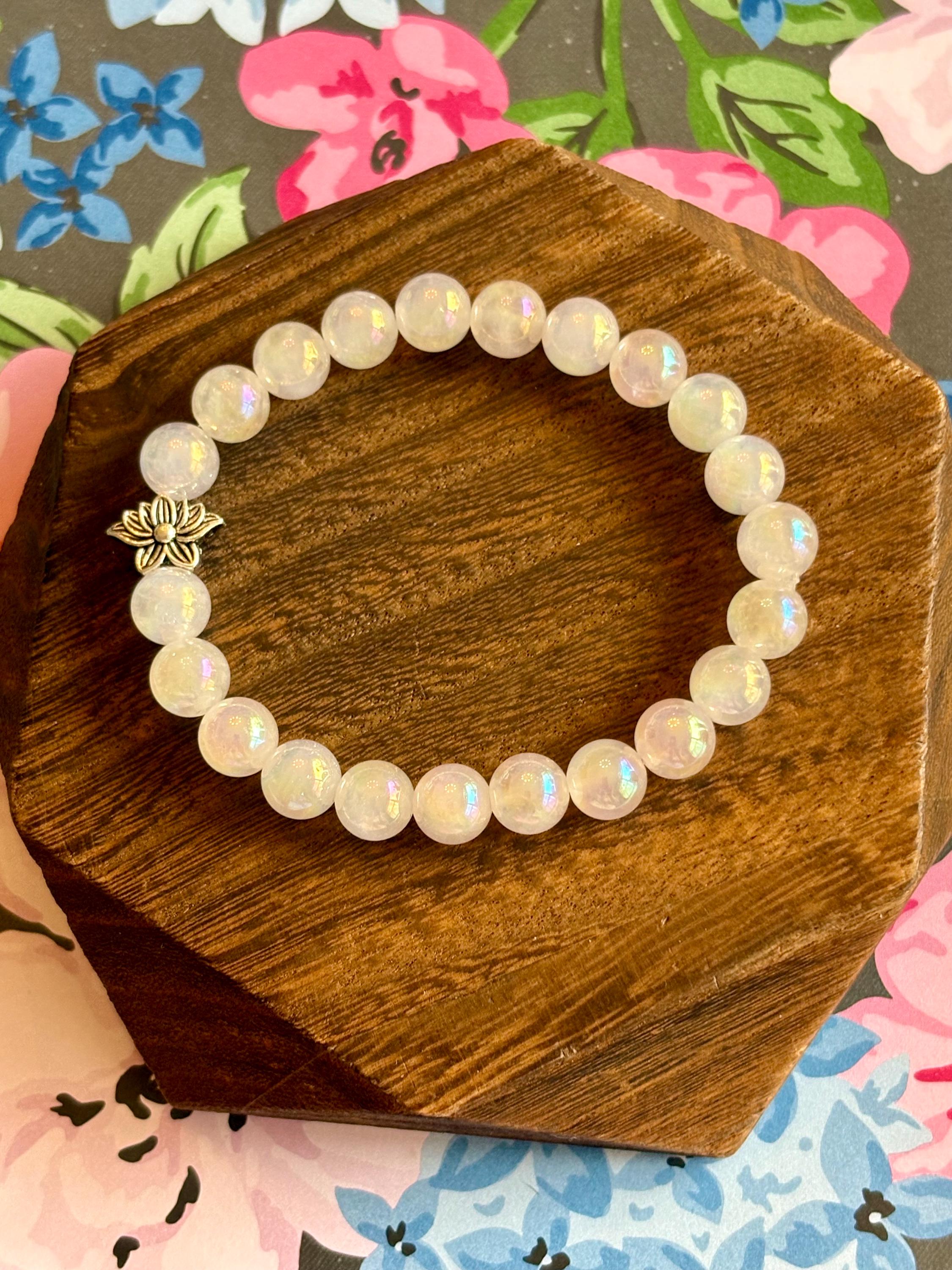 The Lotus Light Mystic Rose Bracelet is handcrafted with iridescent mystic rose quartz beads that glow with subtle rainbow flashes, symbolizing love, renewal, and inner peace! At the heart of the bracelet rests a beautiful silver-tone lotus flower bead, representing rebirth, spiritual growth, and rising through life with grace.