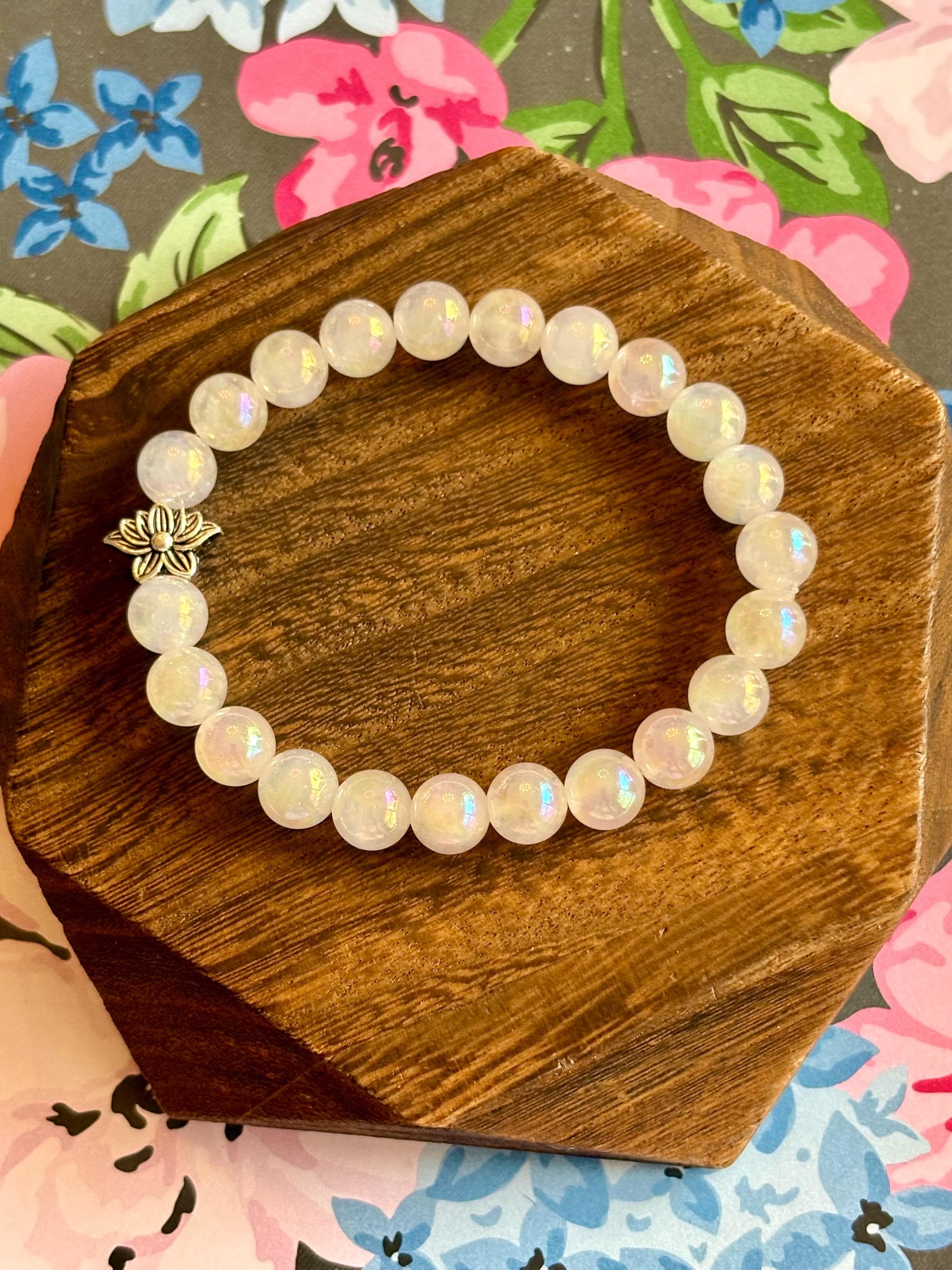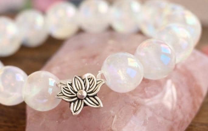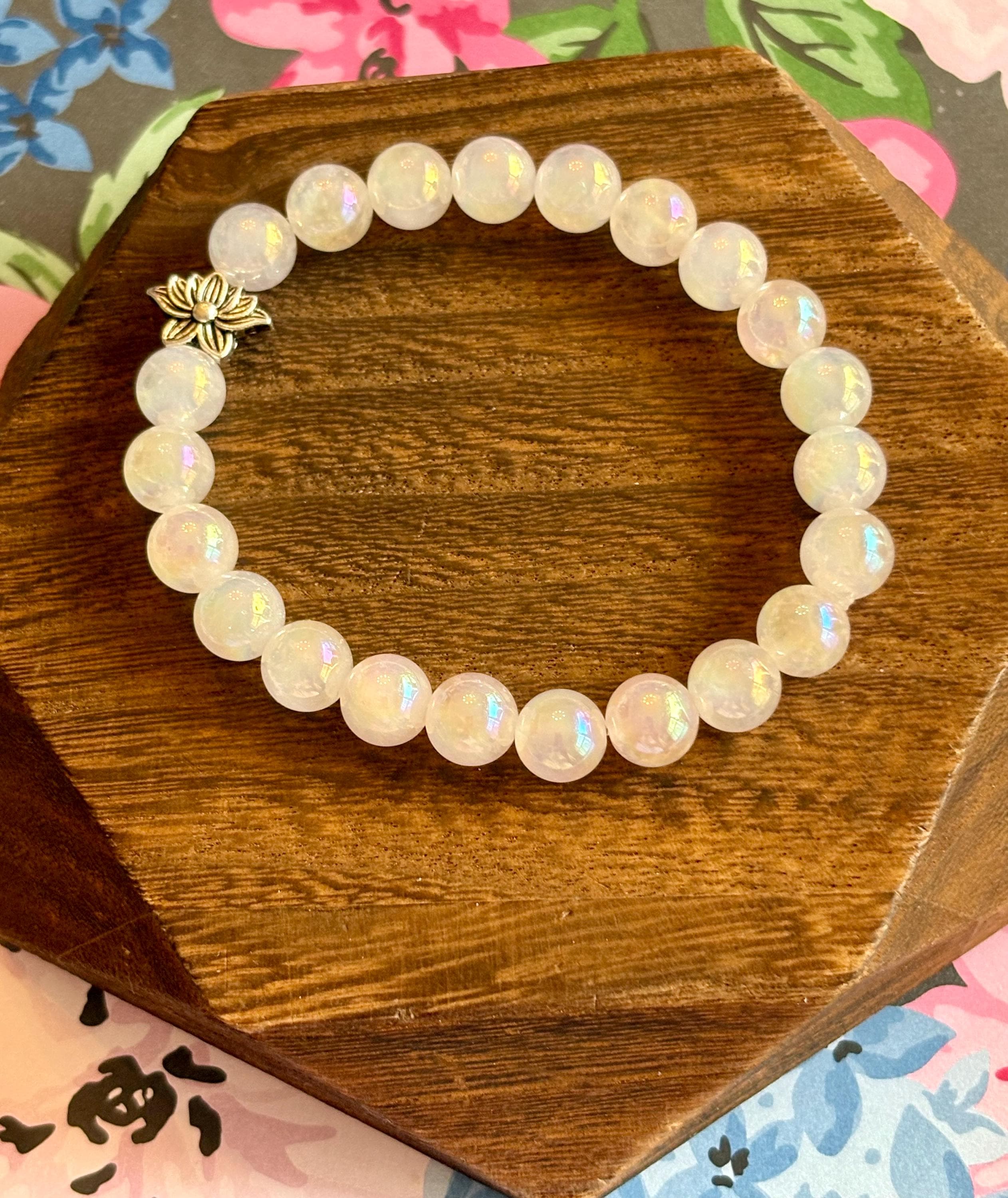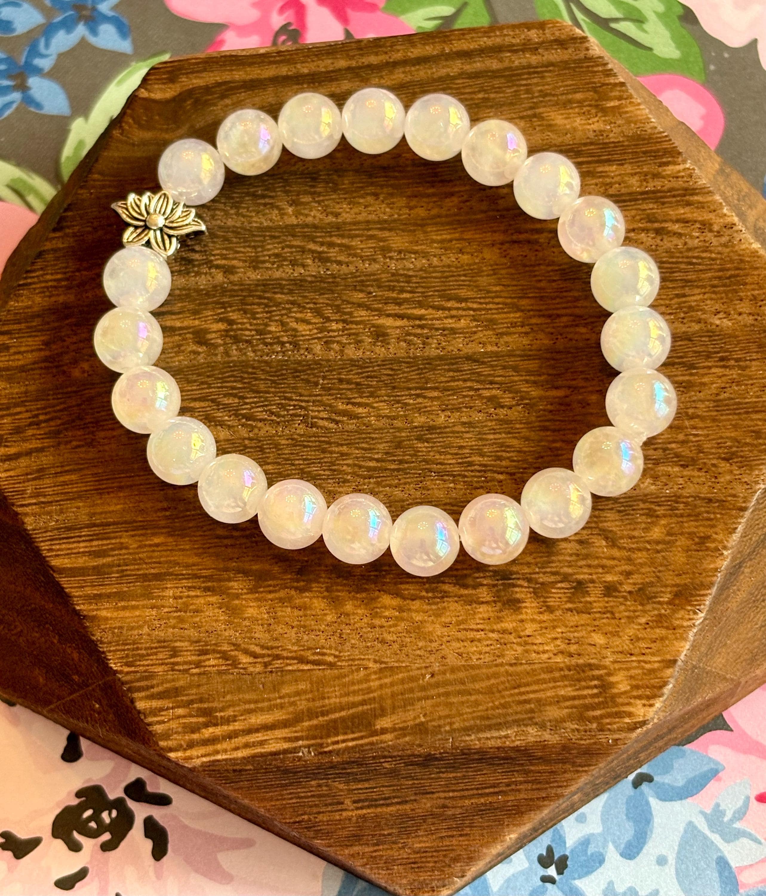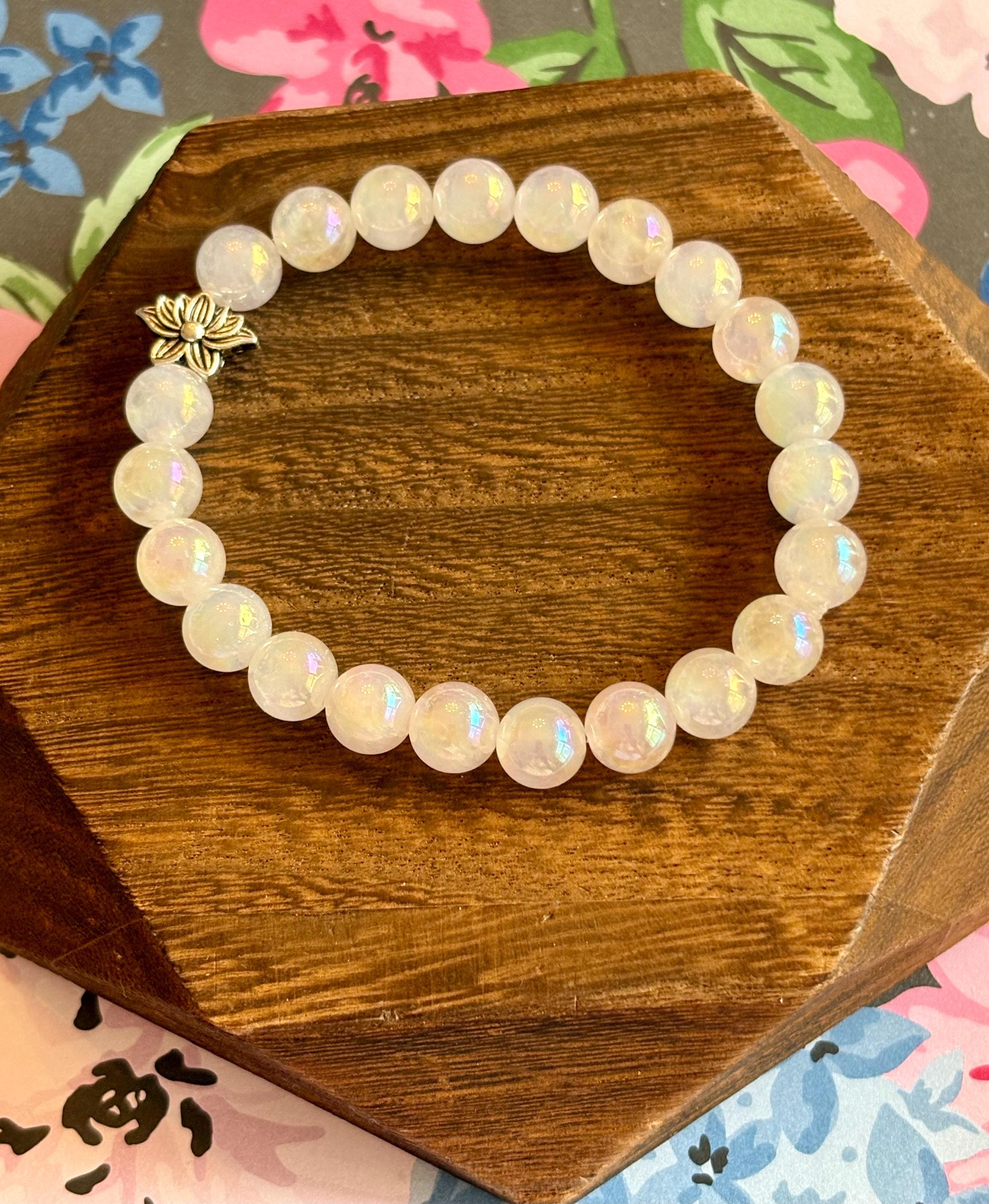 The Lotus Light Mystic Rose Bracelet is handcrafted with iridescent mystic rose quartz beads that glow with subtle rainbow flashes, symbolizing love, renewal, and inner peace! At the heart of the bracelet rests a beautiful silver-tone lotus flower bead, representing rebirth, spiritual growth, and rising through life with grace.