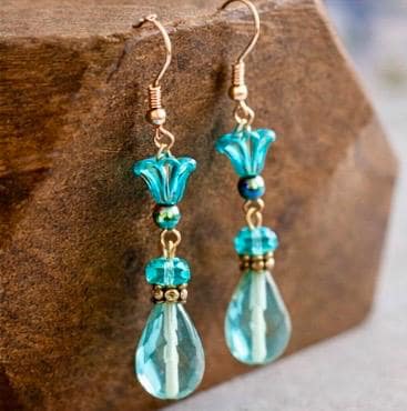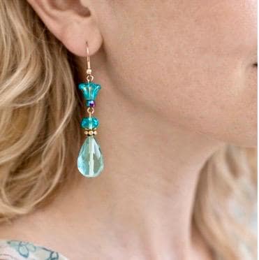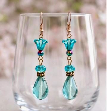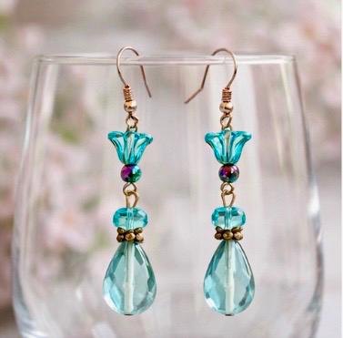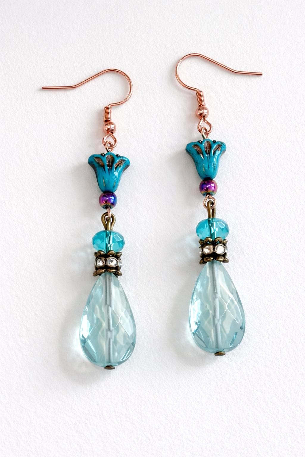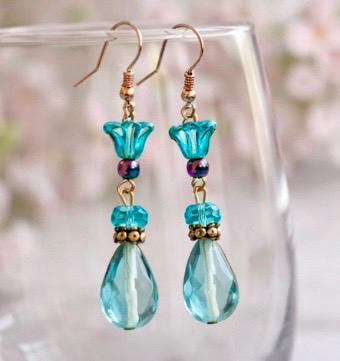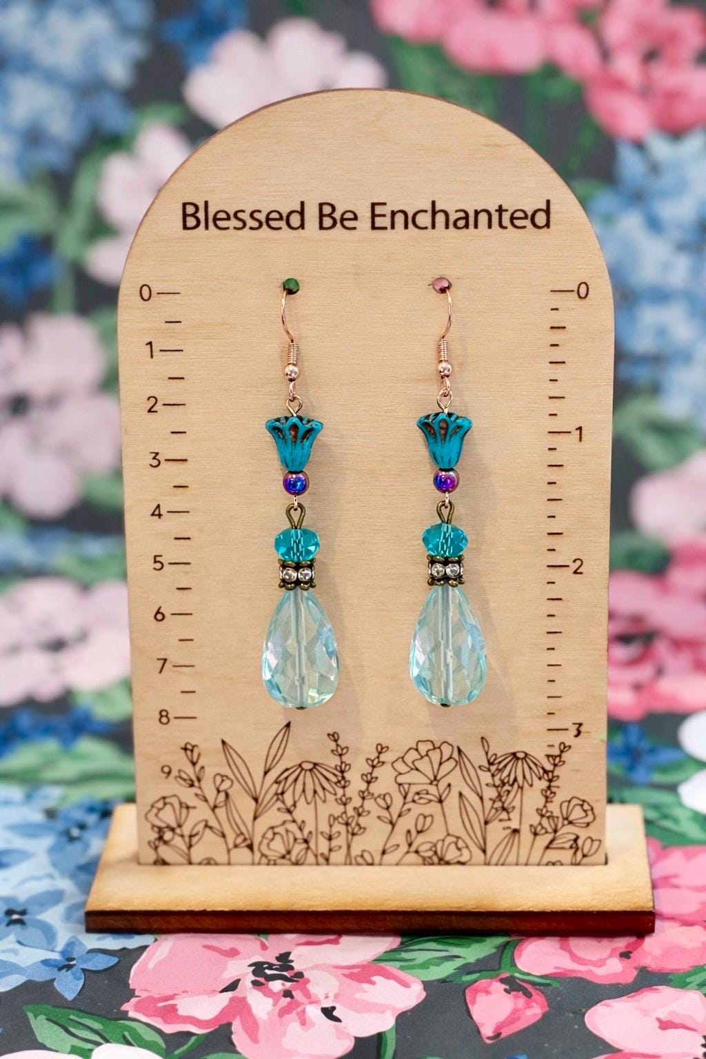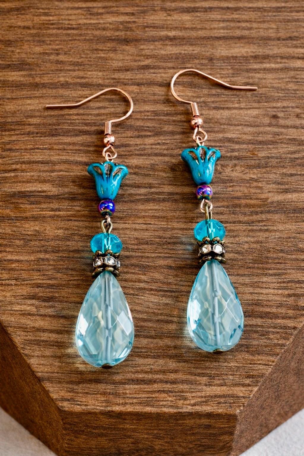Delicate Czech glass flowers bloom at the top, flowing into shimmering rainbow hematite and faceted aquamarine-toned crystal teardrops that catch the light with every movement. Elegant filigree and crystal rhinestone spacers add a vintage-inspired, artisan finish.