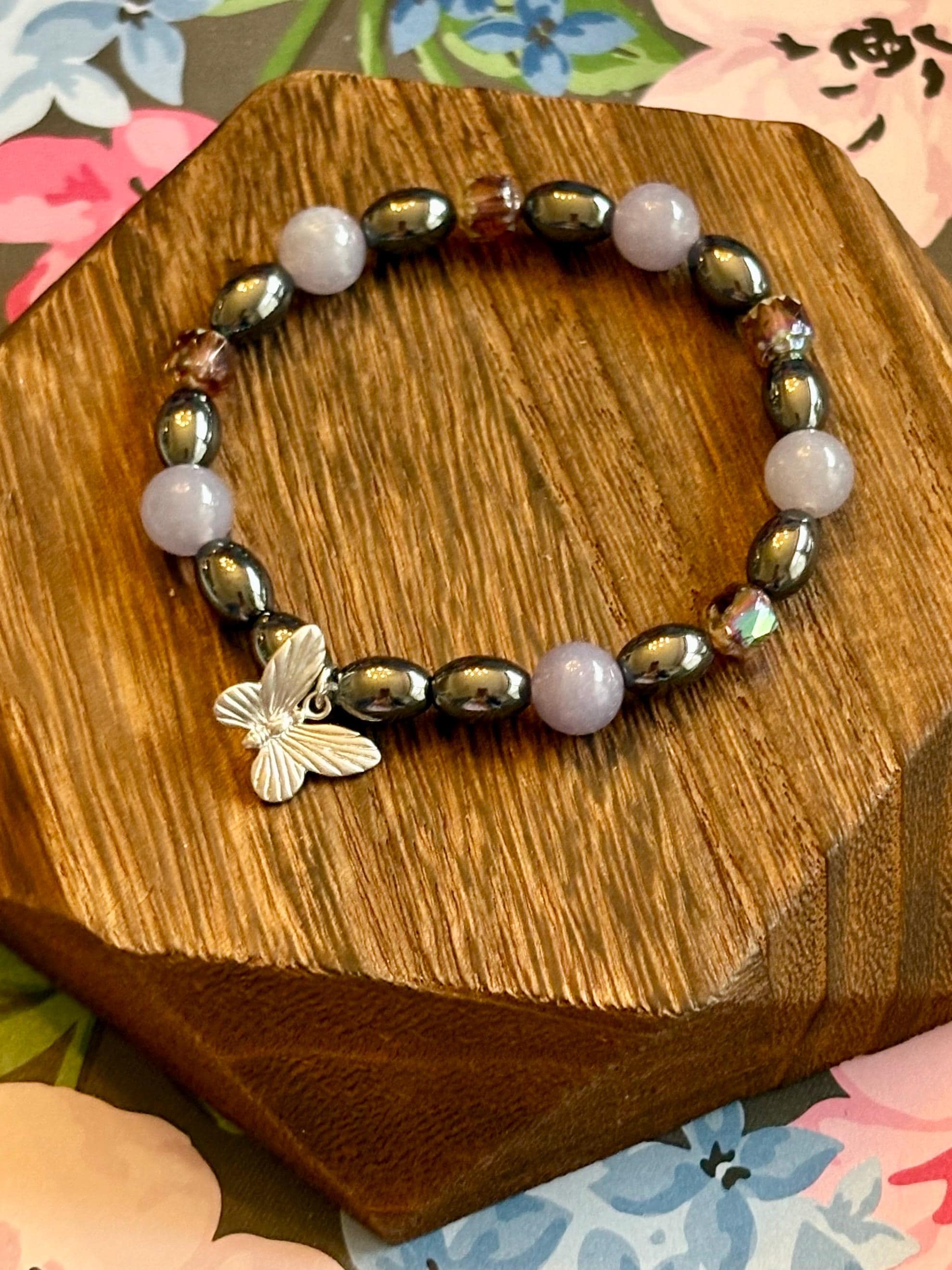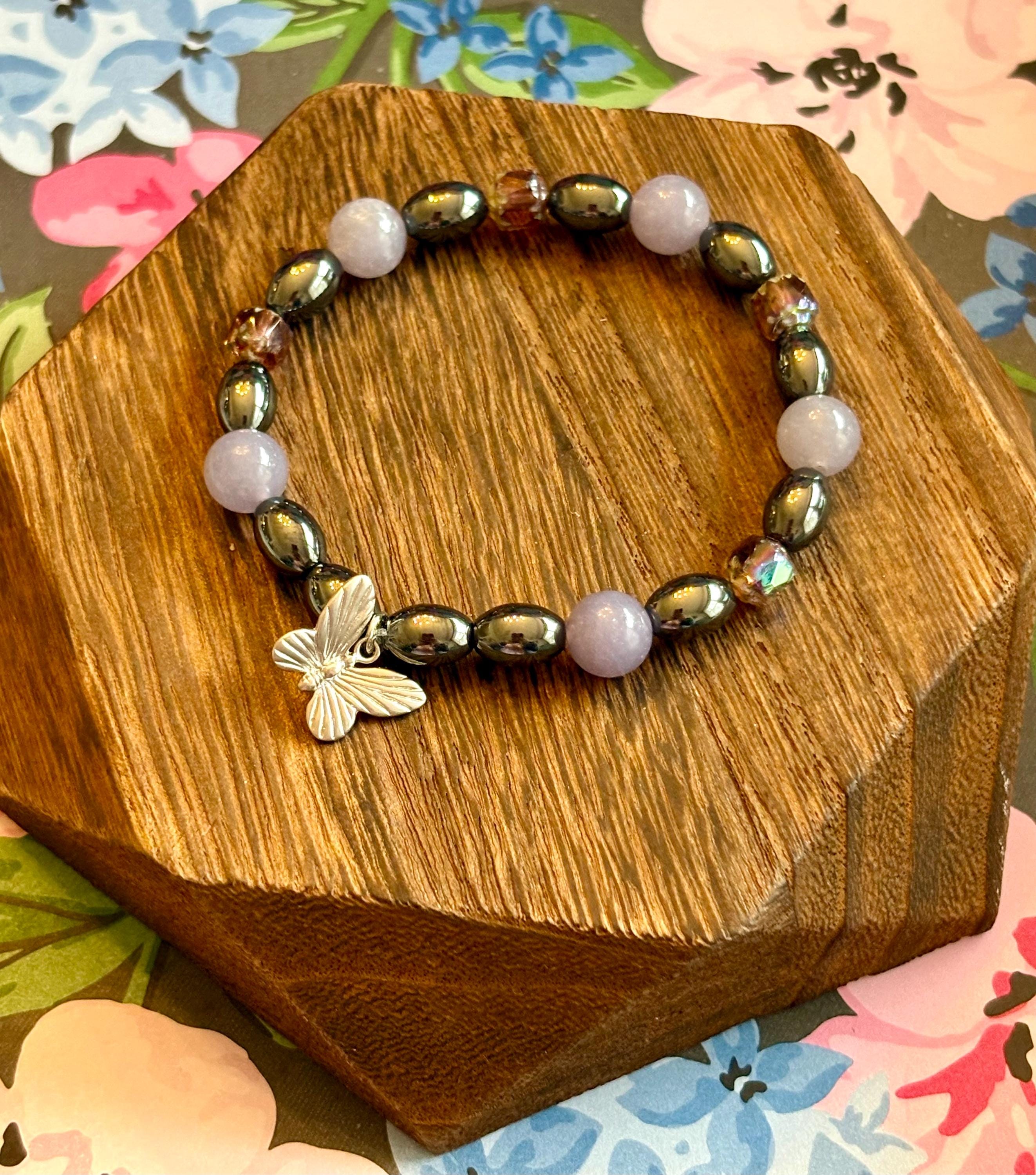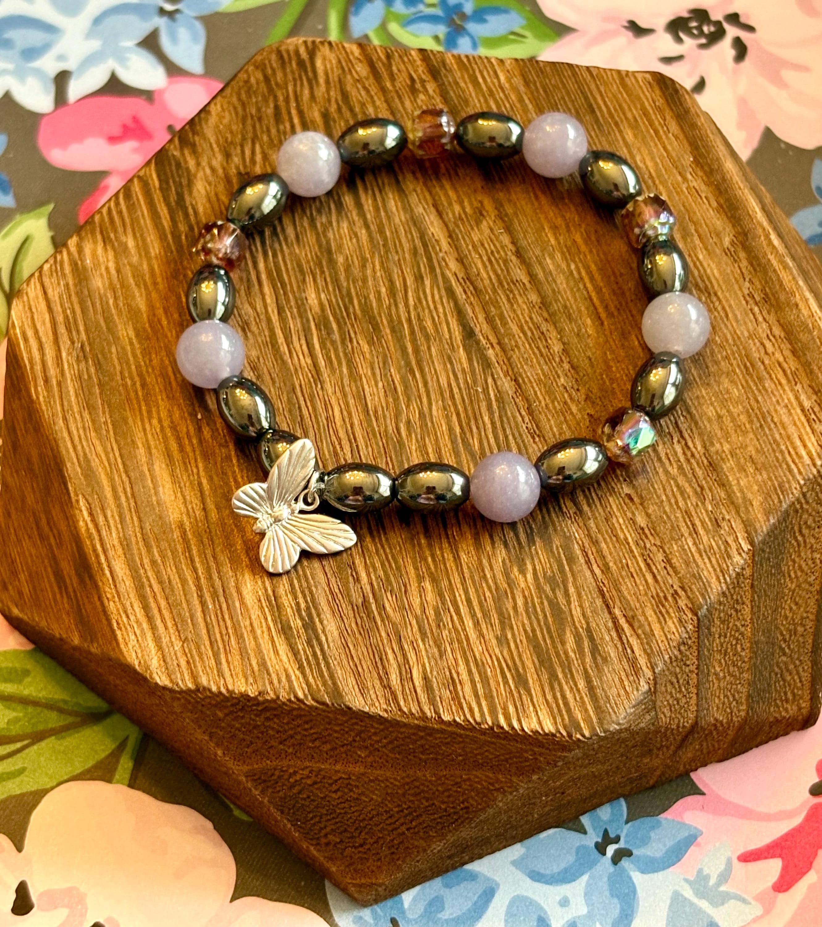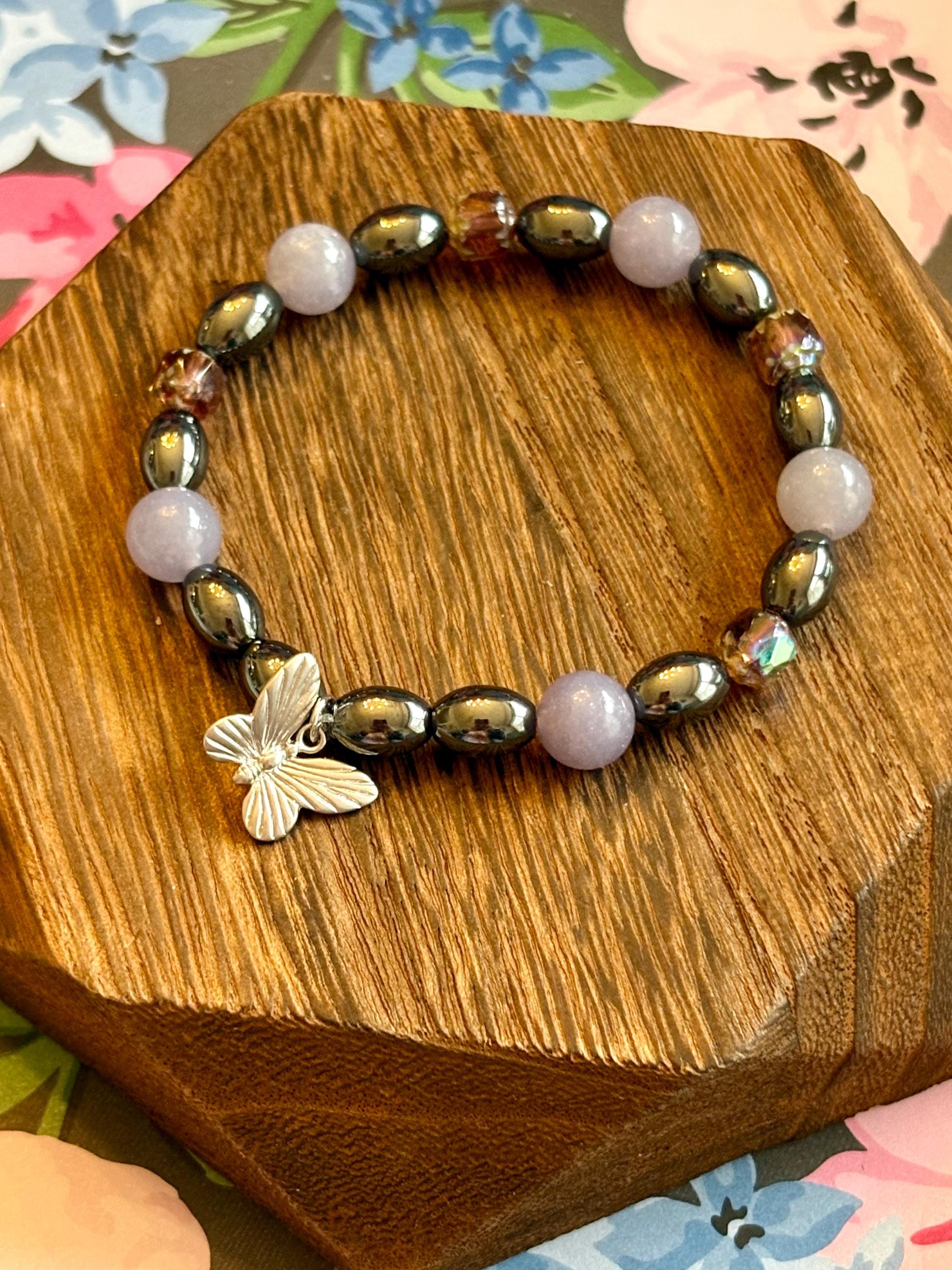 This bracelet blends the stabilizing energy of silver hematite, the soothing calm of lepidolite, and the light-catching beauty of Czech glass cathedral beads, finished with a symbolic silver butterfly charm representing growth and renewal.