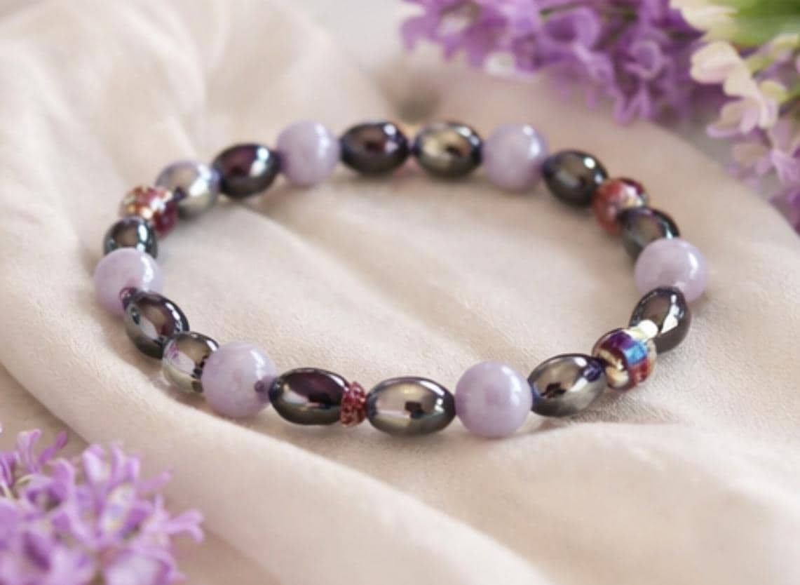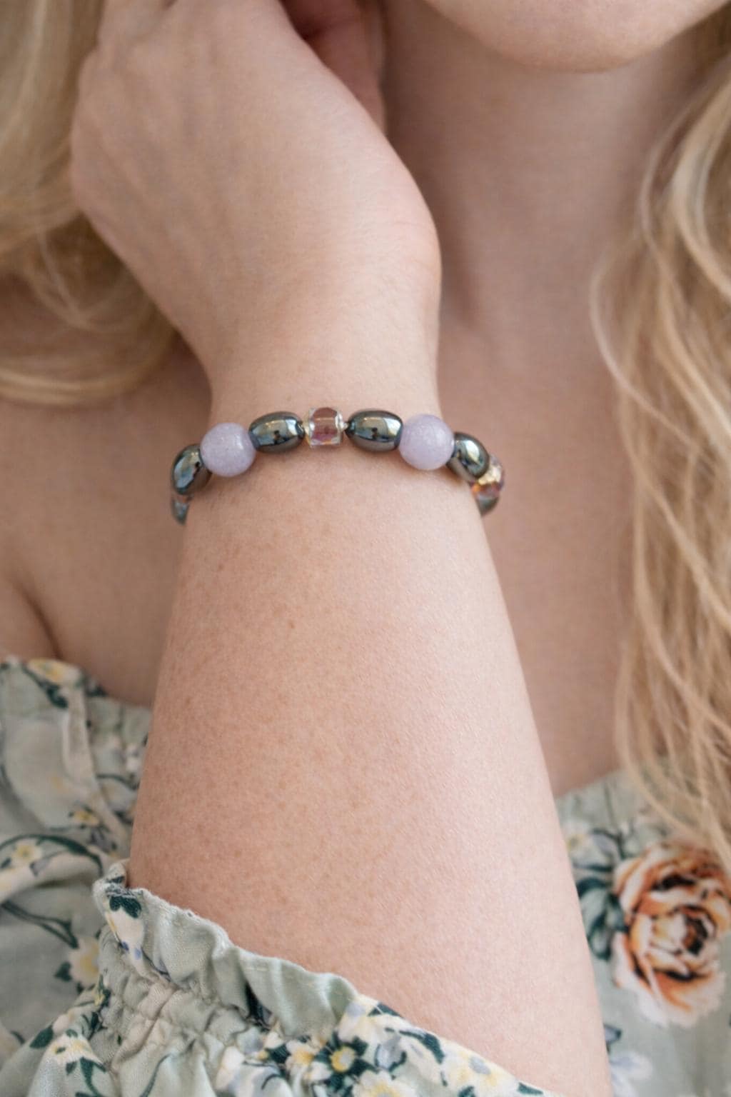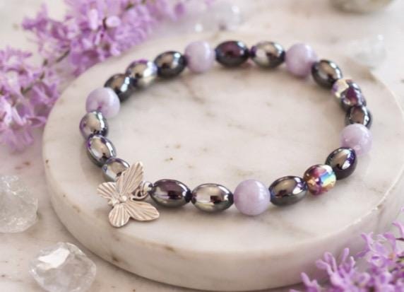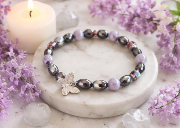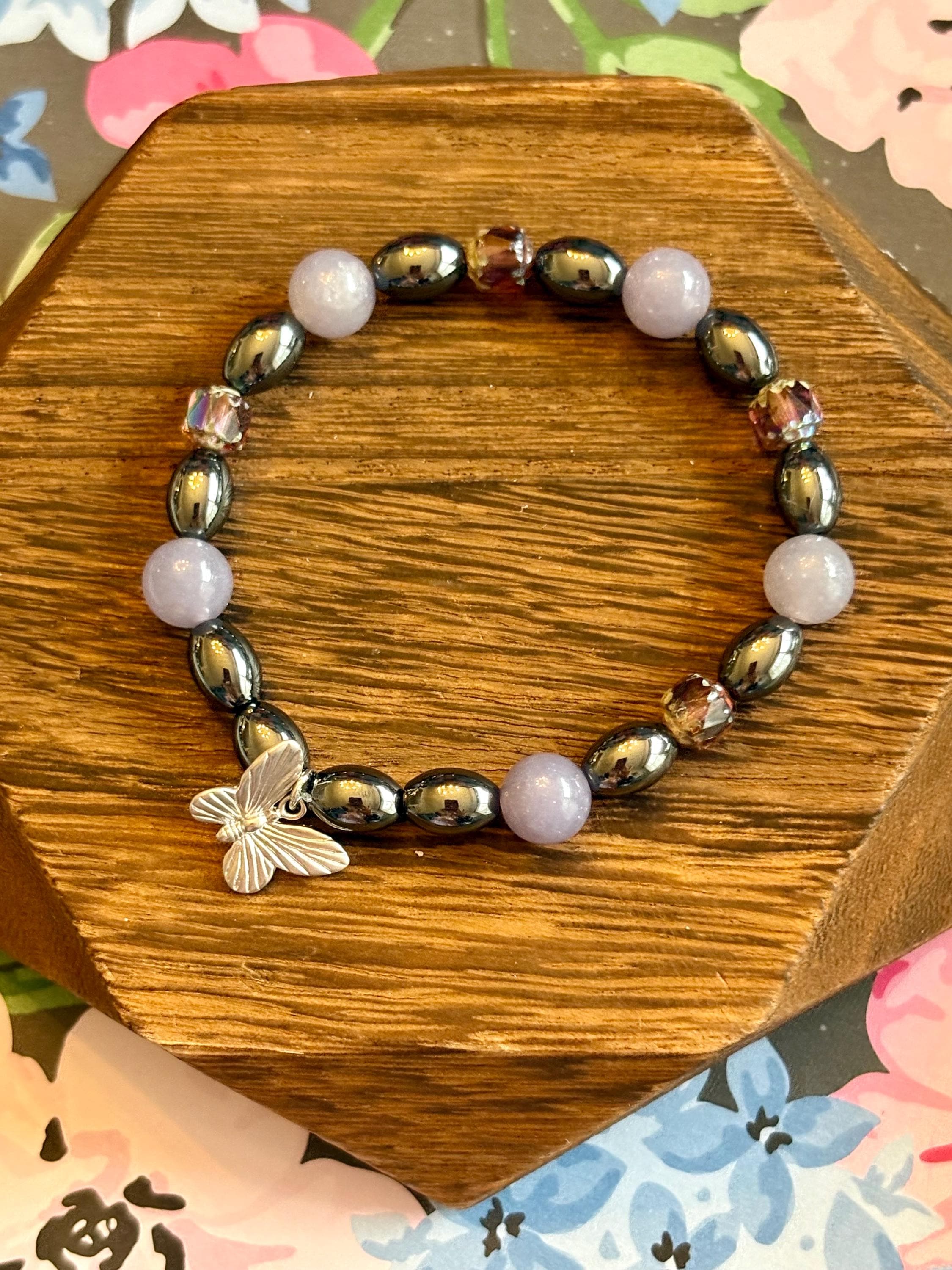 This bracelet blends the stabilizing energy of silver hematite, the soothing calm of lepidolite, and the light-catching beauty of Czech glass cathedral beads, finished with a symbolic silver butterfly charm representing growth and renewal.