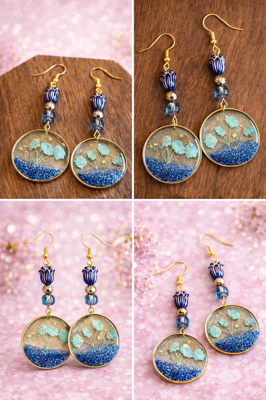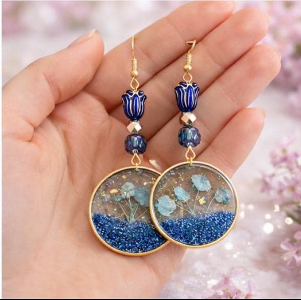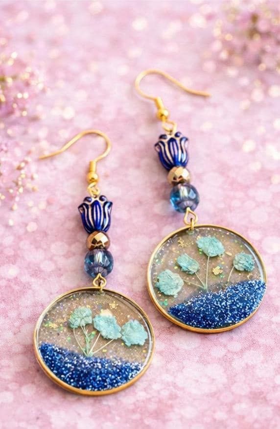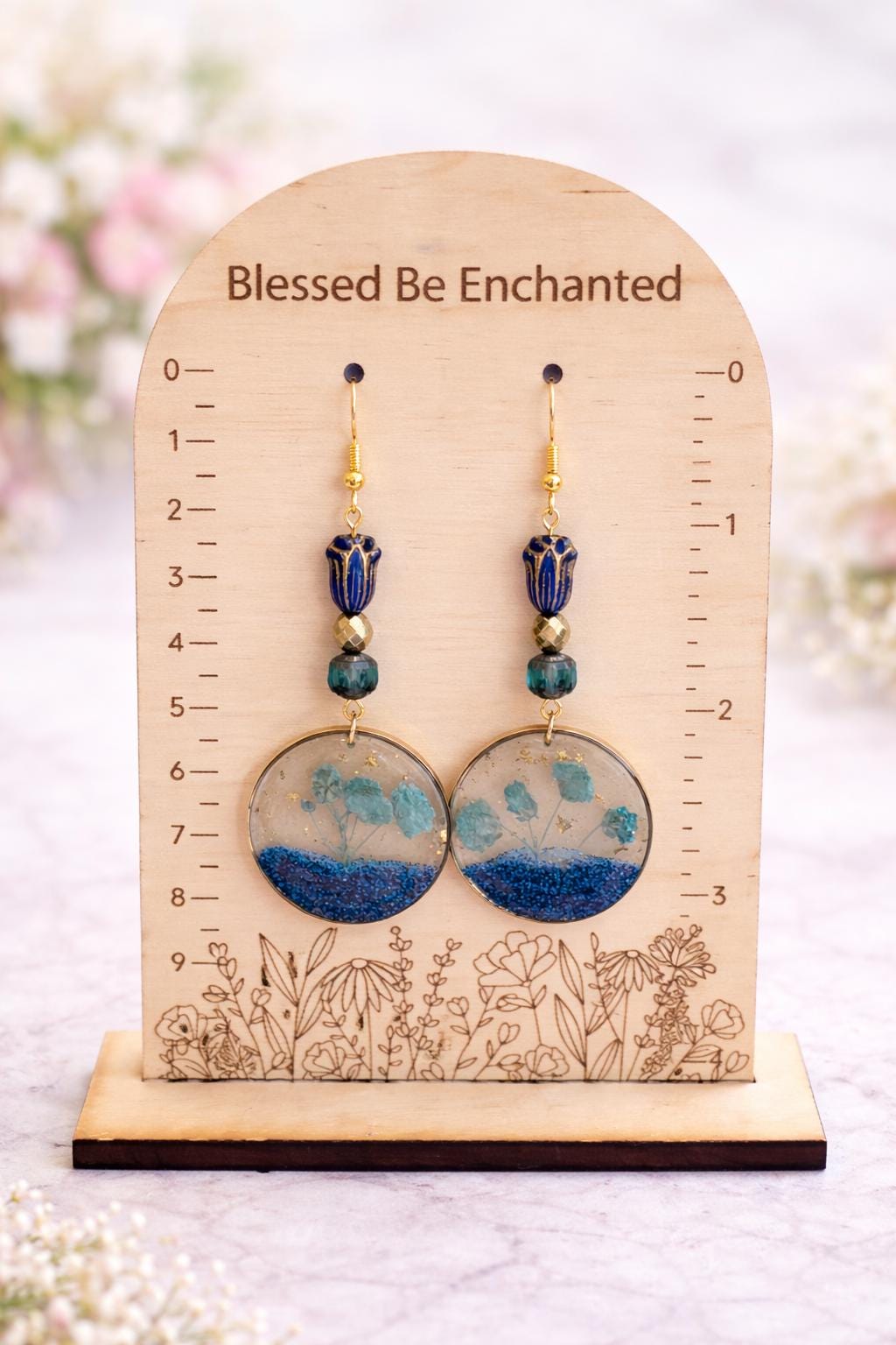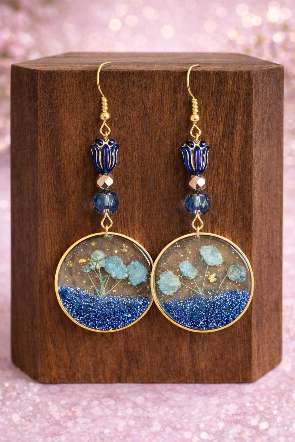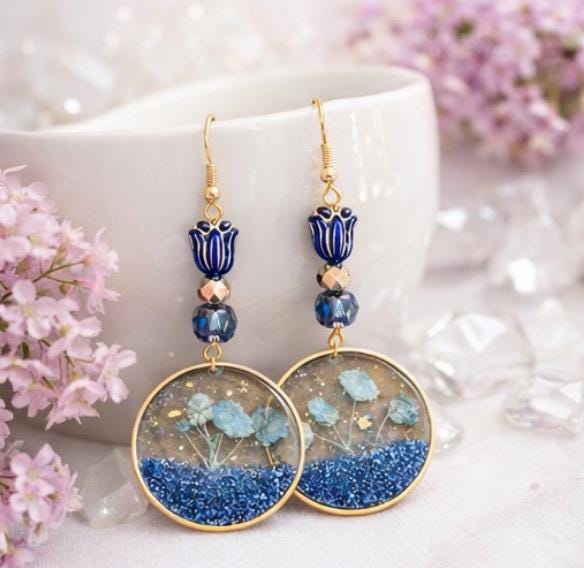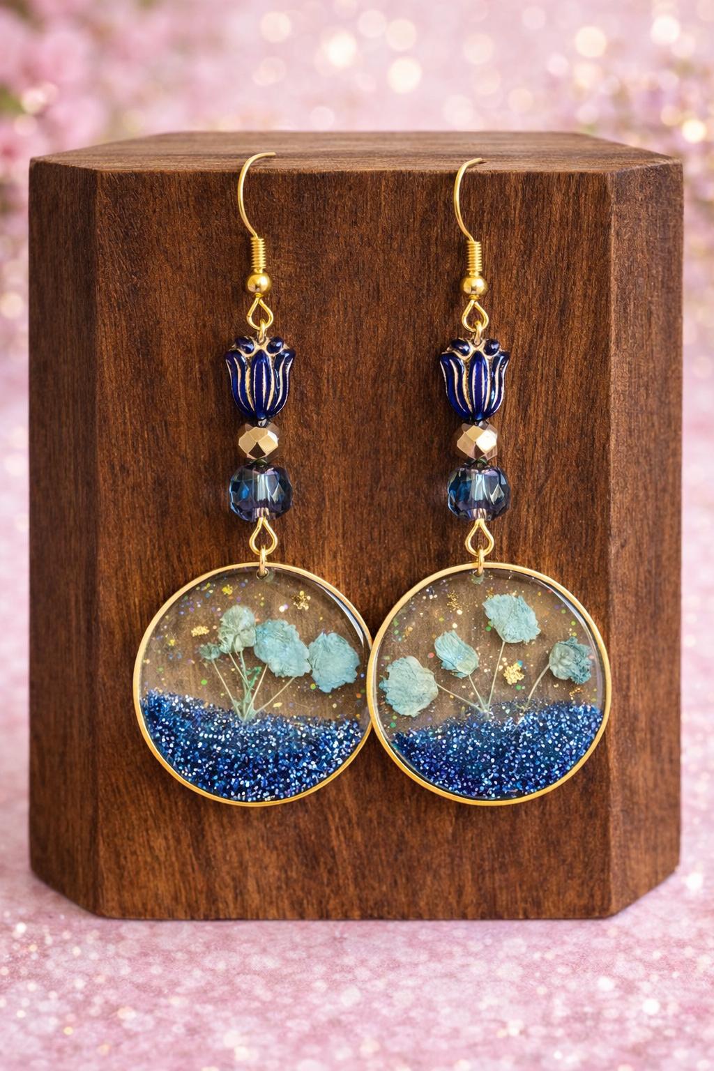 Featuring Czech glass tulip beads, shimmering gold faceted hematite, and luminous Czech glass cathedral beads, these earrings are finished with resin pendants holding real dried pressed flowers, creating a timeless, nature-inspired statement.
