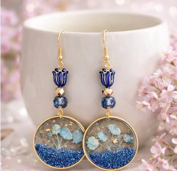 Blue Bloom Tulip Earrings – Pressed Flower Resin, Gold Hematite & Czech Glass, Hypoallergenic Gold Tone