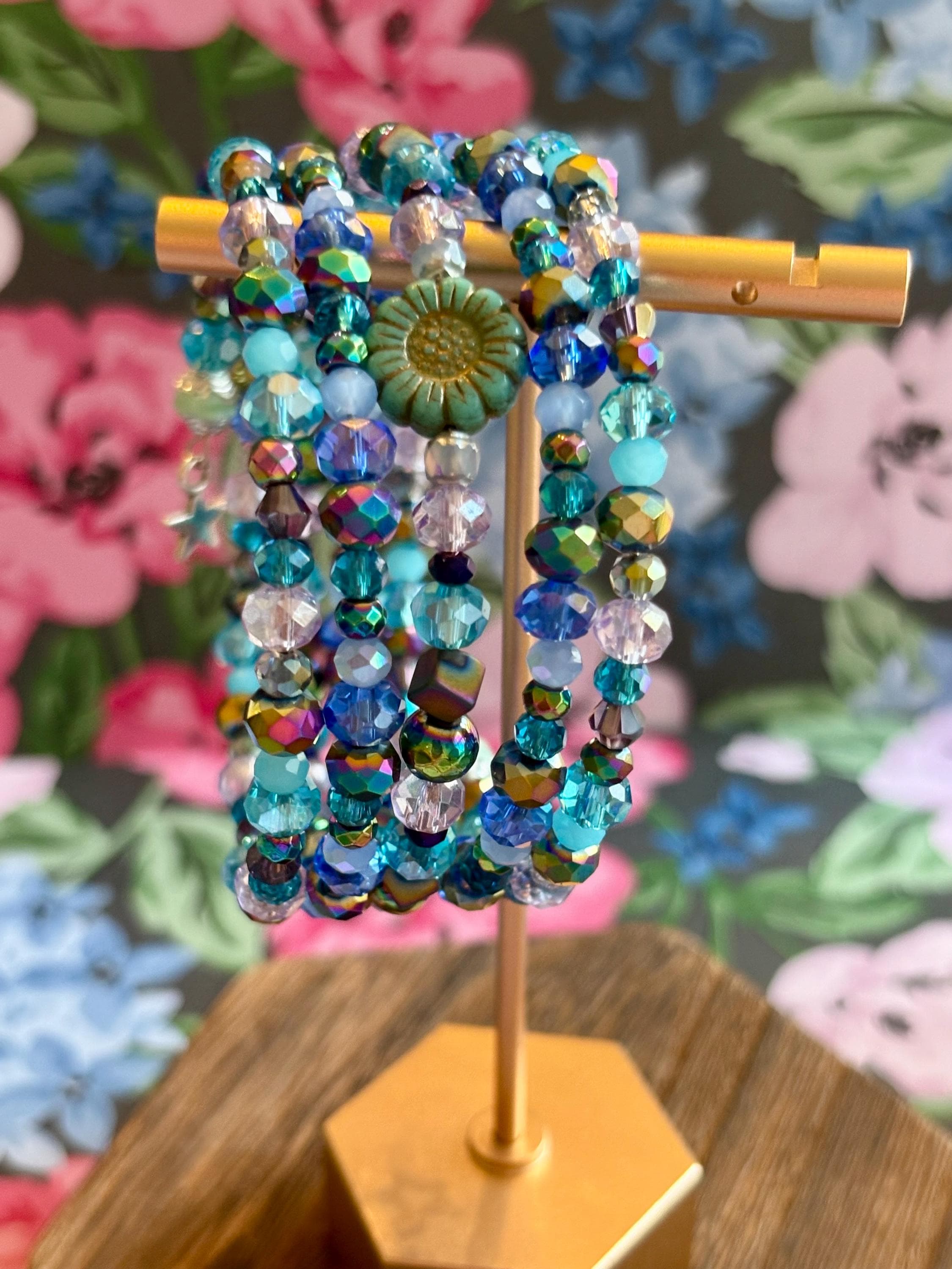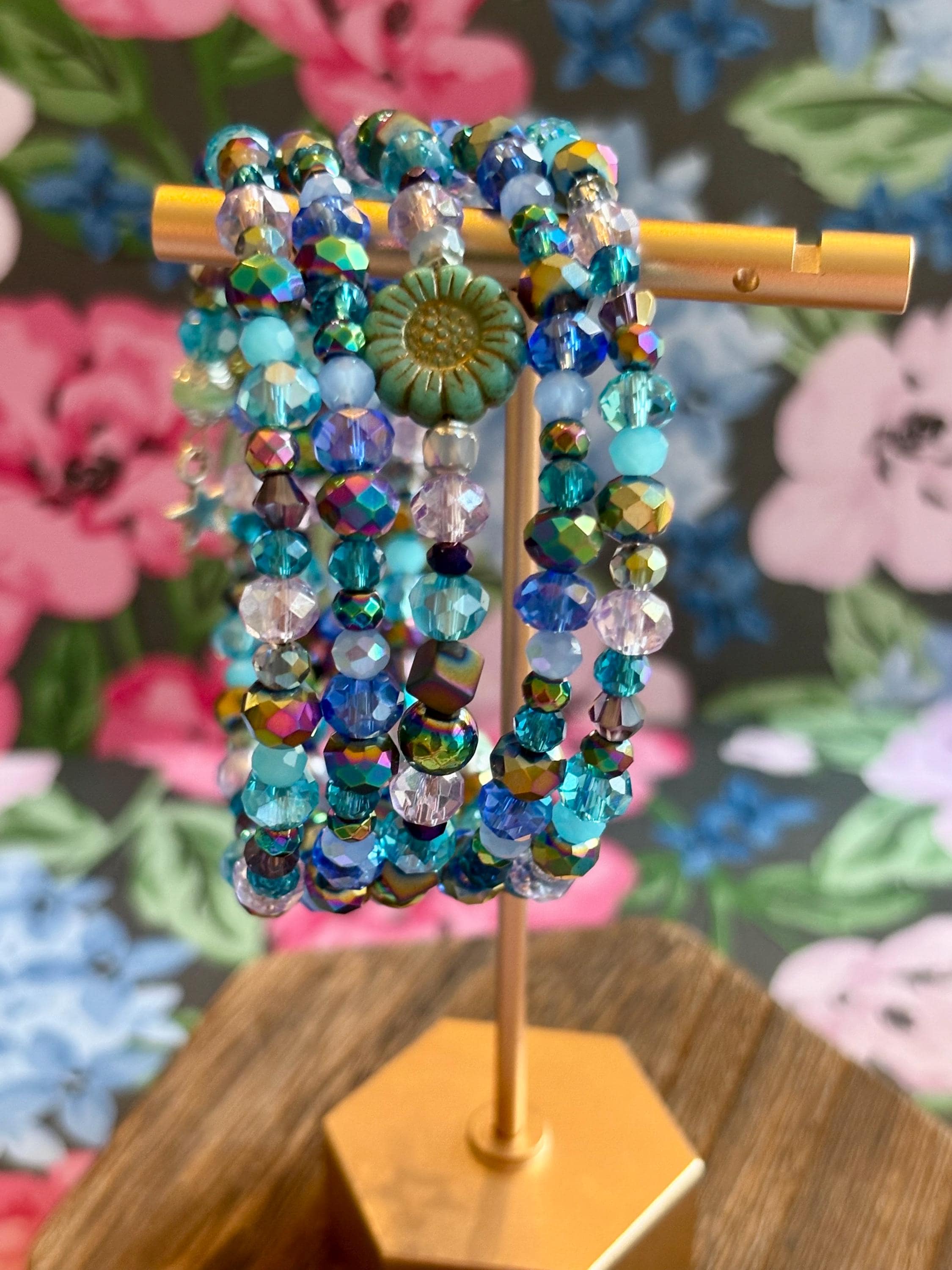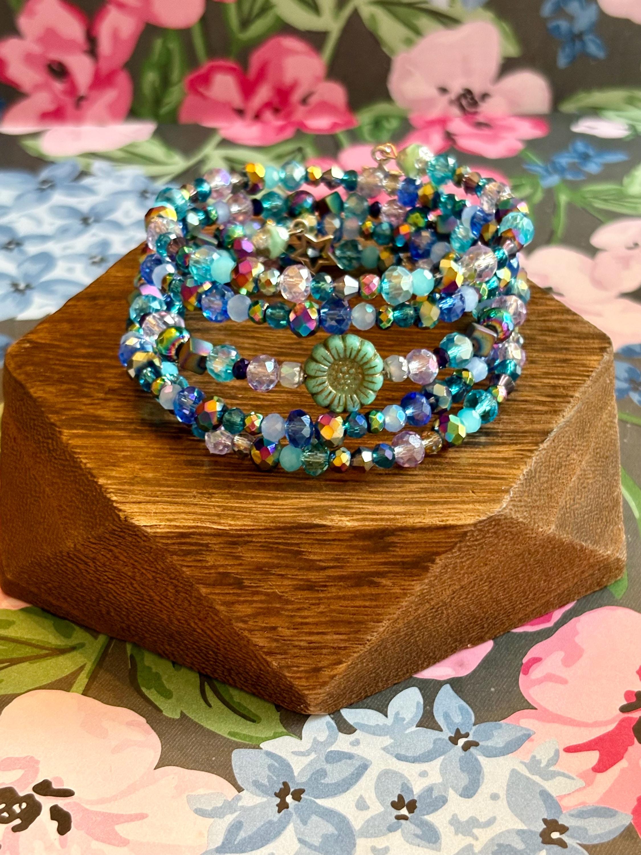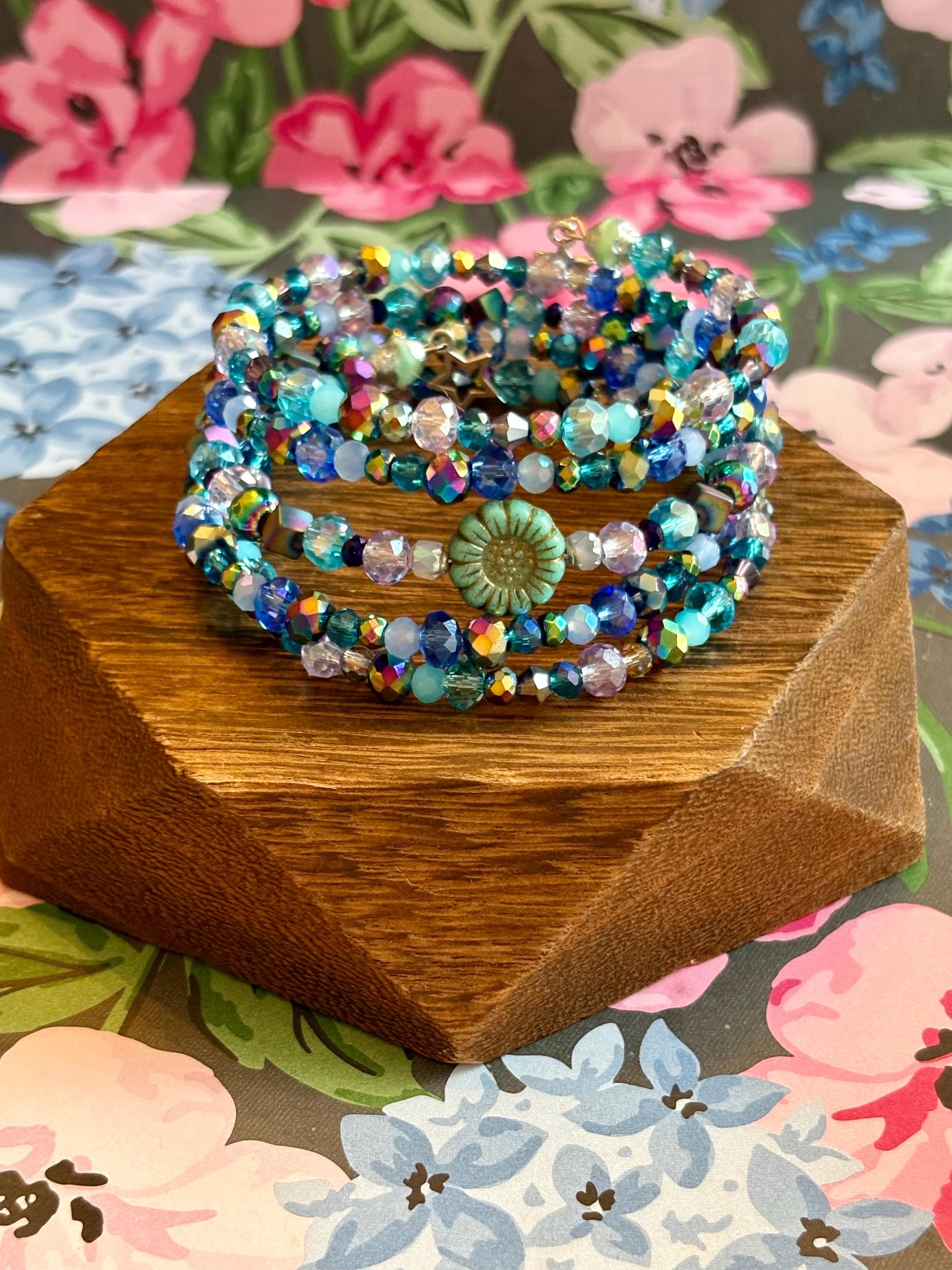 Enchanted Galaxy Aurora Wrap Bracelet – Teal Blue Purple Crystal Sunflower Star Wrap