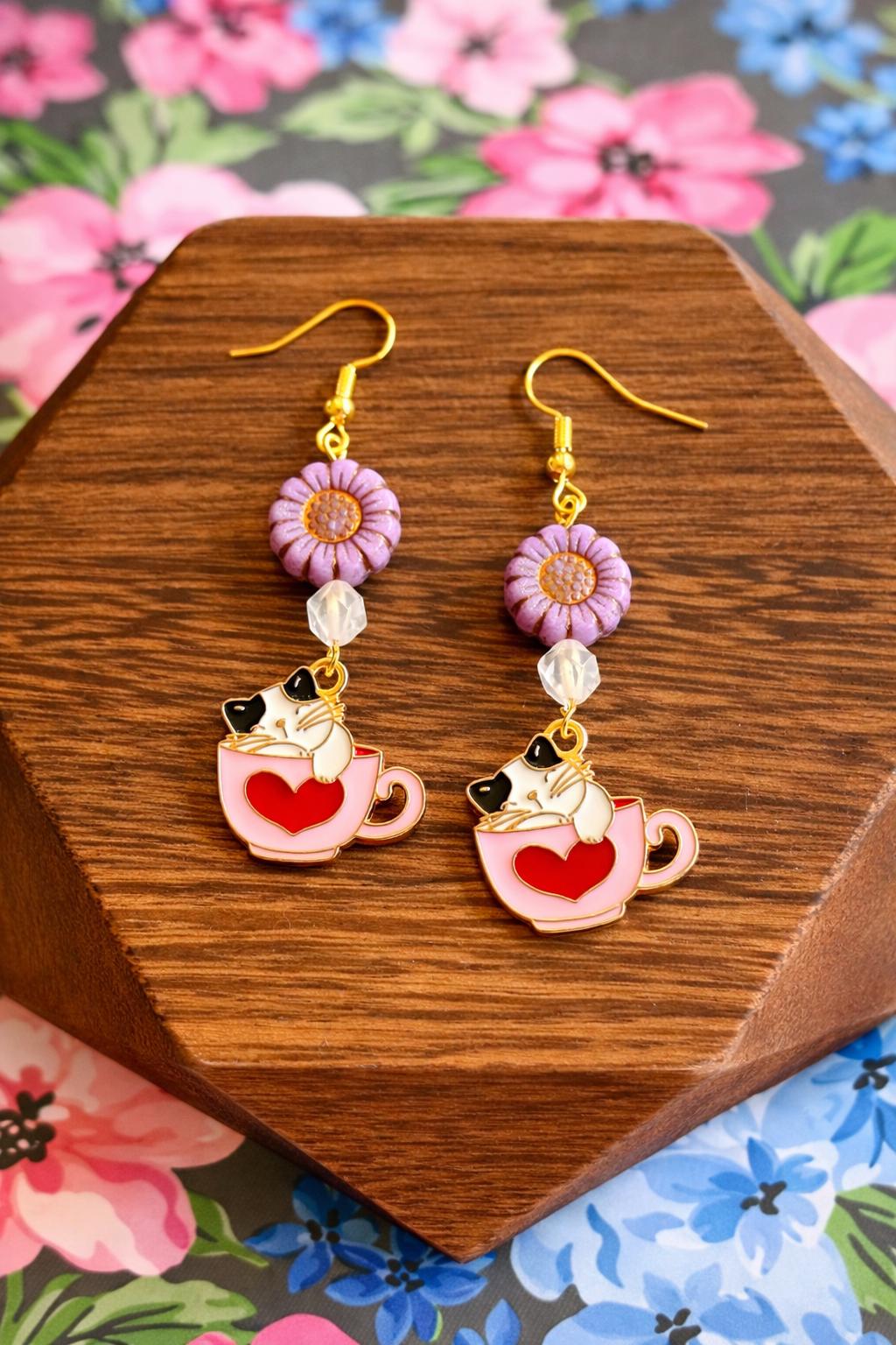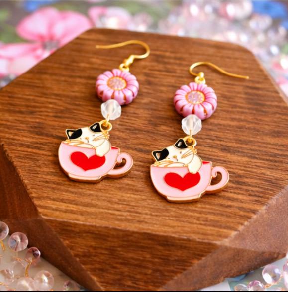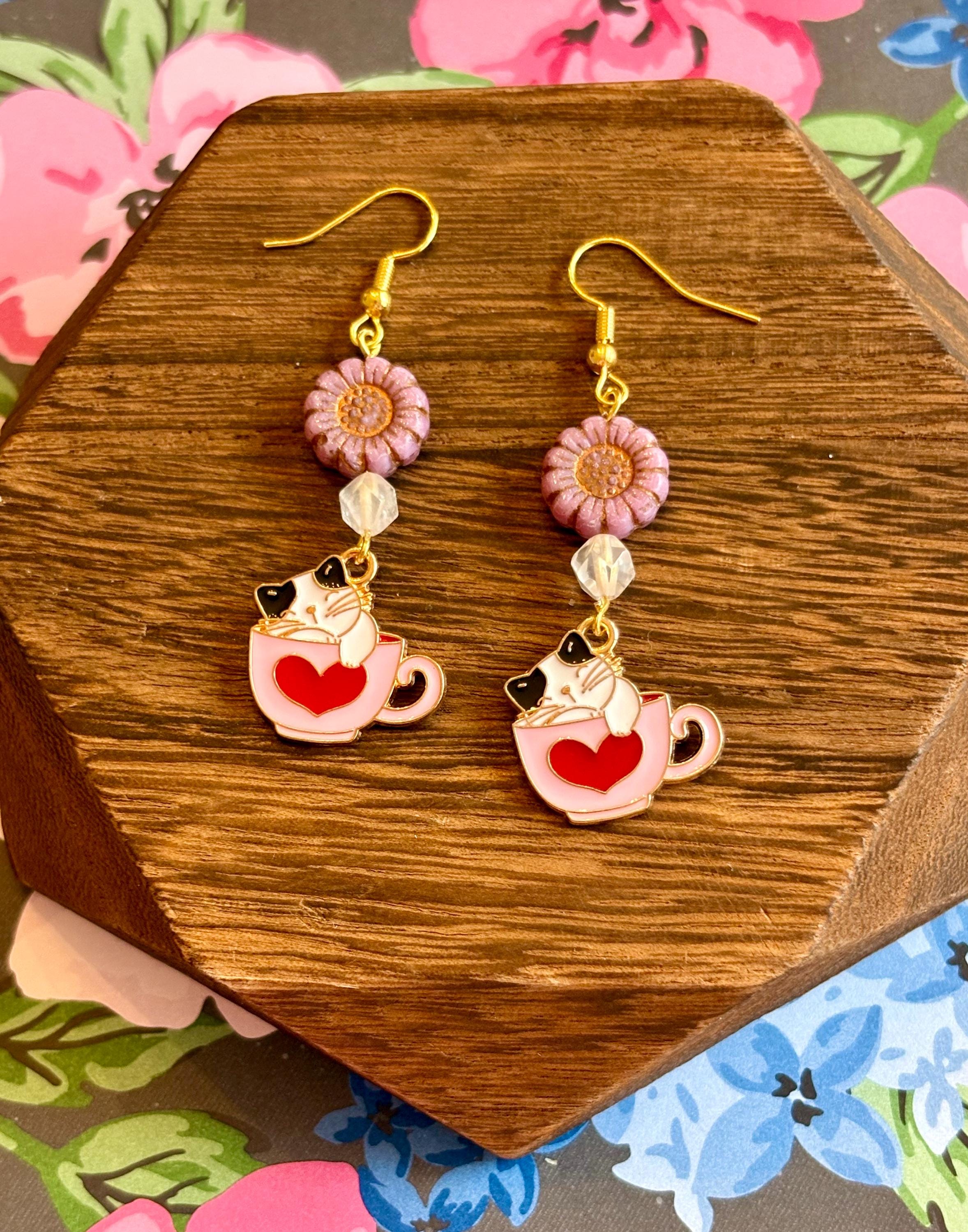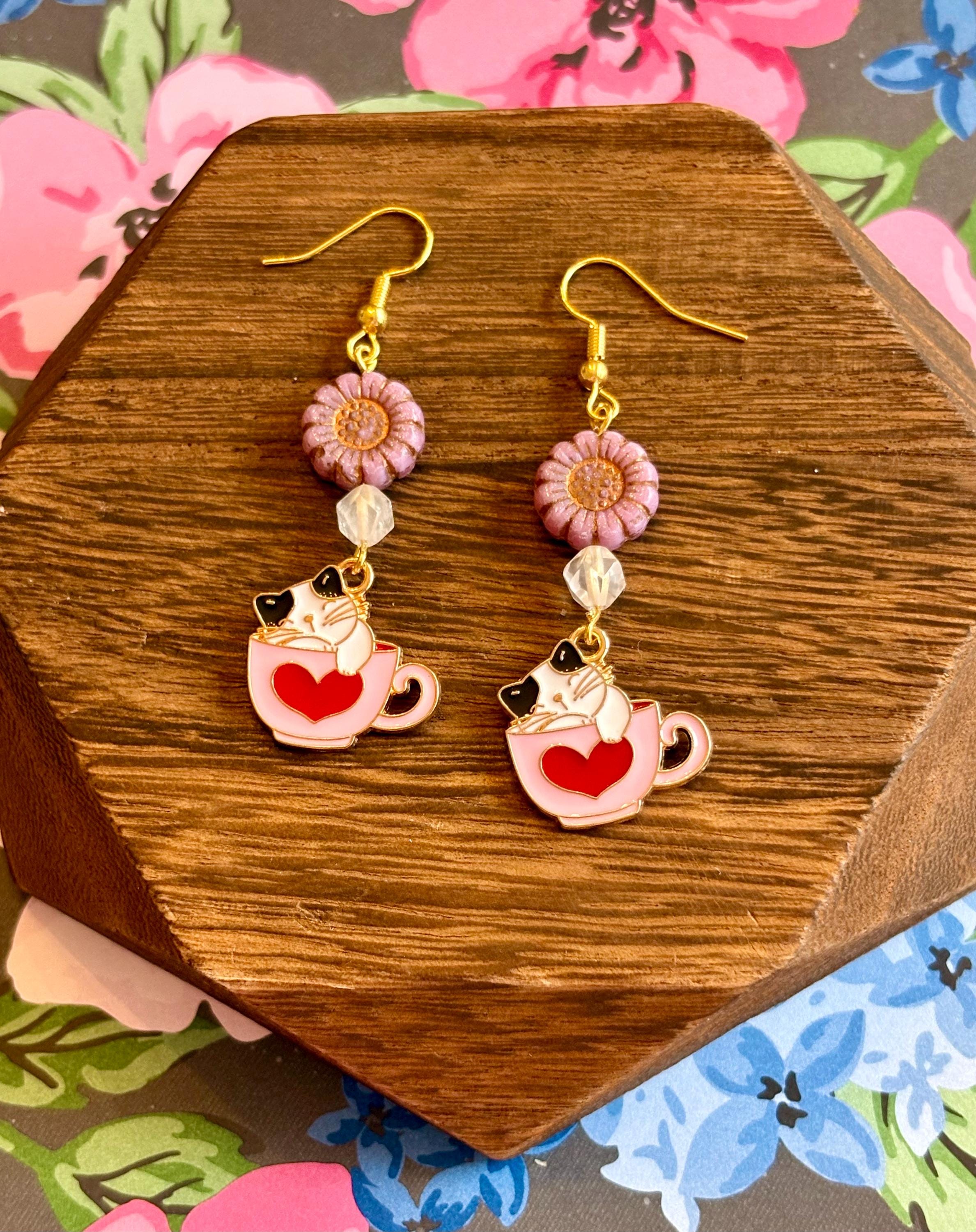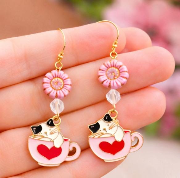 Fall in love with the sweet charm of Whiskers & Warm Hearts Earrings, a playful and heartwarming pair designed for cat lovers, romantics, and lovers of all things enchanted! These handcrafted earrings feature pink Czech glass sunflower beads, sparkling star-cut rose quartz, and an adorable enamel cat nestled in a Valentine teacup charm—pure joy in every detail.
