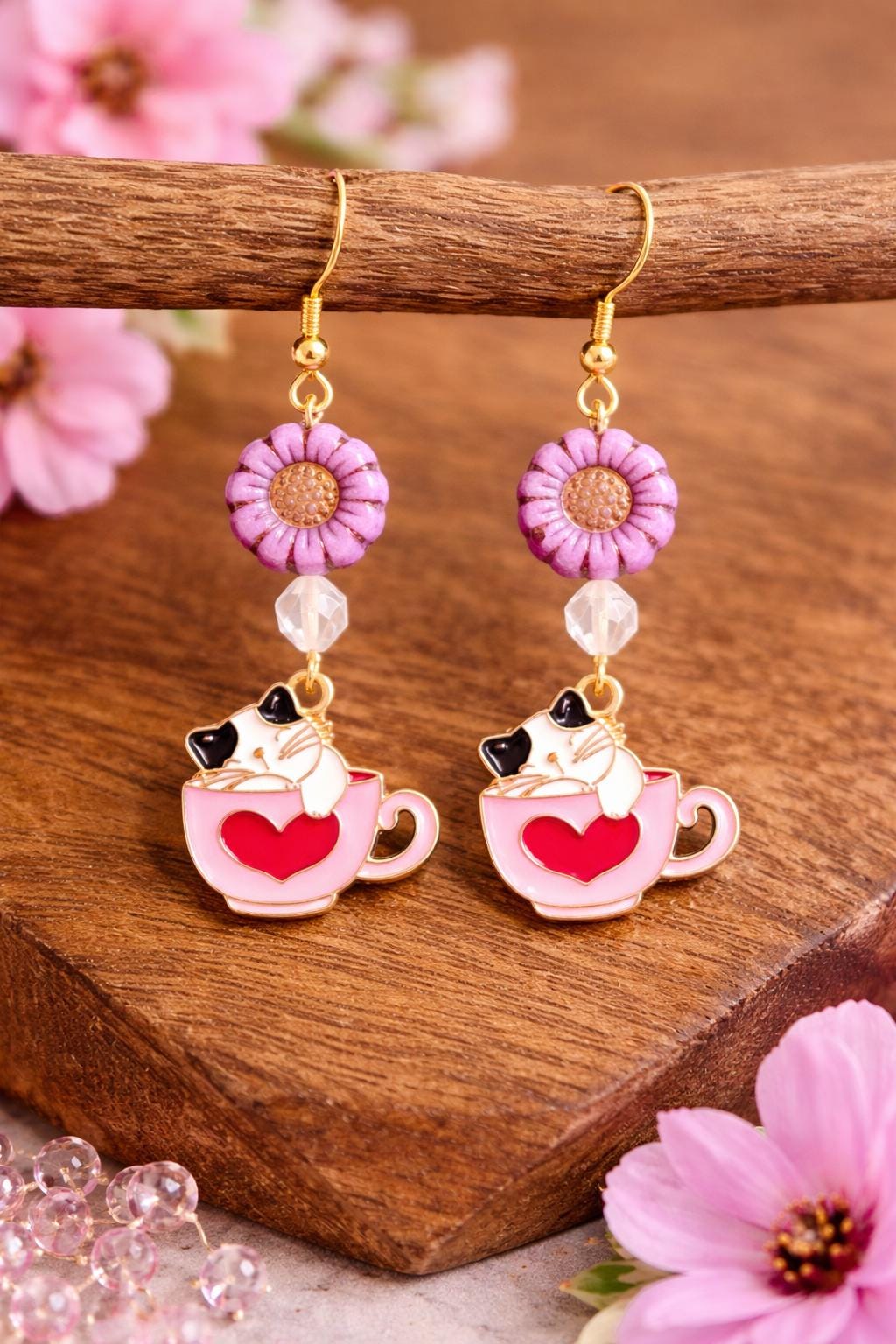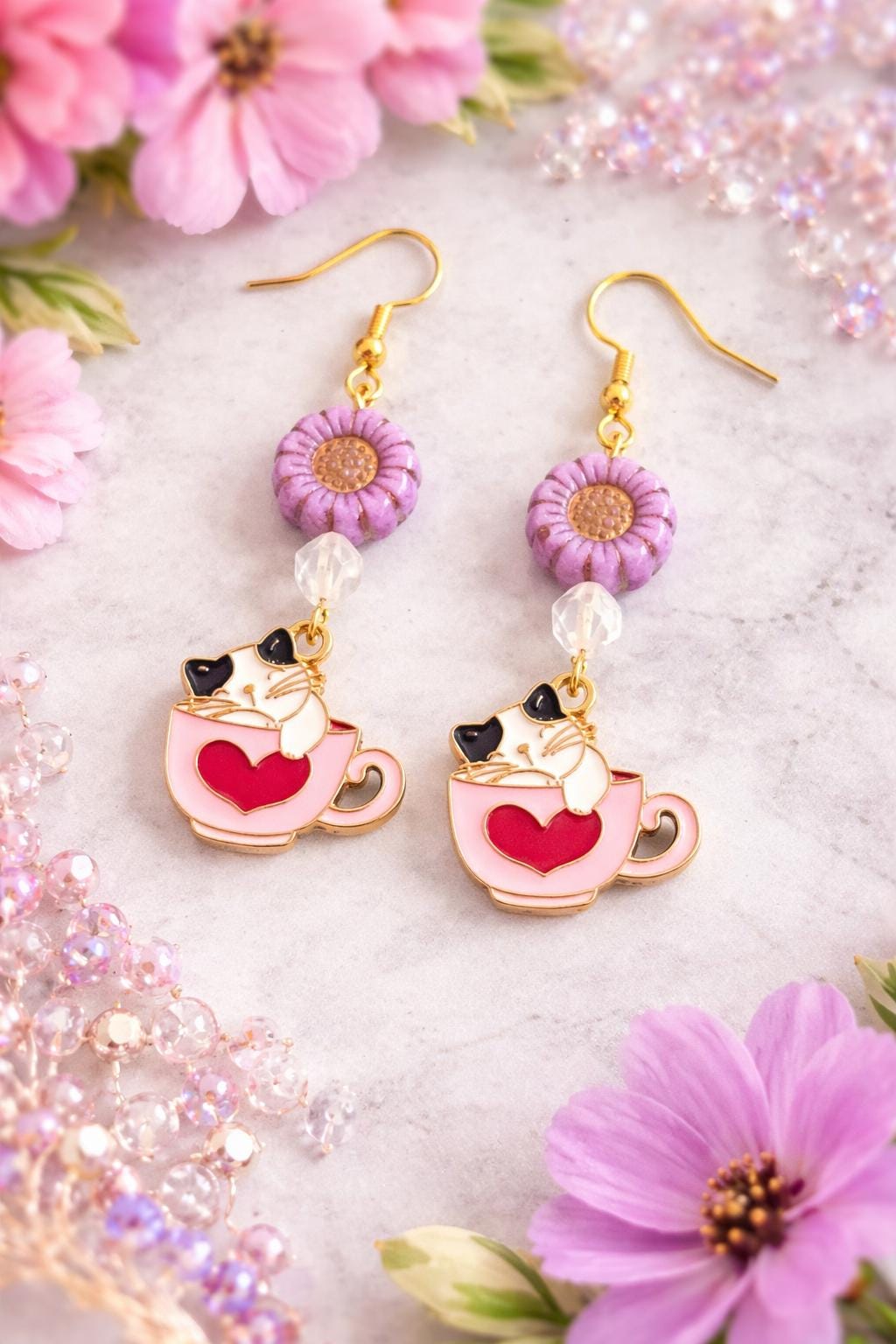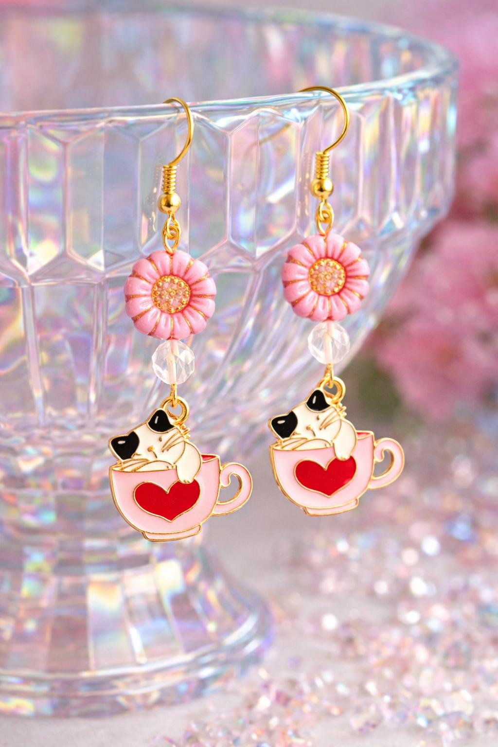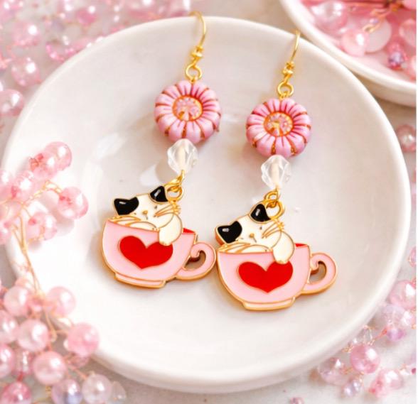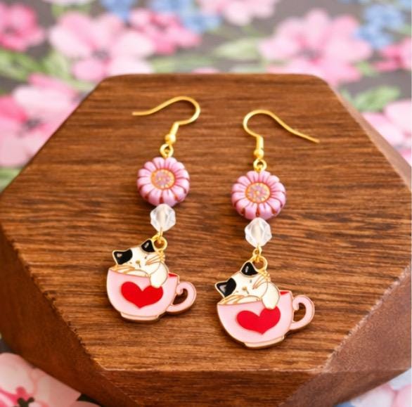 Fall in love with the sweet charm of Whiskers & Warm Hearts Earrings, a playful and heartwarming pair designed for cat lovers, romantics, and lovers of all things enchanted! These handcrafted earrings feature pink Czech glass sunflower beads, sparkling star-cut rose quartz, and an adorable enamel cat nestled in a Valentine teacup charm—pure joy in every detail.
