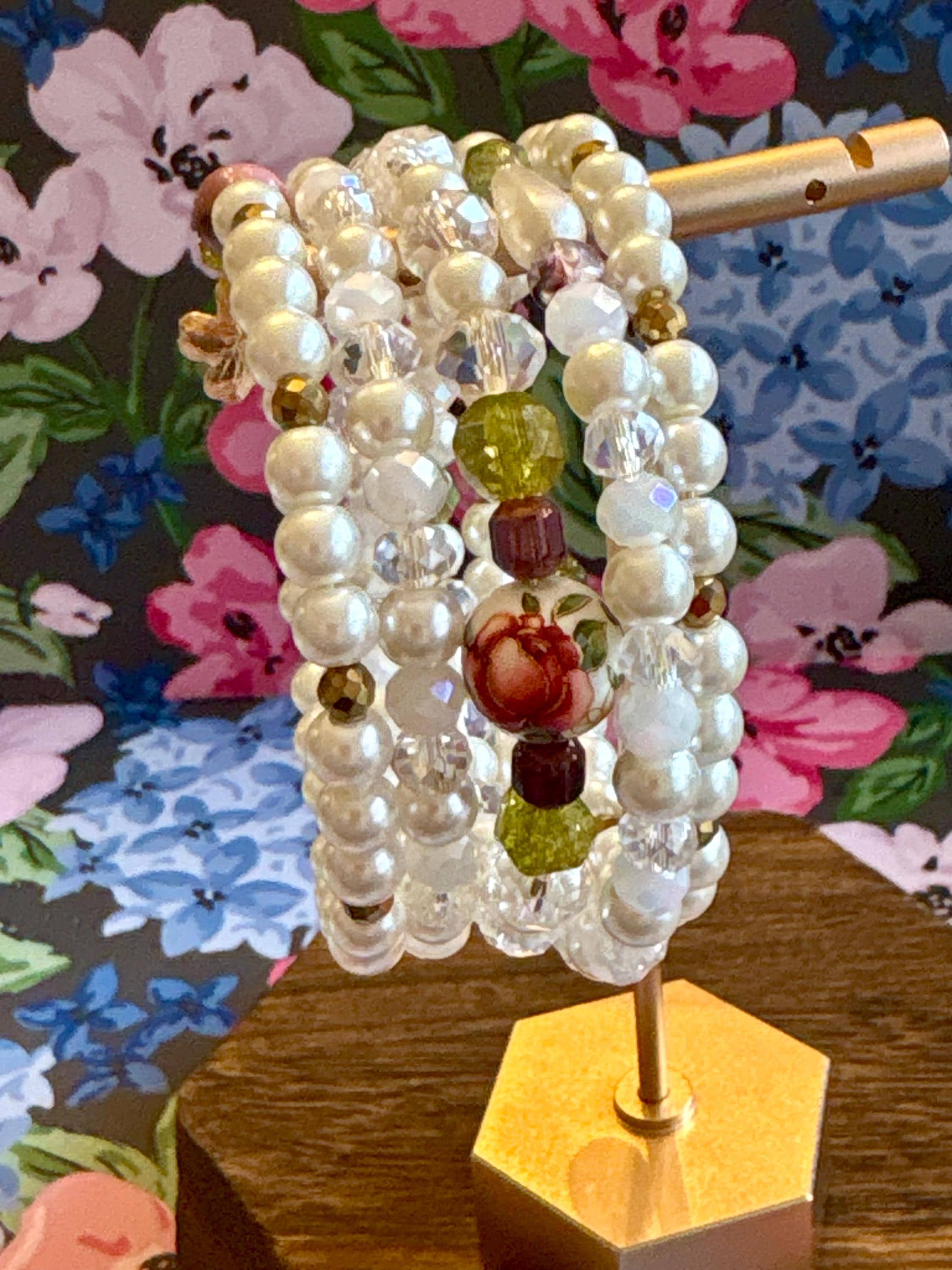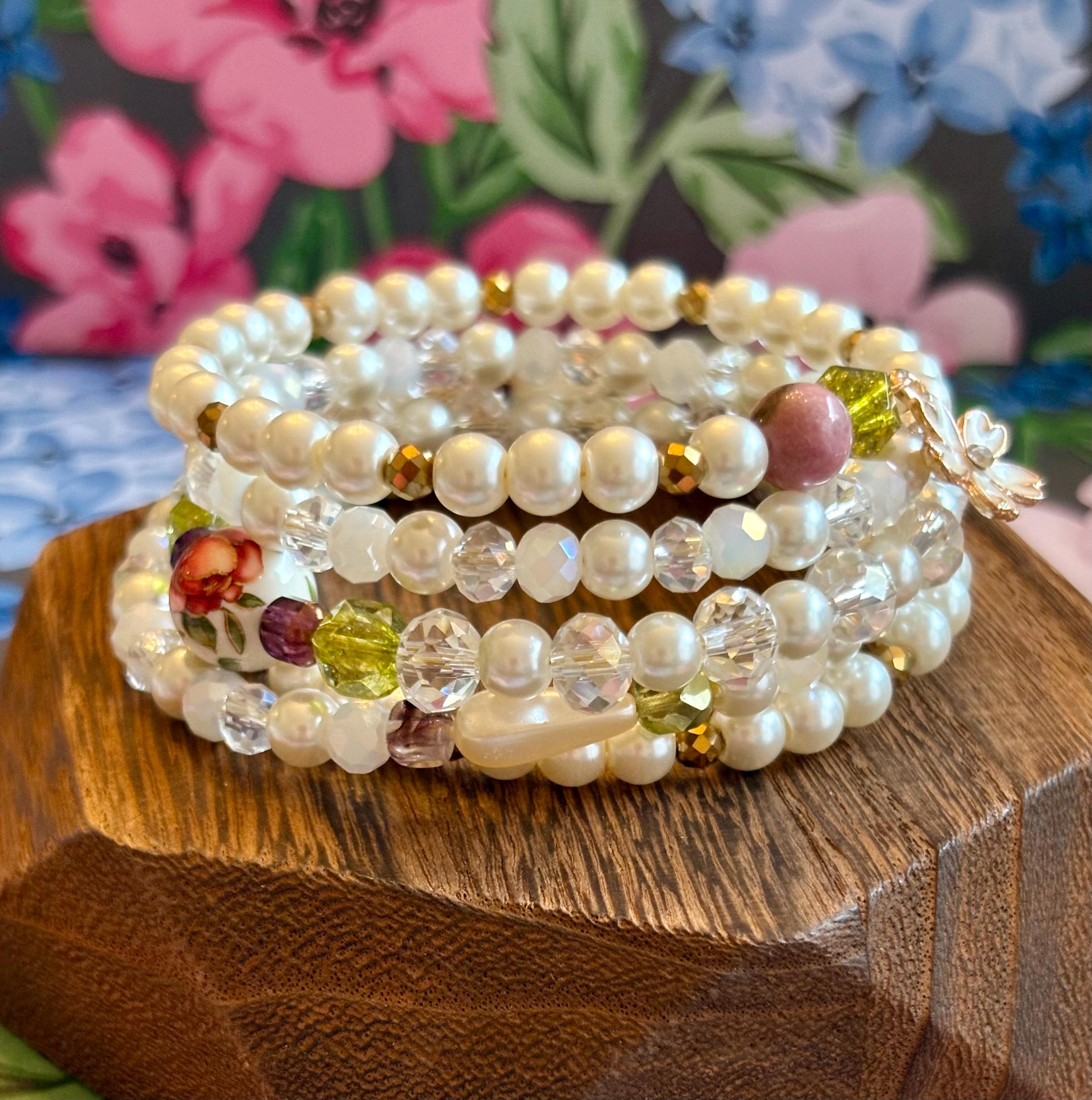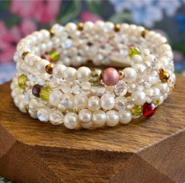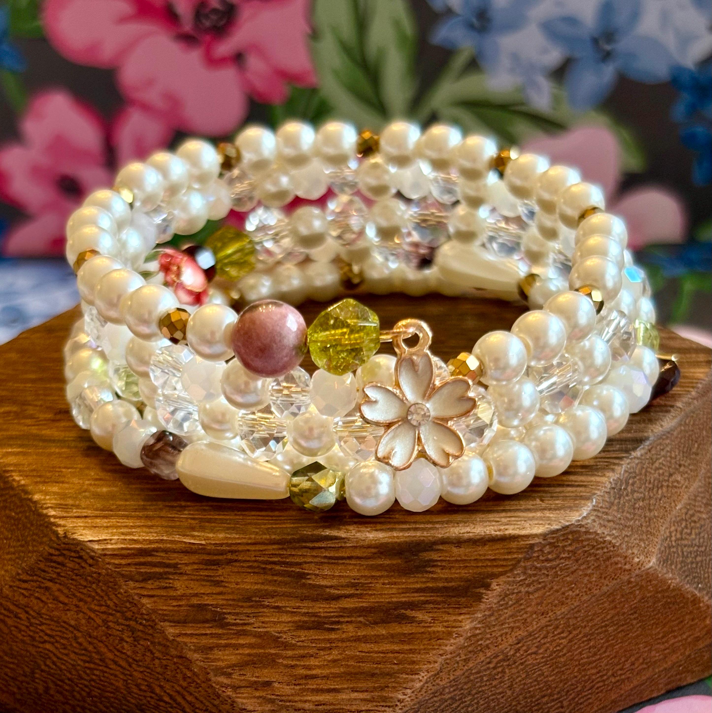 Wrapped in Love Pearl Coil Wrap Bracelet – Tensha Rose, Rhodonite, Gold Hematite, Peridot, Tourmaline Charm