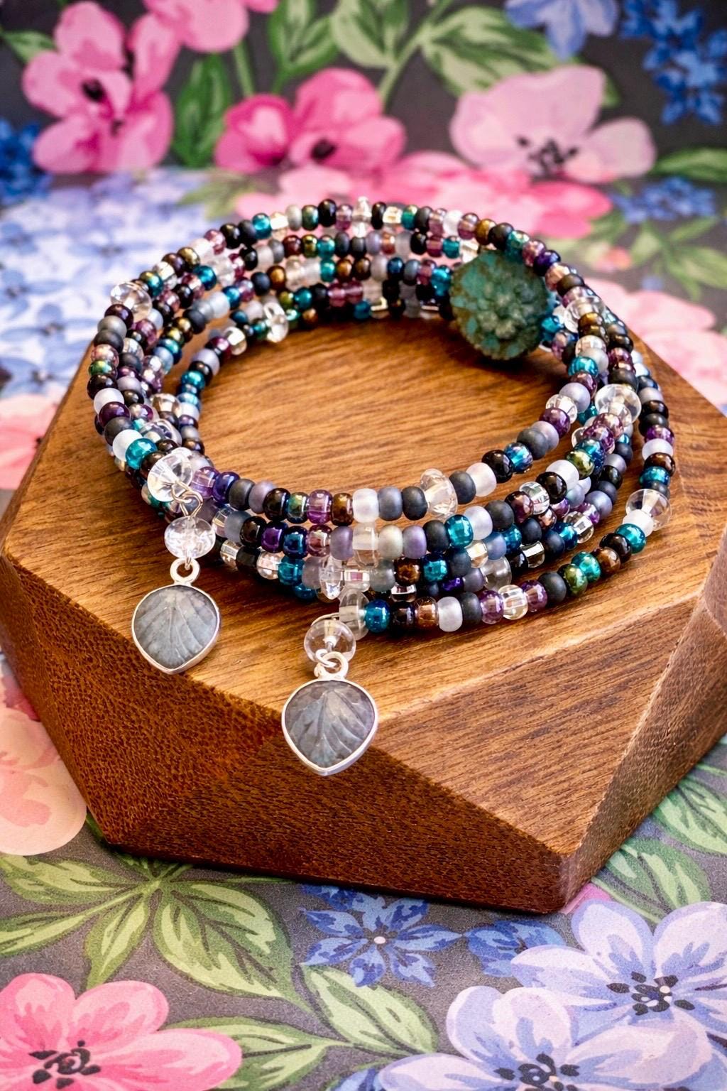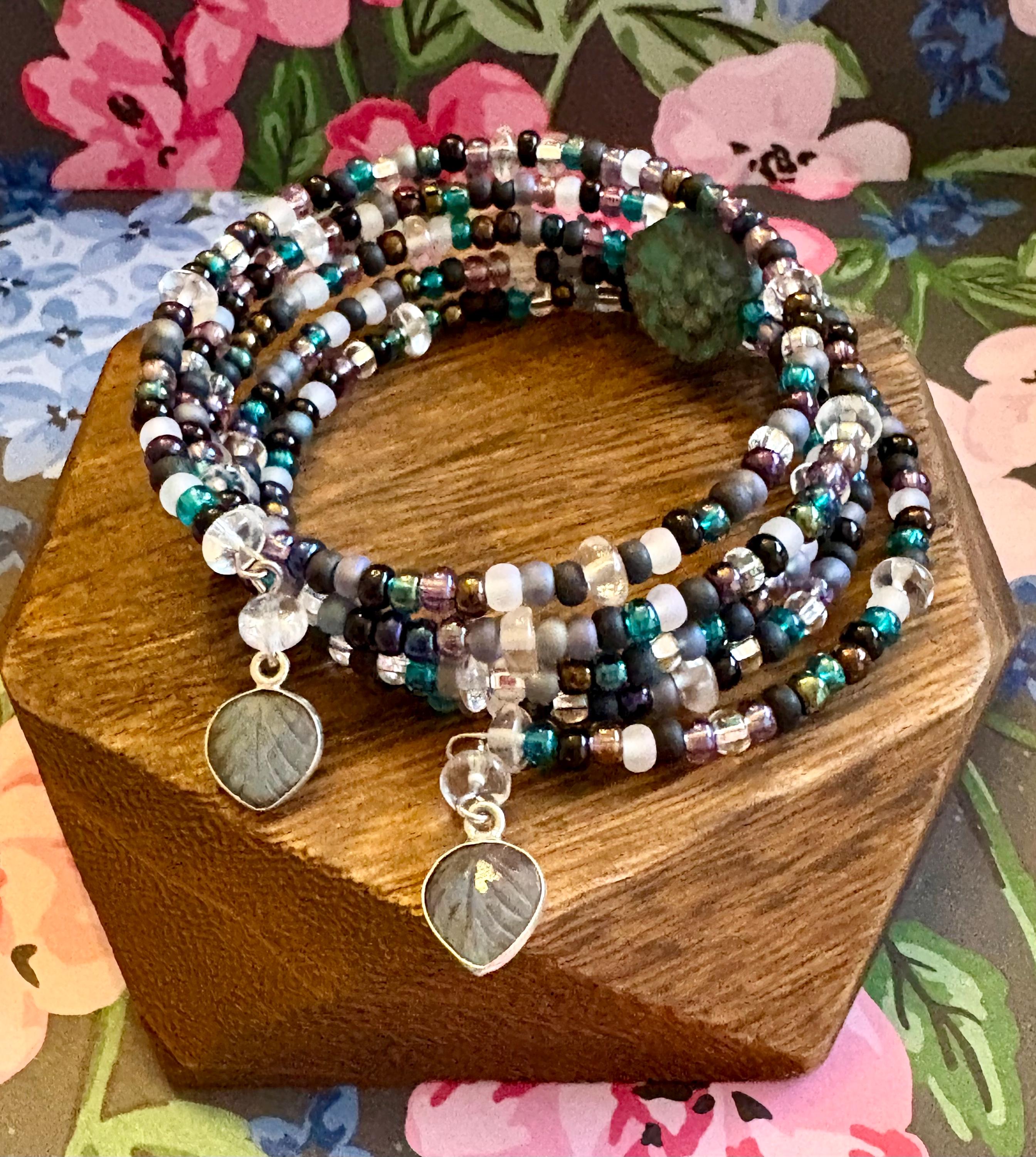 The Wrapped in Love • Enchanted Leaflight Coil Wrap Bracelet is a mystical, nature-inspired piece designed to wrap your wrist in clarity, magic, and gentle protection! This handcrafted coil wrap features a captivating blend of shimmering seed beads, luminous quartz, and finished with ethereal labradorite leaf-shaped charms that symbolize growth, renewal, and intuitive wisdom.