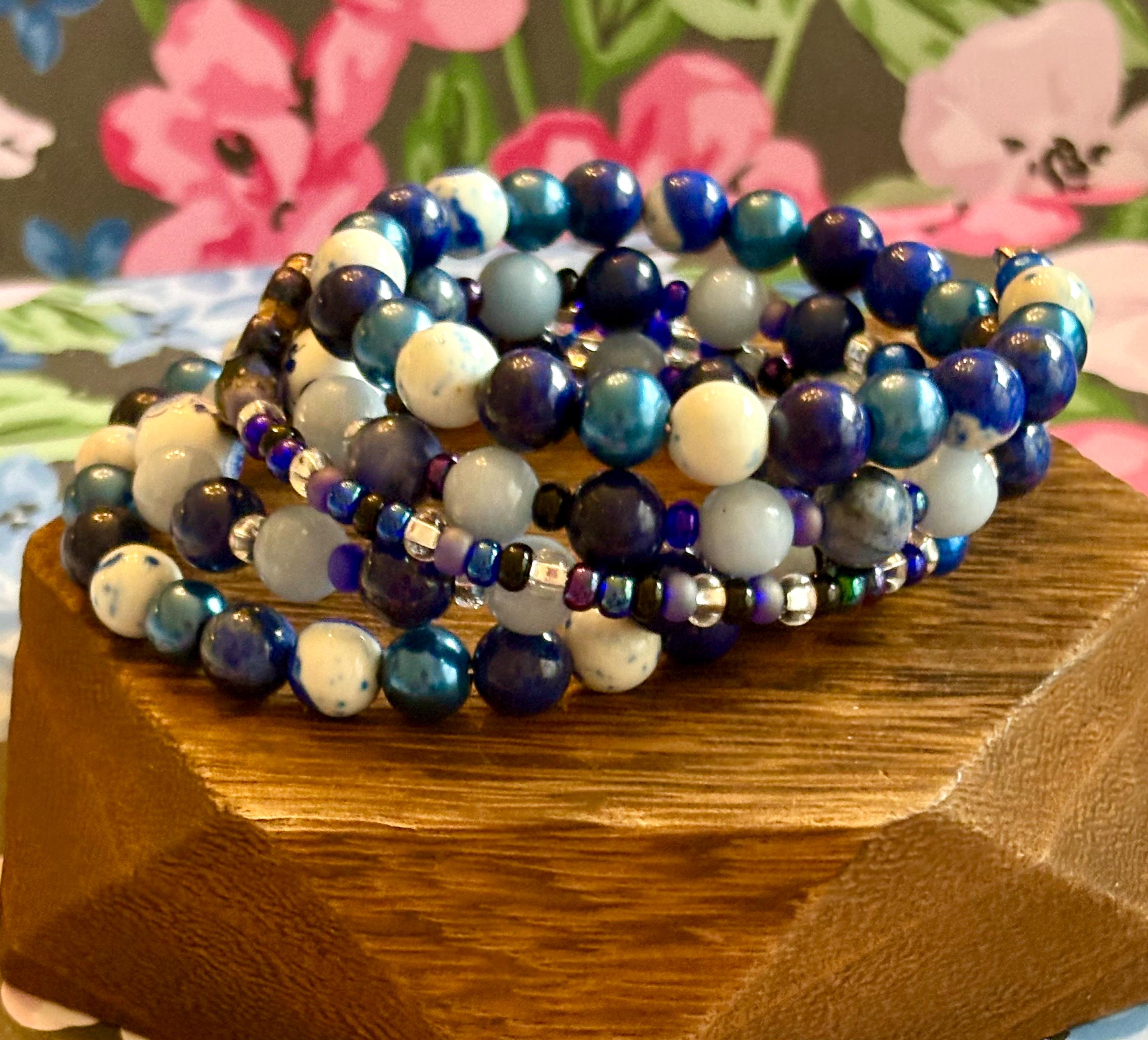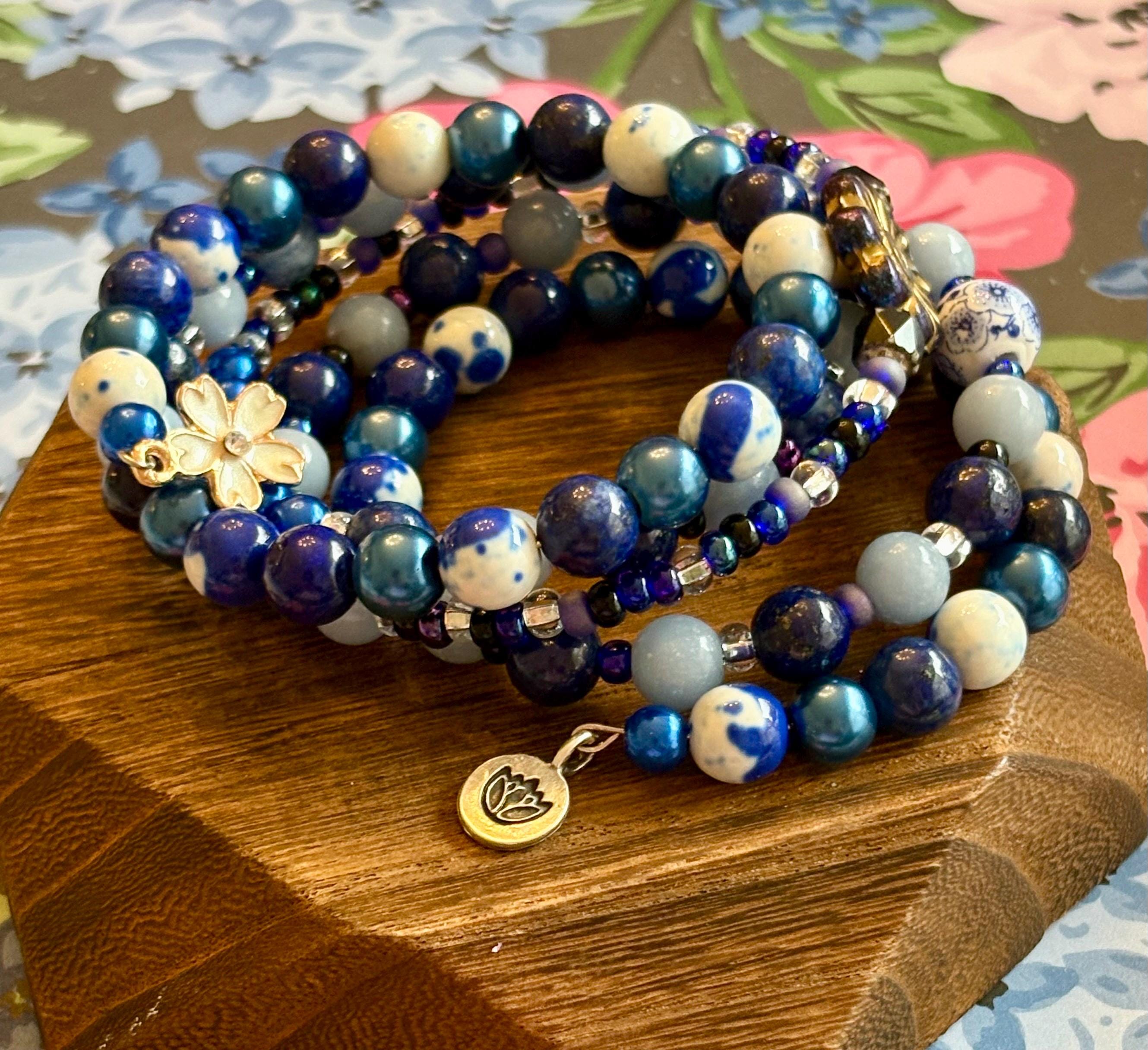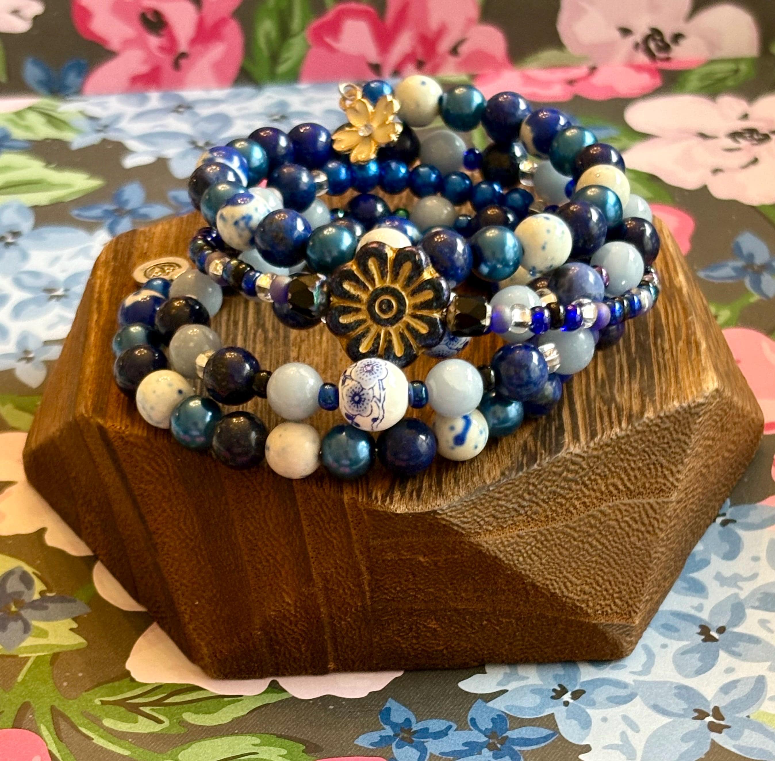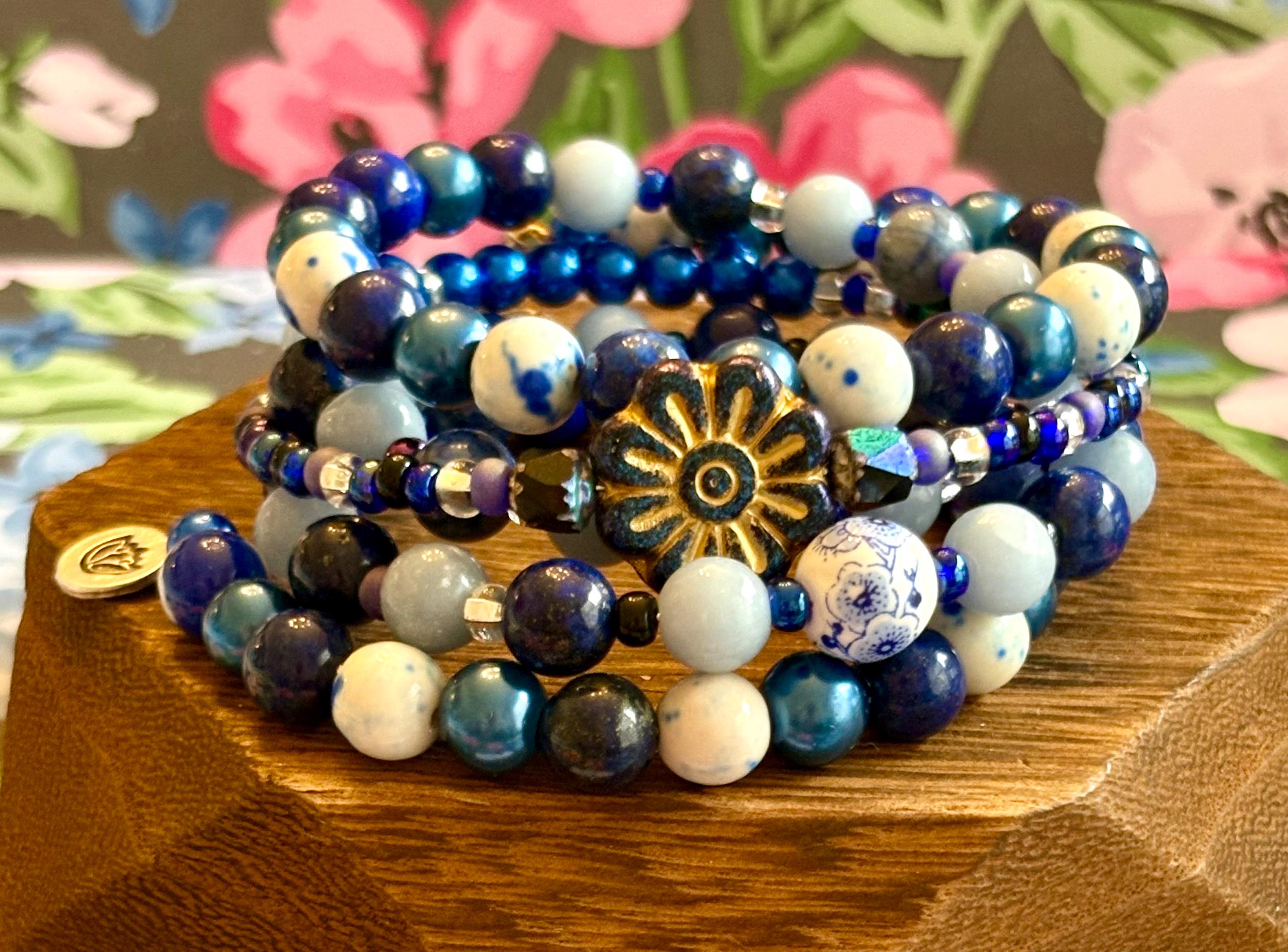 Wrap yourself in calming blue hues and angelic serenity with Blue Lotus Angel Bloom, a handcrafted gemstone coil wrap bracelet designed to bring peace, clarity, and gentle spiritual support! This multi-wrap bracelet blends soft sky blues, deep lapis tones, and luminous metallic accents for a soothing yet powerful presence on the wrist.